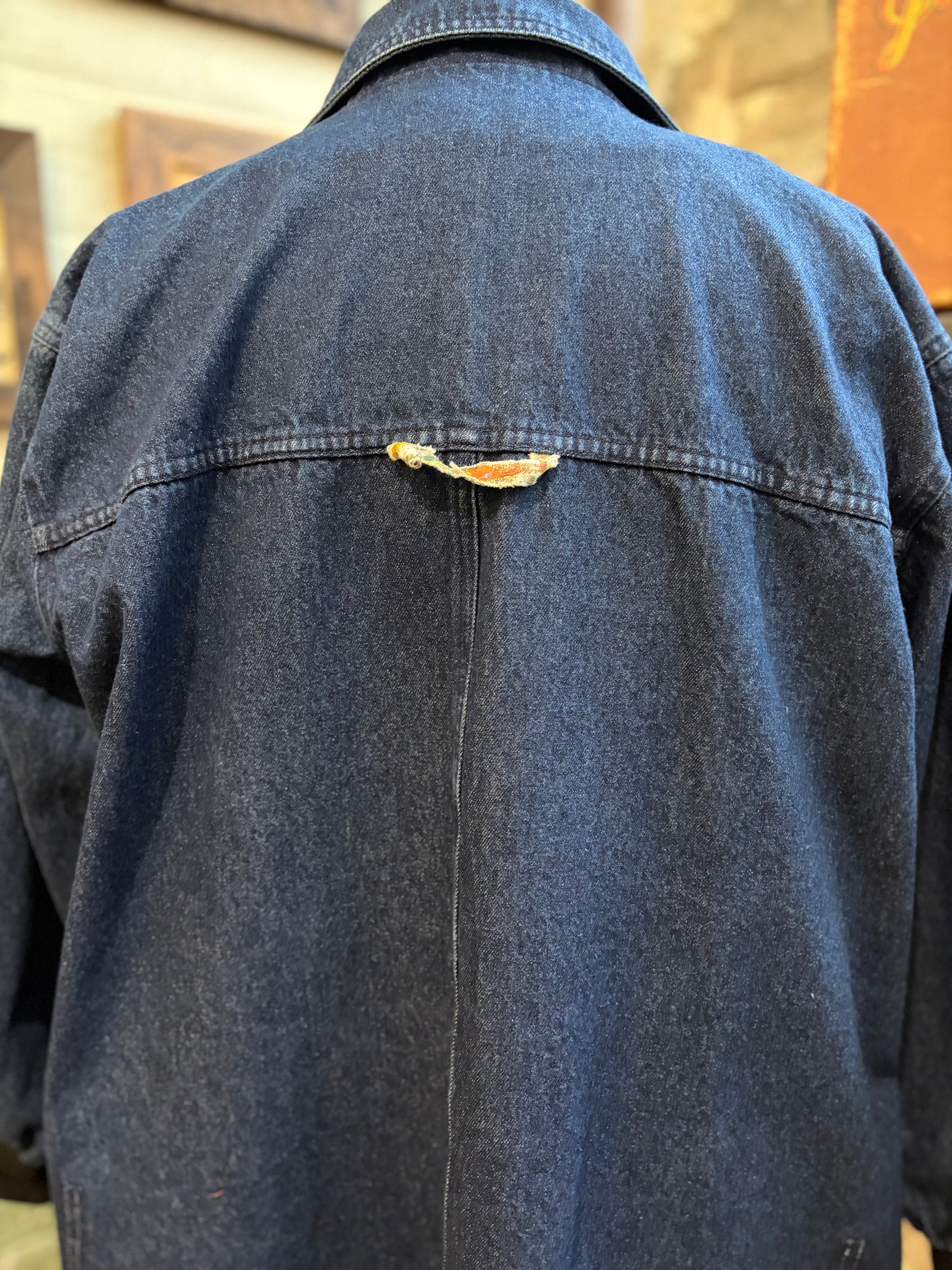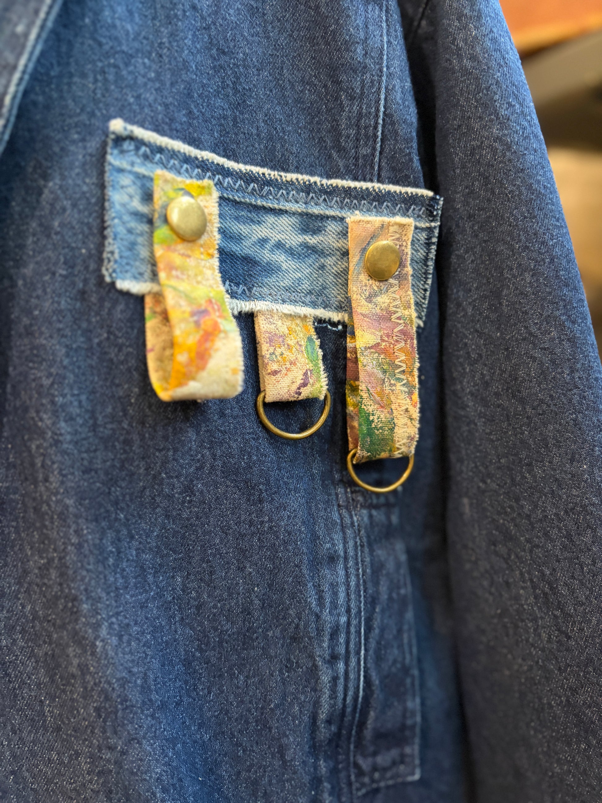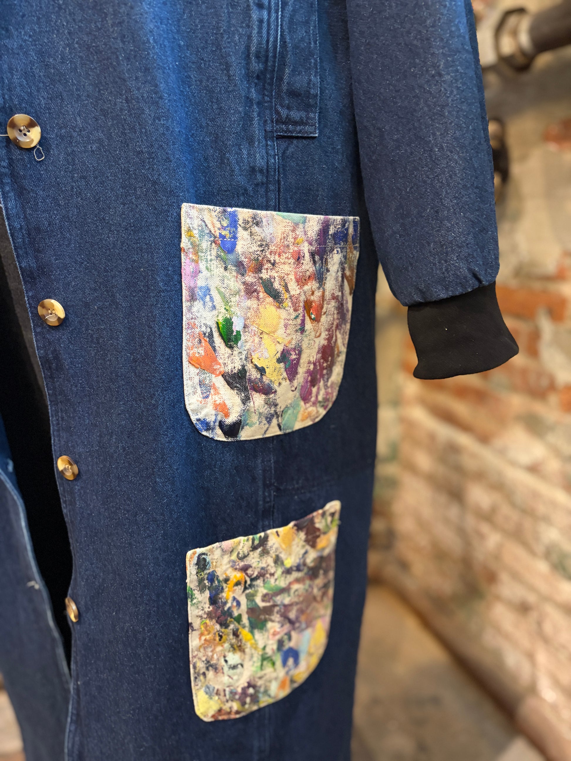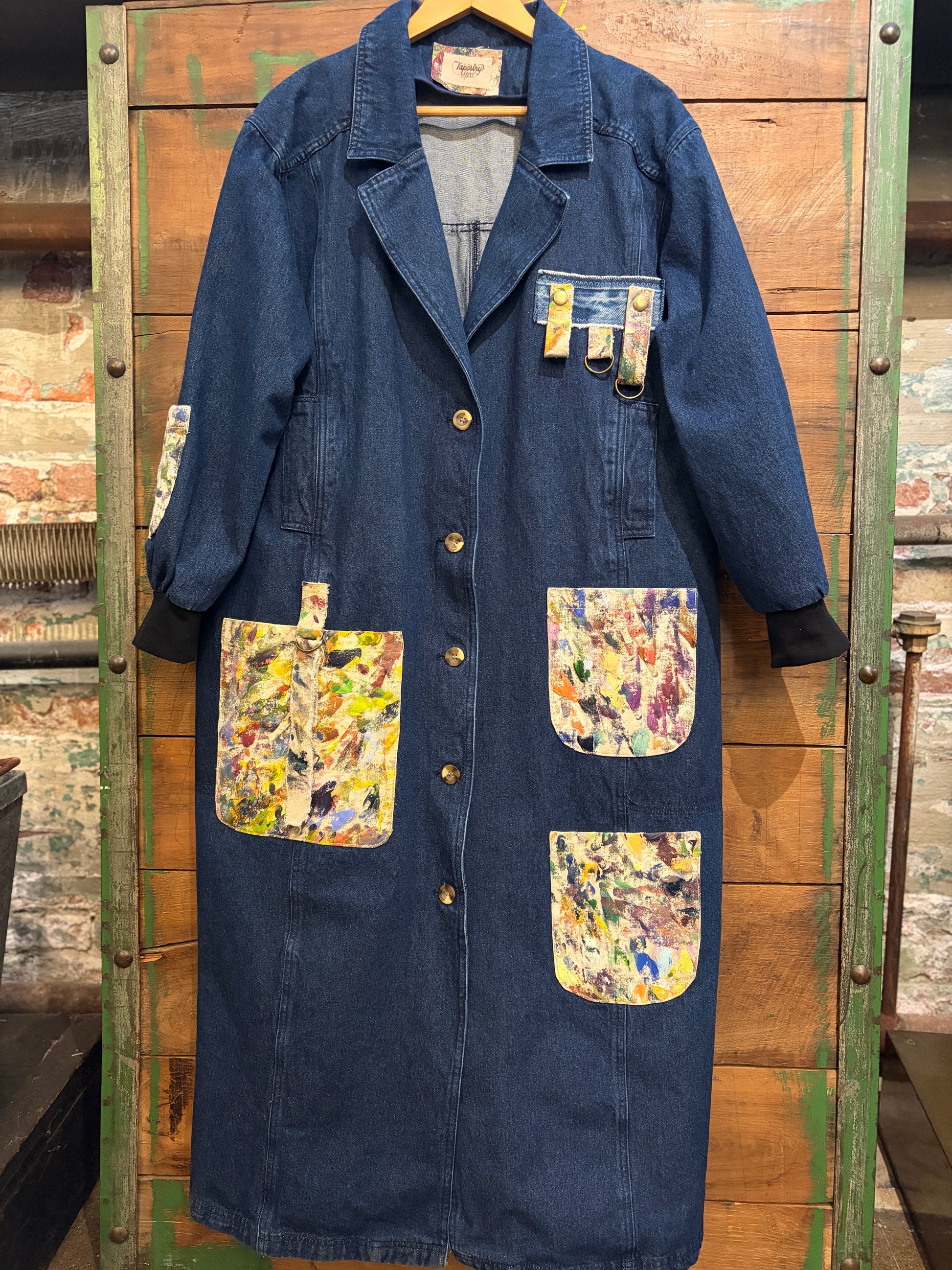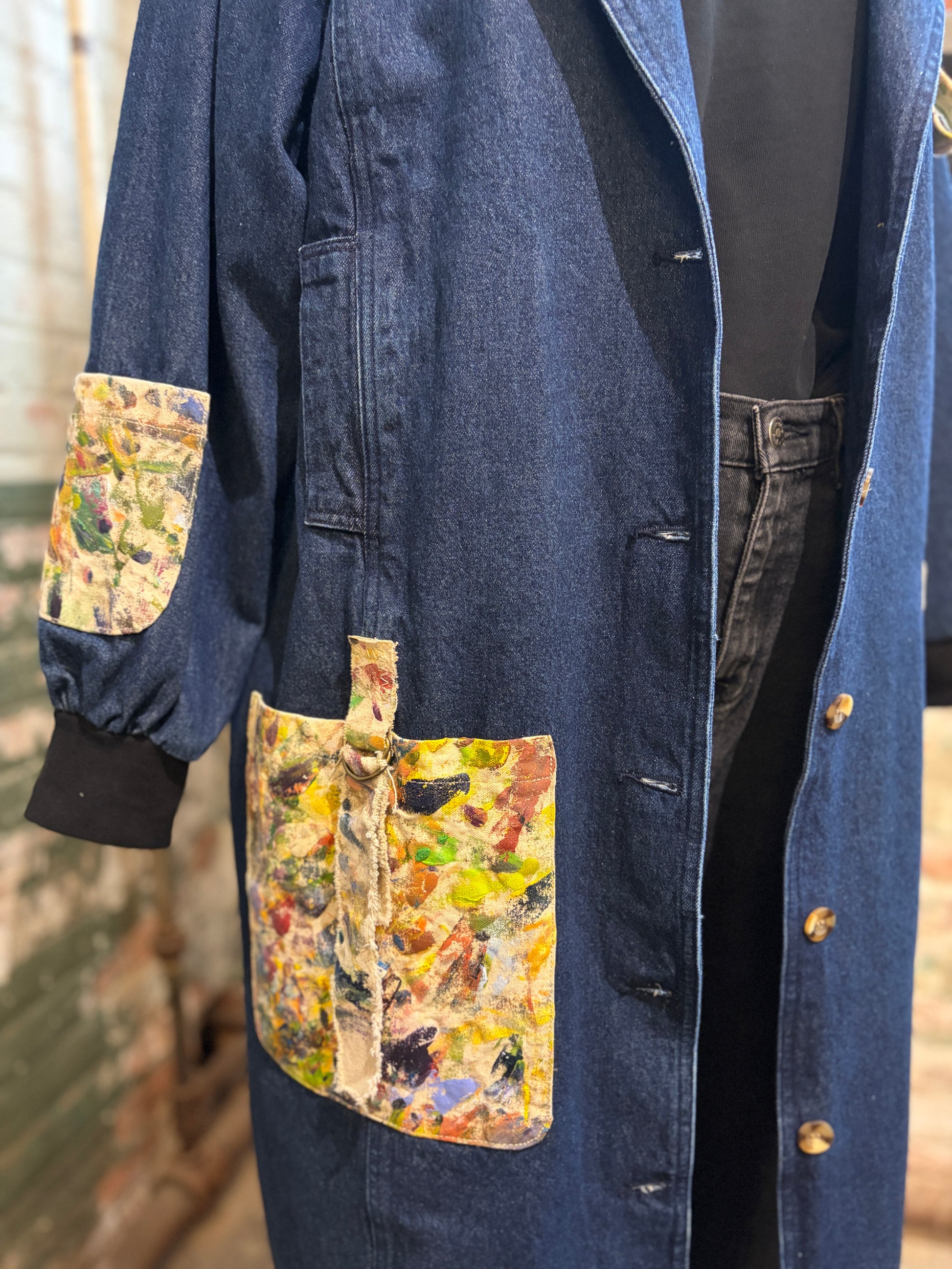 The Majestic is a statement vintage denim jacket that blends classic workwear with artistic flair. Featuring an oversized fit for effortless layering, this full-length piece showcases bold contrasting splatter-painted pockets on the front and sleeves; each one uniquely hand-detailed. Ribbed knit cuffs at the wrists add a refined finish and extra comfort. Perfect for those who want their outerwear to tell a story, this jacket pairs vintage authenticity with contemporary edge.