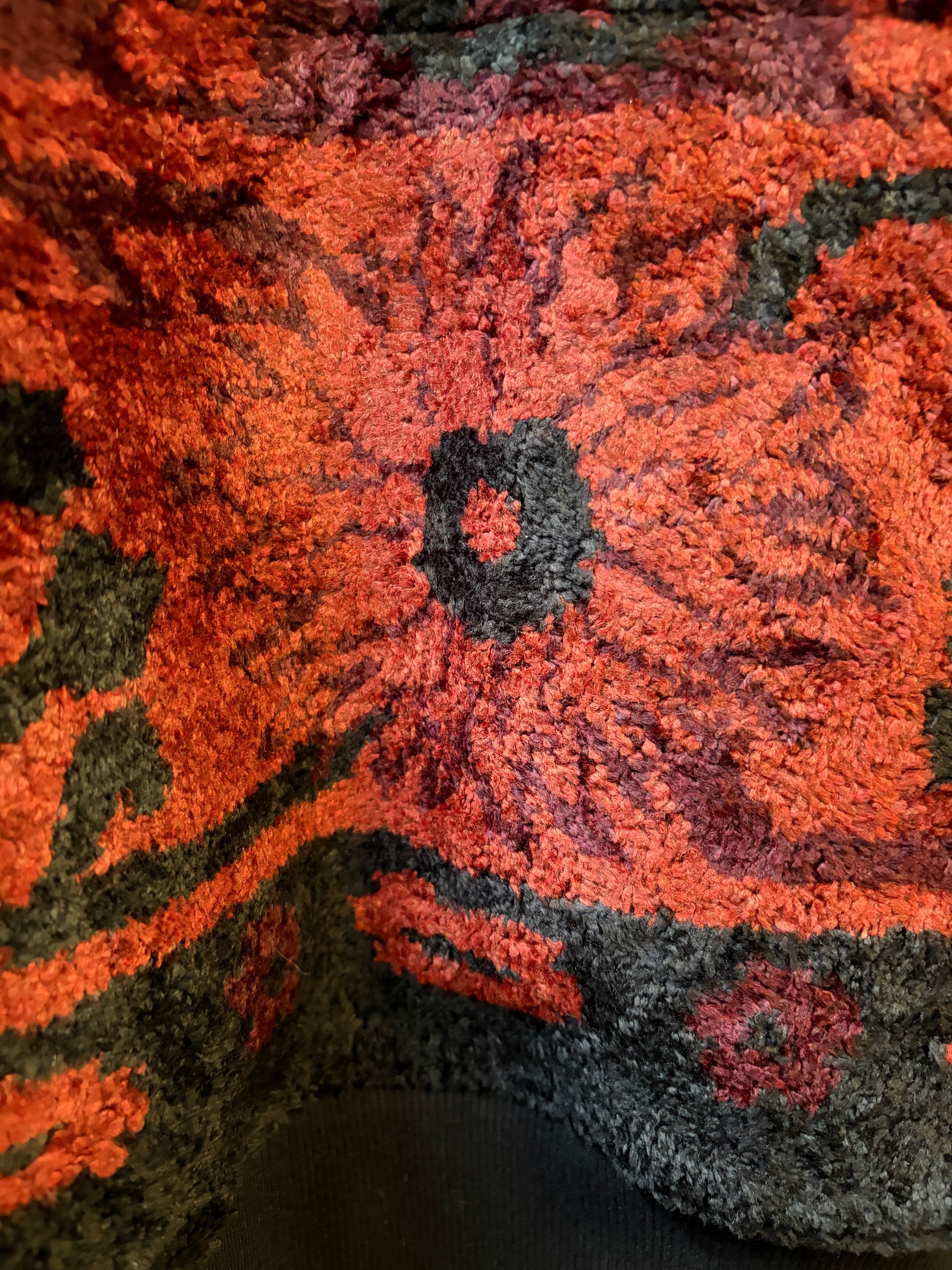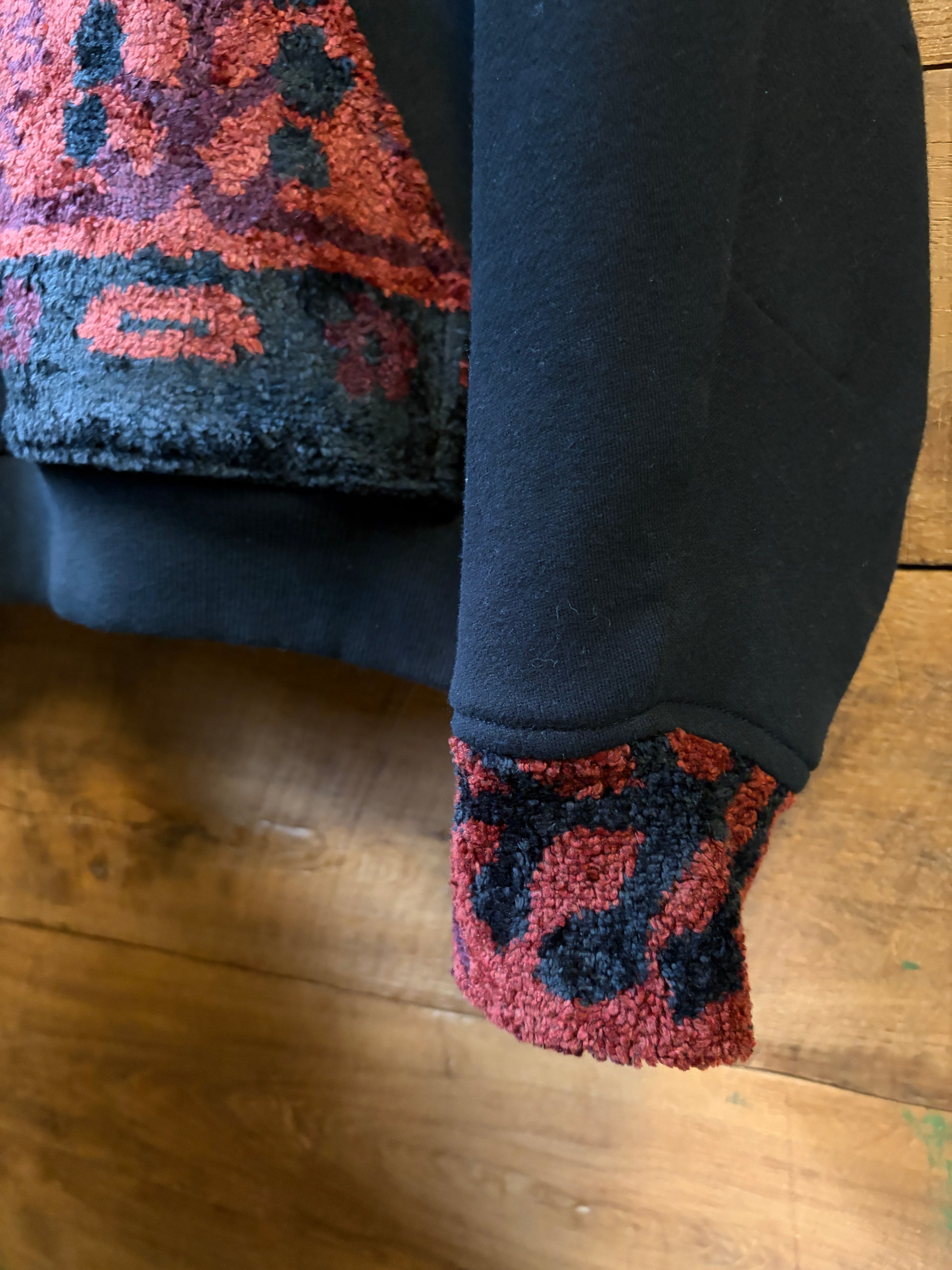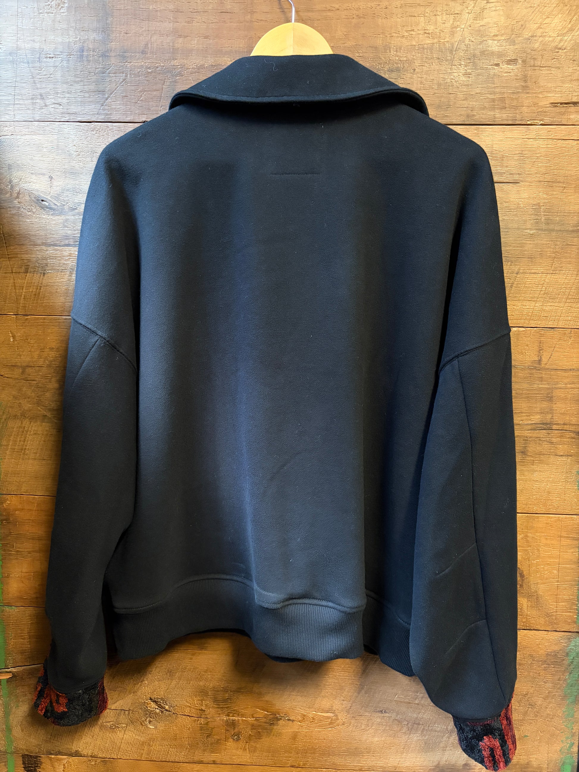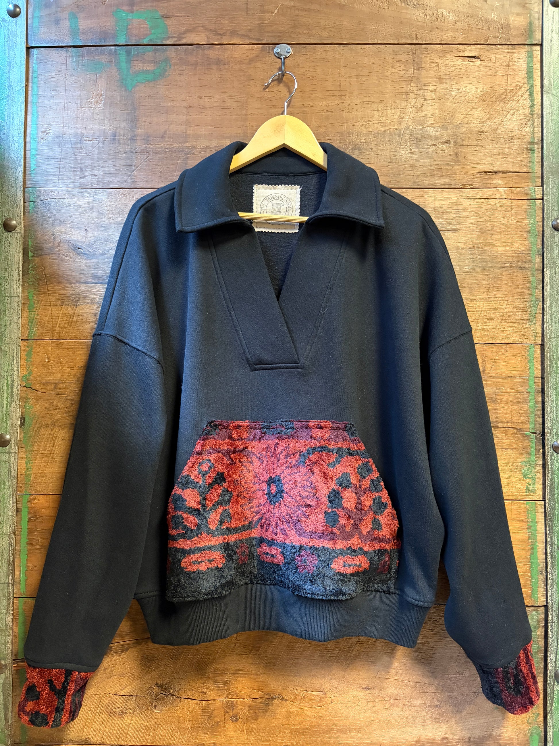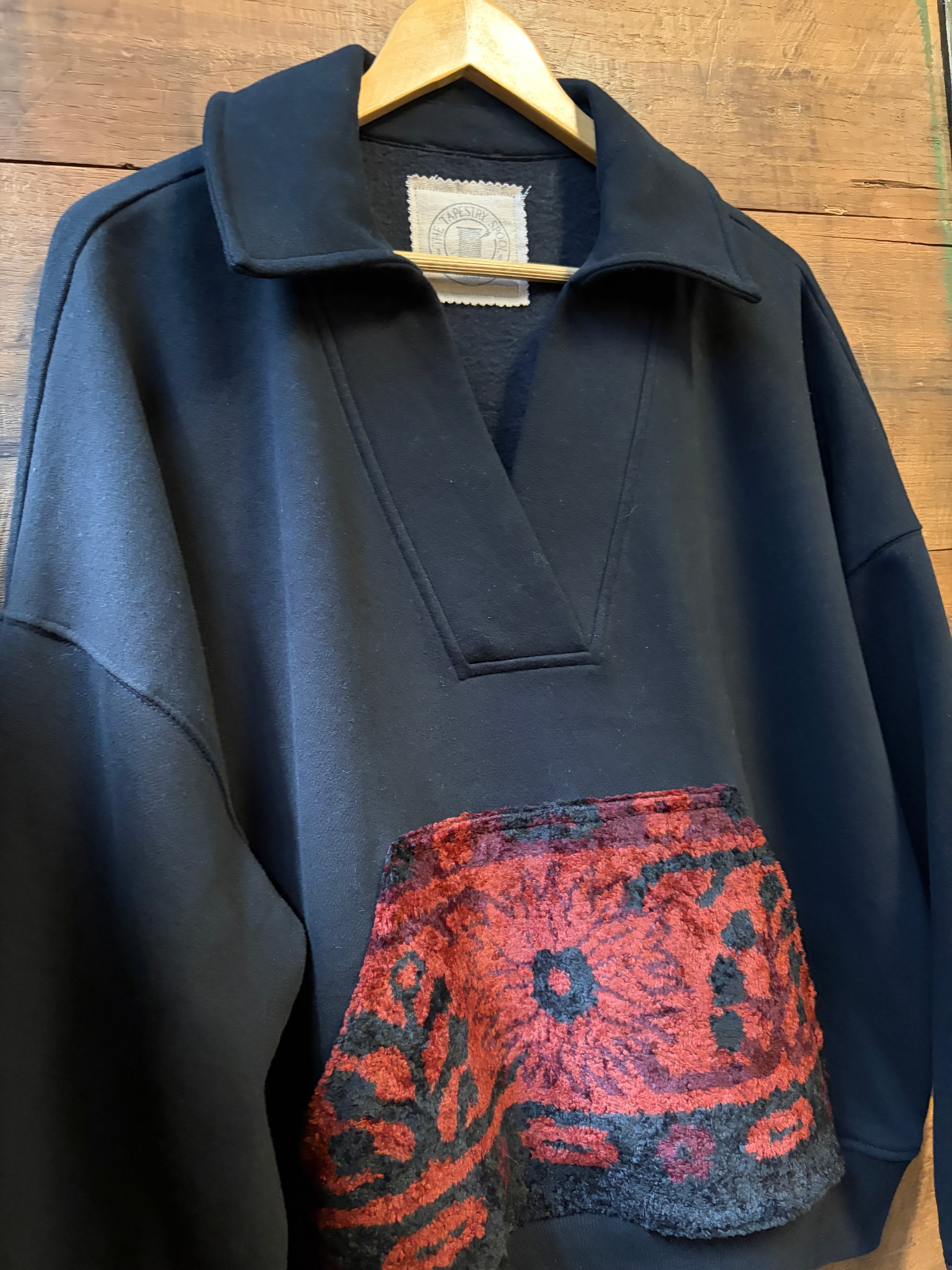 The Margot is an effortlessly cool Johnny collar style sweatshirt featuring dolman sleeves for easygoing comfort and a slightly cropped cut that’s perfect for layering. Contrasting pocket and cuffs were created from vintage chenille fabric in a gorgeous rust jewel tone, making every detail pop. Playful and eco-friendly, this cozy piece turns casual into a statement.