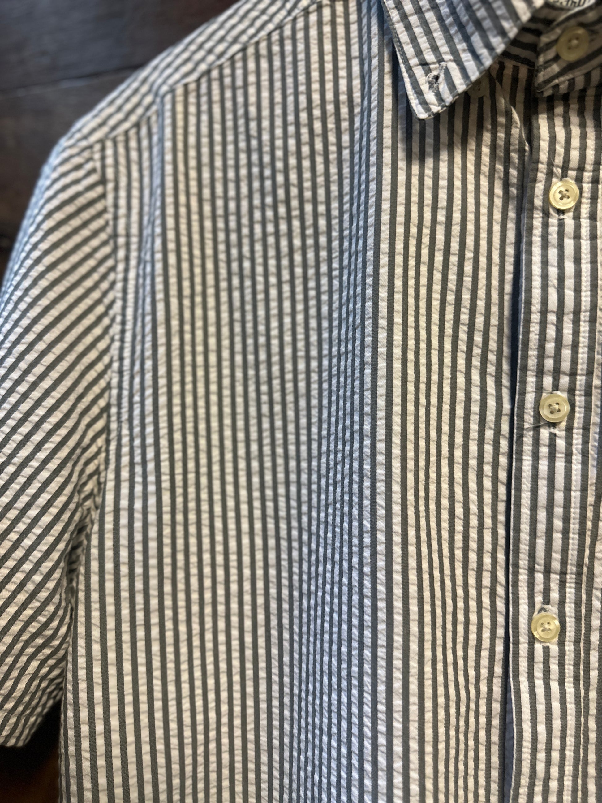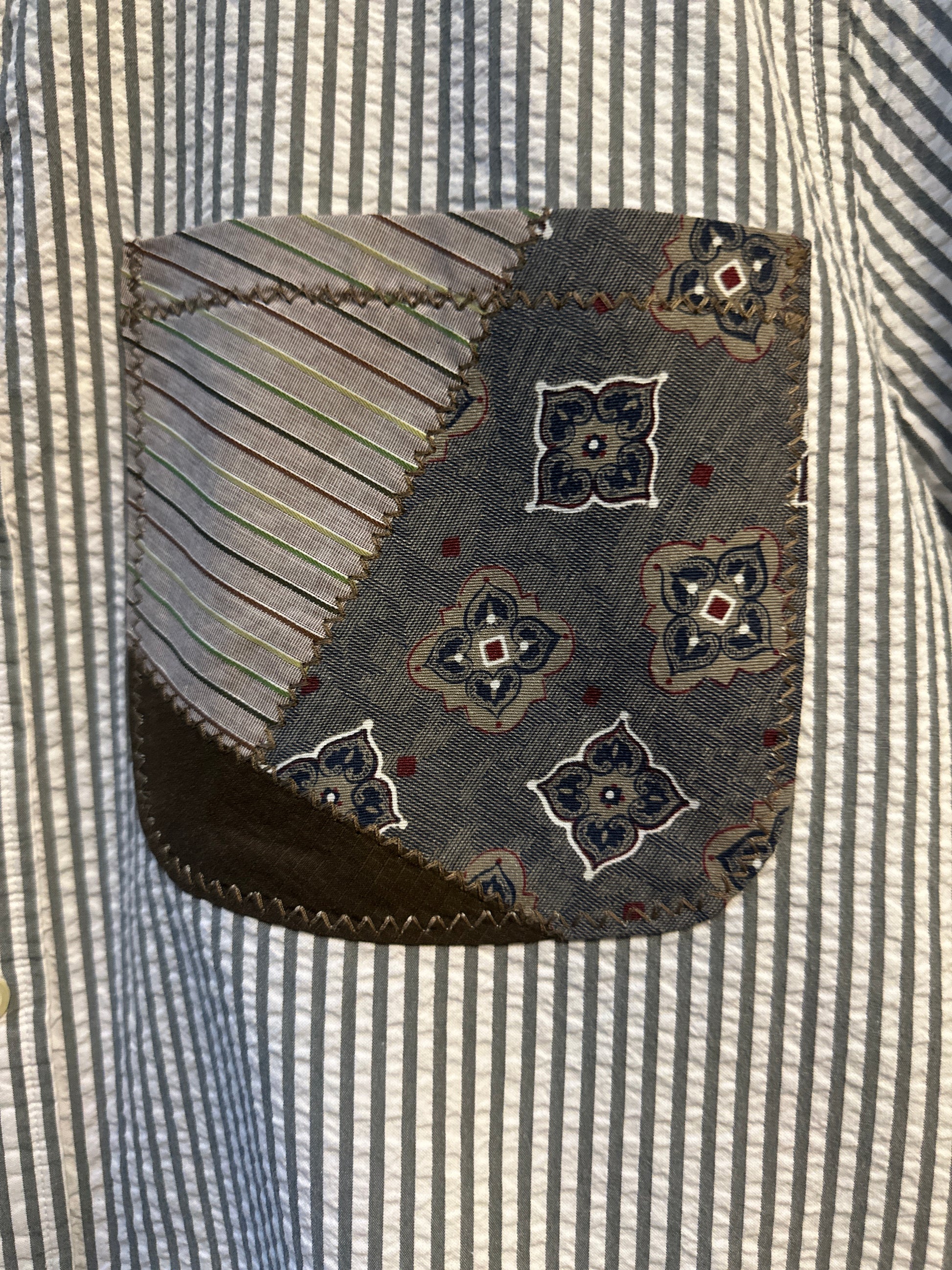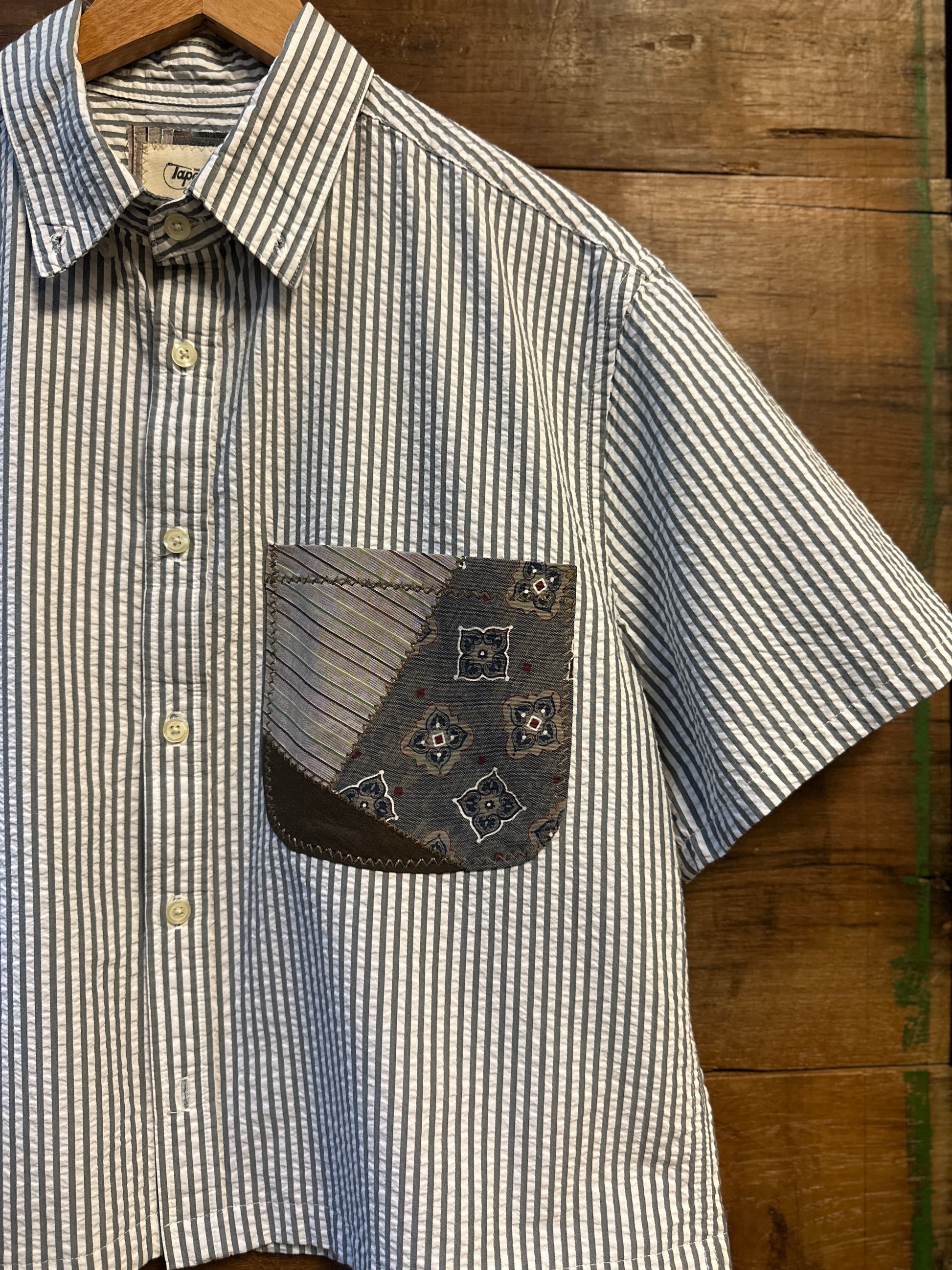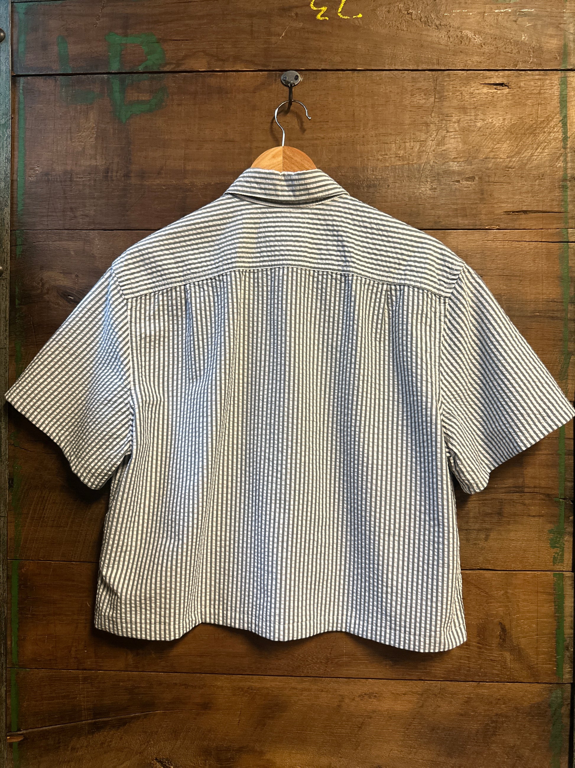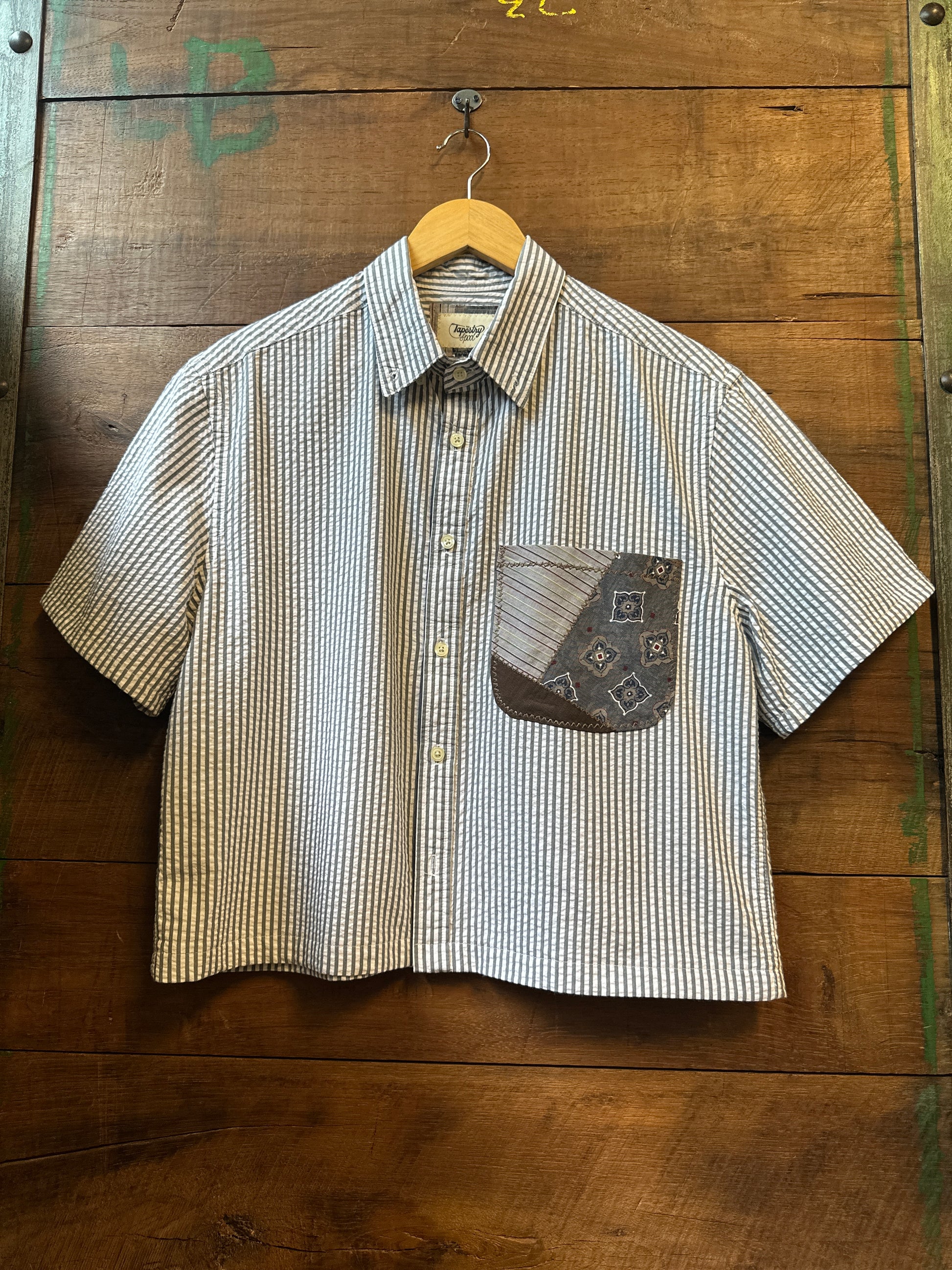 Meet The Marlowe, your new favorite upcycled shirt in a breezy seersucker fabric. With playful stripes and a quirky contrasting patched pocket, this slightly cropped, boxy-fit top adds a fresh twist to your wardrobe. Perfect for those who love style with a sustainable edge!