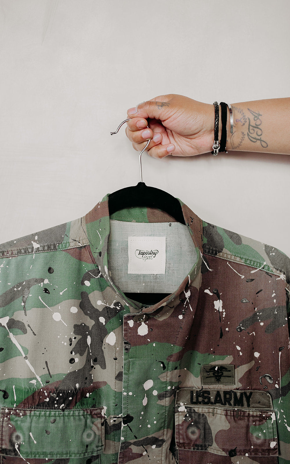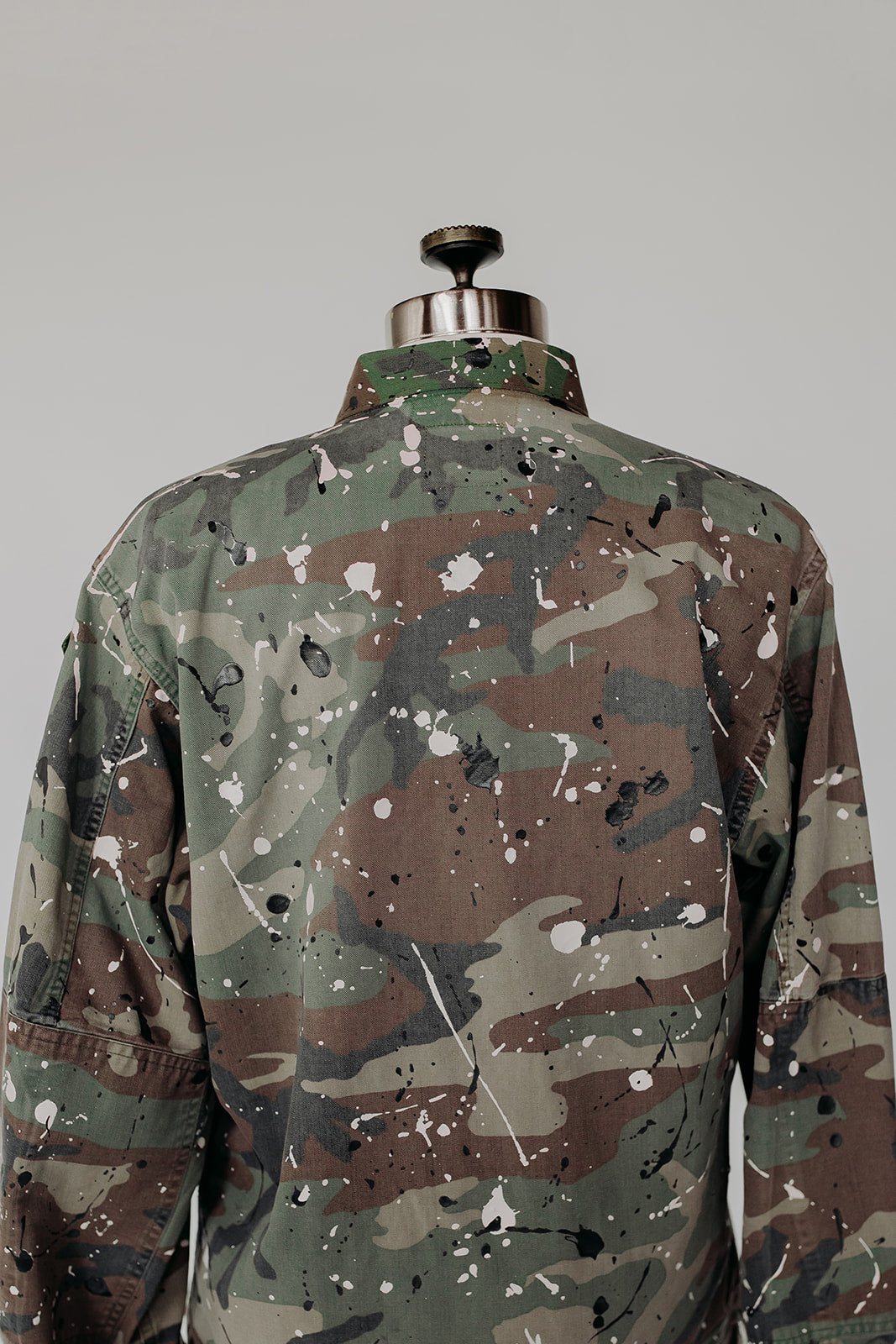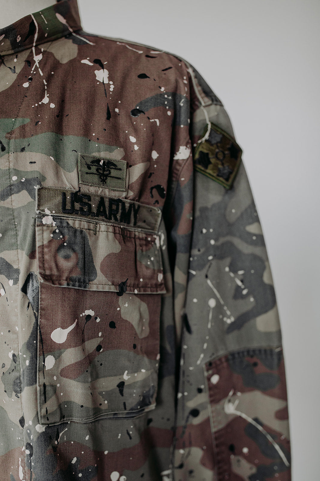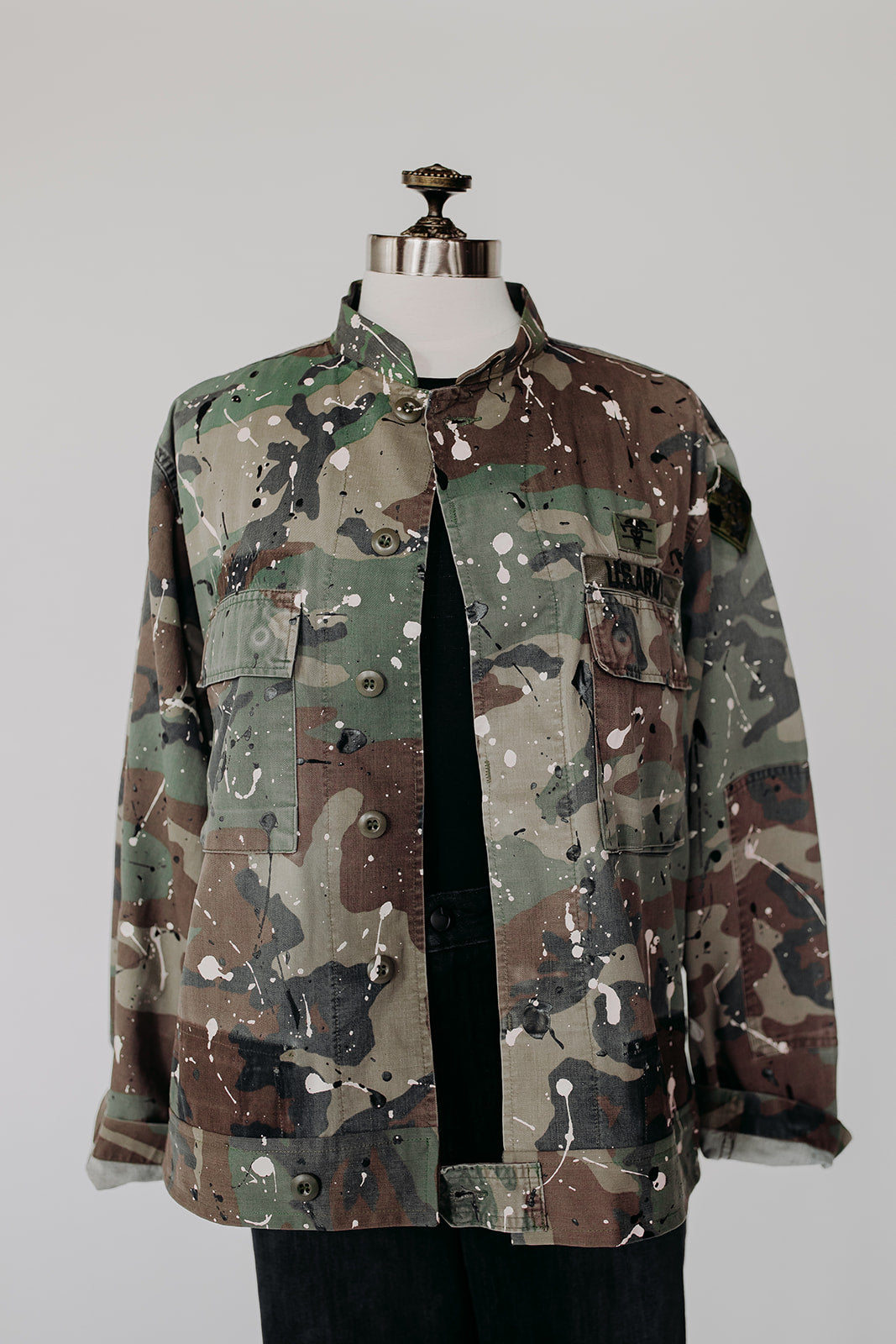 One of two jackets in the collection to feature a mandarin style collar – this one in a medium weight fabric and a relaxed fit. Two front pockets, added band with tab at hemline and paint splatters throughout. Super versatile, can be worn with almost anything.
