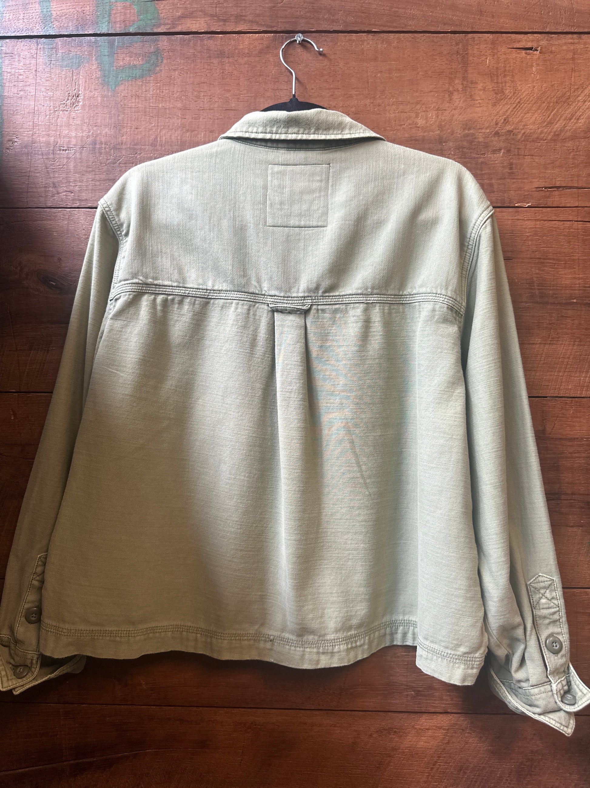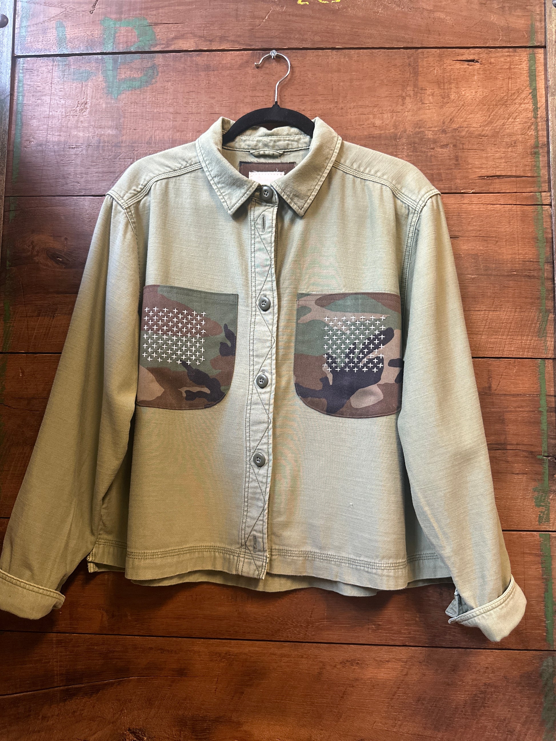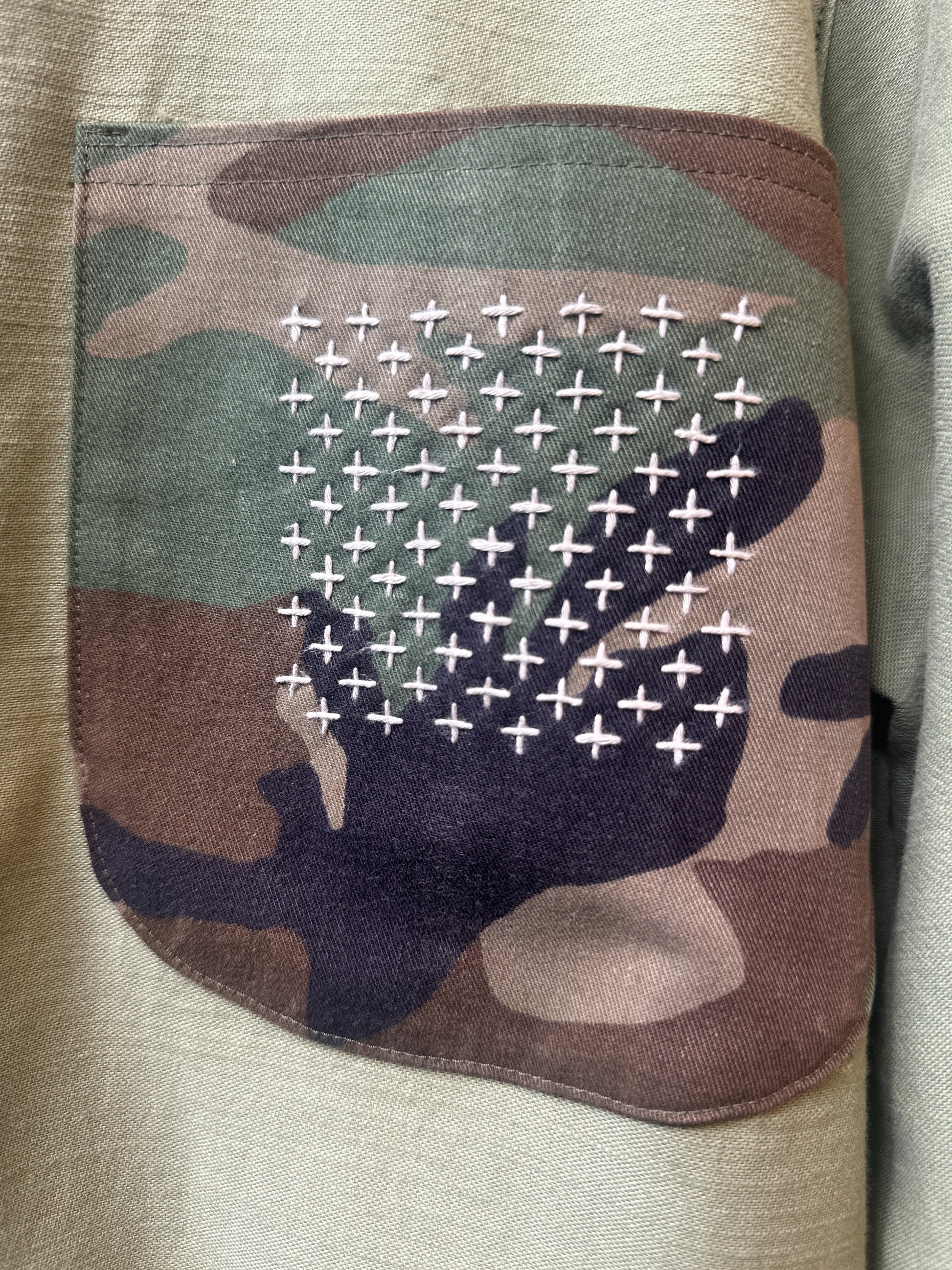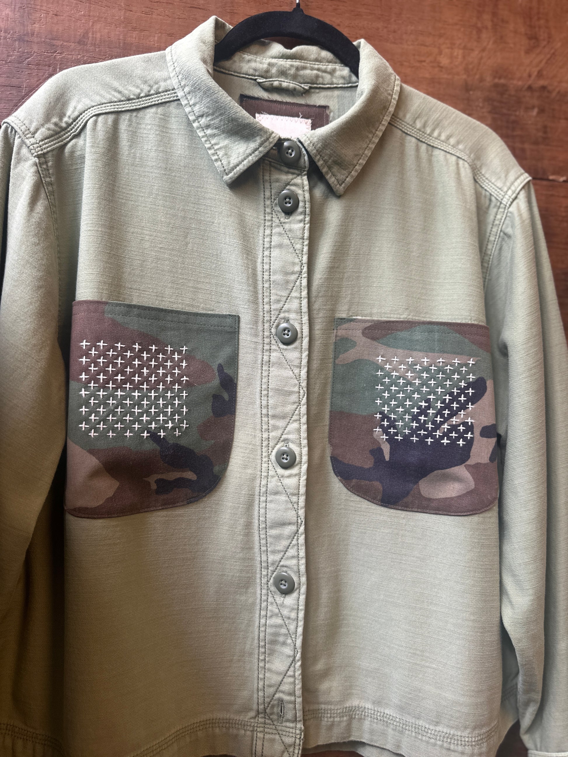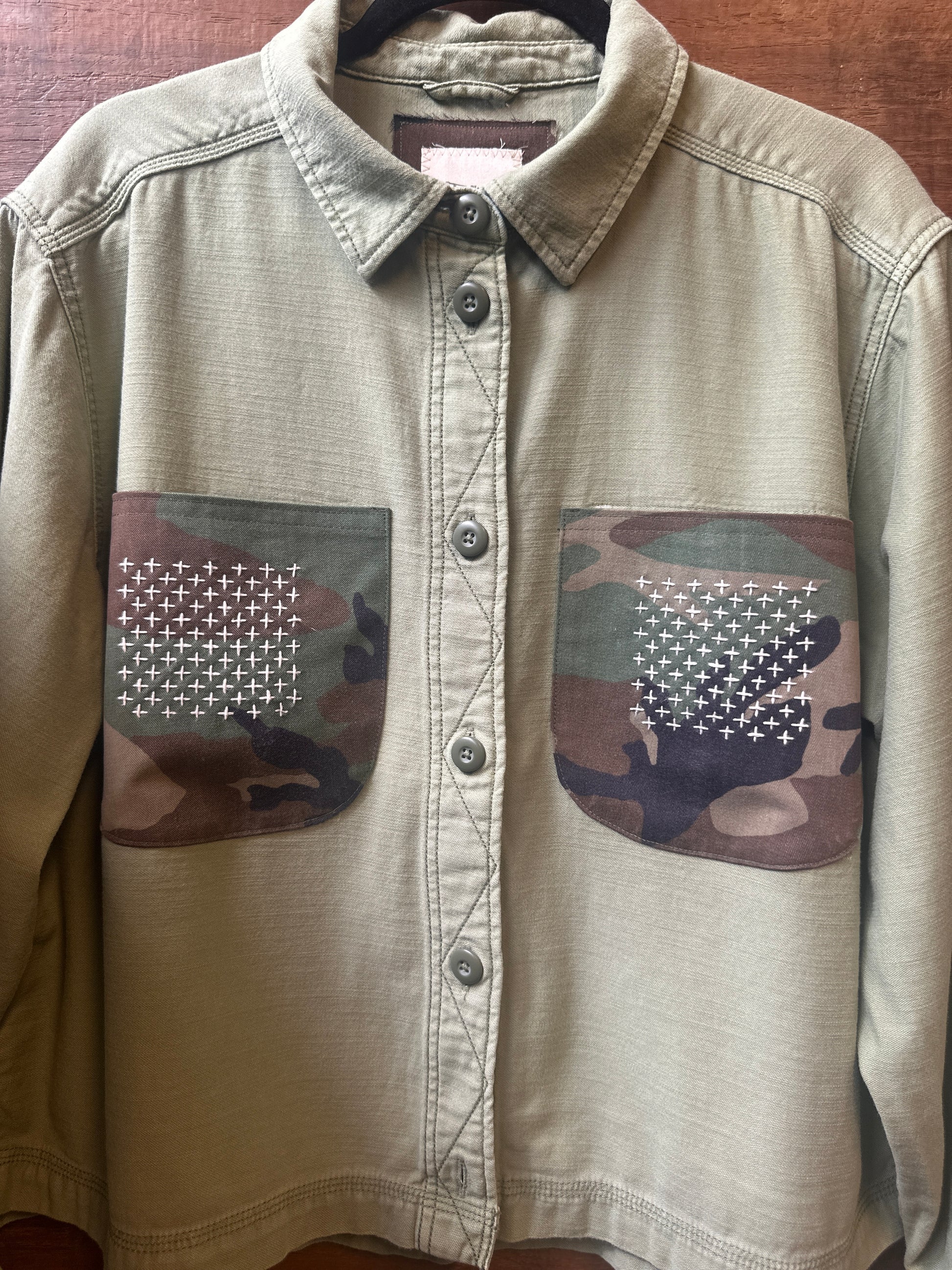 Get ready to stand out with The Mimi! This upcycled shirt in army green boasts large camo pockets with sashiko stitching for a unique touch. Its oversized fit and super soft material will have you feeling stylish and comfortable all day long.
