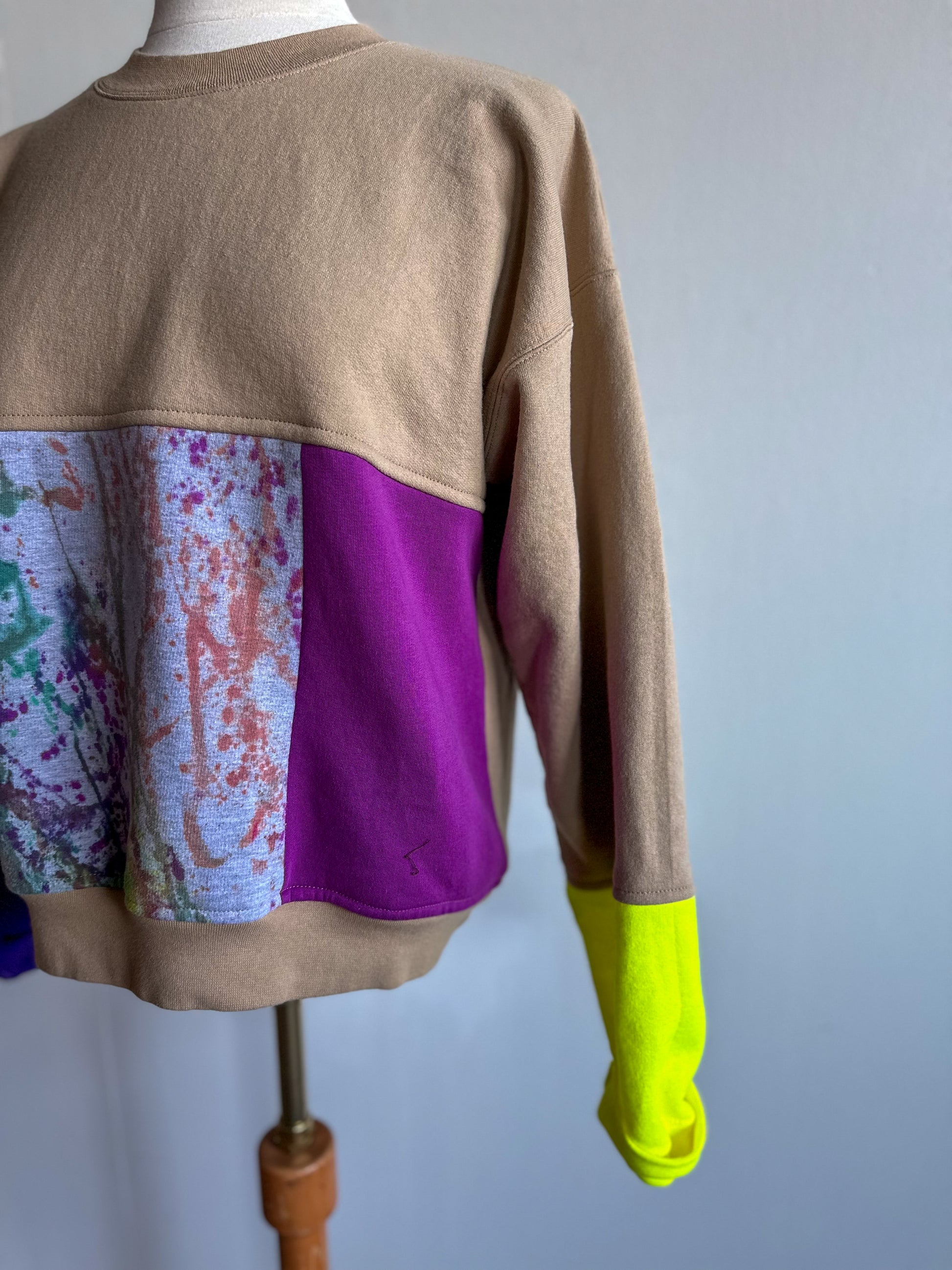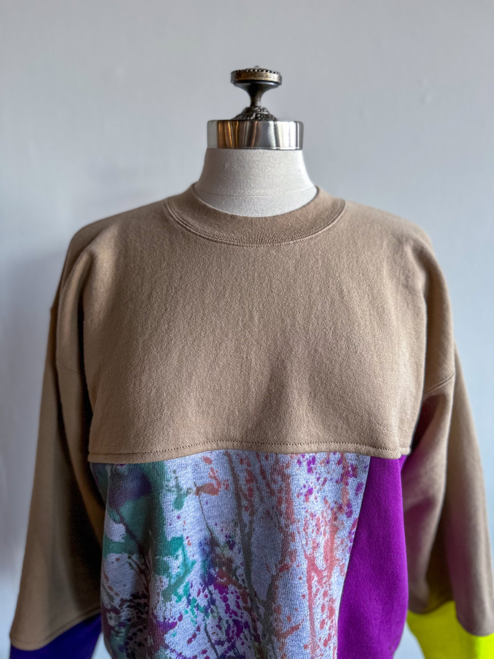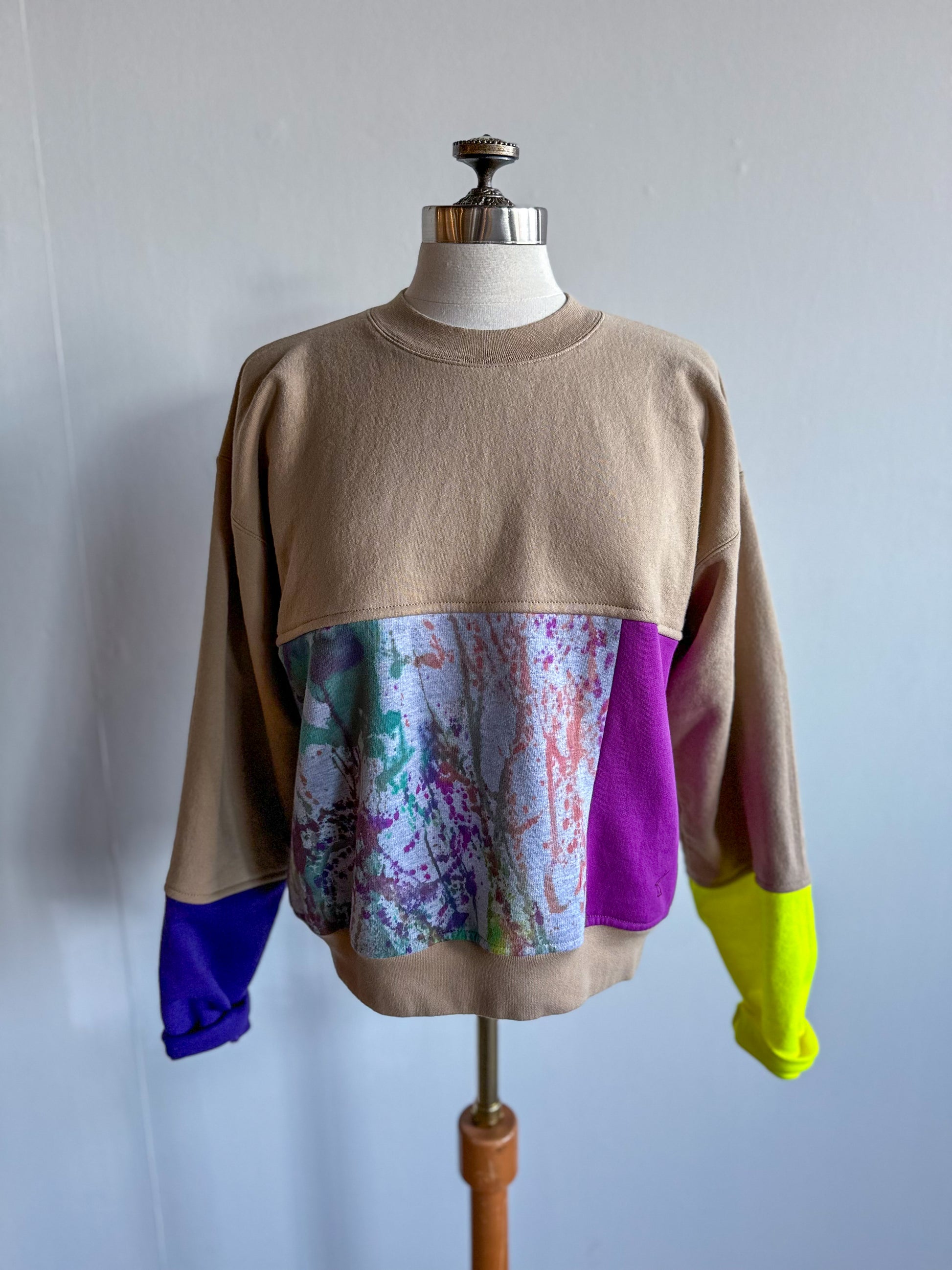 Get ready to rock The Misha, the ultimate upcycled crewneck sweatshirt! With a playful color block design and unique tie dye pattern, this sweatshirt is sure to turn heads. Slightly cropped, relaxed fit in a medium weight knit.
