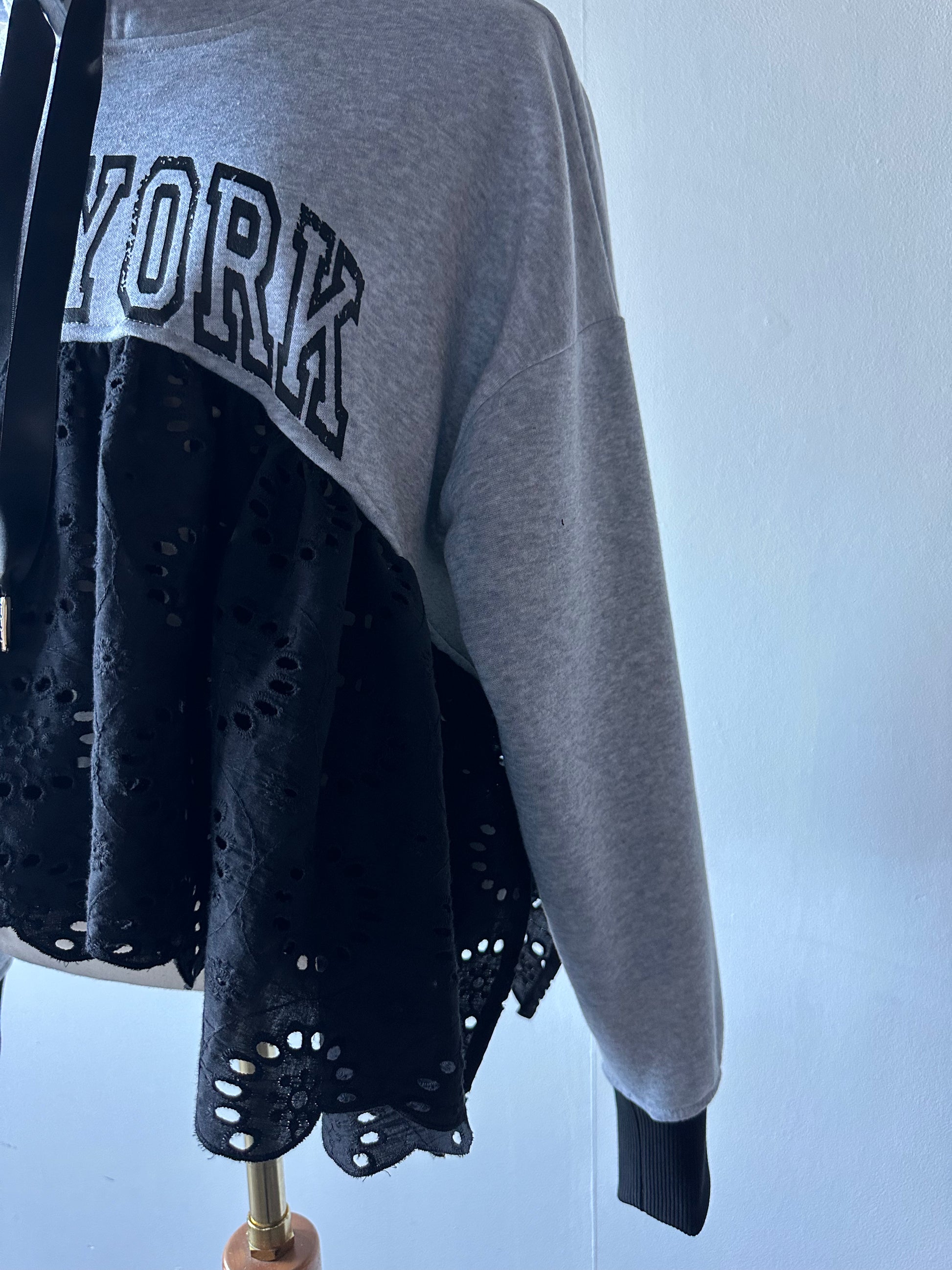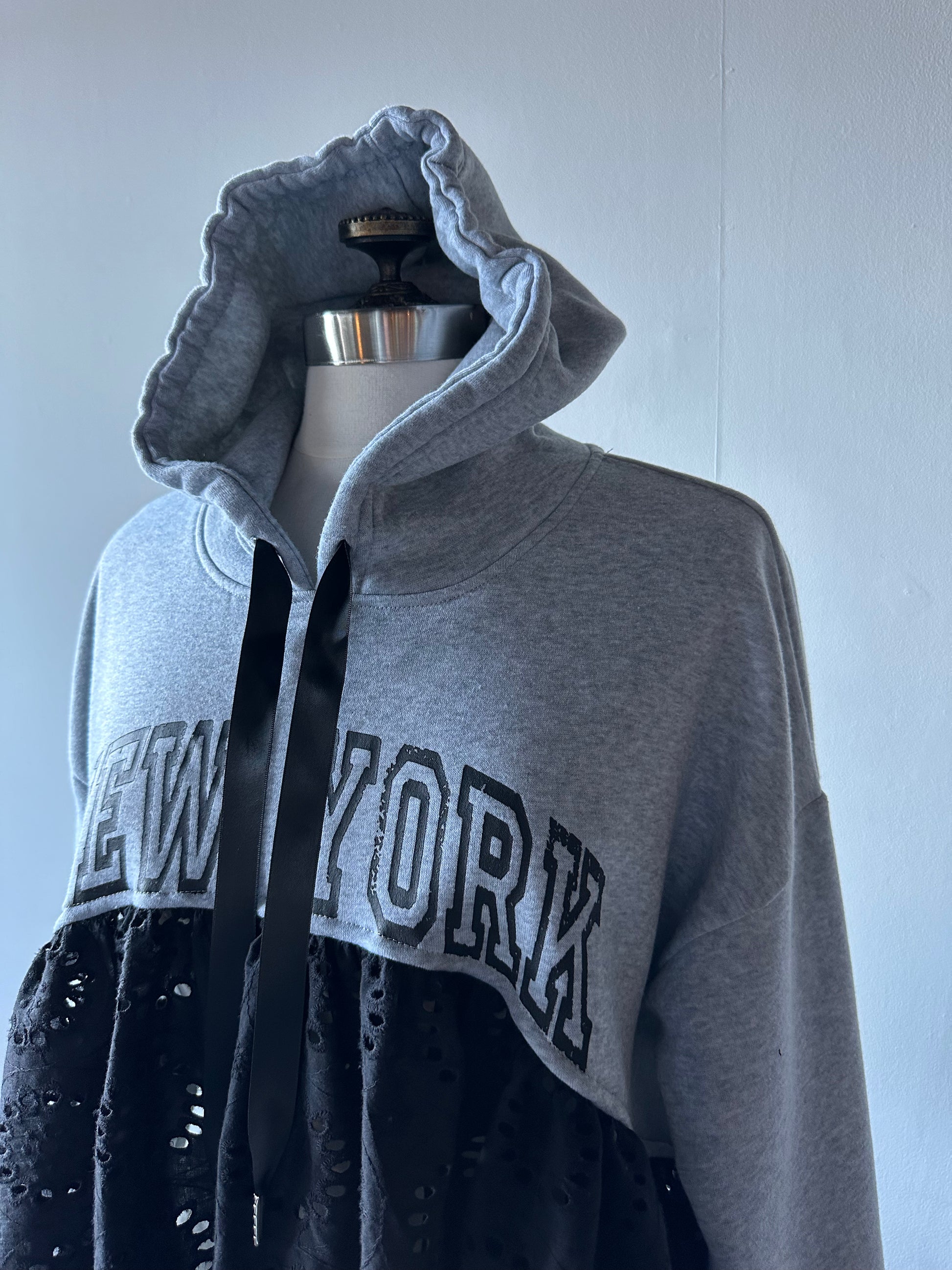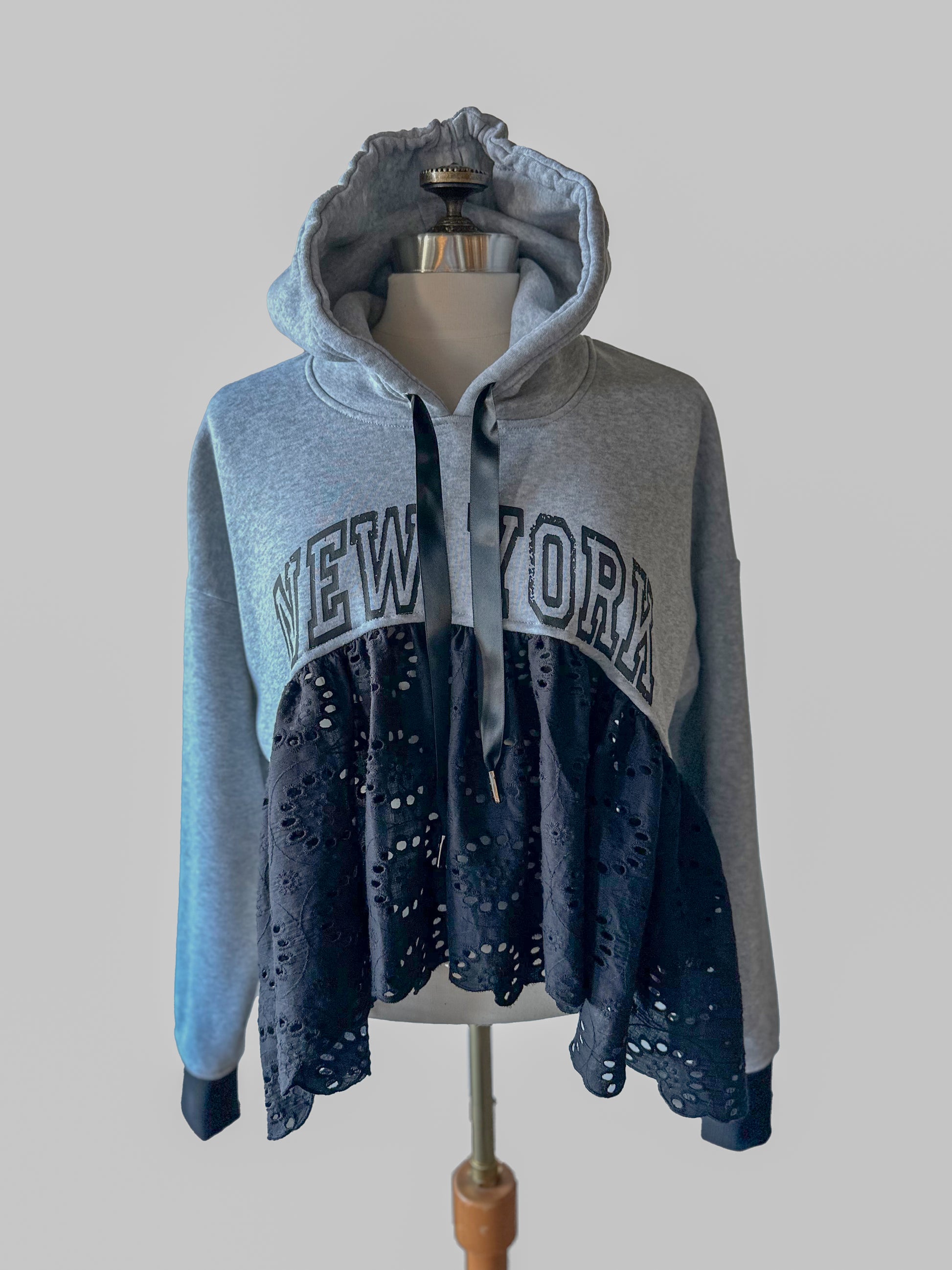 Take your style to the streets with The New York hoodie. Made from upcycled materials, featuring a bold graphic and unique eyelet ruffle detail. Slightly shorter in the front and longer on the sides with a split for a super easy and comfortable fit!