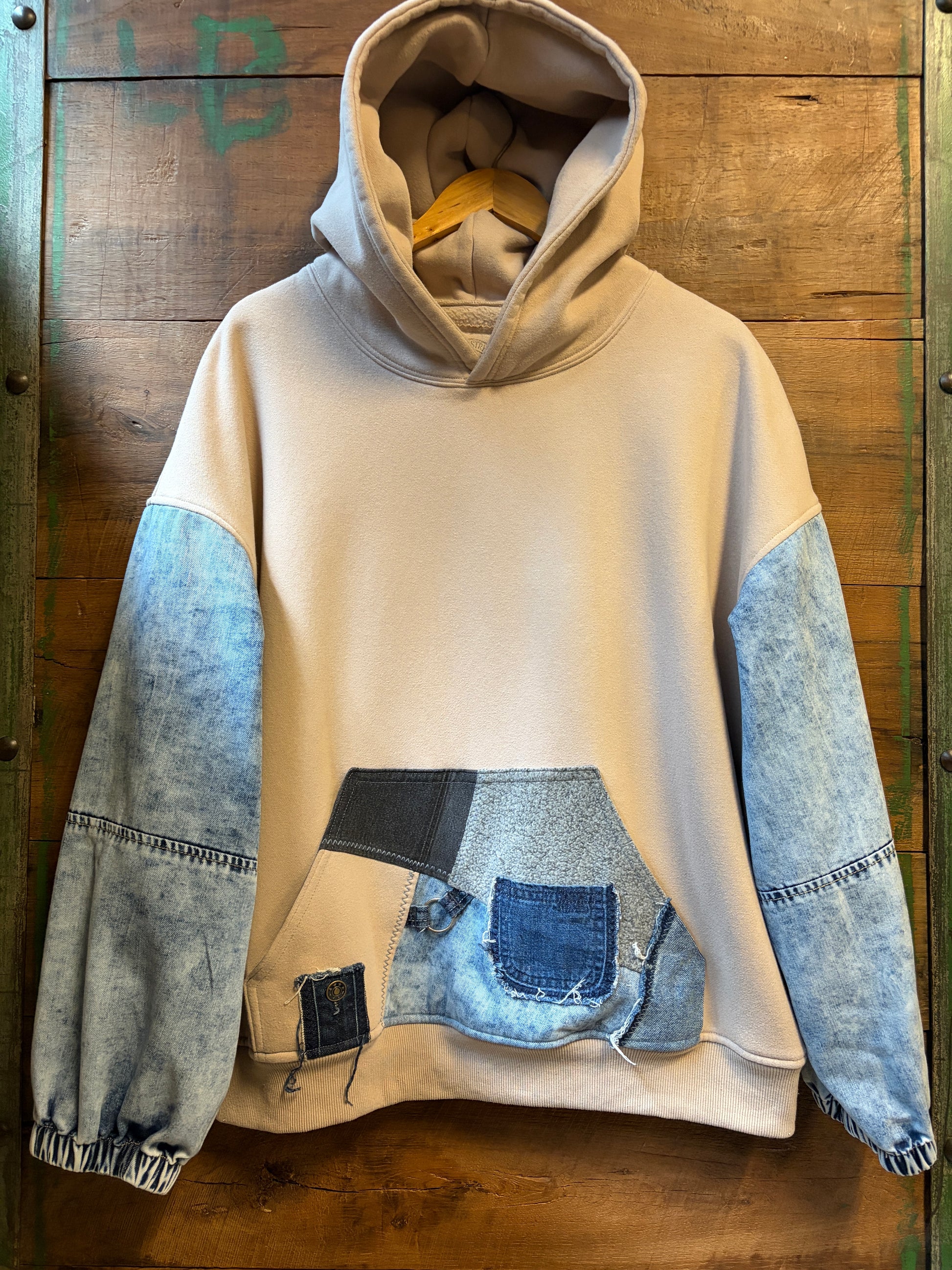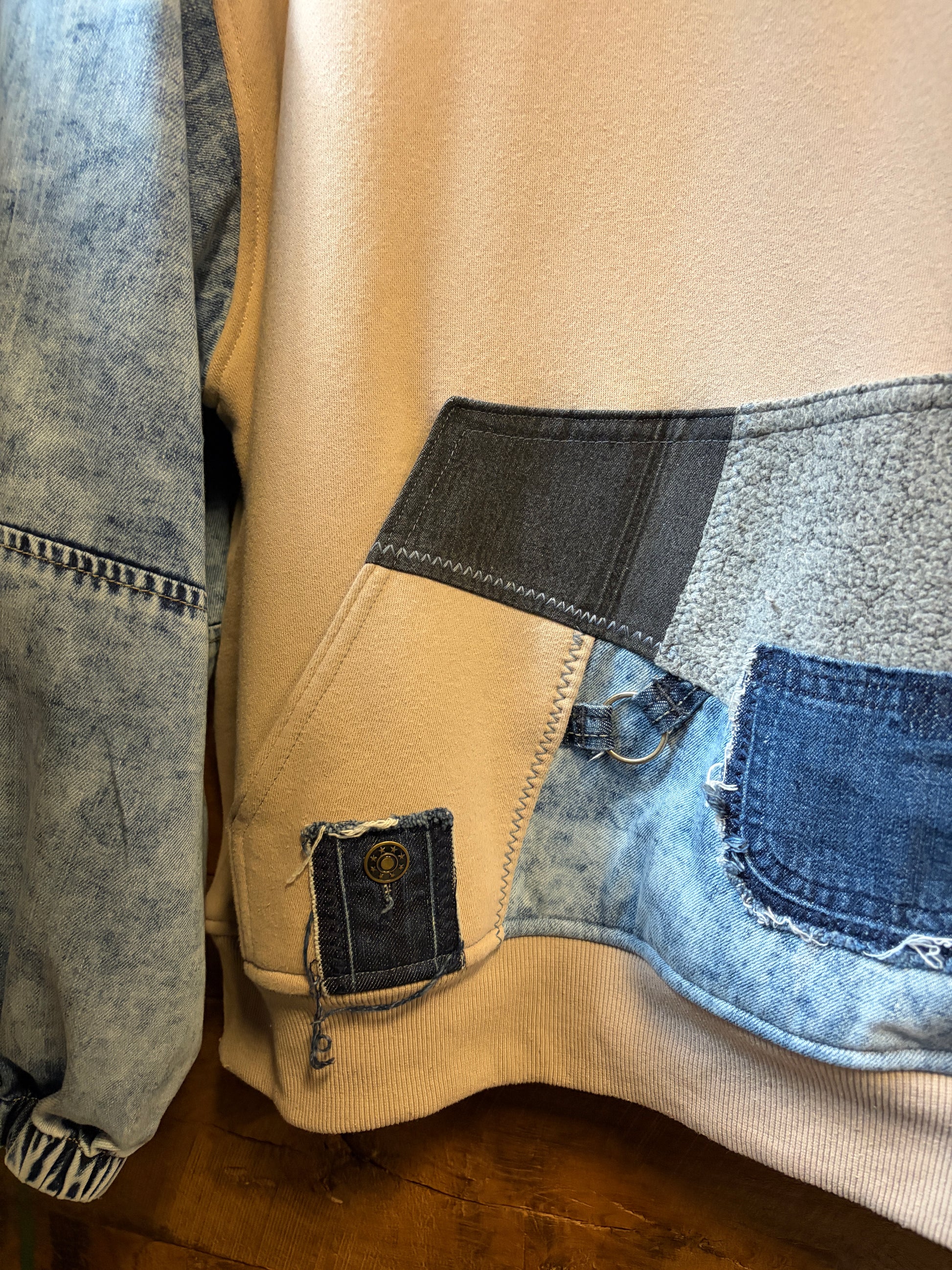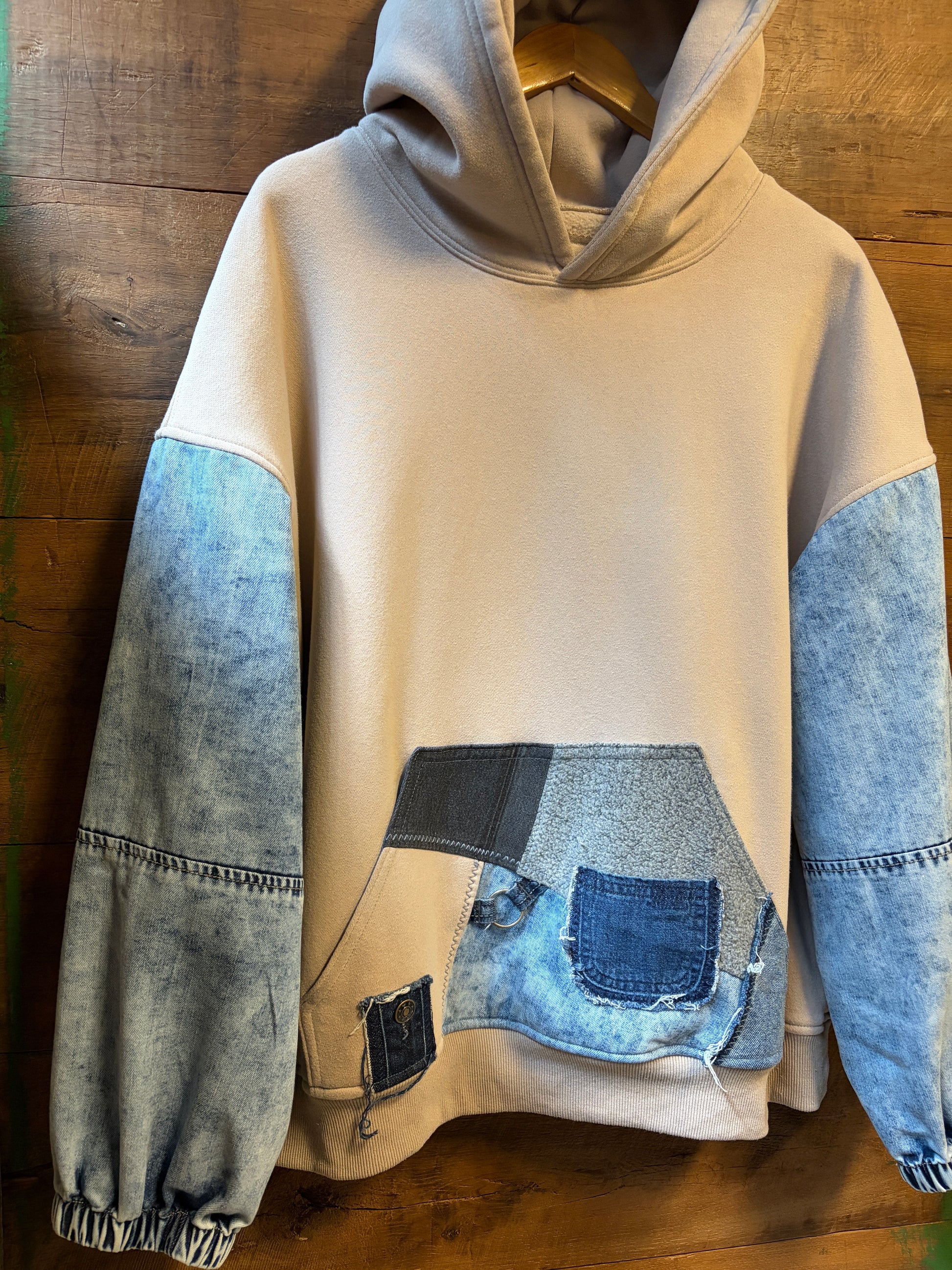 Get cozy with The Nova, an oversized hoodie that’s full of personality! Crafted from upcycled materials, it features bold denim sleeves that bring a playful twist to your everyday look. The patchwork kanga pocket adds fun texture and handy storage for your essentials. Perfectly roomy and endlessly stylish, The Nova invites you to embrace comfort and creativity all at once.