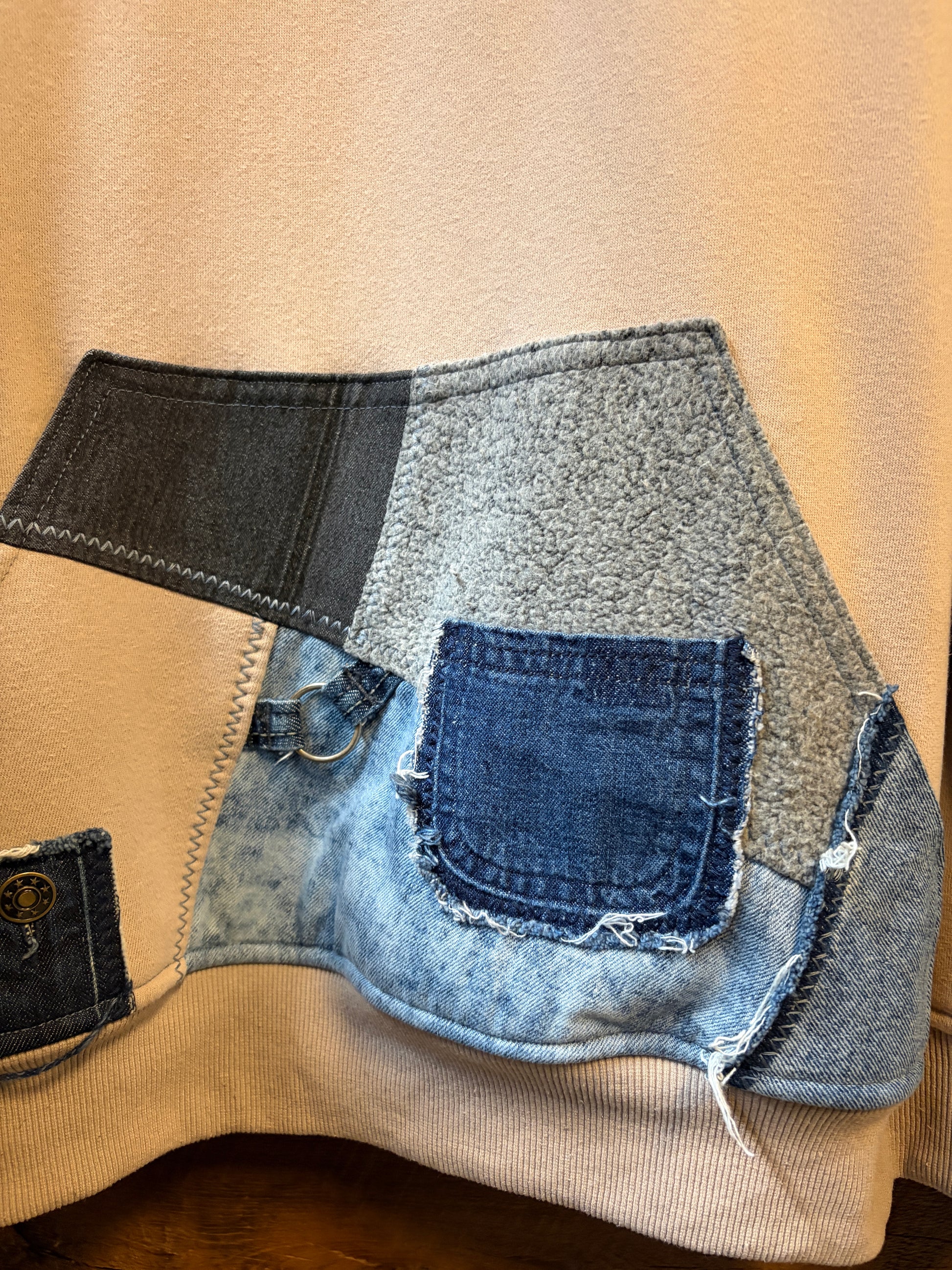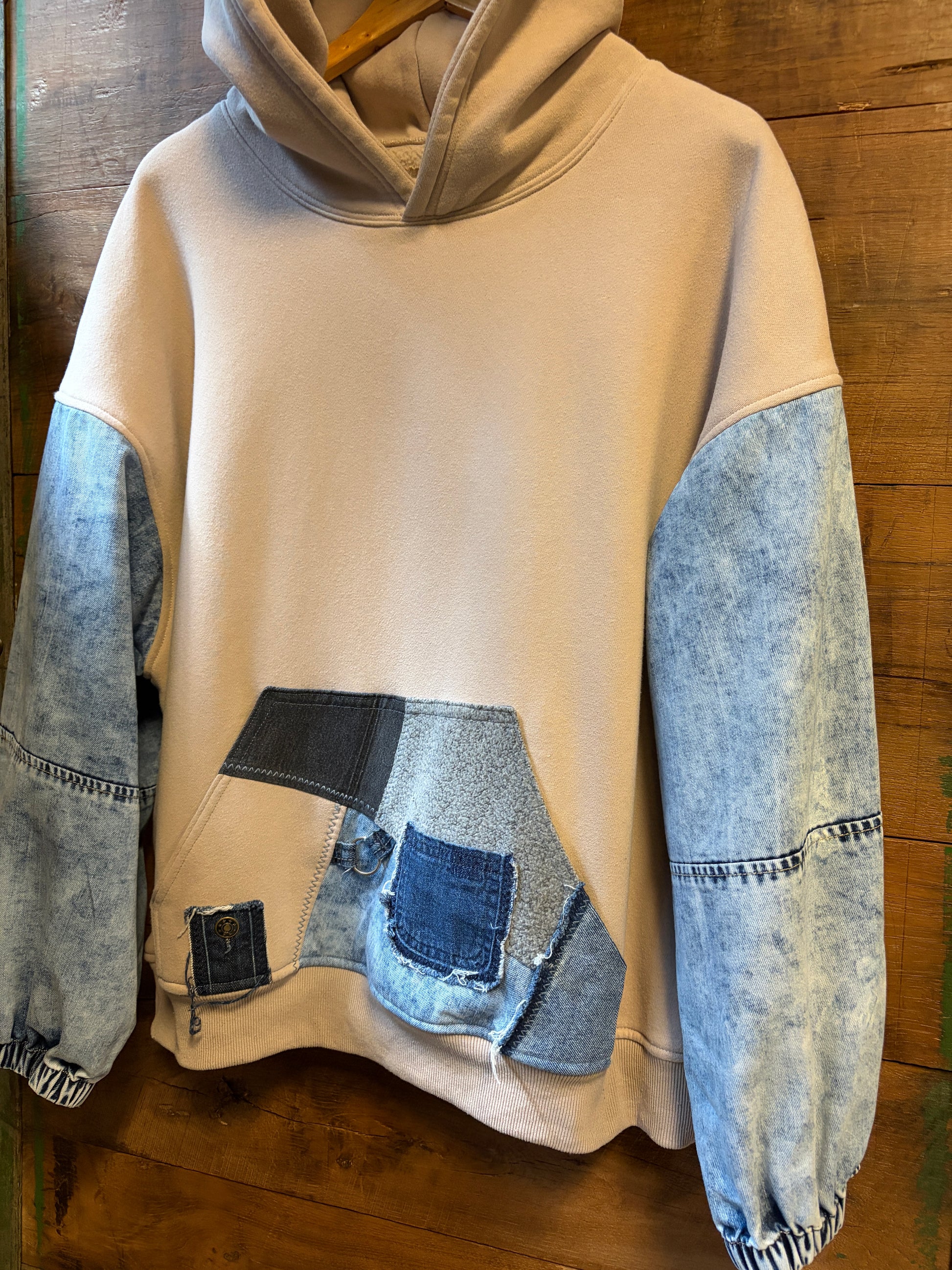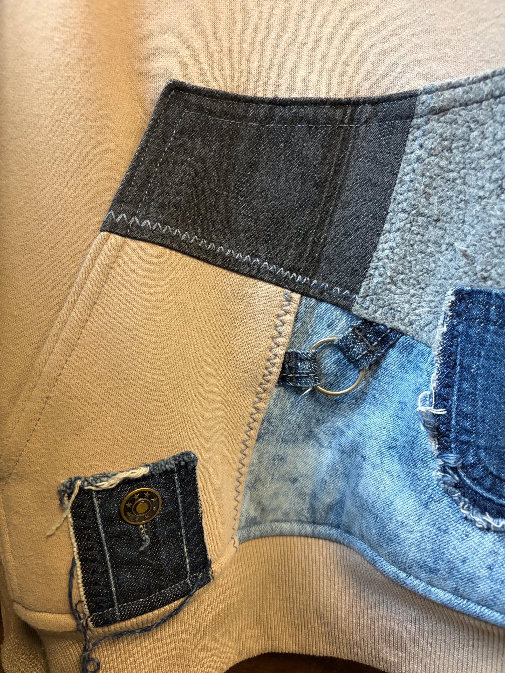 Get cozy with The Nova, an oversized hoodie that’s full of personality! Crafted from upcycled materials, it features bold denim sleeves that bring a playful twist to your everyday look. The patchwork kanga pocket adds fun texture and handy storage for your essentials. Perfectly roomy and endlessly stylish, The Nova invites you to embrace comfort and creativity all at once.