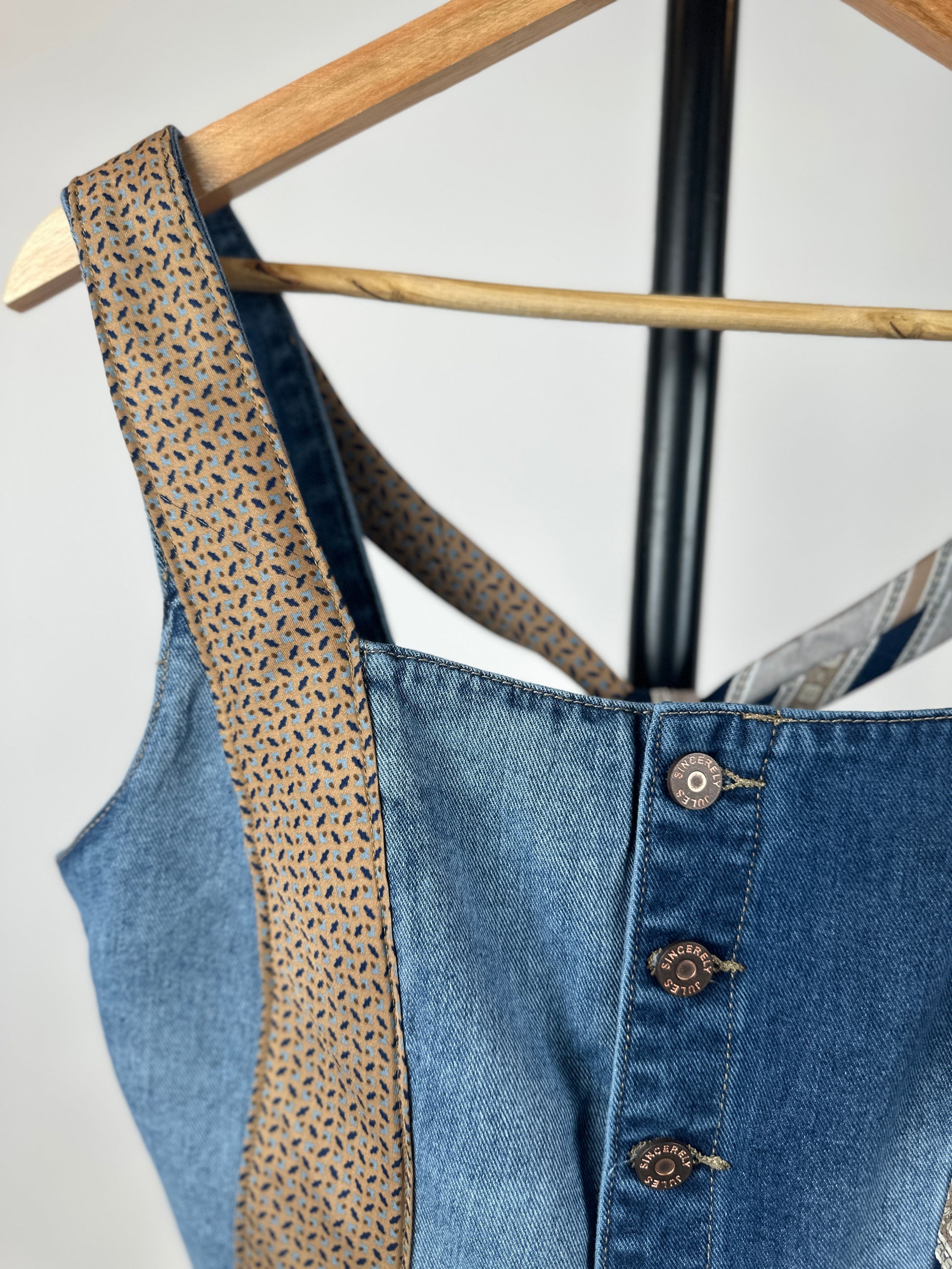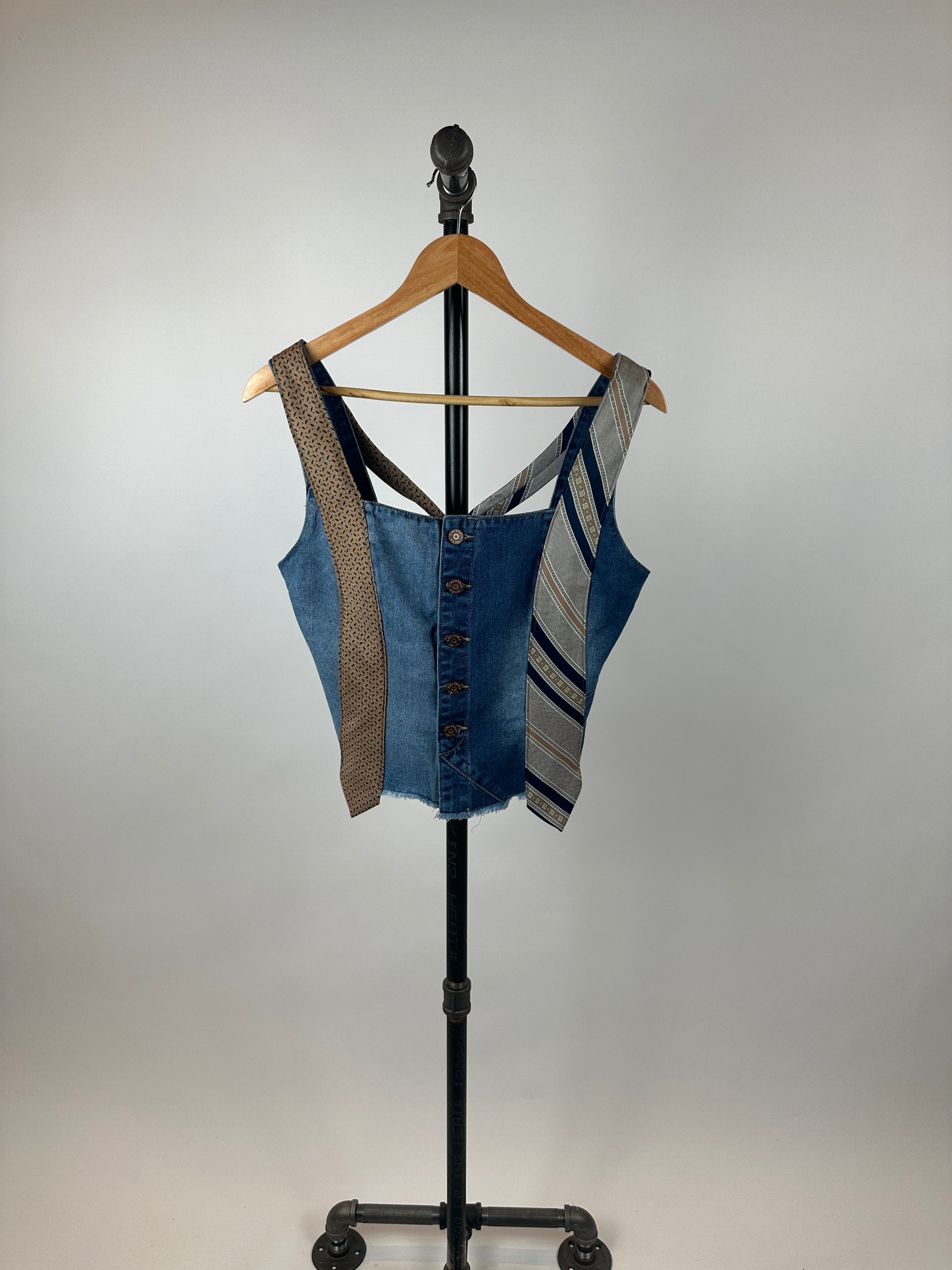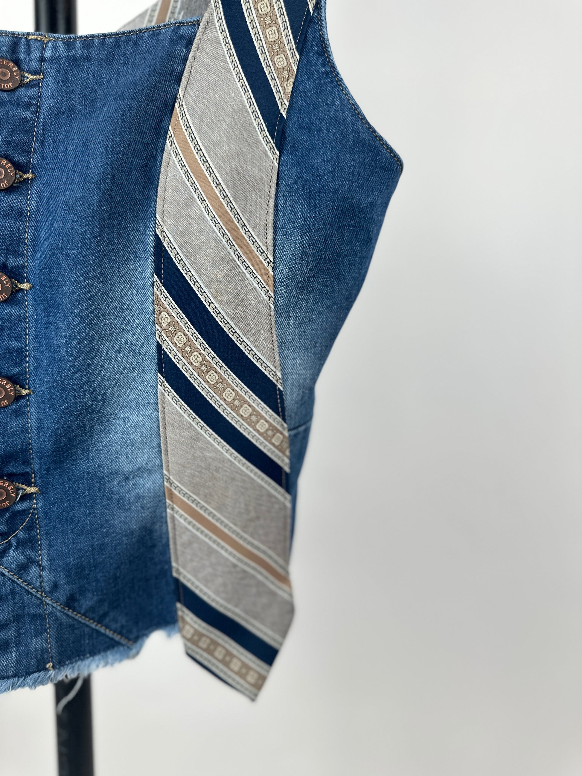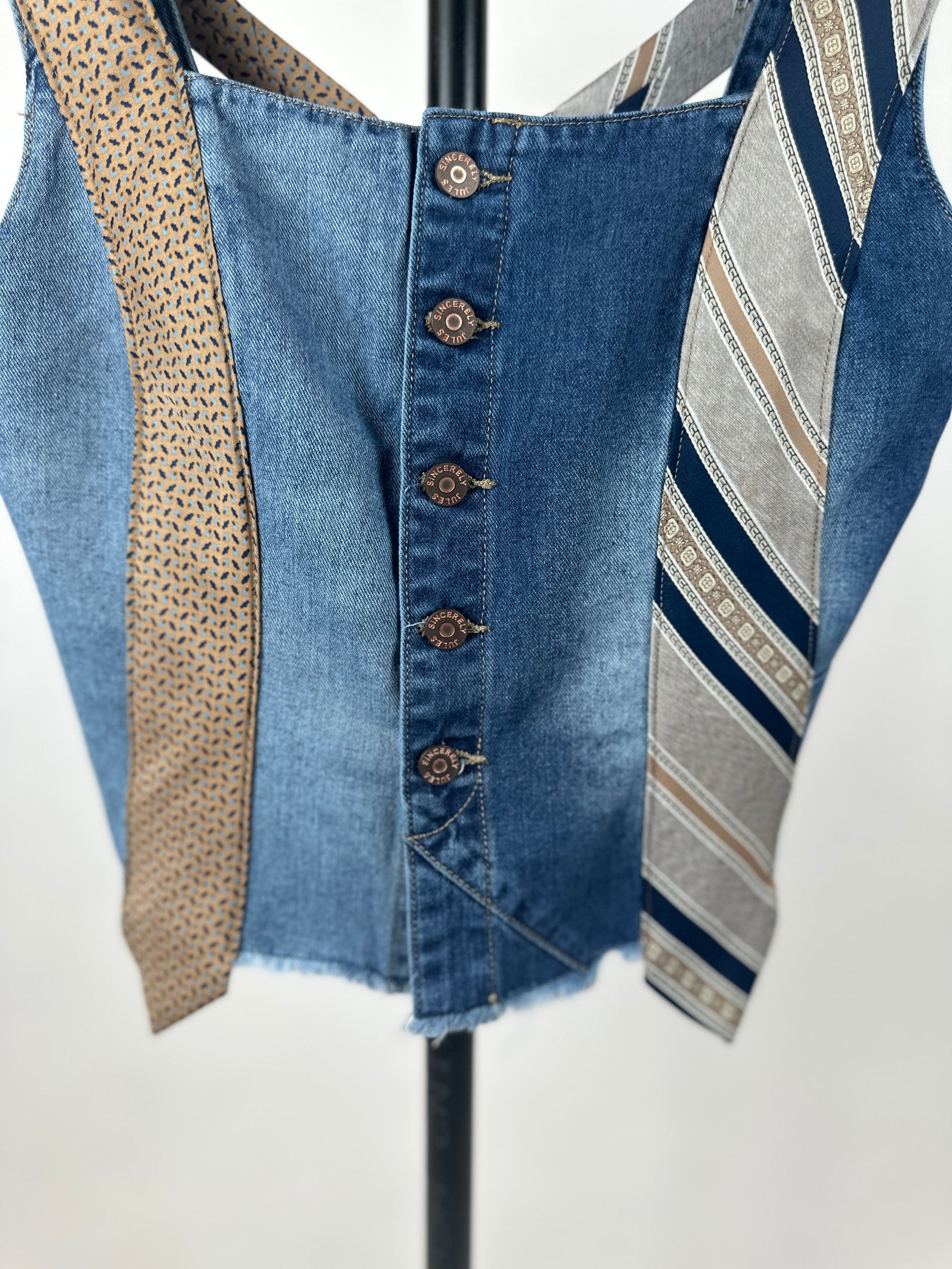 The Olive is the perfect combination of edgy and classy with its upcycled denim vest featuring mens neck tie detail. Contrasting fabrics stitched up the front and down the back forming a bow in the back - this one is so unique!
