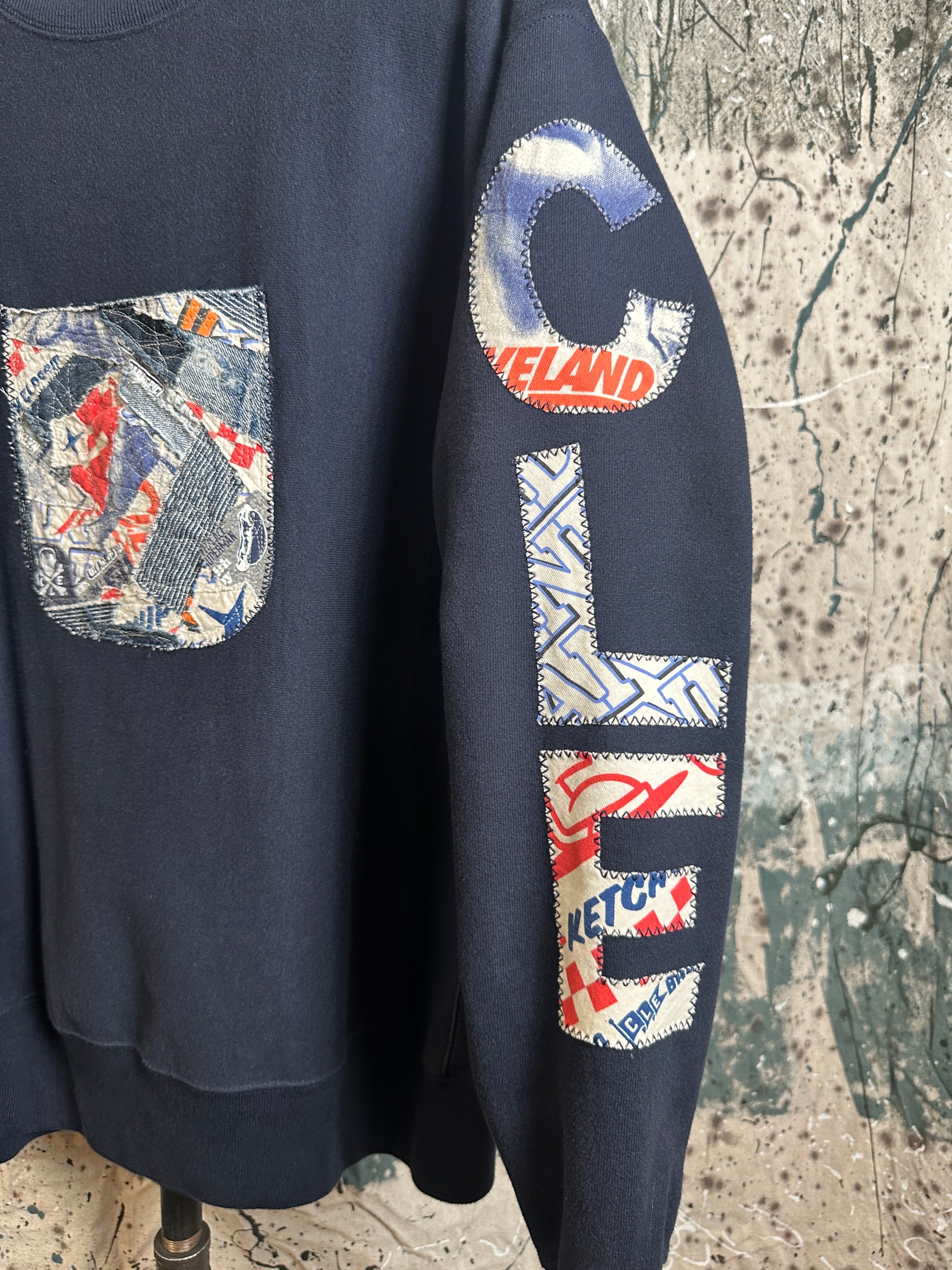 The Ontario is a playful upcycled crewneck sweatshirt made from heavy weight knit for cozy warmth. It features bold CLE letters running down the sleeve and a charming patched pocket crafted from t-shirt scraps, adding a unique, recycled twist to your everyday look.