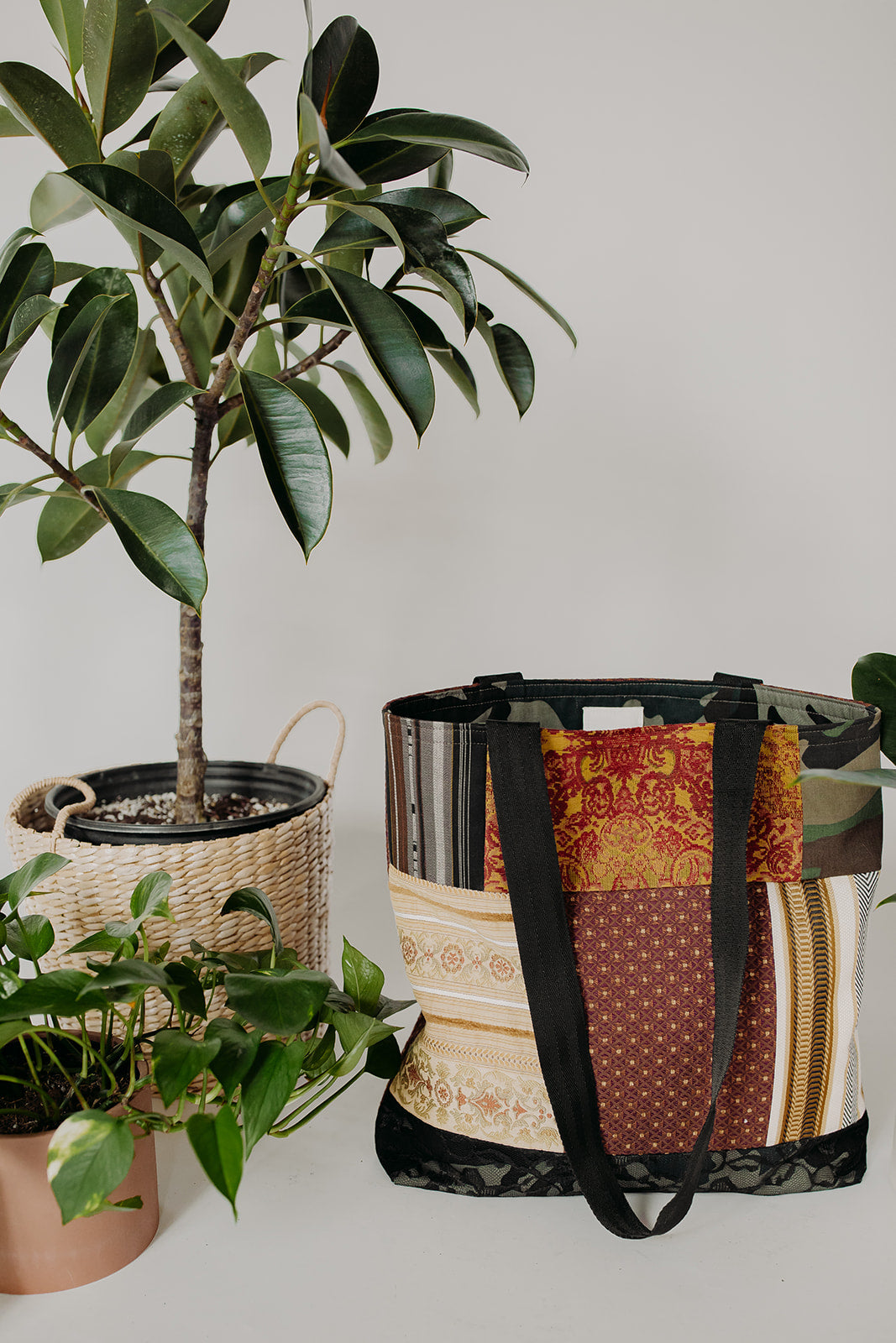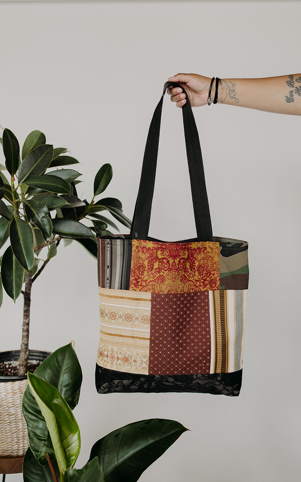 Fully lined tote bag constructed with remnants from The Camo Collection. Lace detail adds a nice contrast along with an interior pocket that will hold any size phone along with a side for a charger or other accessories. 2” wide black strap.