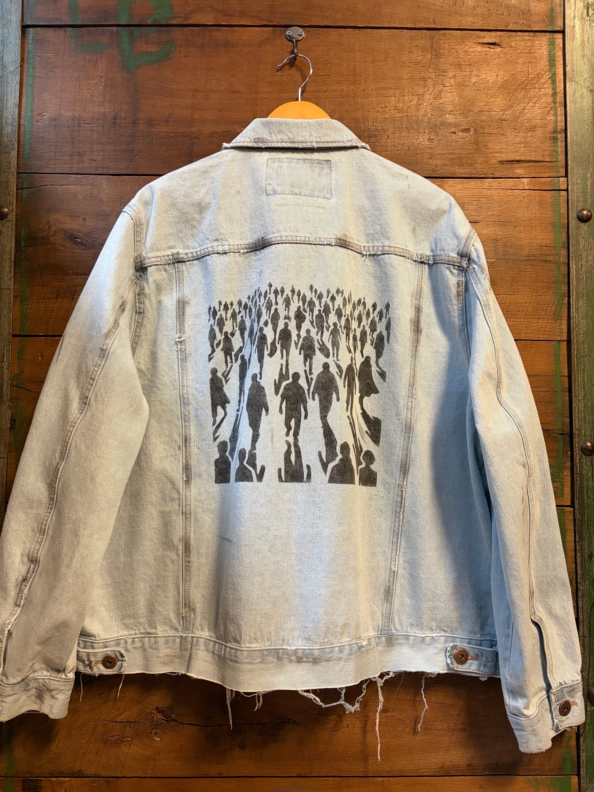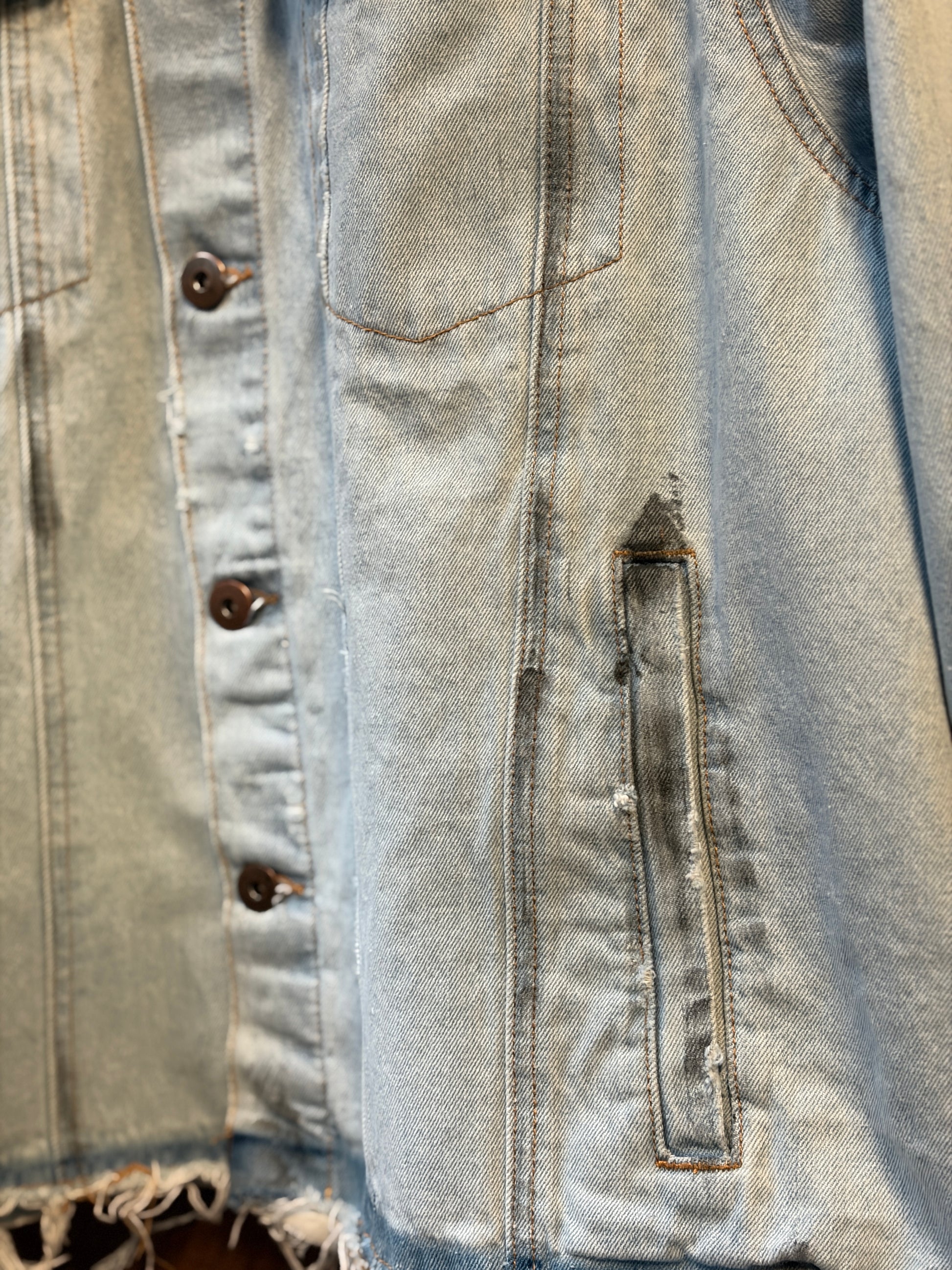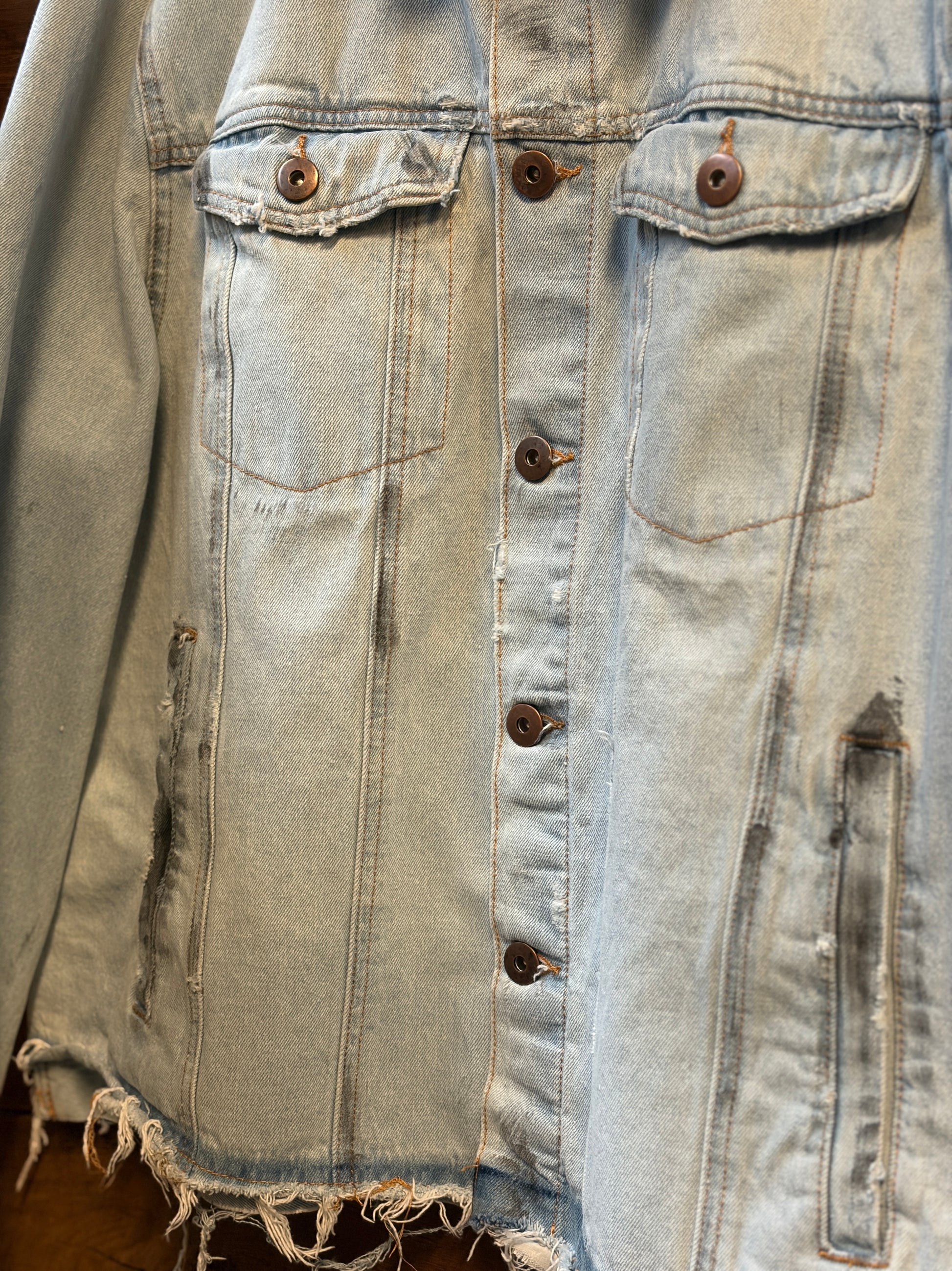 Rock a one-of-a-kind vibe with this oversized upcycled denim jacket that's got character for days. Distressed throughout for that perfectly worn-in look, it features eye-catching hand painted/stenciled artwork on the back that'll turn heads. Crafted from reclaimed denim, this jacket proves that sustainable style doesn't mean sacrificing edge. Layer it over anything and instantly level up your wardrobe with a piece that's as unique as you are.