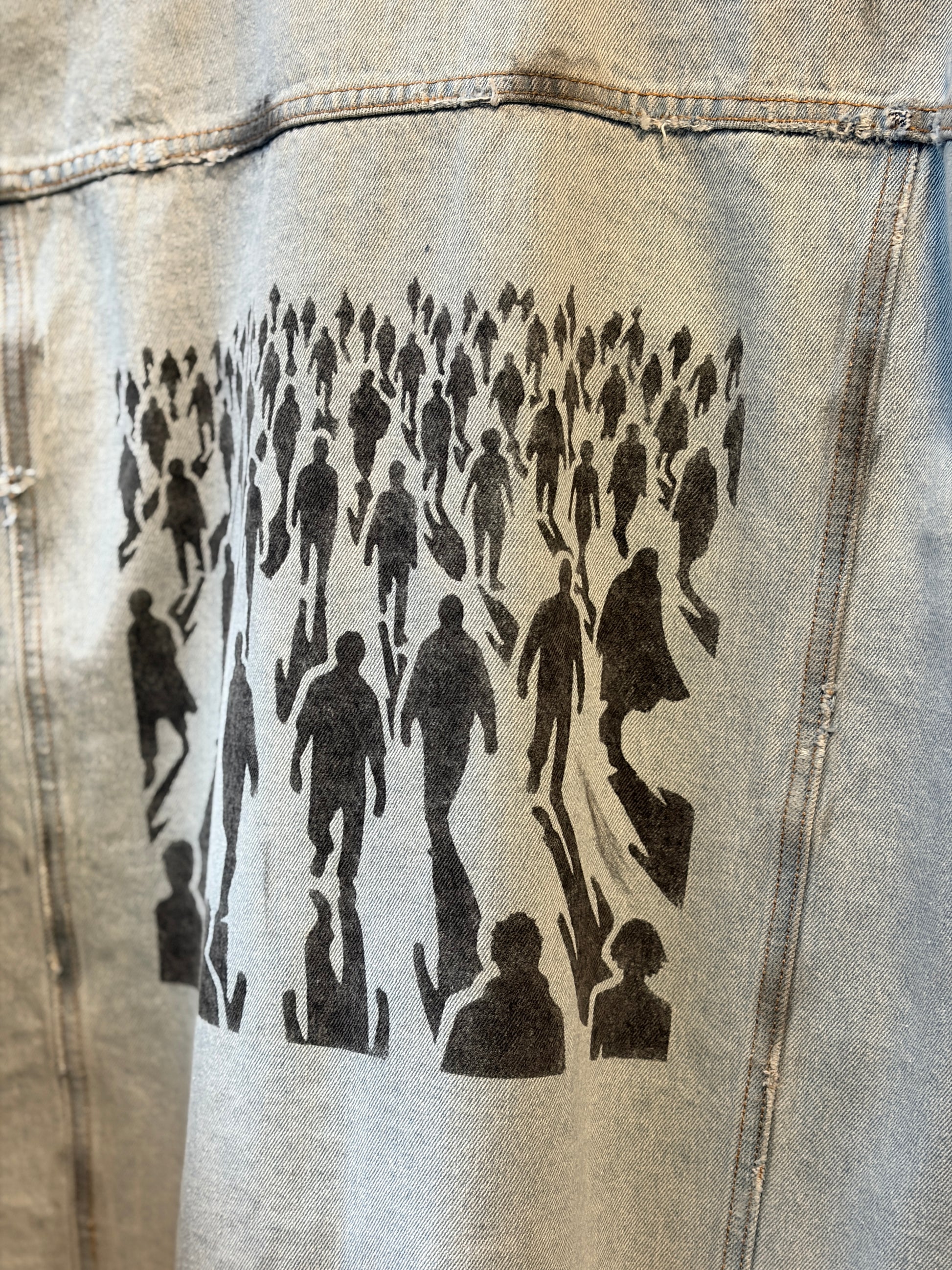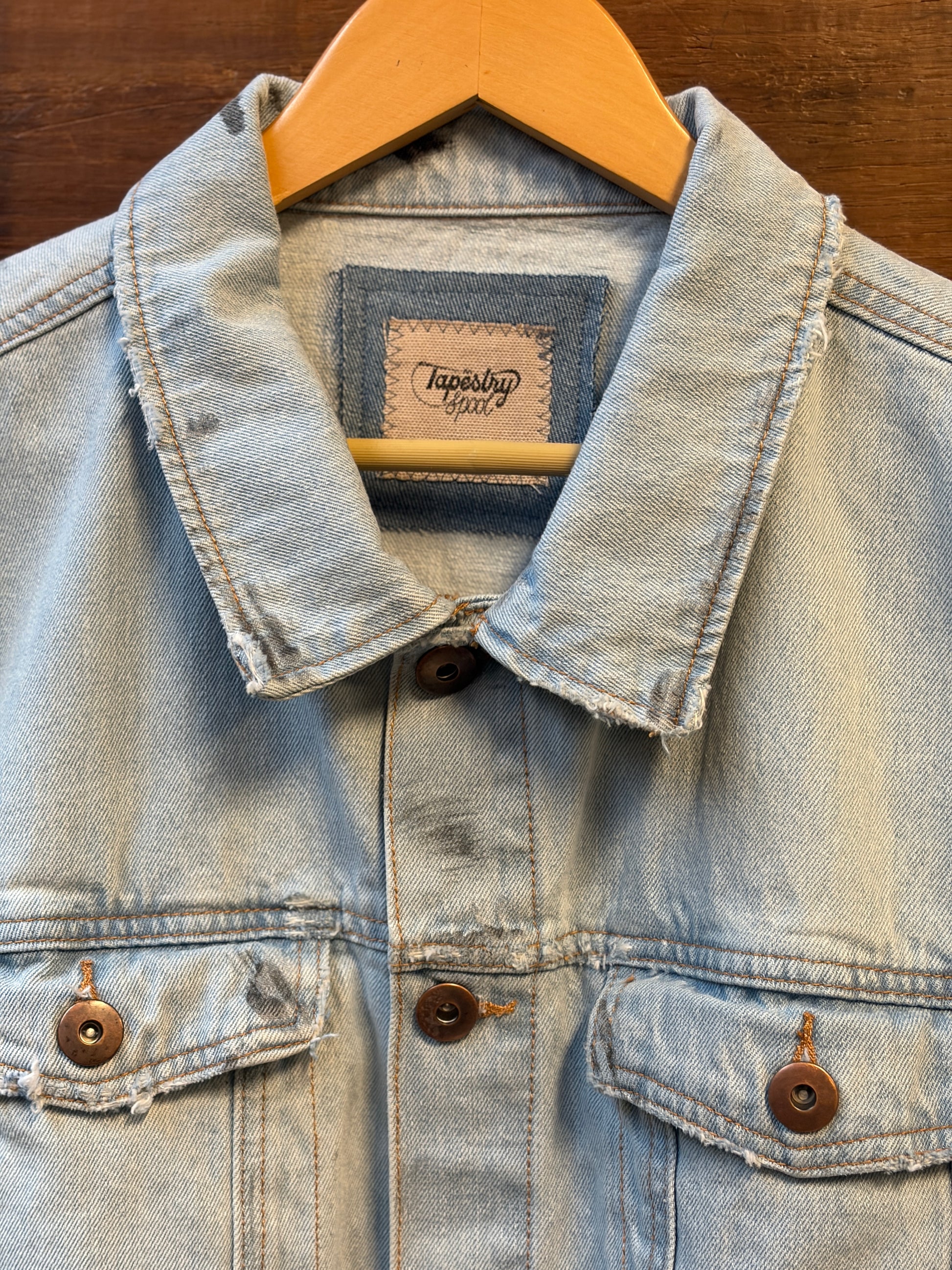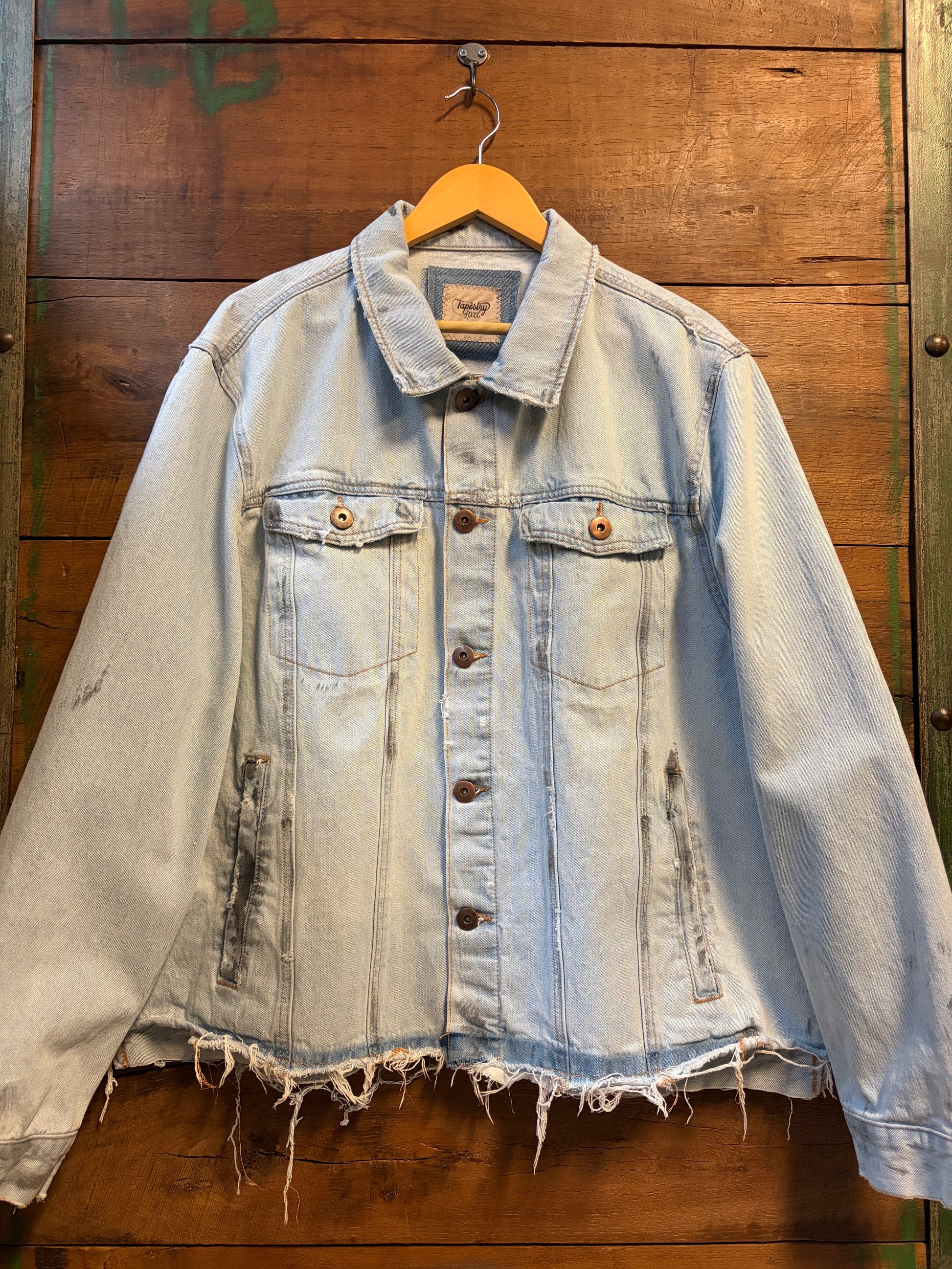 Rock a one-of-a-kind vibe with this oversized upcycled denim jacket that's got character for days. Distressed throughout for that perfectly worn-in look, it features eye-catching hand painted/stenciled artwork on the back that'll turn heads. Crafted from reclaimed denim, this jacket proves that sustainable style doesn't mean sacrificing edge. Layer it over anything and instantly level up your wardrobe with a piece that's as unique as you are.