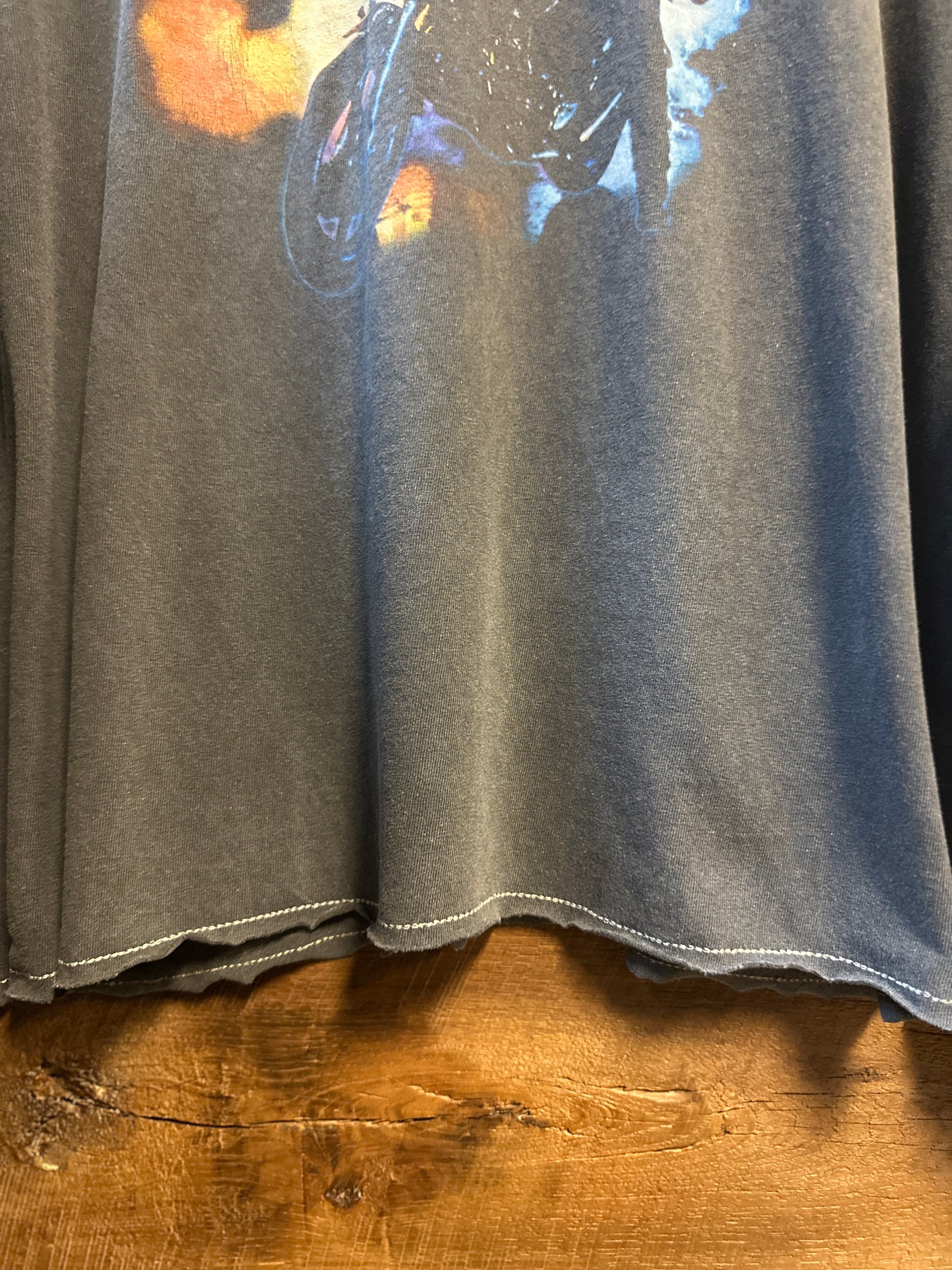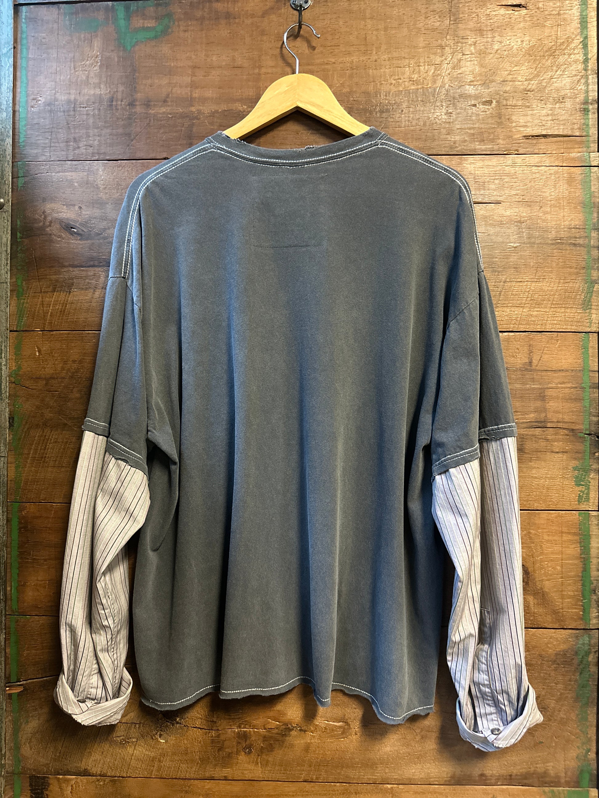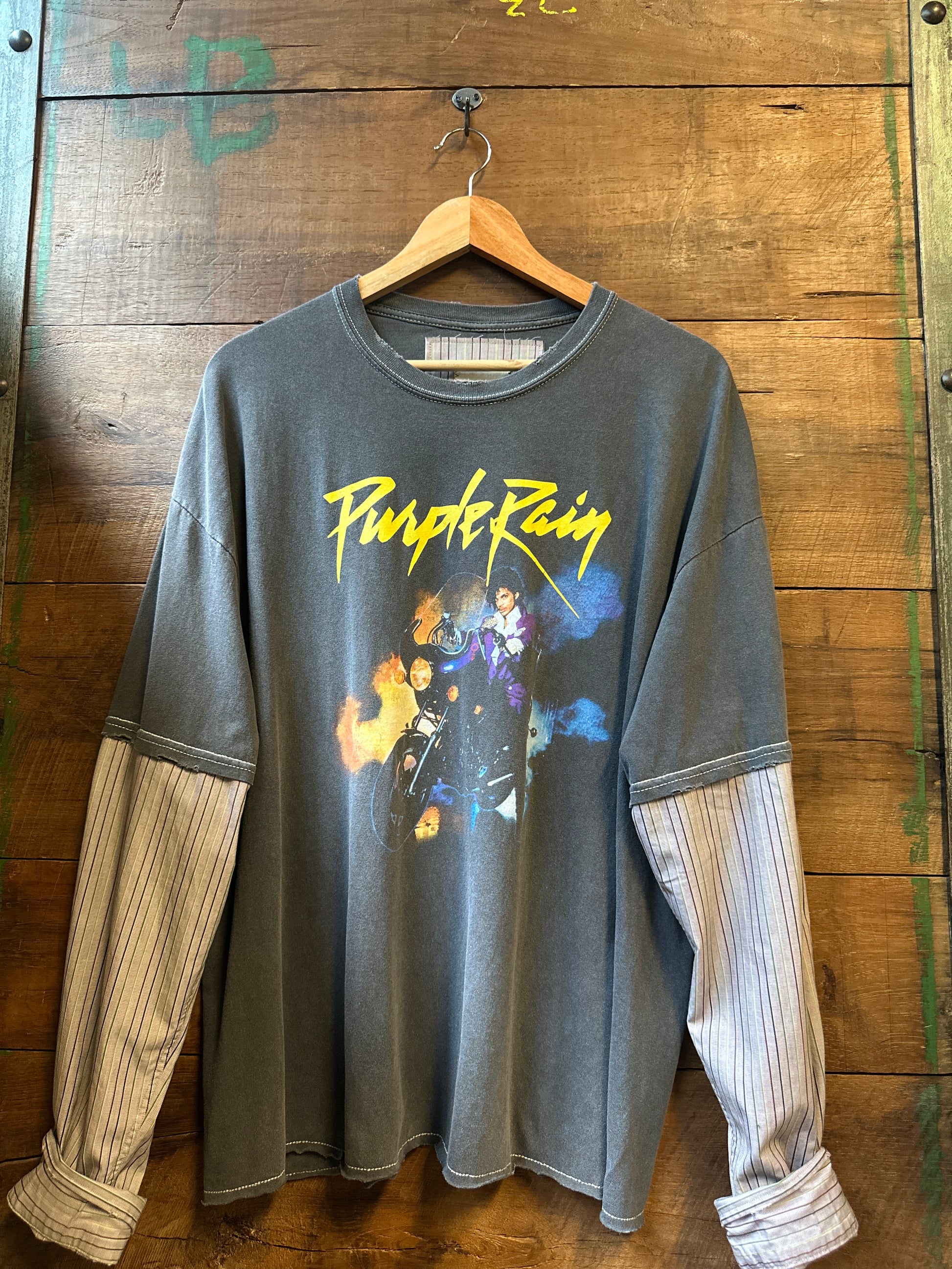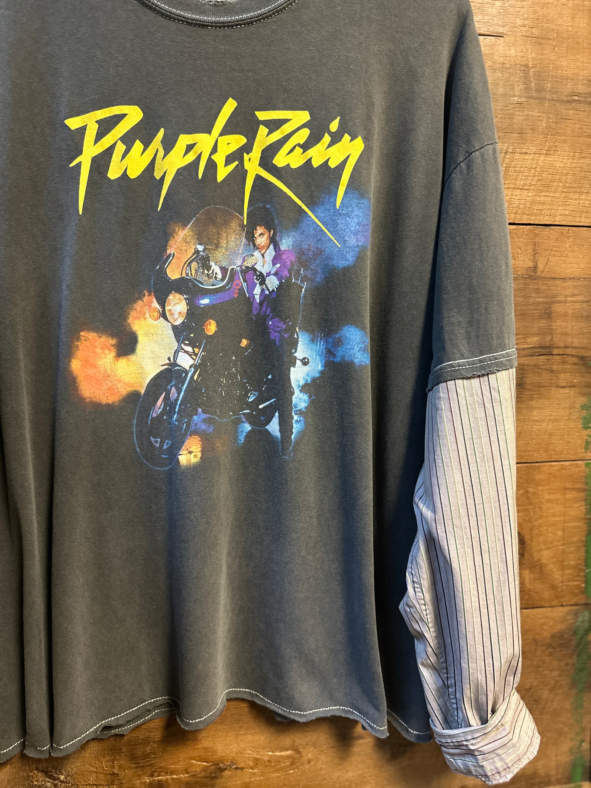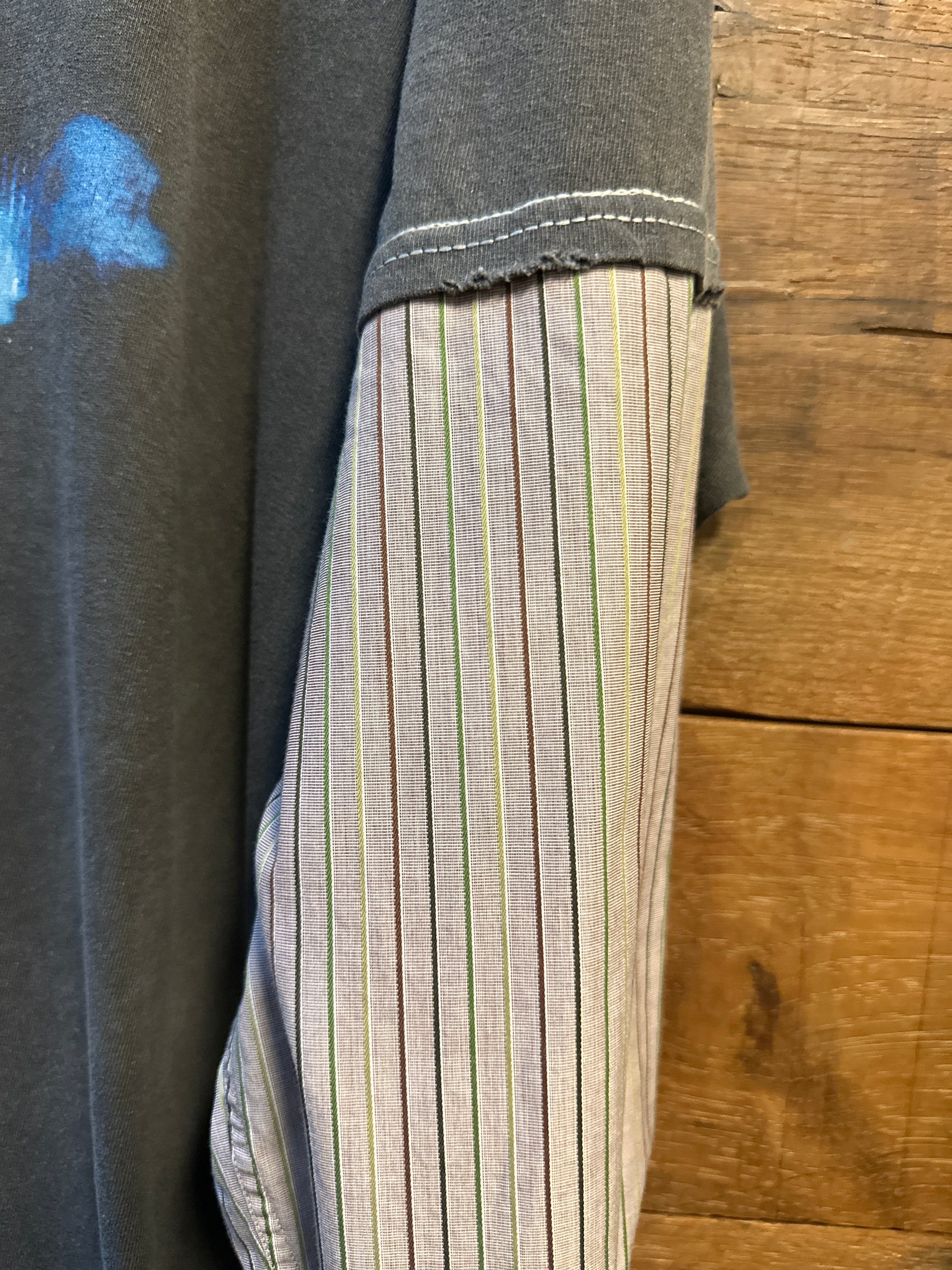 The Purple is a playful upcycled graphic tee designed for comfort with its loose, relaxed fit. Featuring slightly distressed details and contrasting woven sleeves in a lightweight striped cotton, it adds a fun twist to your casual wardrobe while keeping things breezy and unique.