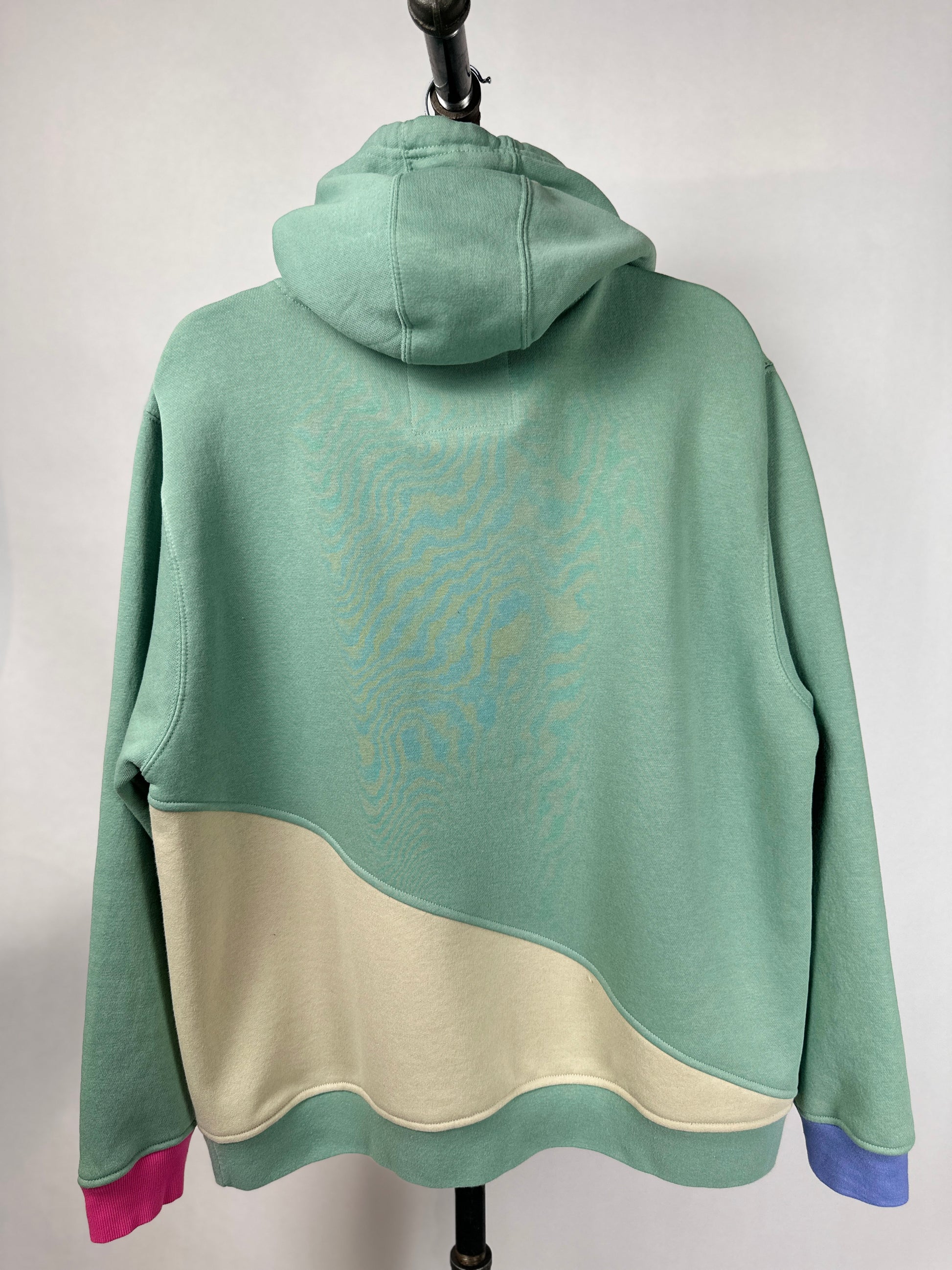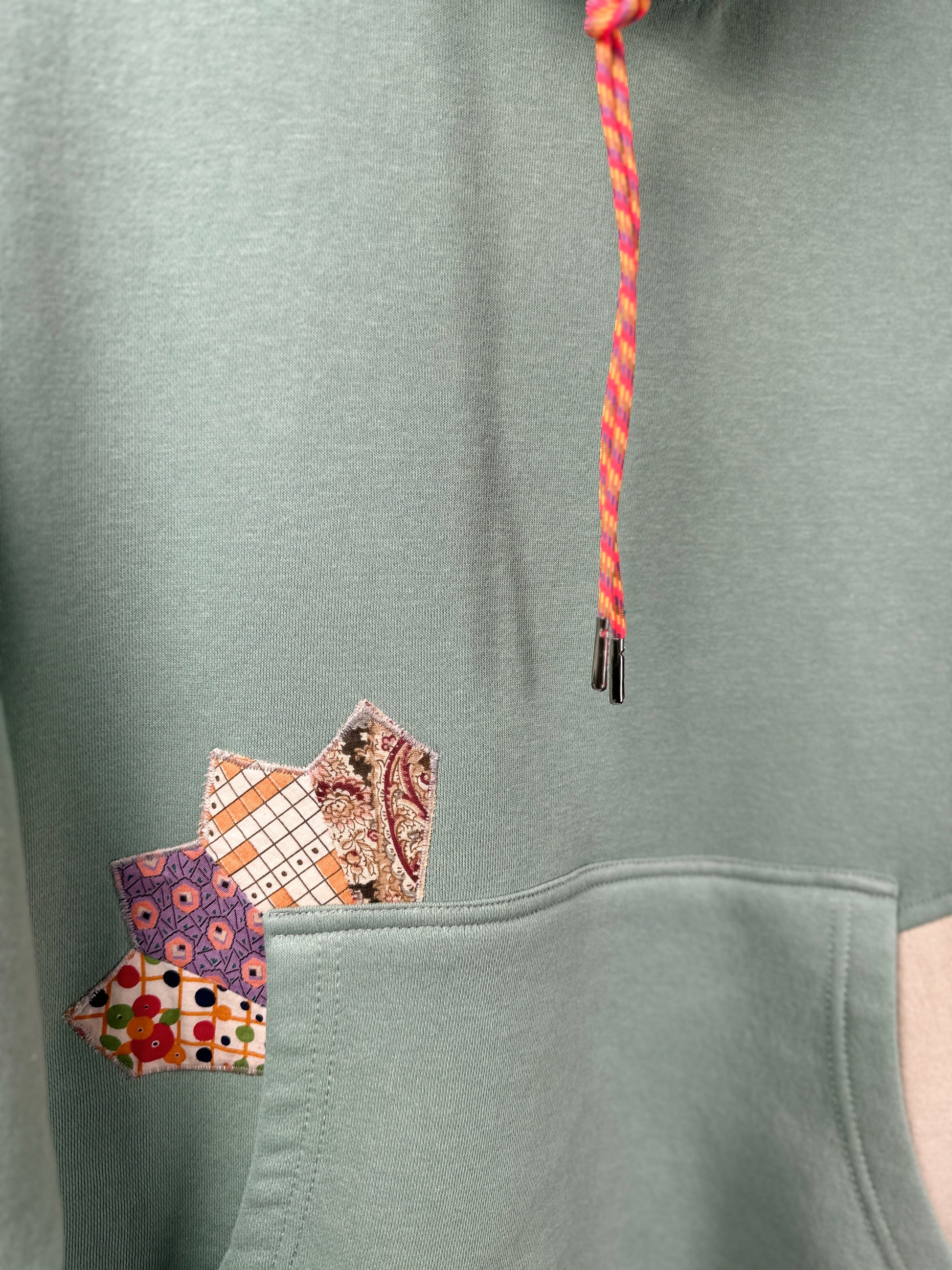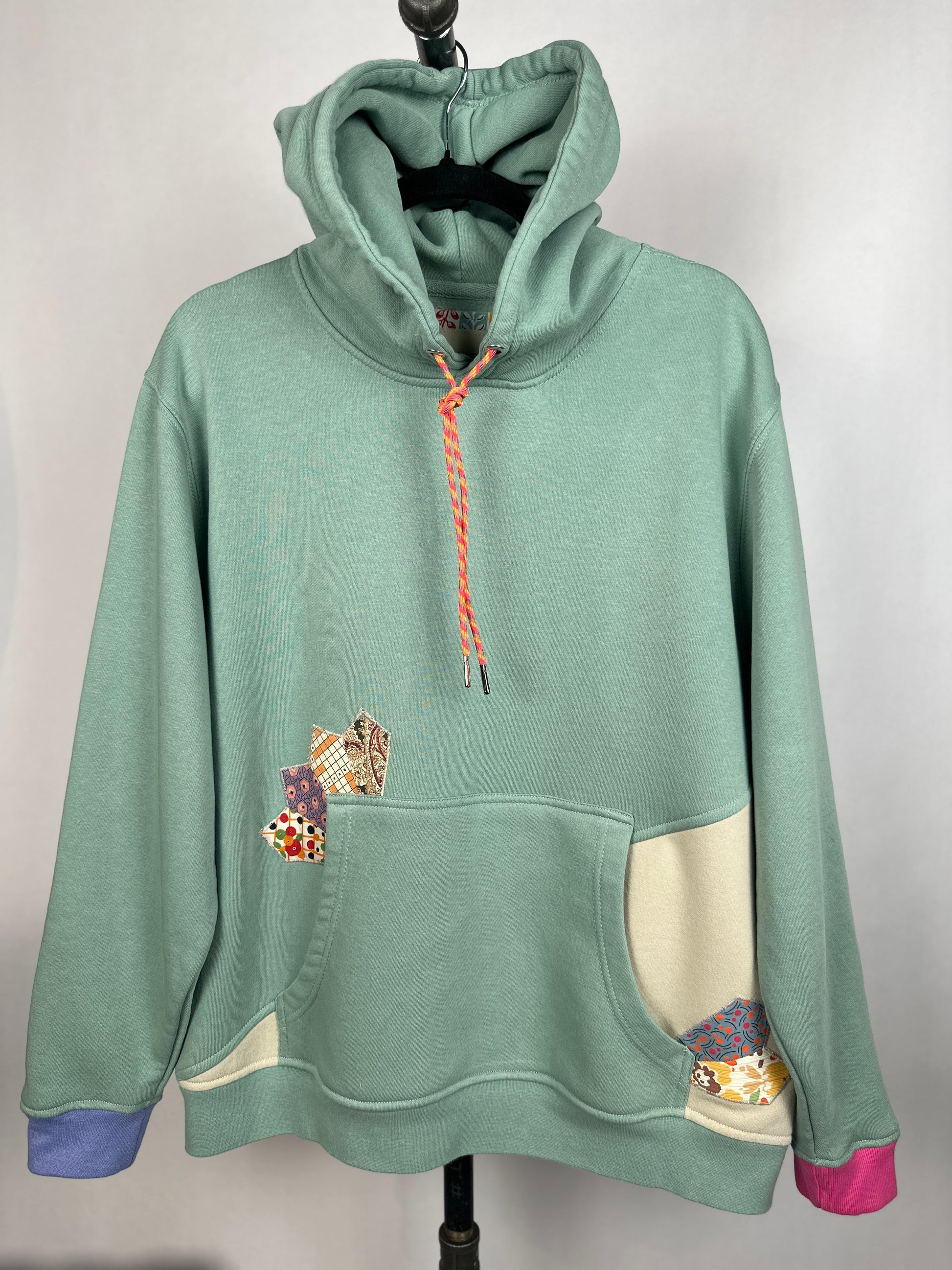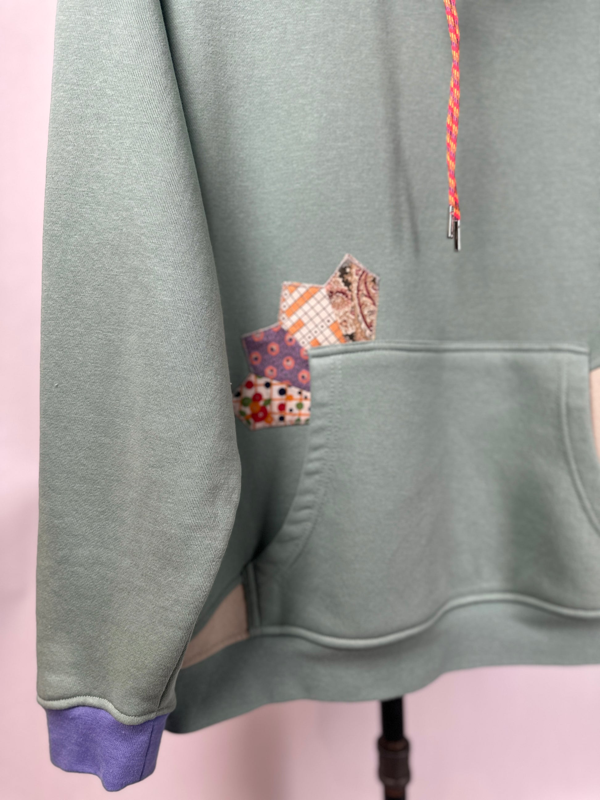 The Quinn is a playful and sustainable choice with its upcycled hoodie, color block design, and vintage quilt details. Stay stylish and environmentally conscious with the added benefit of contrasting cuffs for a unique touch. Get cozy in this one-of-a-kind piece!
