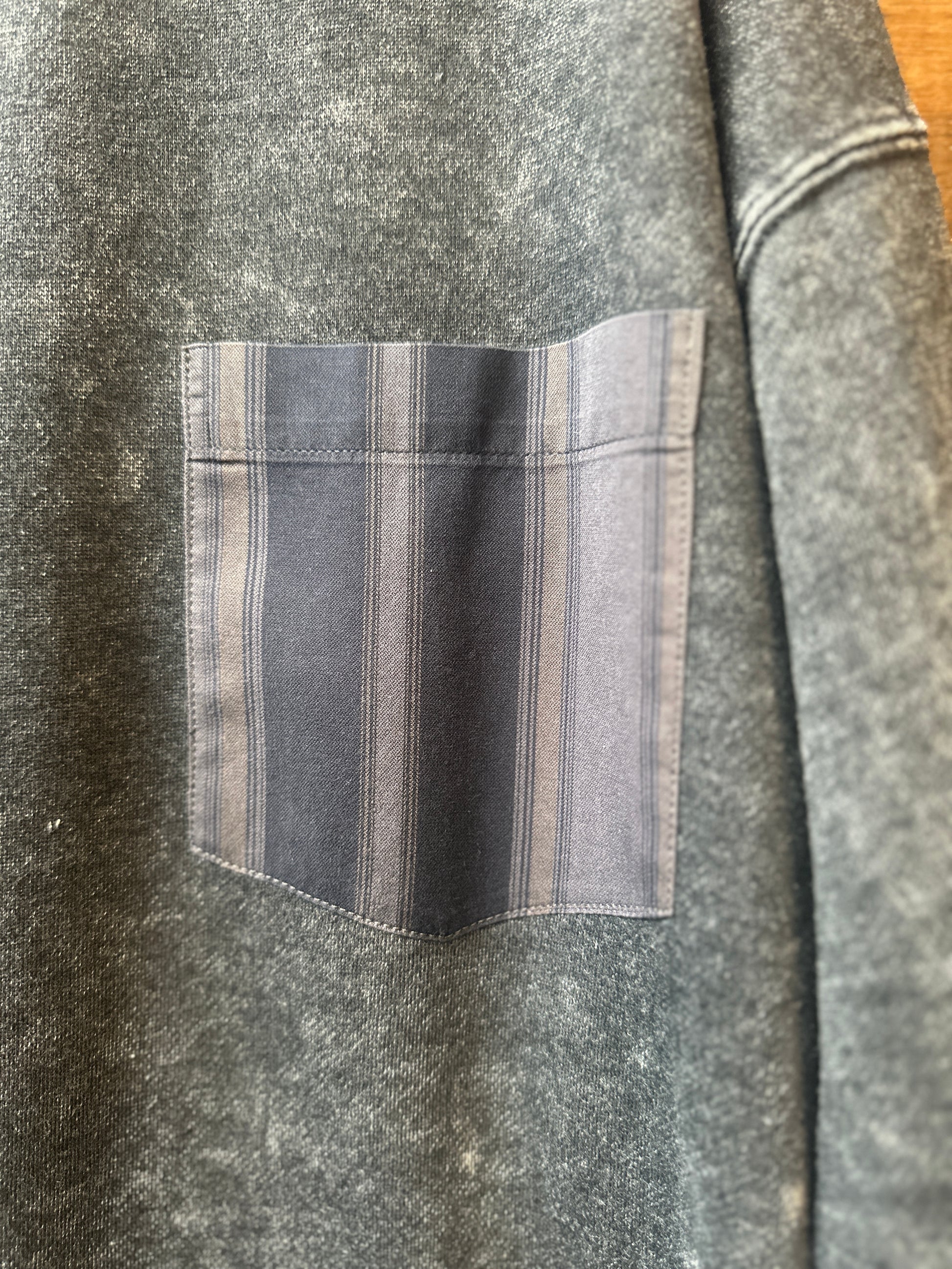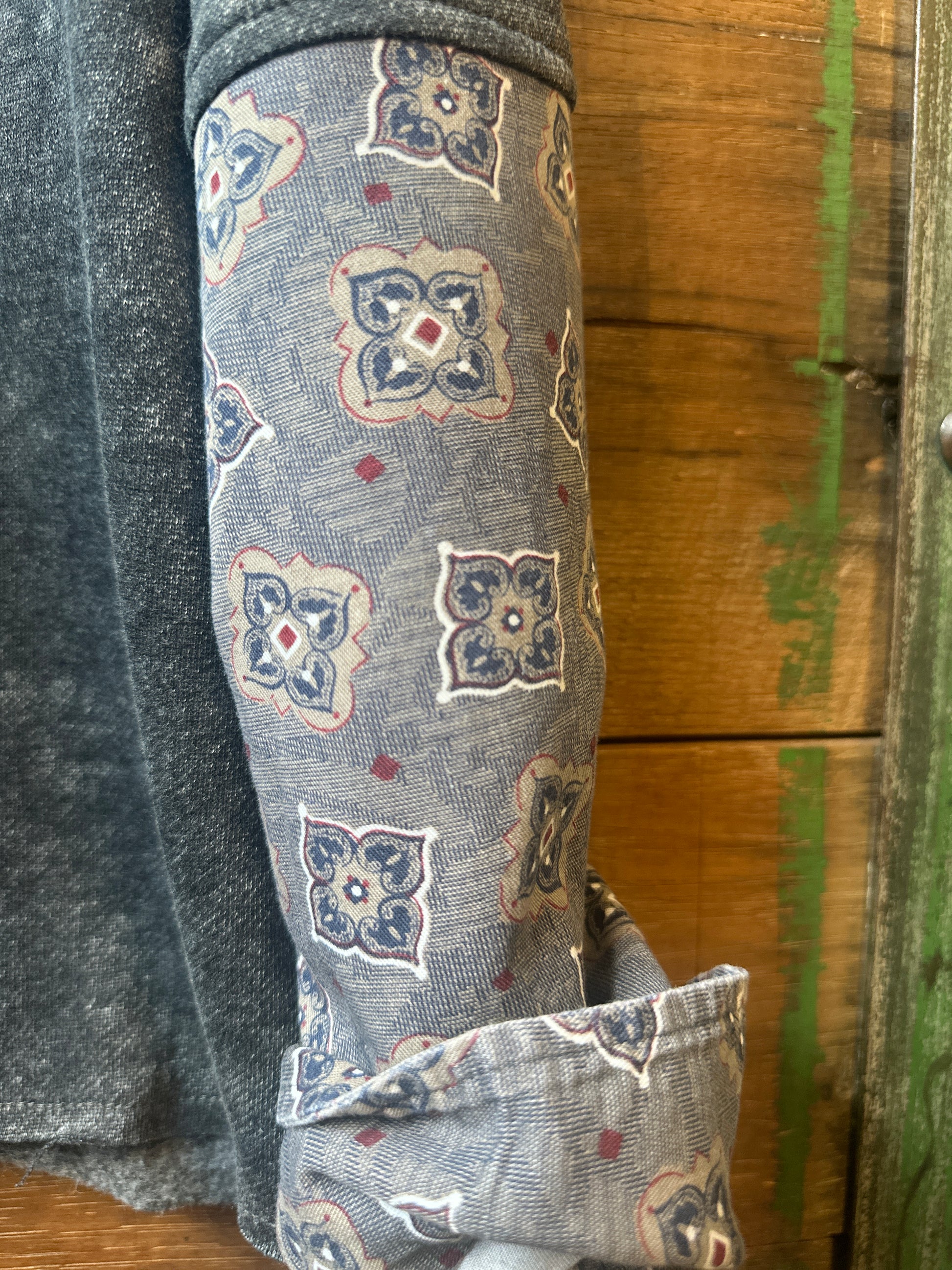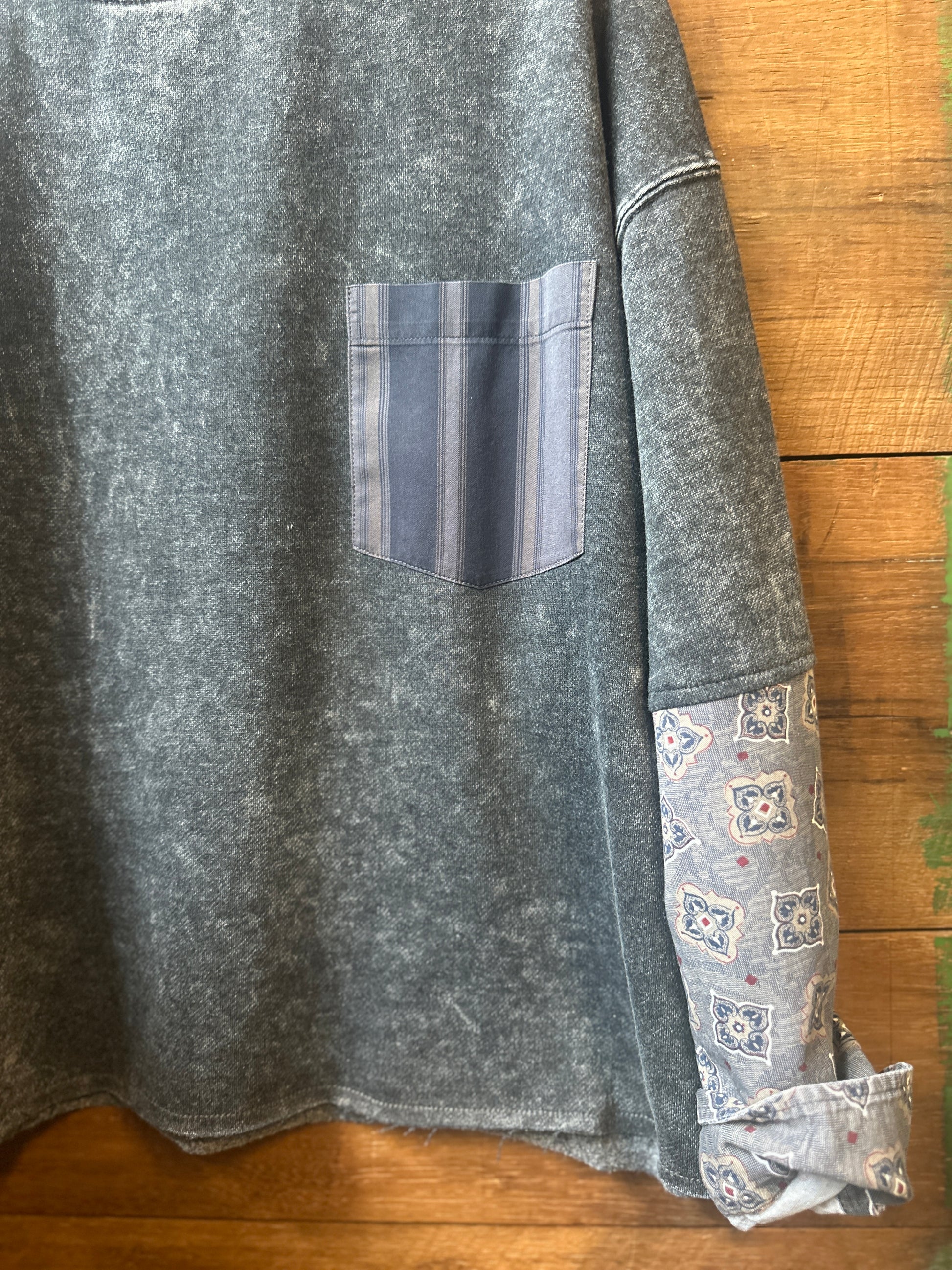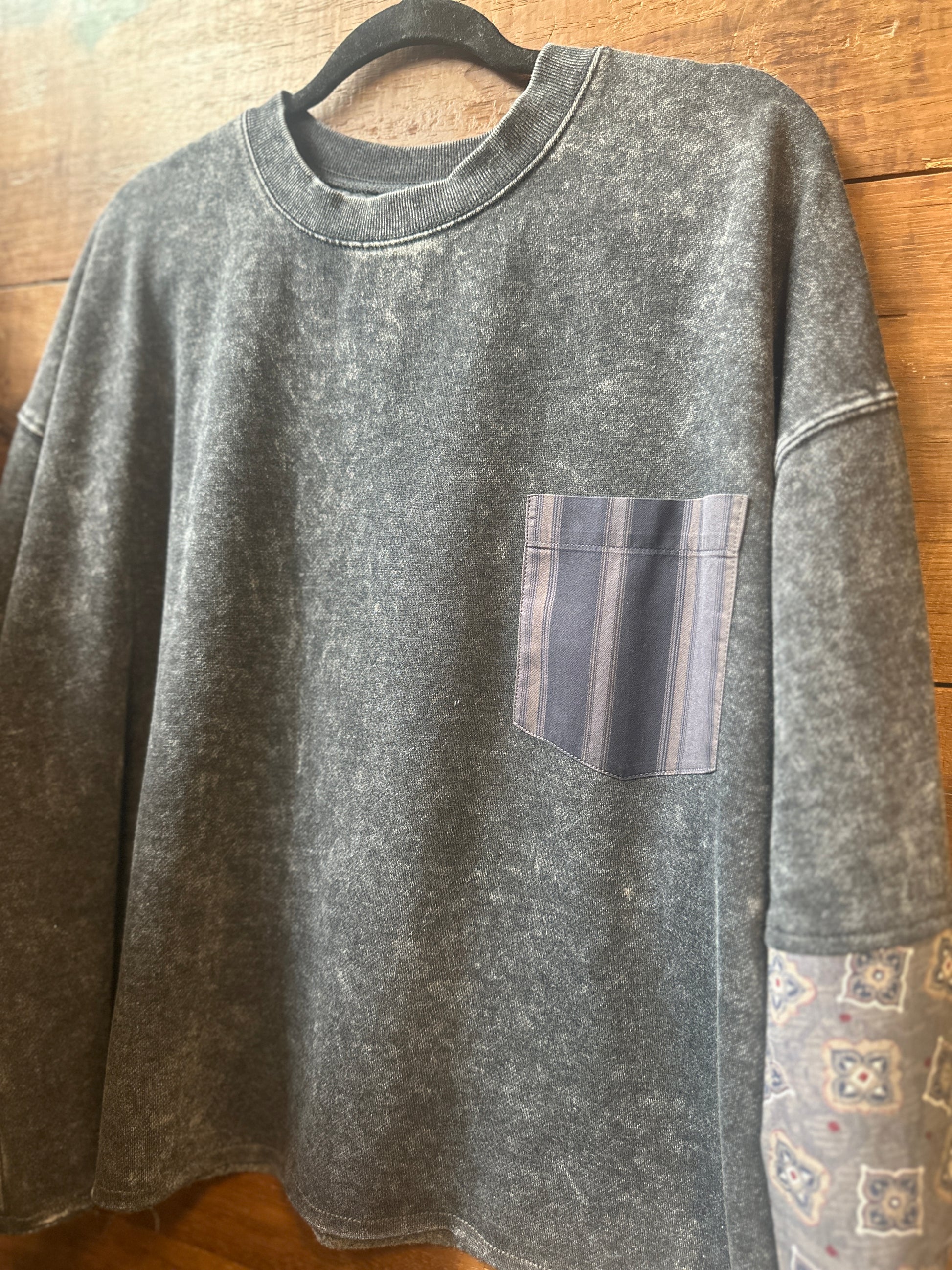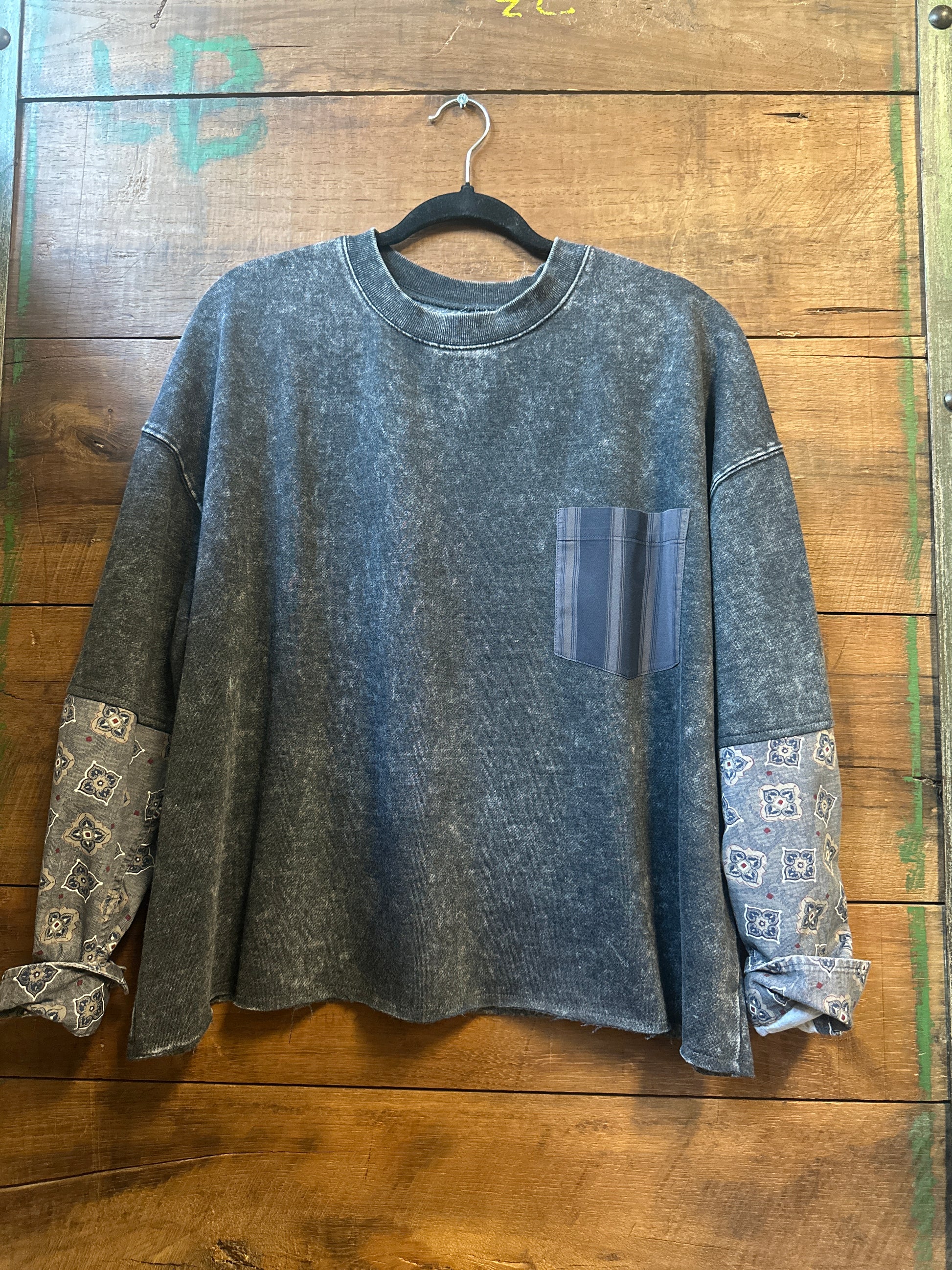 Introducing the Randall, a quirky upcycled crewneck sweatshirt with contrasting woven sleeves and front pocket. Its oversized fit adds a touch of charm to any outfit. Sustainable fashion meets playful style!