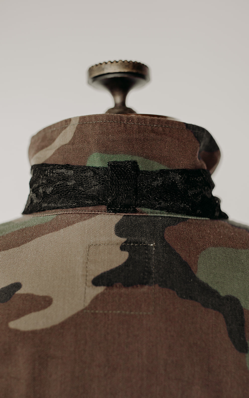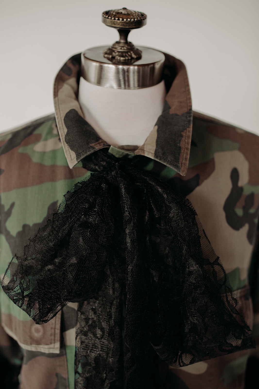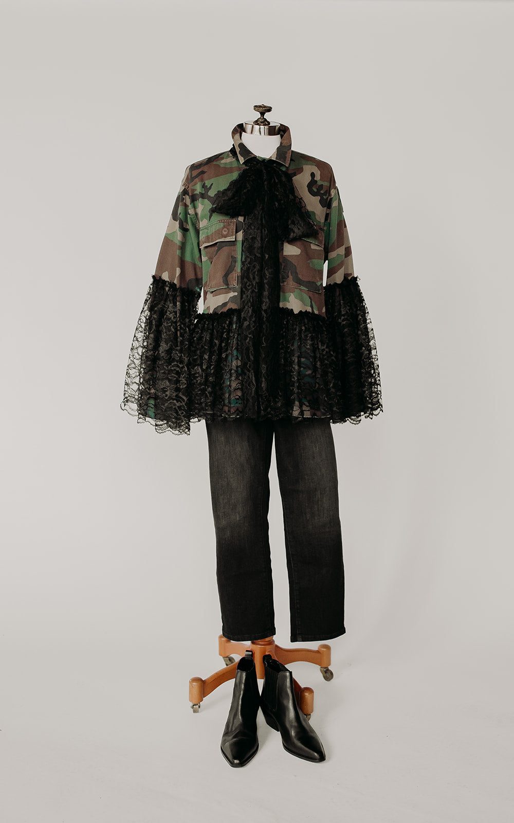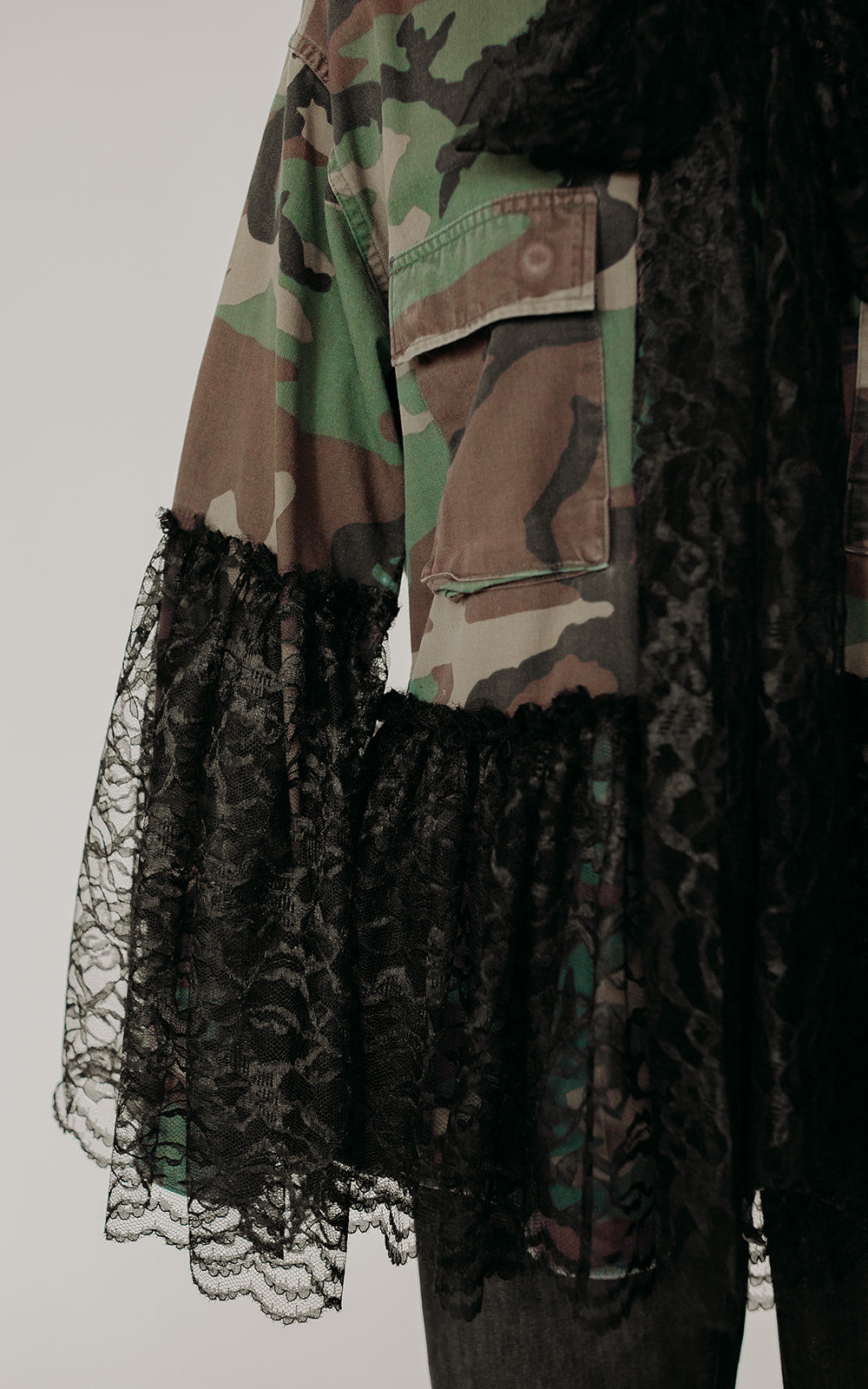 Medium weight camo jacket with two front pockets in a loose-fitting silhouette. Features a full black lace skirt and gathered sleeves that make this one dreamy. Lace bow detail that can be detached if desired.