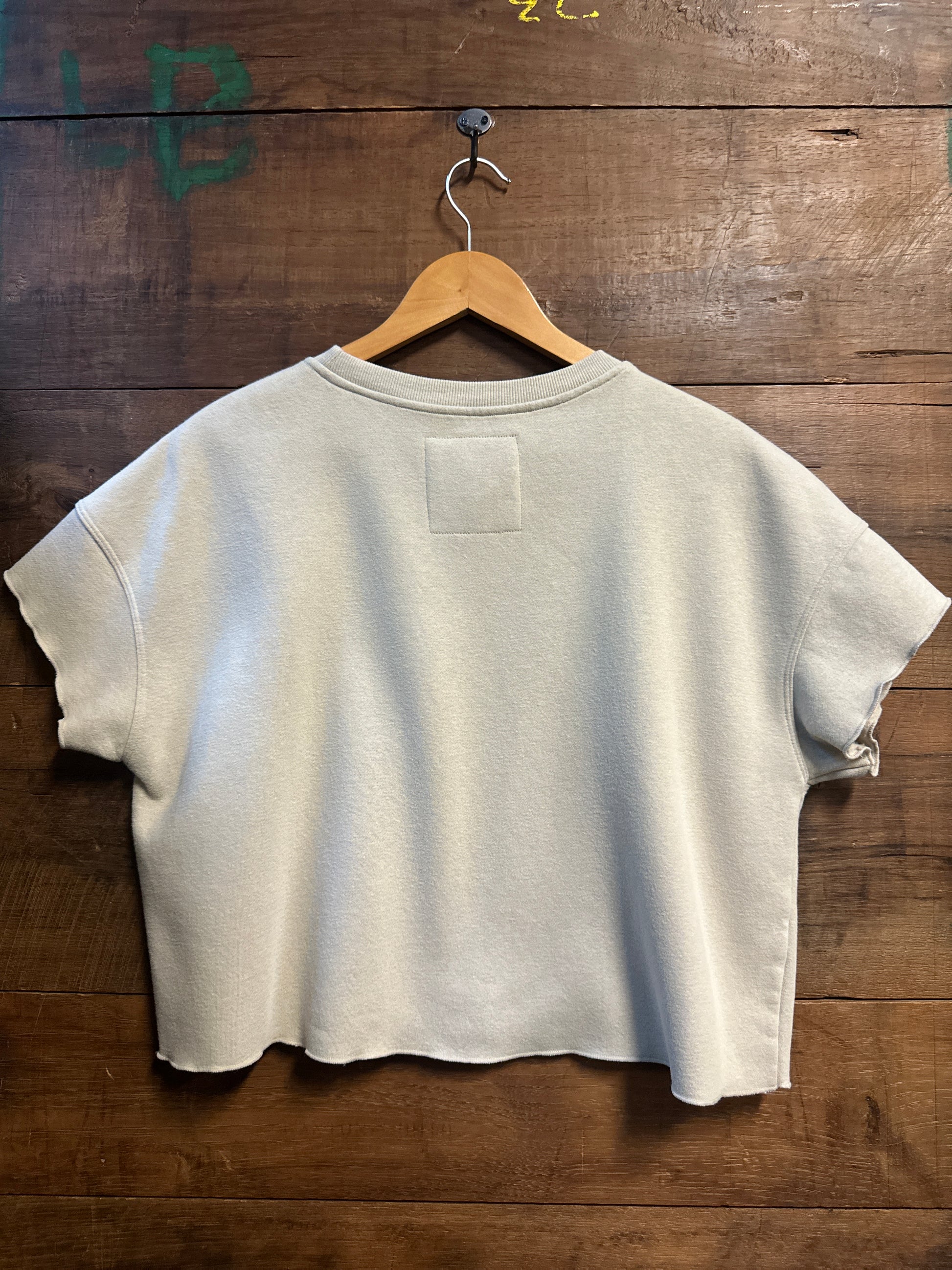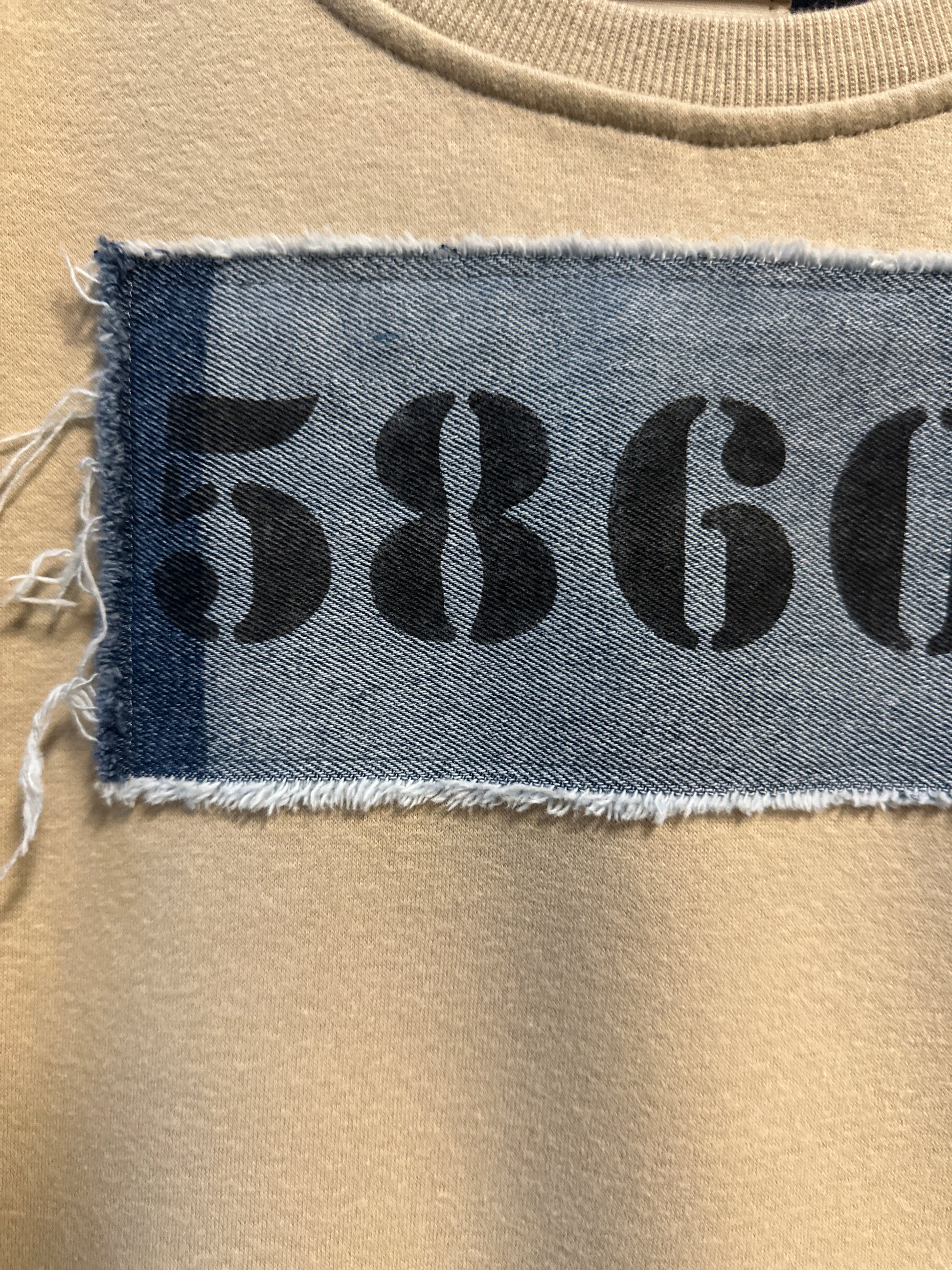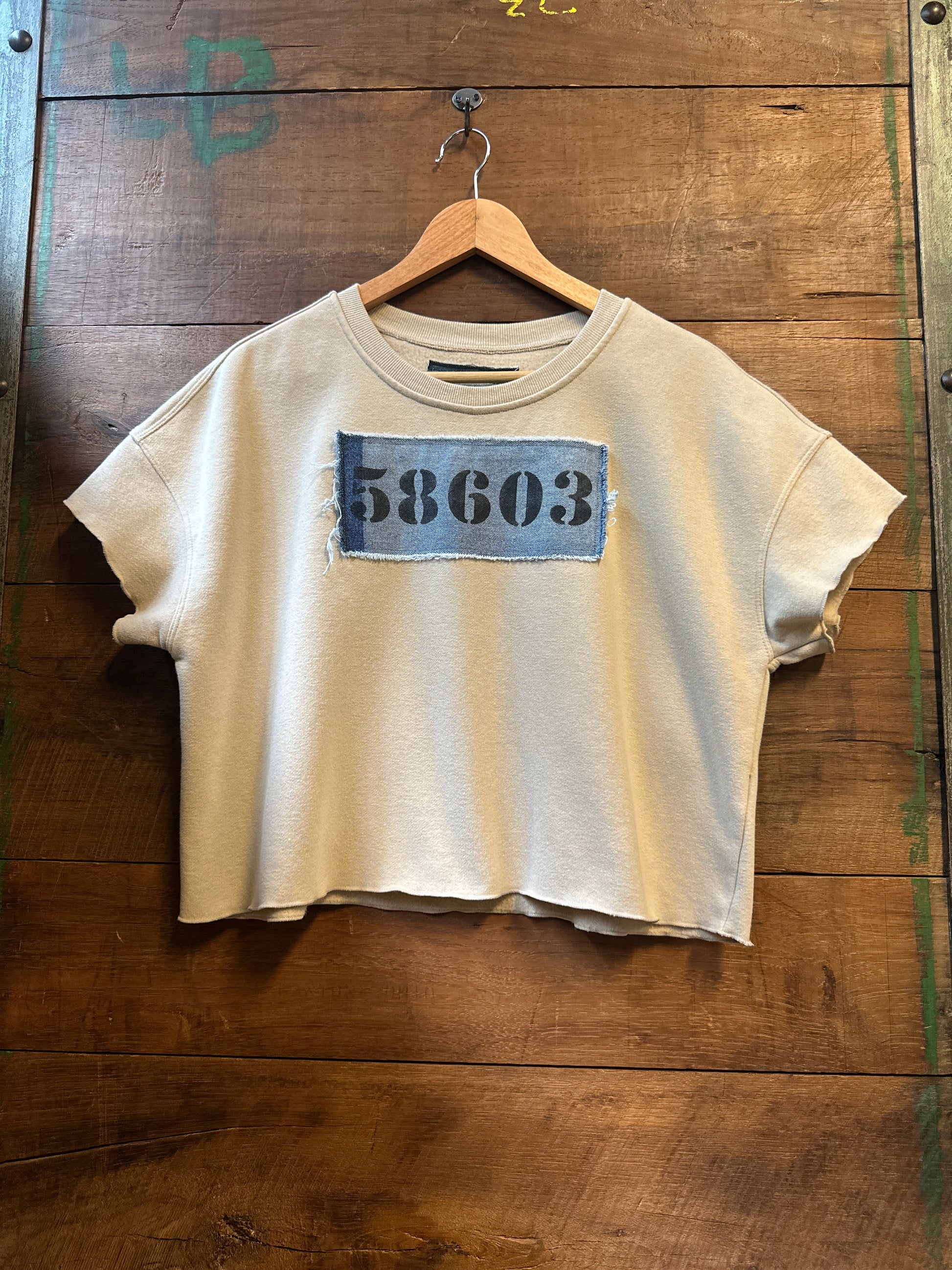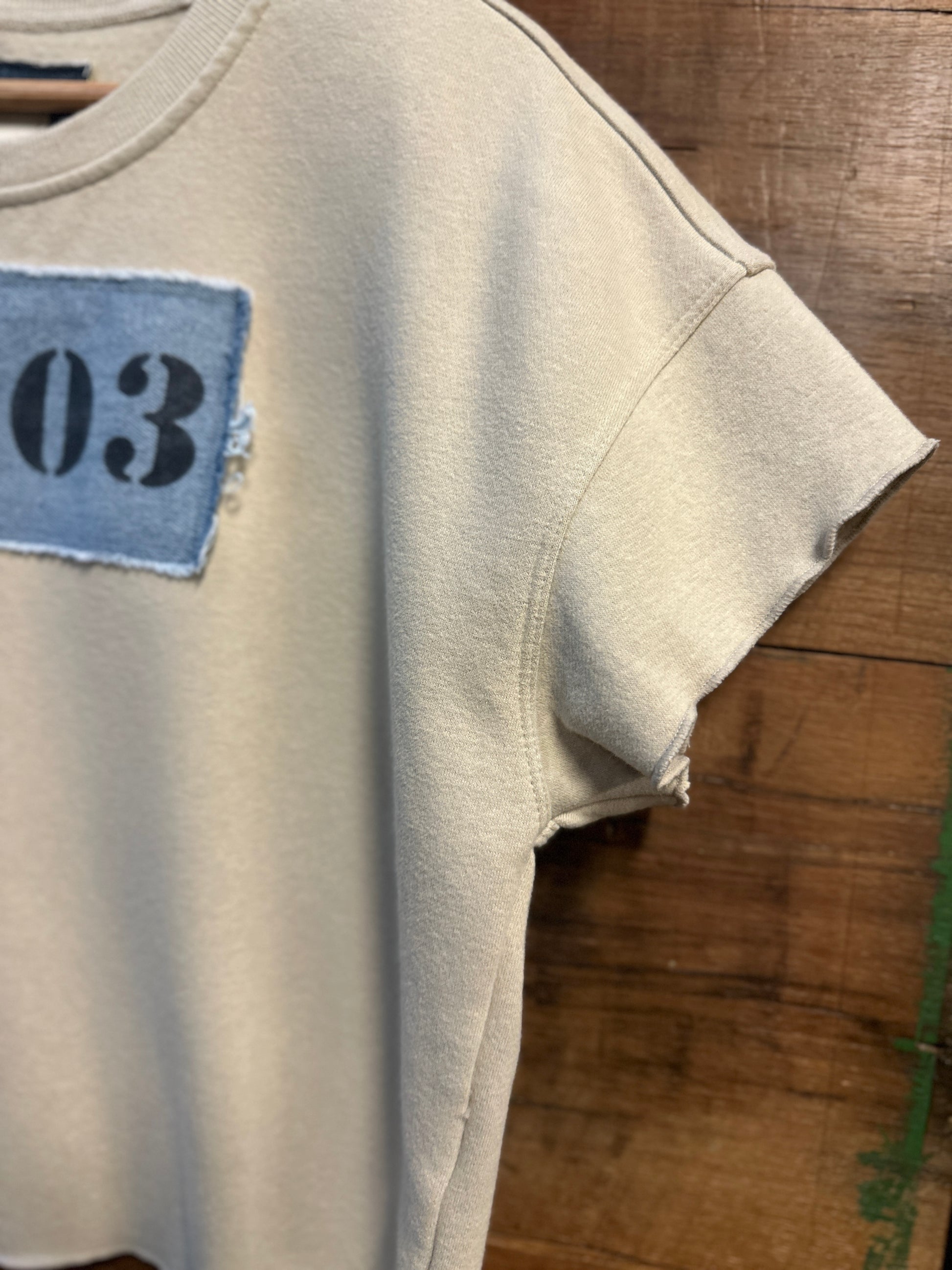 Meet The Rumi, your new favorite upcycled crewneck sweatshirt with a fun twist. This cropped fit piece features short cap sleeves for a breezy vibe, while a unique denim patch with hand-stenciled numbers adds a quirky, one-of-a-kind touch. Perfect for those who love playful style with a sustainable edge!