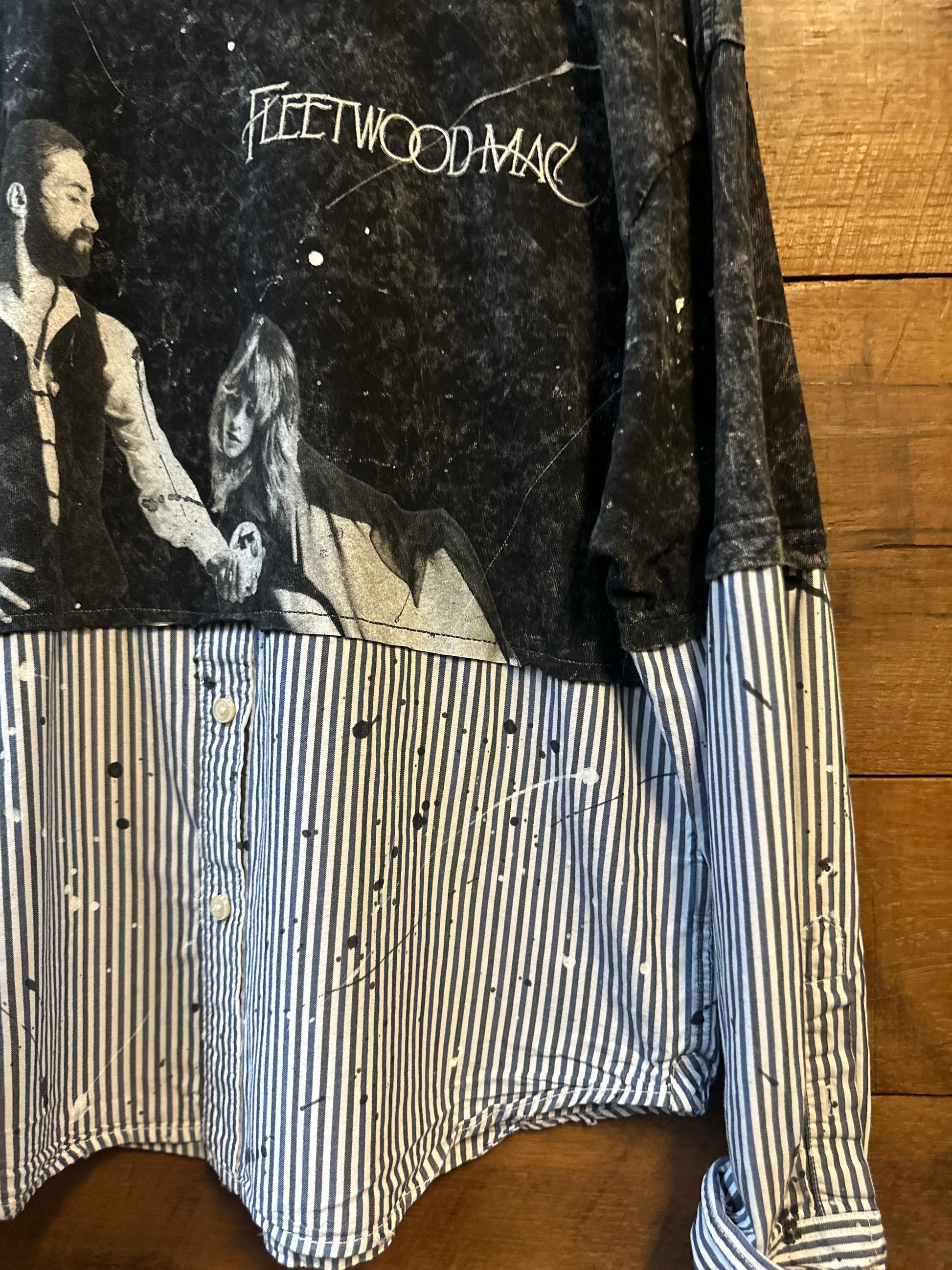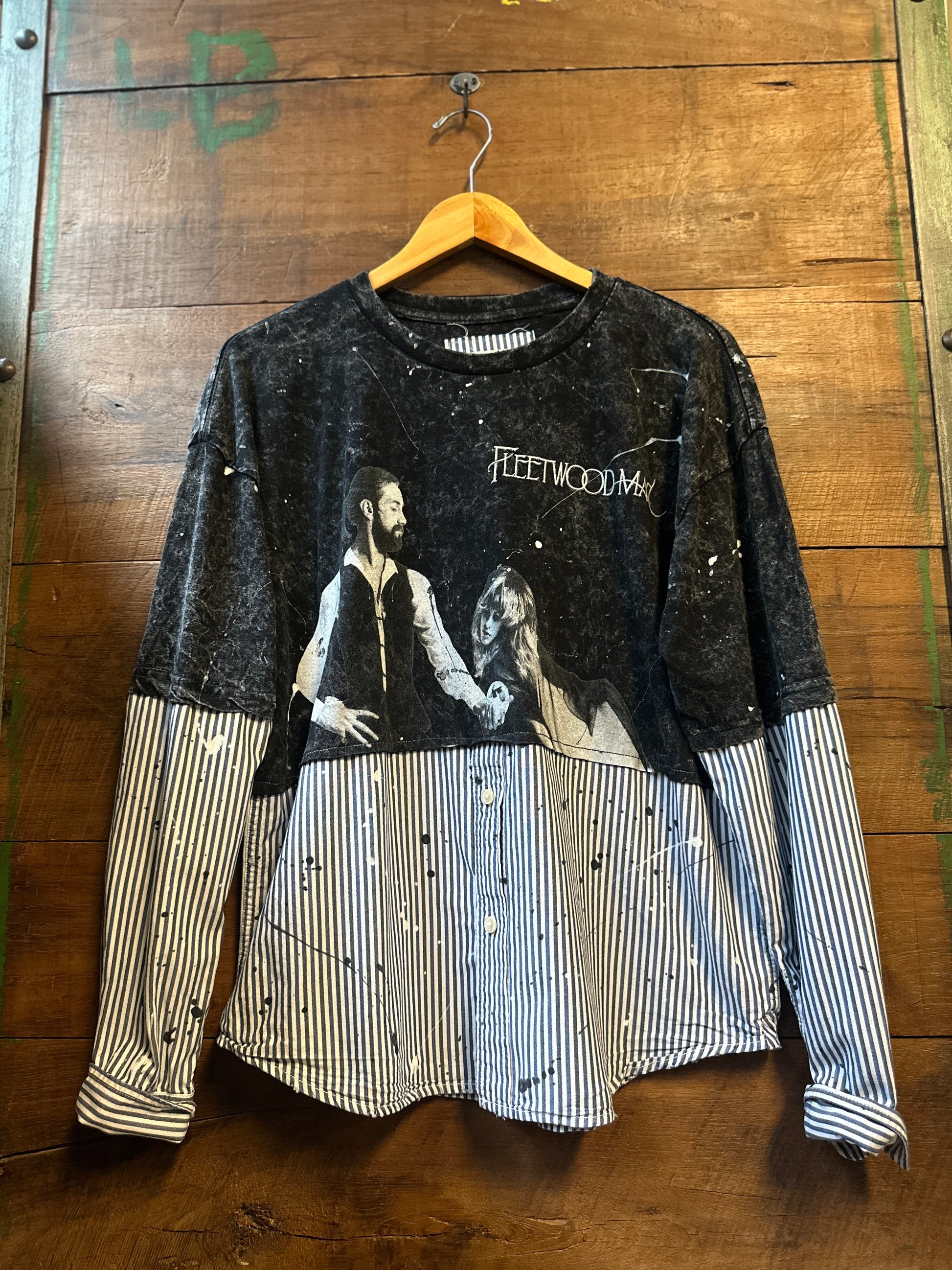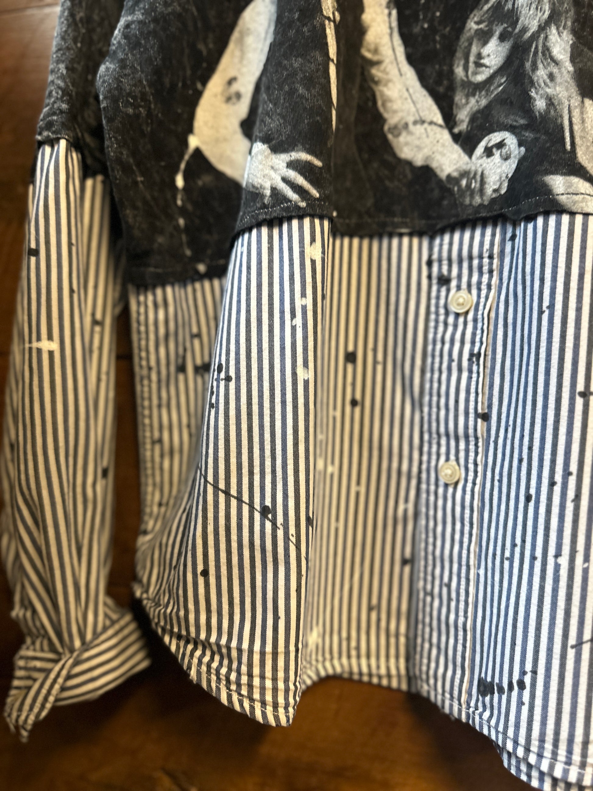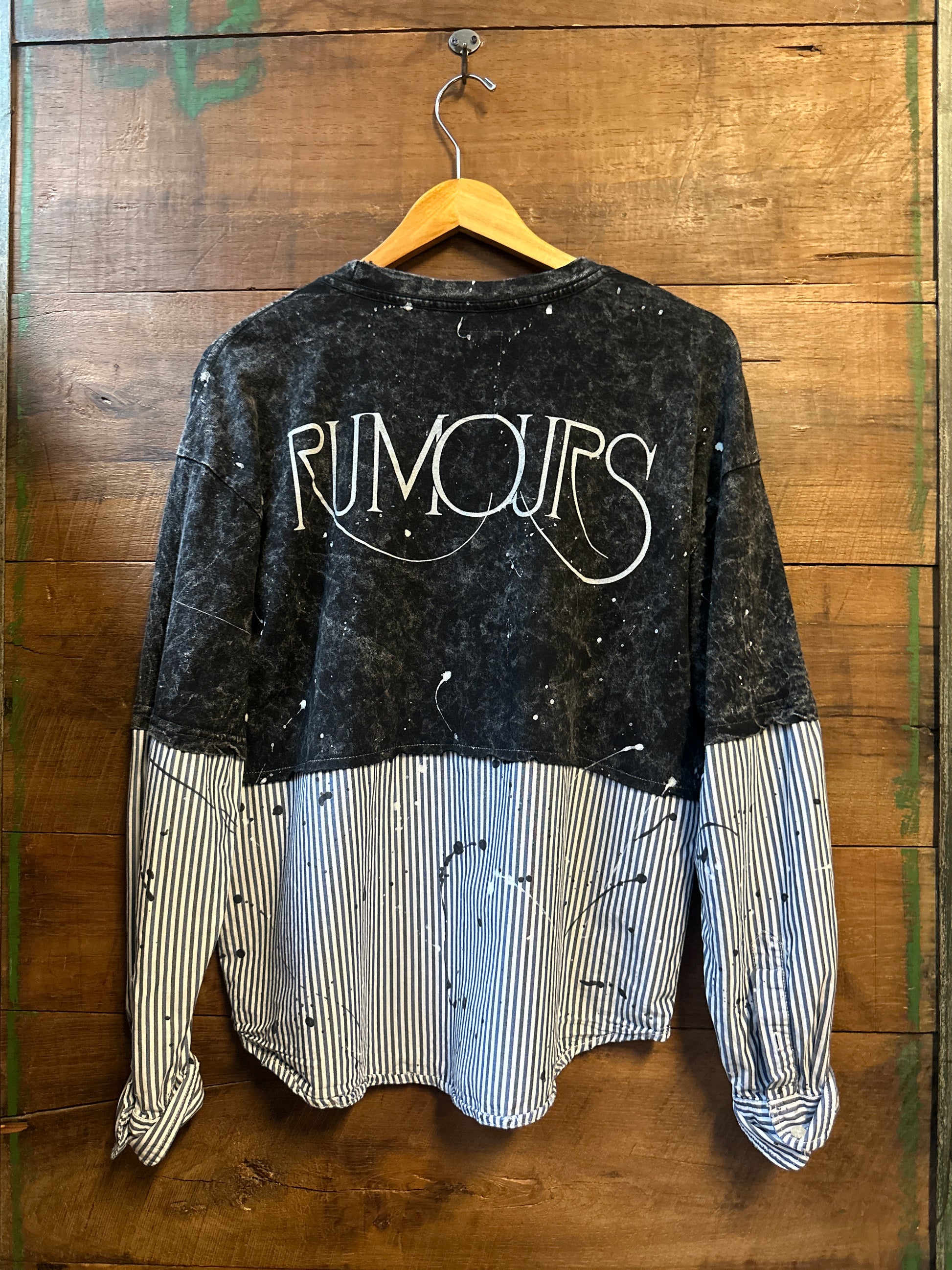 Get ready to turn heads with The Rumour, an upcycled tee that’s anything but ordinary. Featuring bold contrasting striped sleeves and a unique shirt detail, this playful piece is finished with eye-catching splatter paint accents for a splash of artistic flair. Perfect for those who love to mix style with a touch of fun and sustainability.