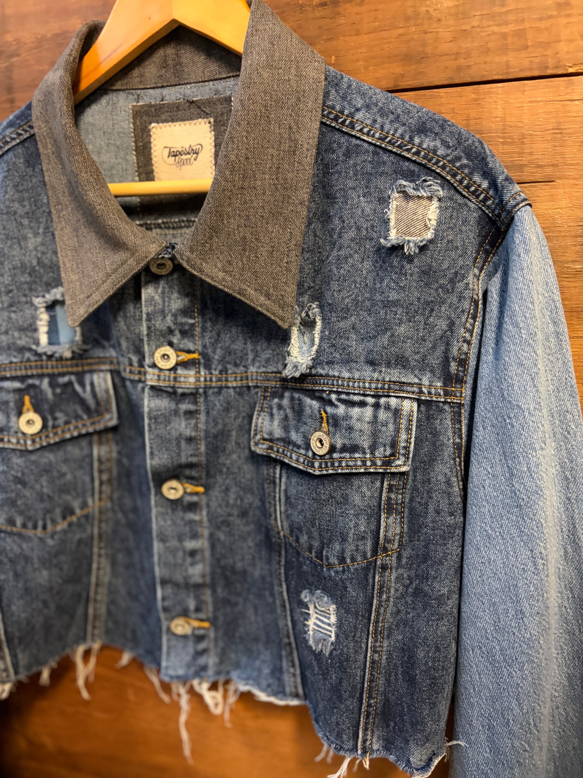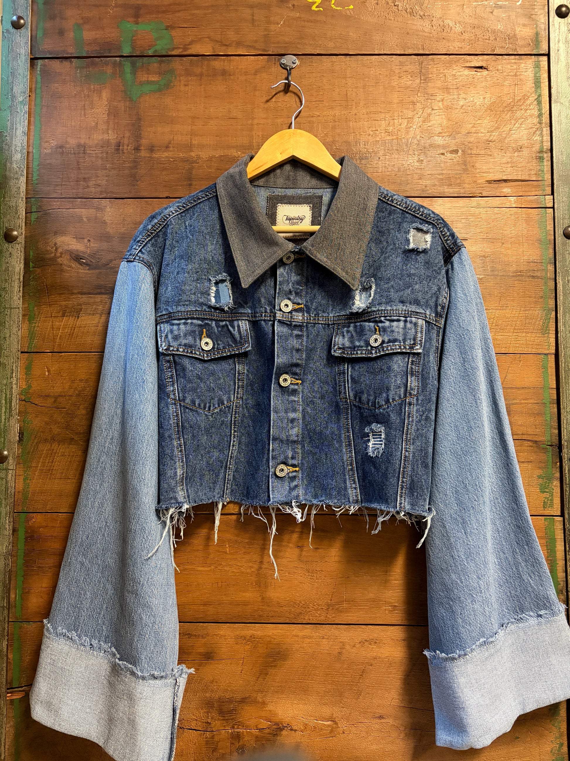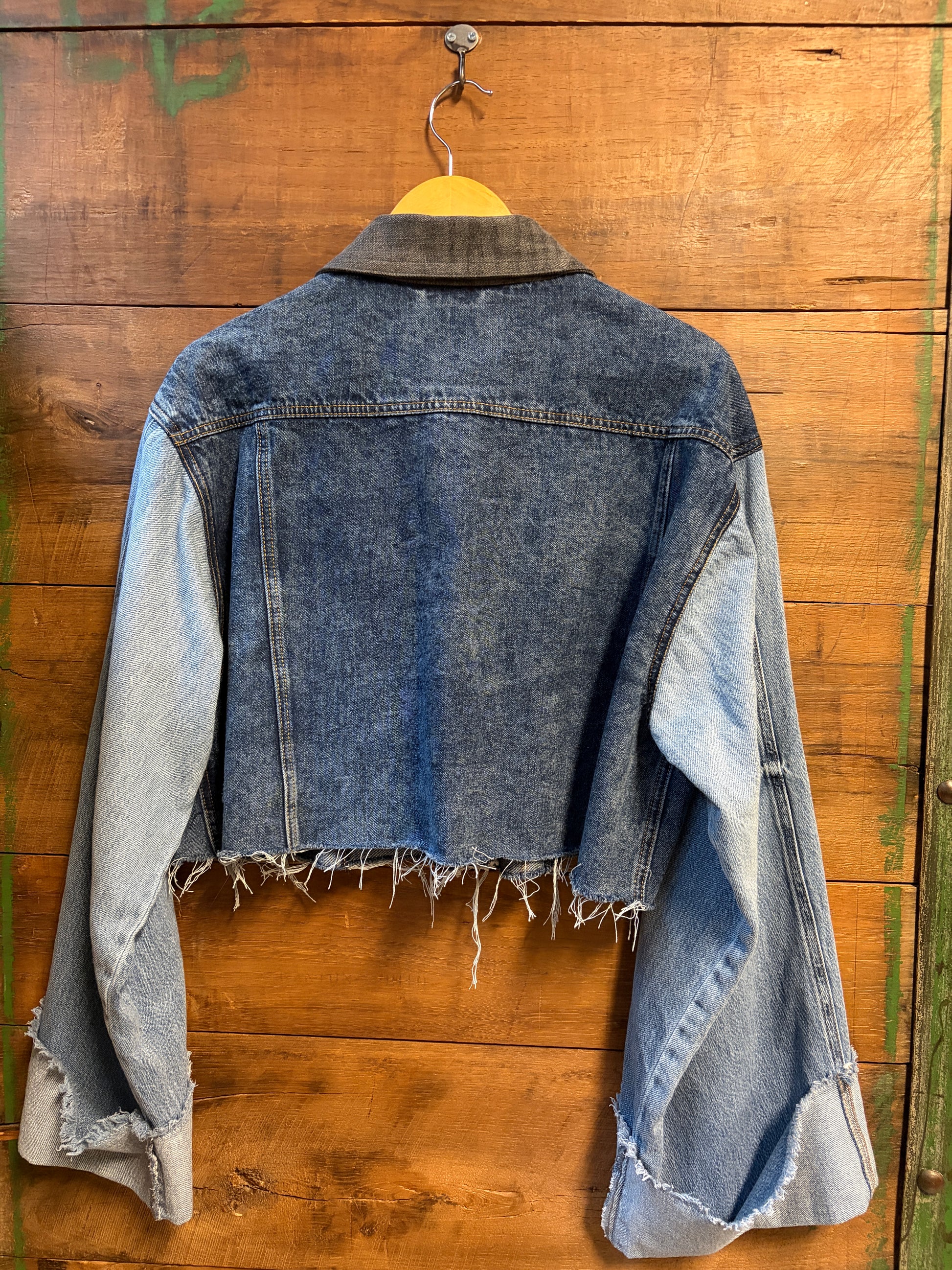 The Salem is your ticket to effortless cool. This upcycled denim jacket combines vintage charm with modern edge. Cropped to hit just right, distressed for that lived-in vibe, and finished with contrasting patches that tell a story. Loose sleeves with wide cuffs add an unexpected twist that feels both relaxed and intentional. Perfect for layering over everything from band tees to sundresses, it's the kind of piece that gets better with time.