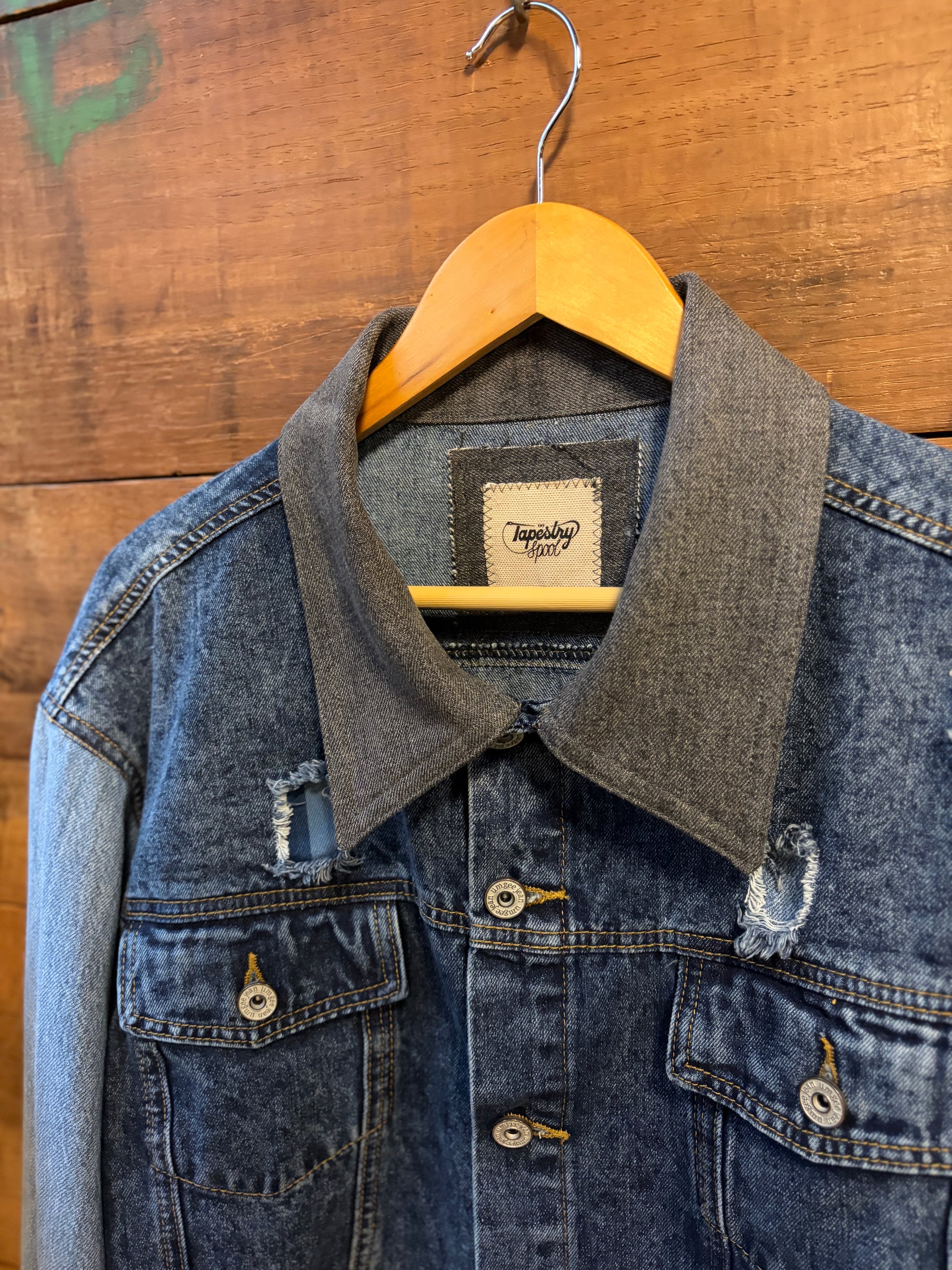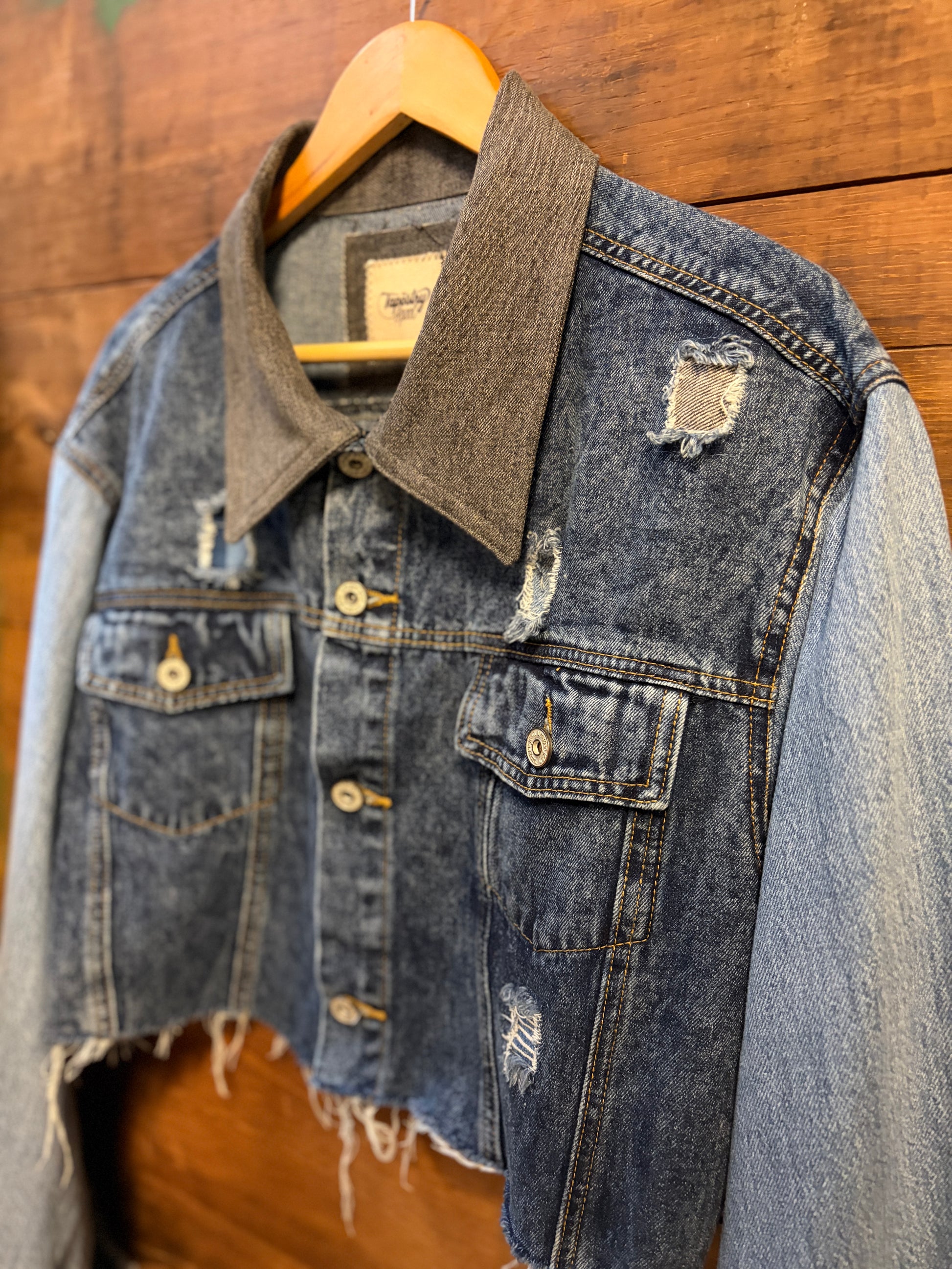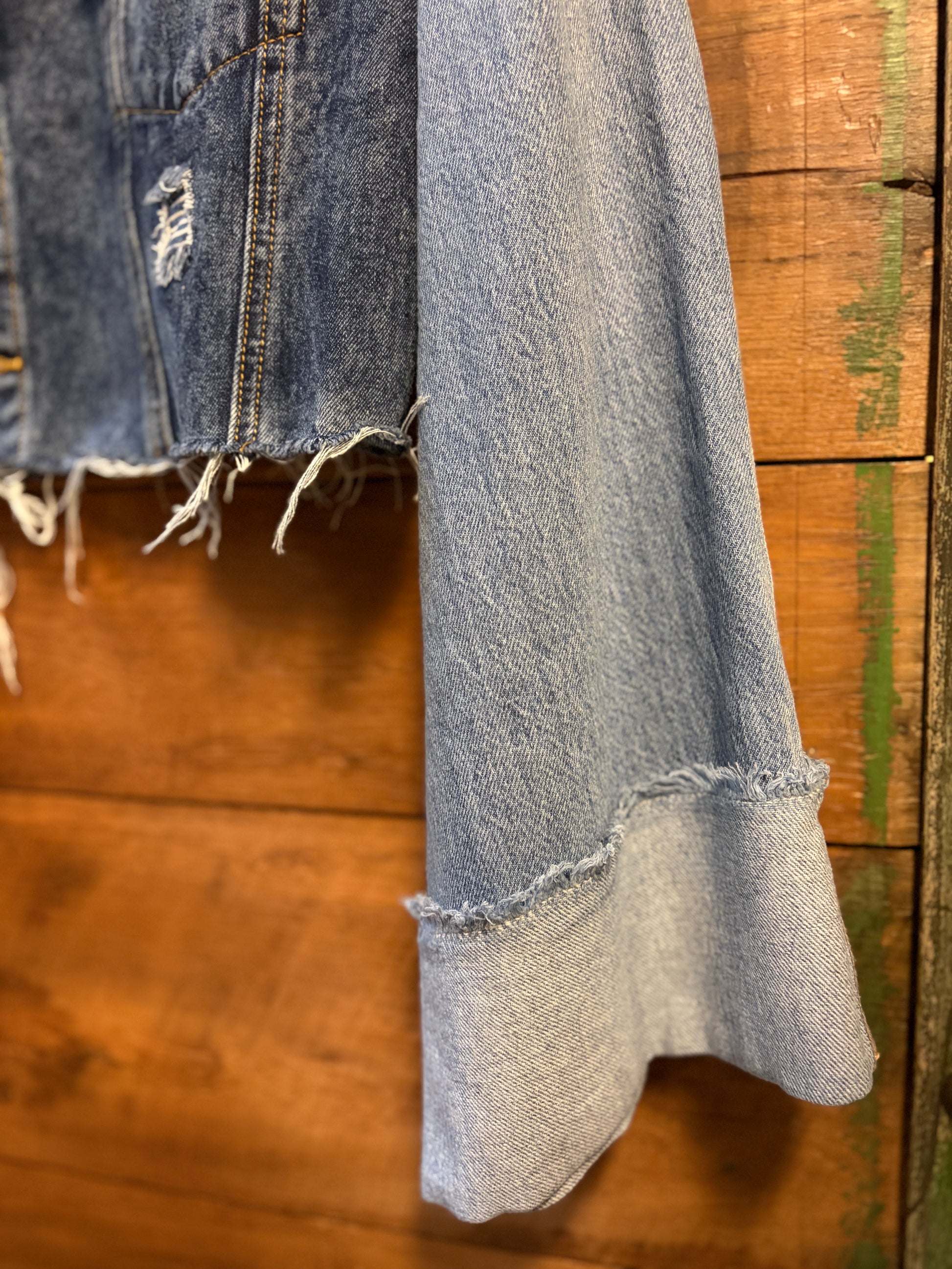The Salem is your ticket to effortless cool. This upcycled denim jacket combines vintage charm with modern edge. Cropped to hit just right, distressed for that lived-in vibe, and finished with contrasting patches that tell a story. Loose sleeves with wide cuffs add an unexpected twist that feels both relaxed and intentional. Perfect for layering over everything from band tees to sundresses, it's the kind of piece that gets better with time.