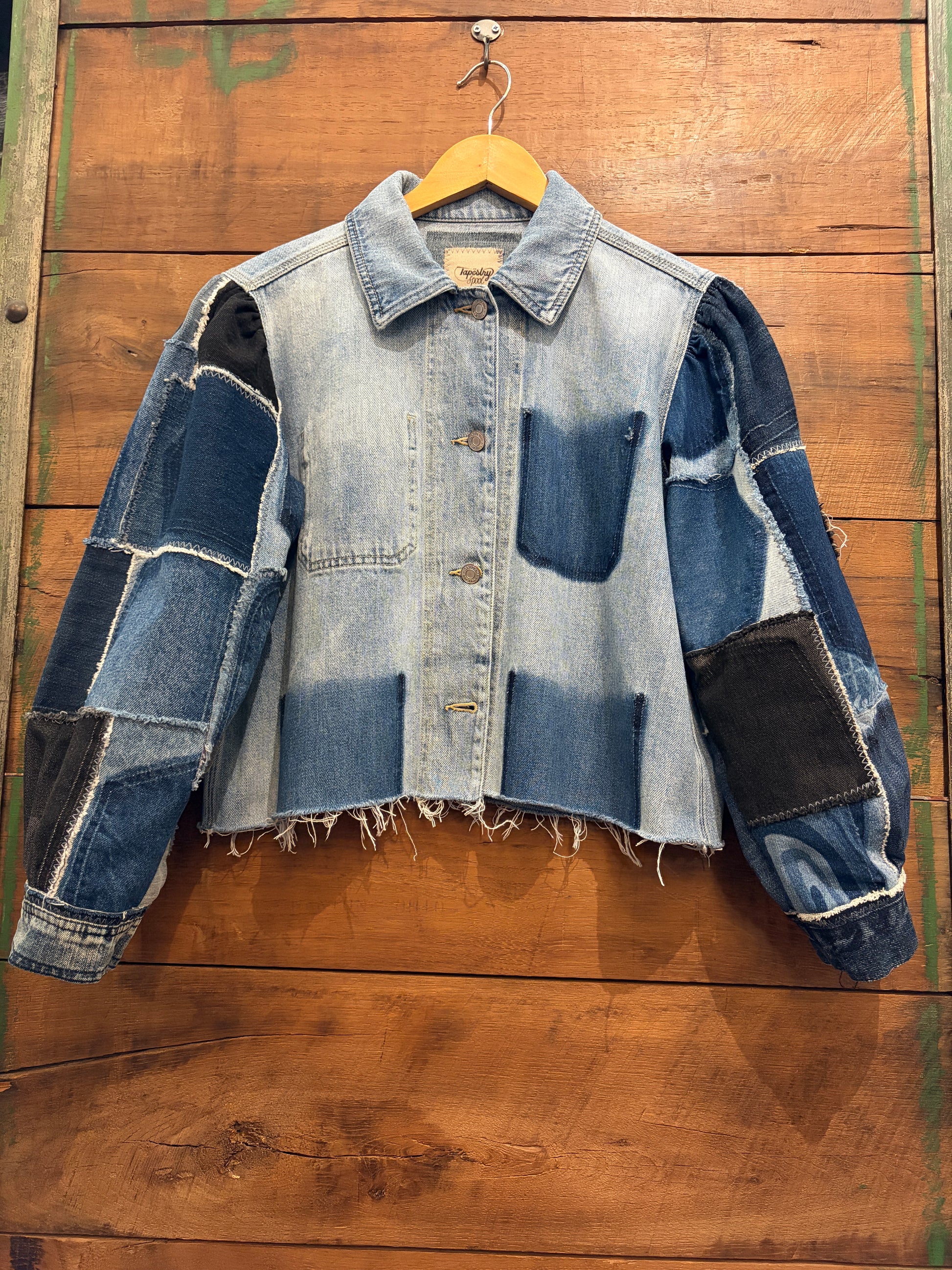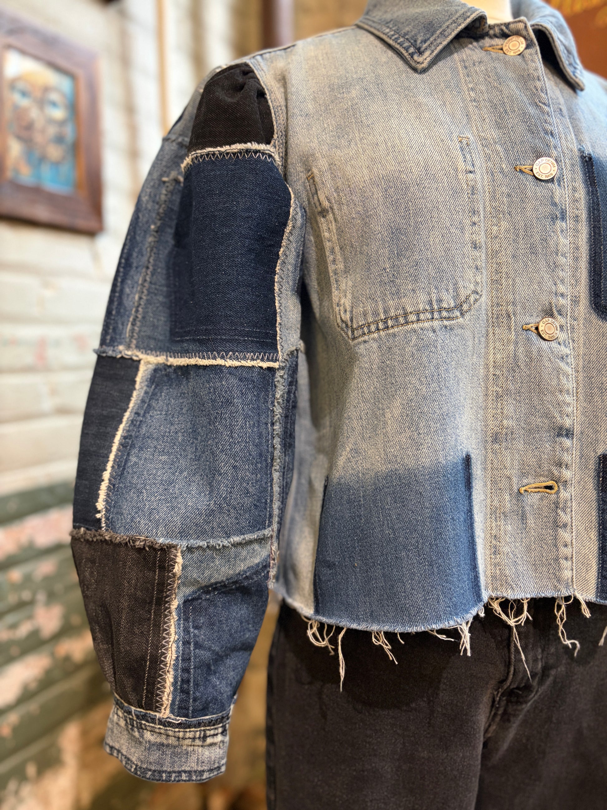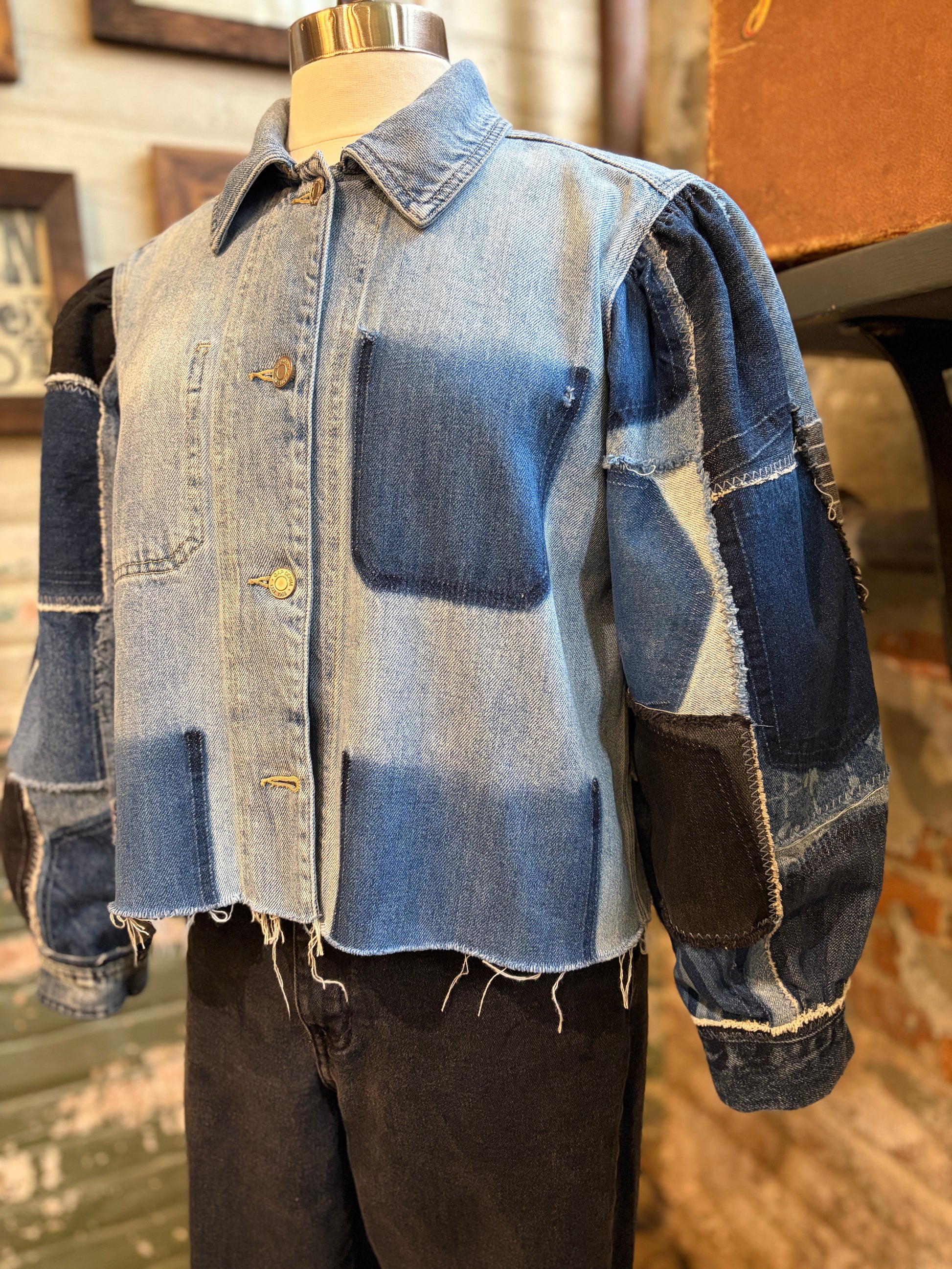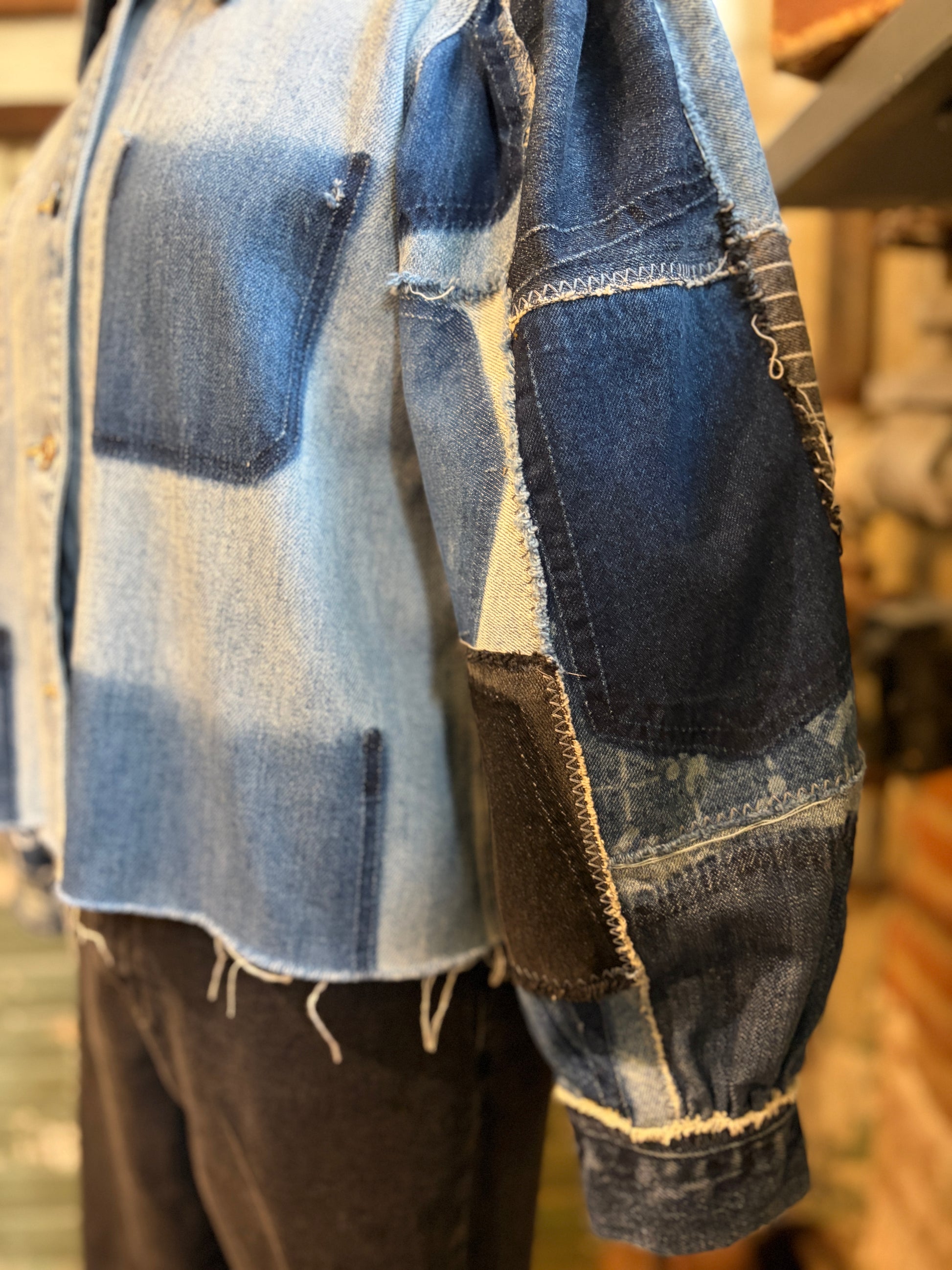 The Shadow is a bold statement piece that transforms denim into wearable art. This upcycled jacket features a cropped silhouette with dramatic balloon sleeves crafted from carefully patched denim scraps, creating a unique texture and visual interest. The raw edge hemline adds an intentional, unfinished aesthetic that celebrates the jacket's sustainable origins. Perfect for layering over dresses, tees, or tanks, it combines eco-conscious fashion with contemporary style. Each piece is one-of-a-kind, reflecting the character of its reclaimed materials.