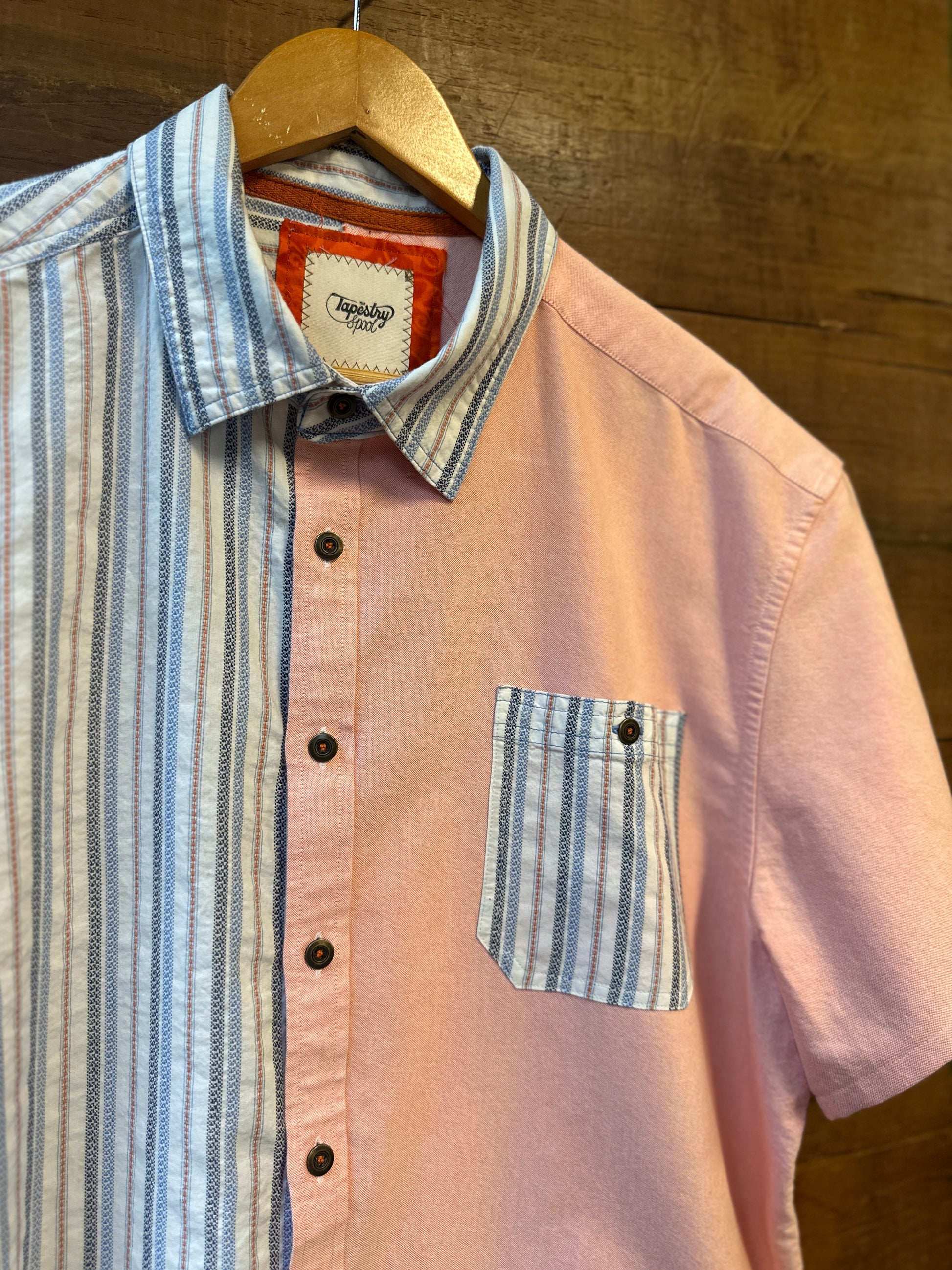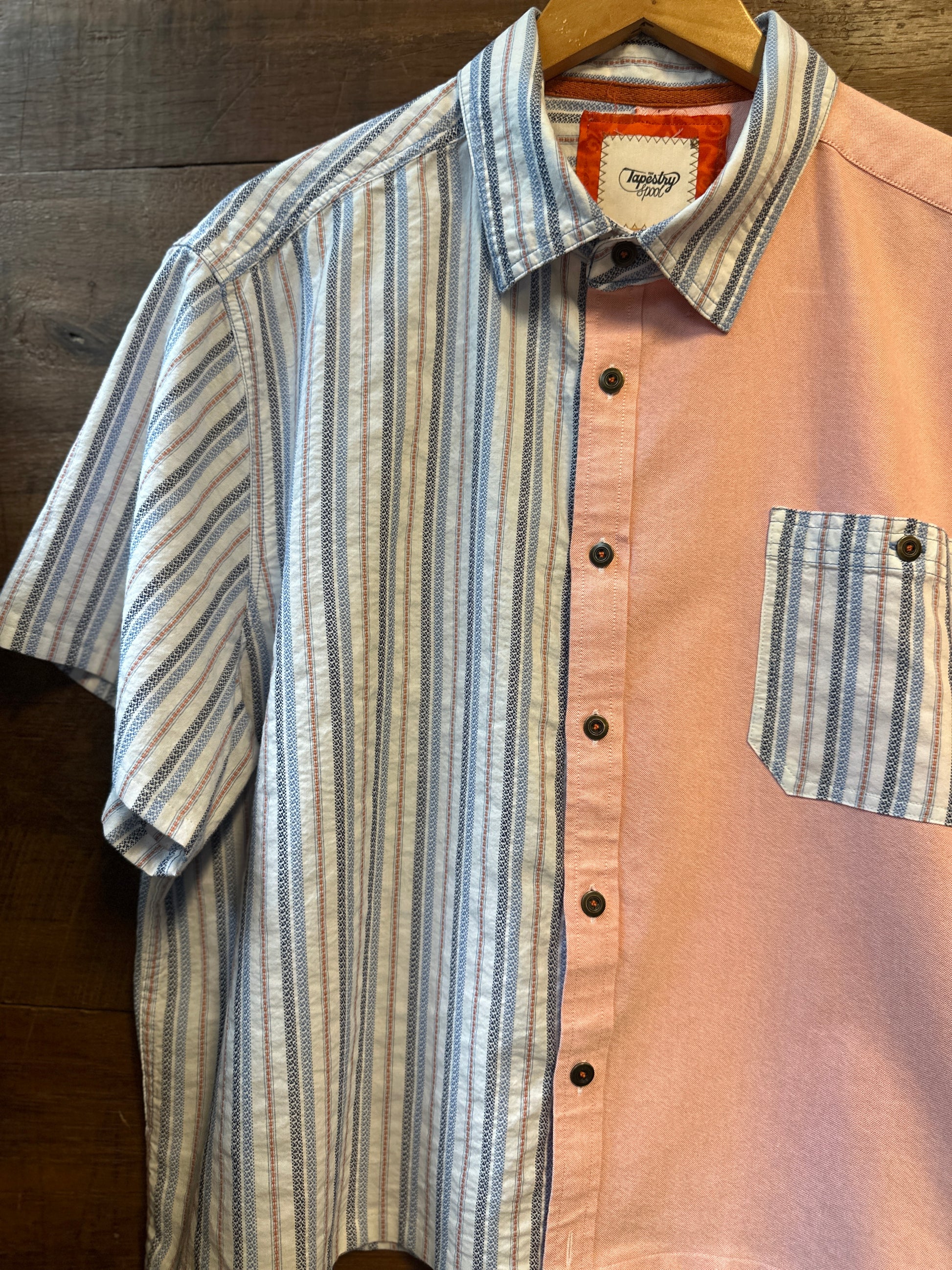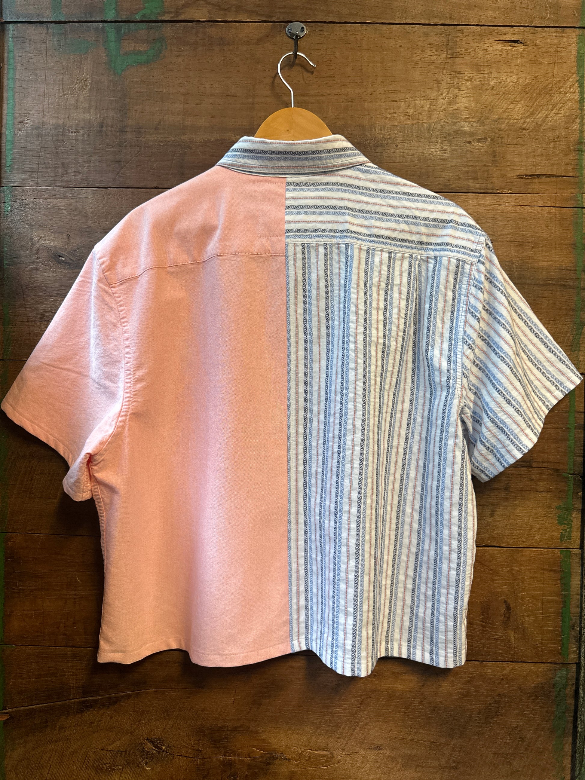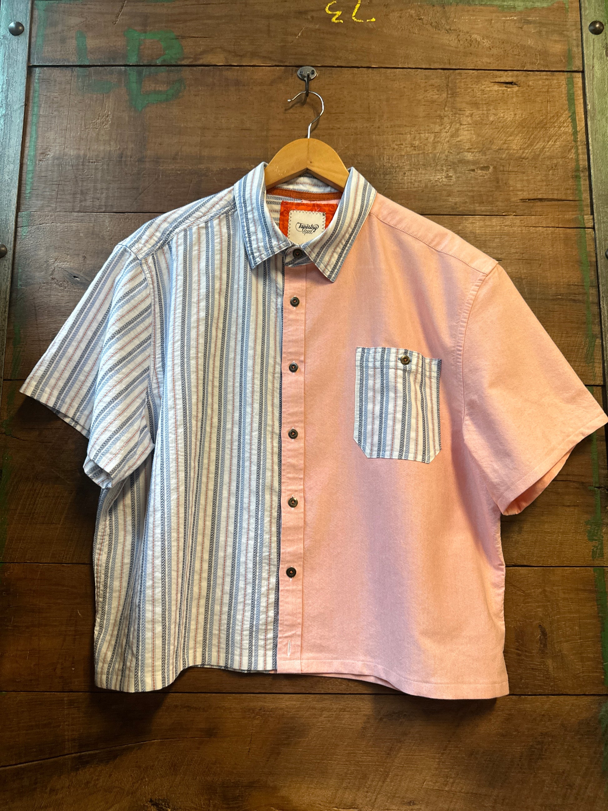 Brighten your wardrobe with The Sherbet, an upcycled lightweight shirt featuring a fun contrasting half-and-half design. Its oversized fit adds a relaxed, playful vibe that’s perfect for mixing and matching. This unique piece brings a splash of color and eco-friendly style to your everyday look!
