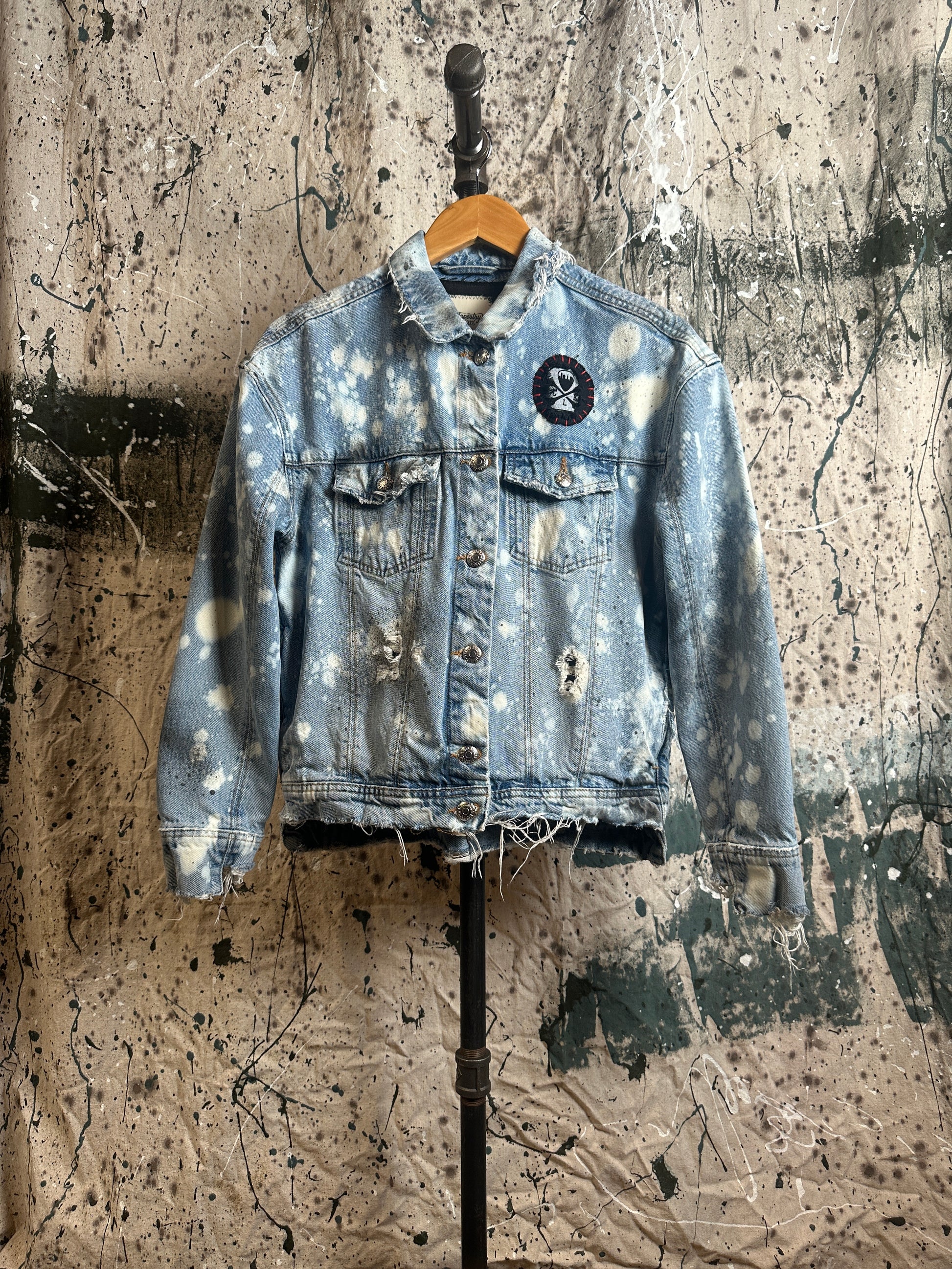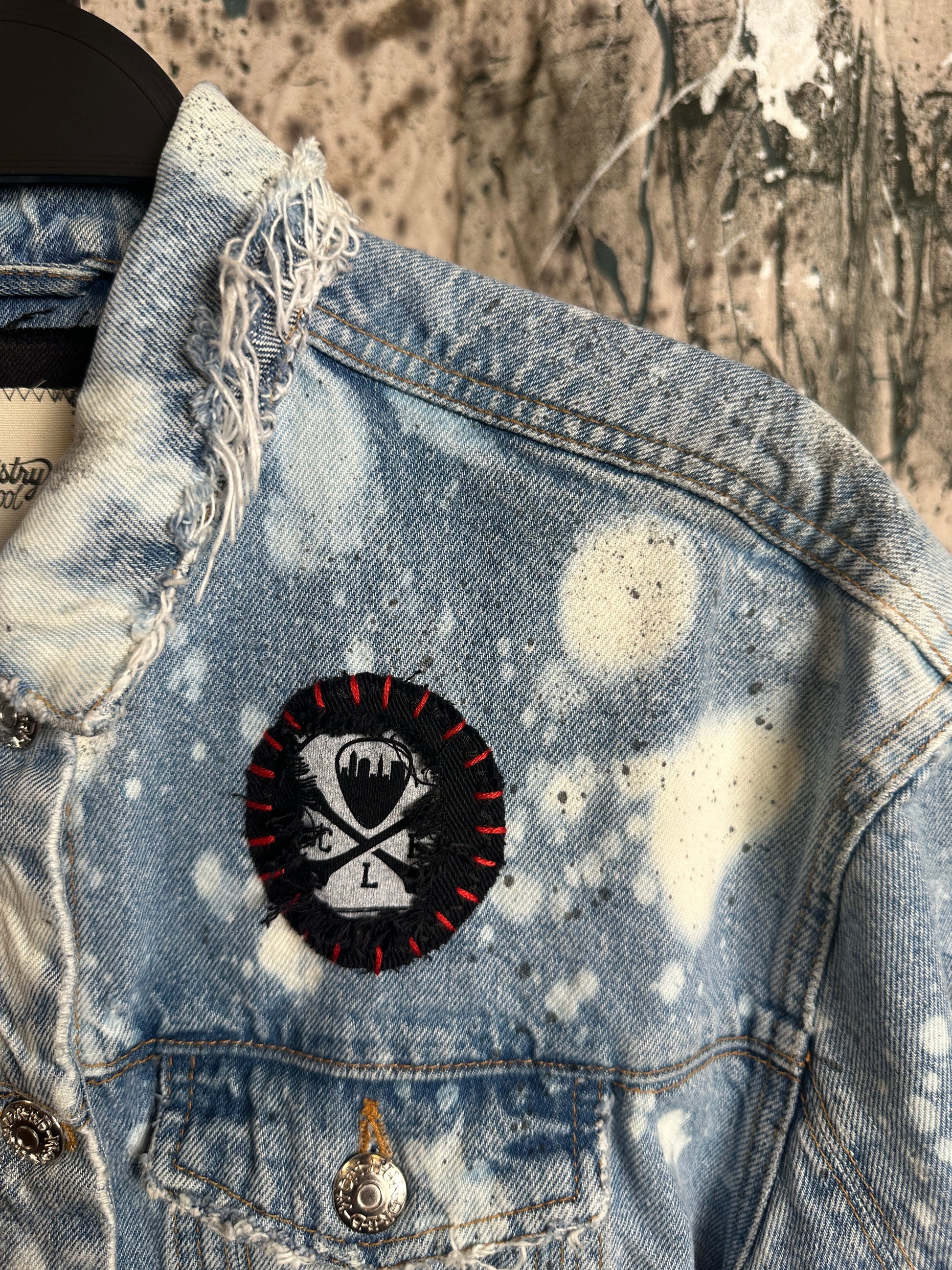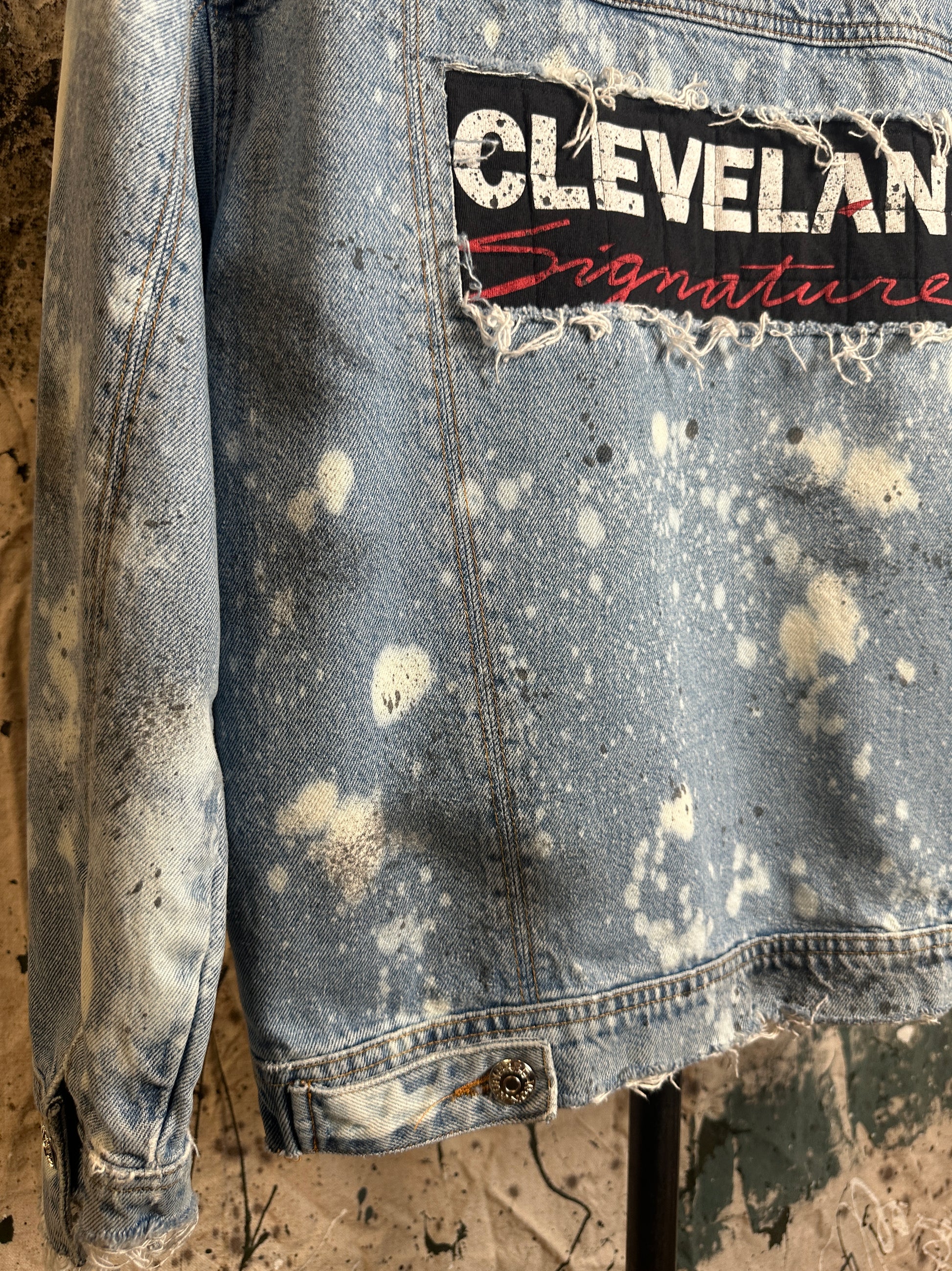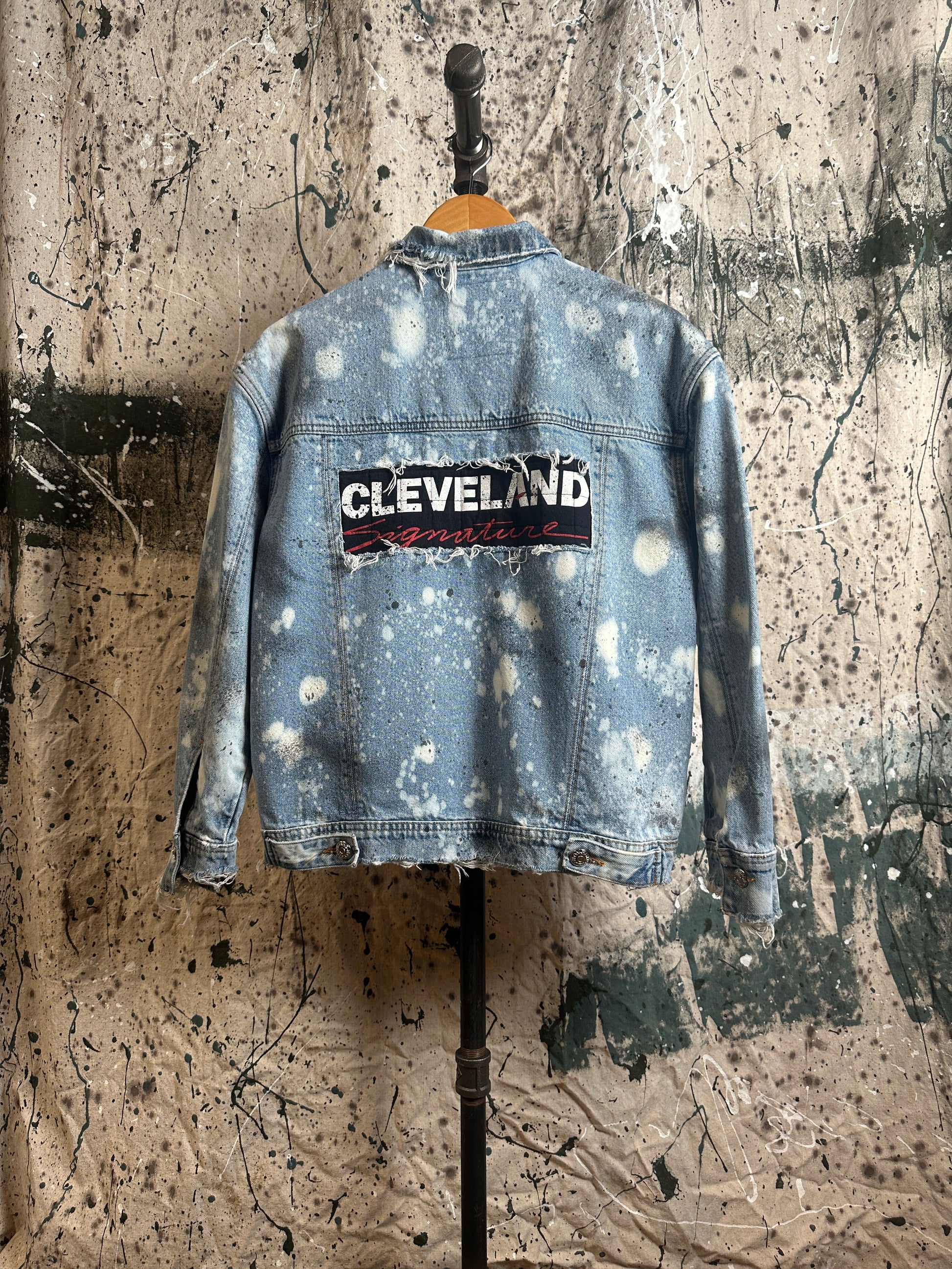 The Signature is an upcycled denim jacket that turns heads with bleach and paint splatters for a uniquely artistic vibe. Distressed edges add an edgy touch, while a quilted "Cleveland Siganture" logo patch on the back proudly marks your style as one-of-a-kind. This jacket is all about playful rebellion and effortless cool.