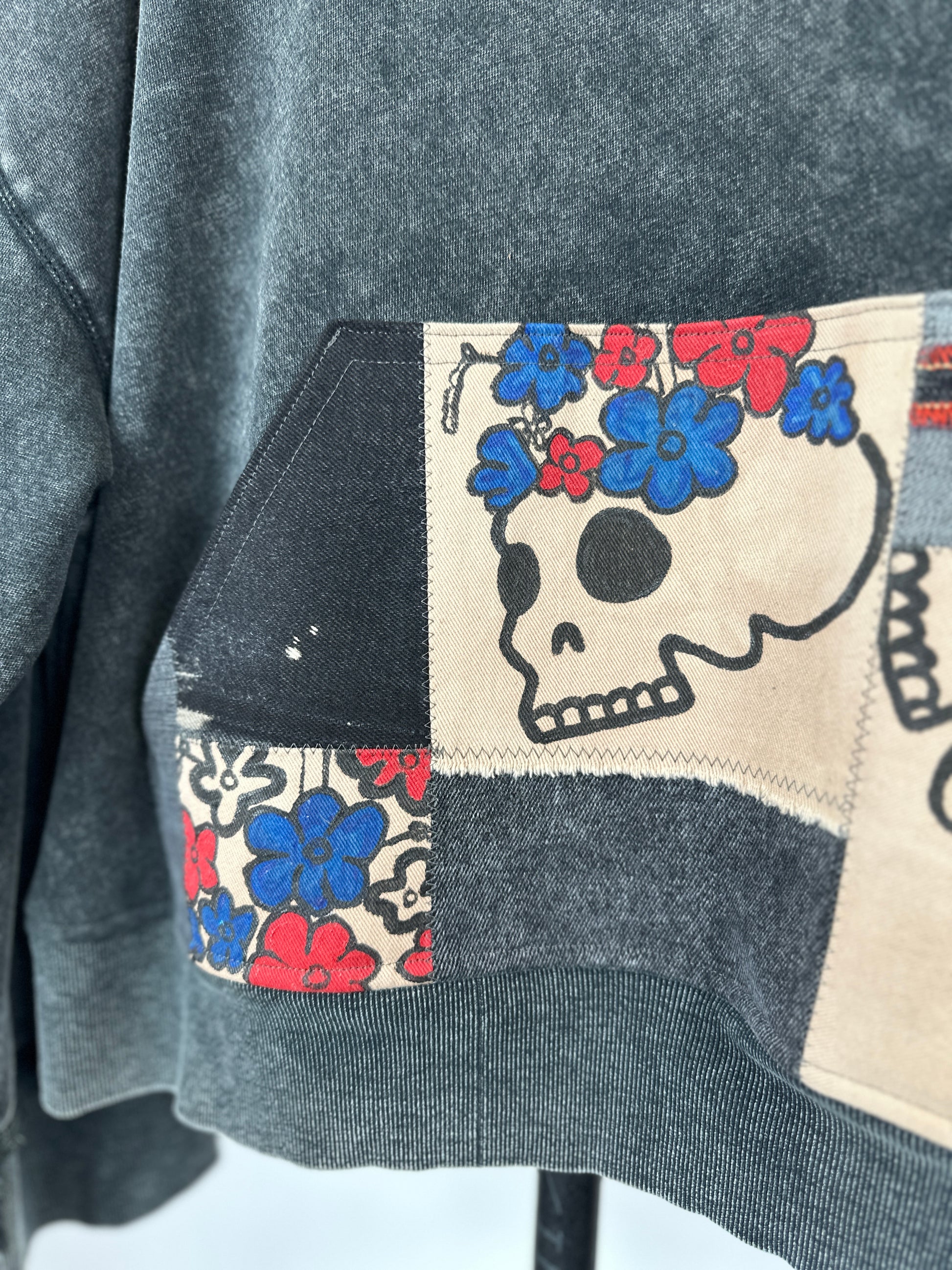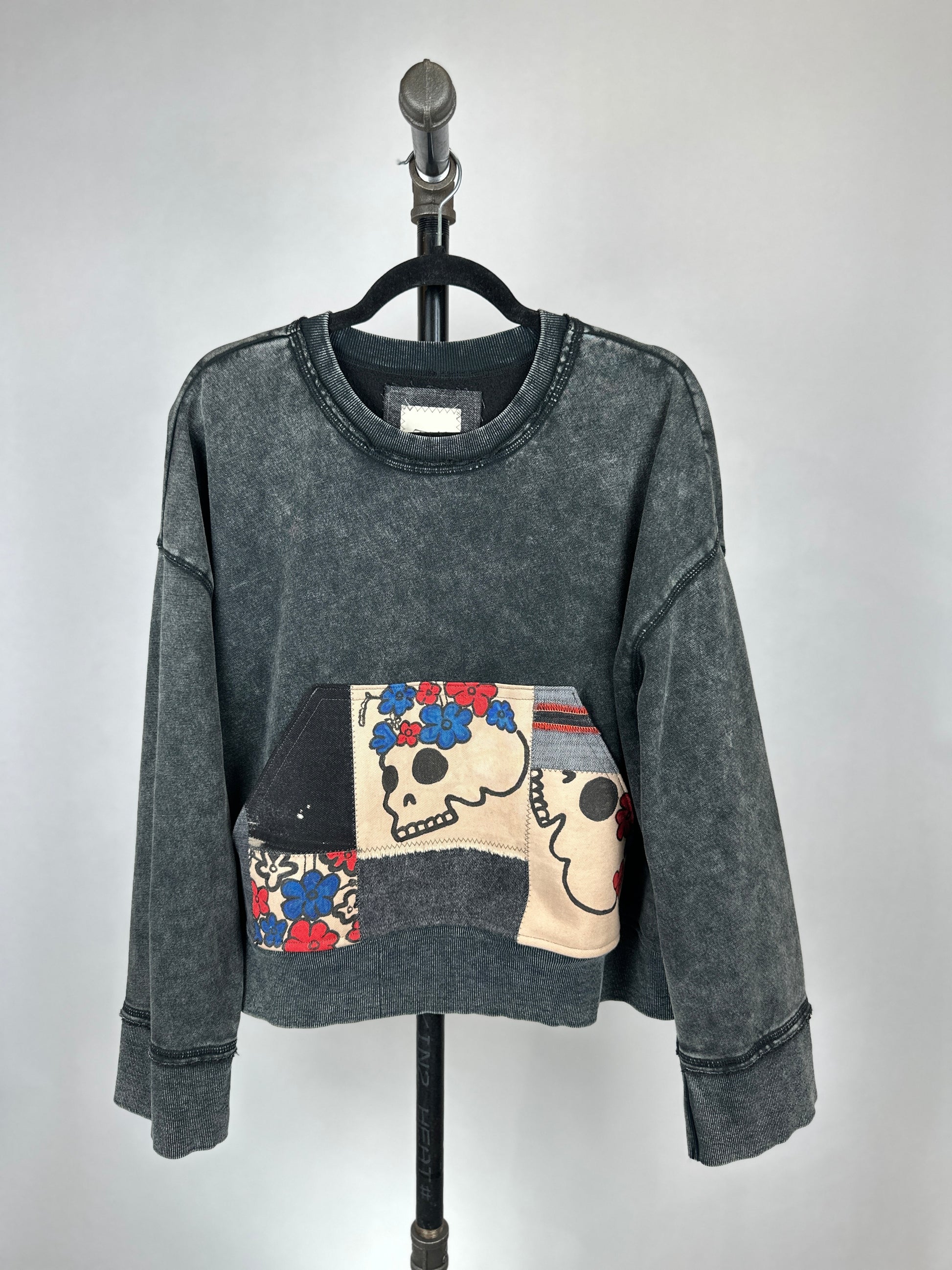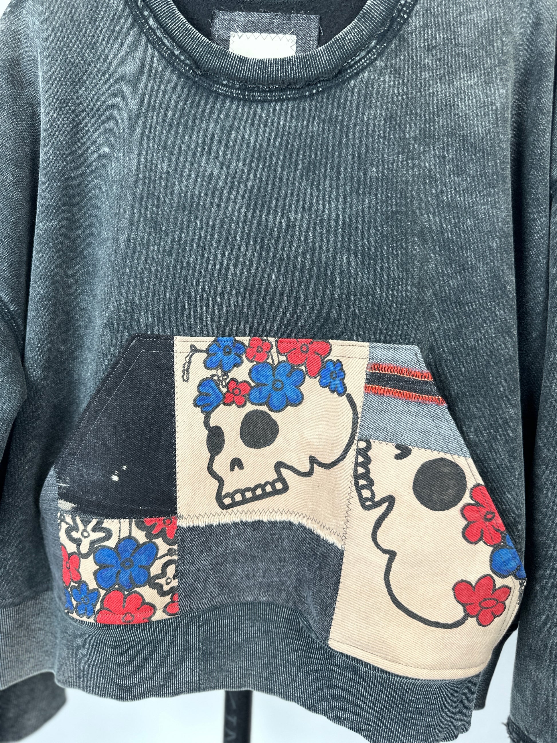 The Skully: a quirky upcycled crewneck for the fashion-forward. Lightweight and soft for all-day comfort. The boxy fit gives off a carefree vibe while the patched skull kanga pocket adds a playful touch.