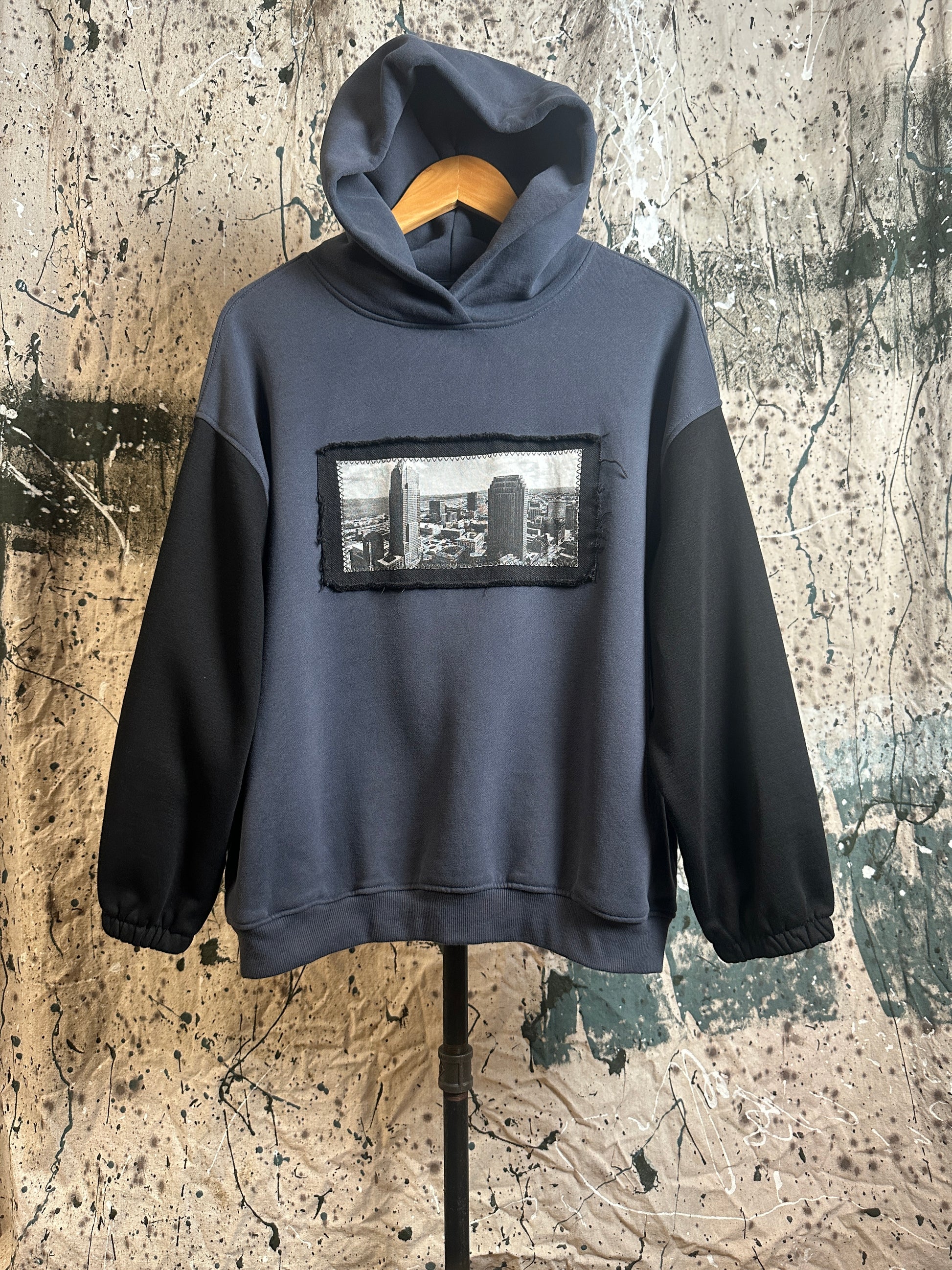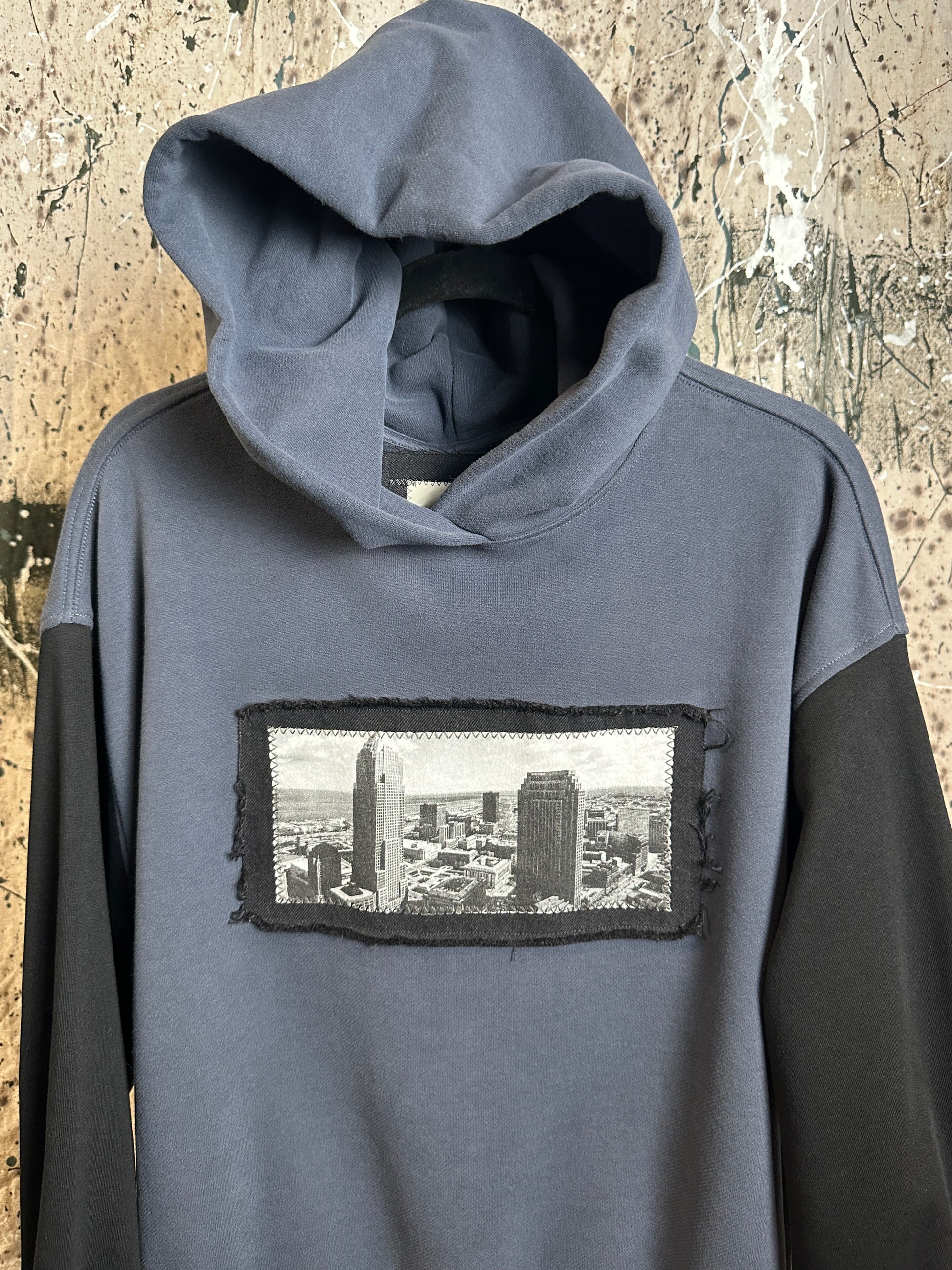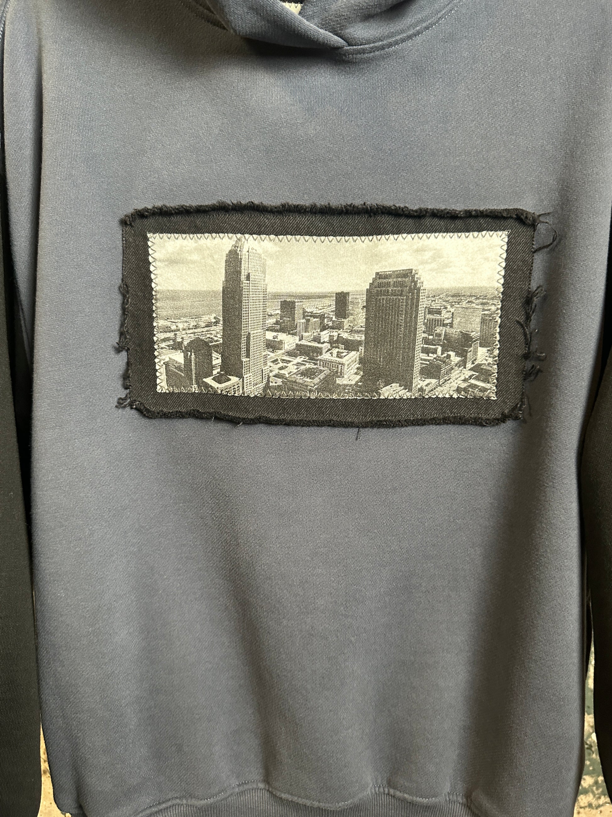 The Slate is an upcycled hoodie that adds a playful twist with contrasting sleeves and a bold CLE skyline patch on the front. Perfect for those who love mixing comfort with standout style.