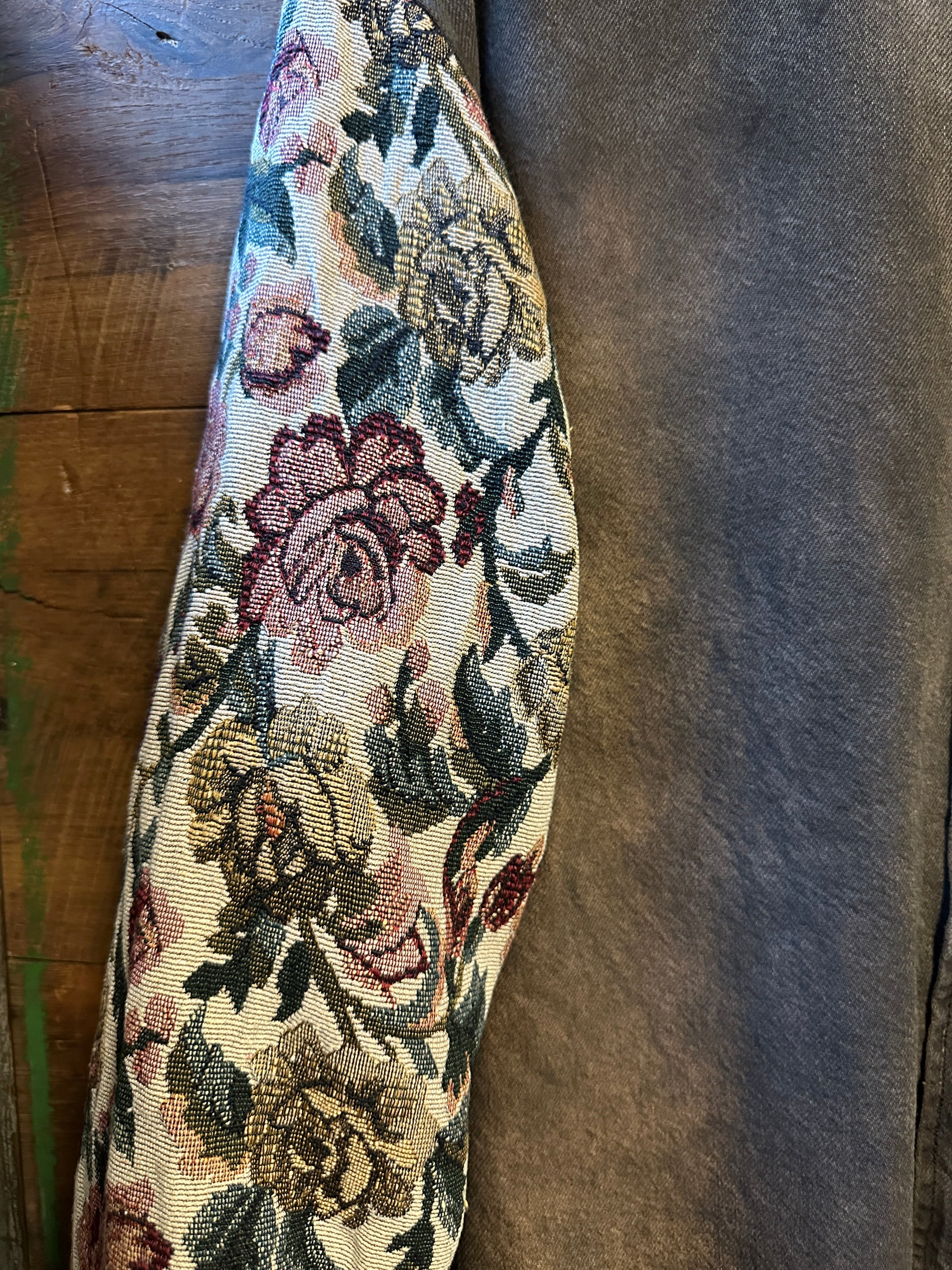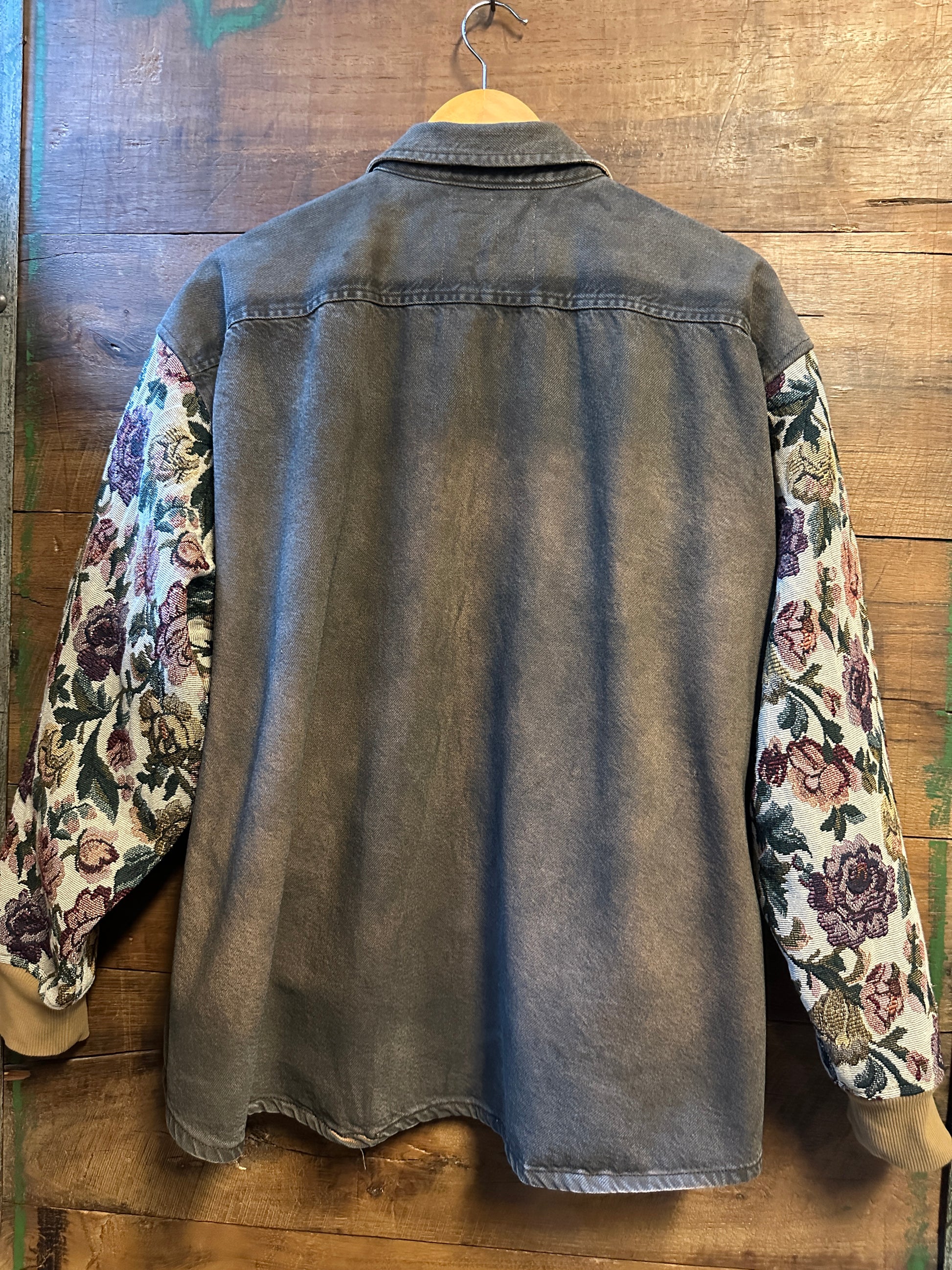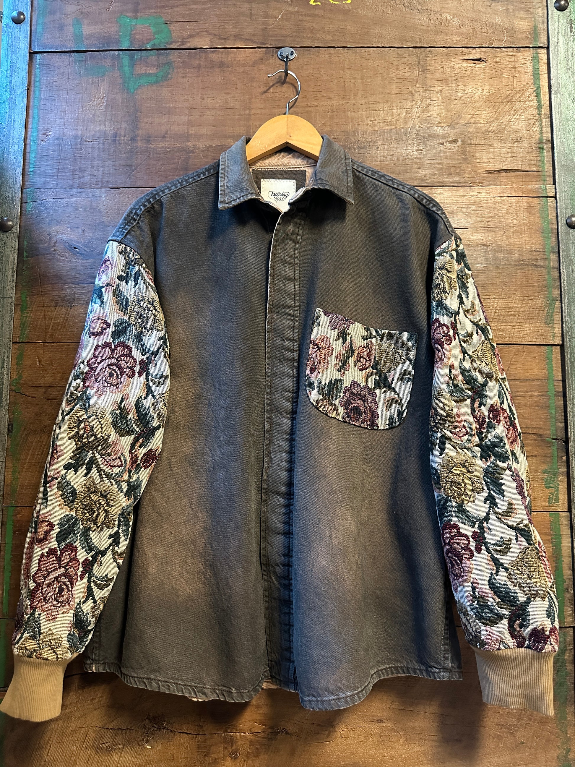 Step out in style with The Tandem—an oversized denim shirt that’s anything but ordinary. Its mineral-washed greyish tan fabric pairs perfectly with vintage floral tapestry sleeves and pocket, giving you a fun mix of rugged and romantic vibes. Celebrate upcycled charm with every wear and turn heads with this unique, effortlessly cool piece.