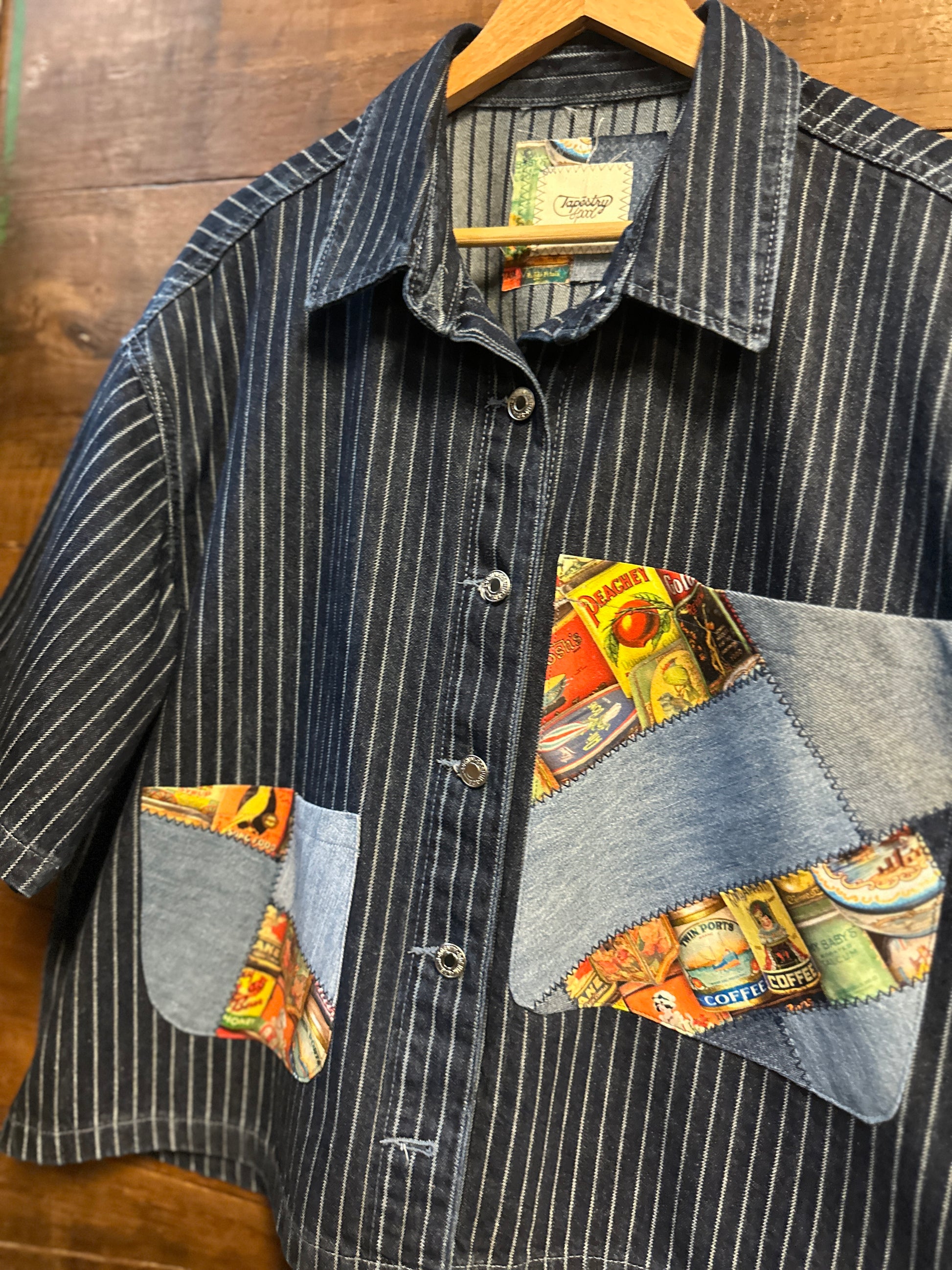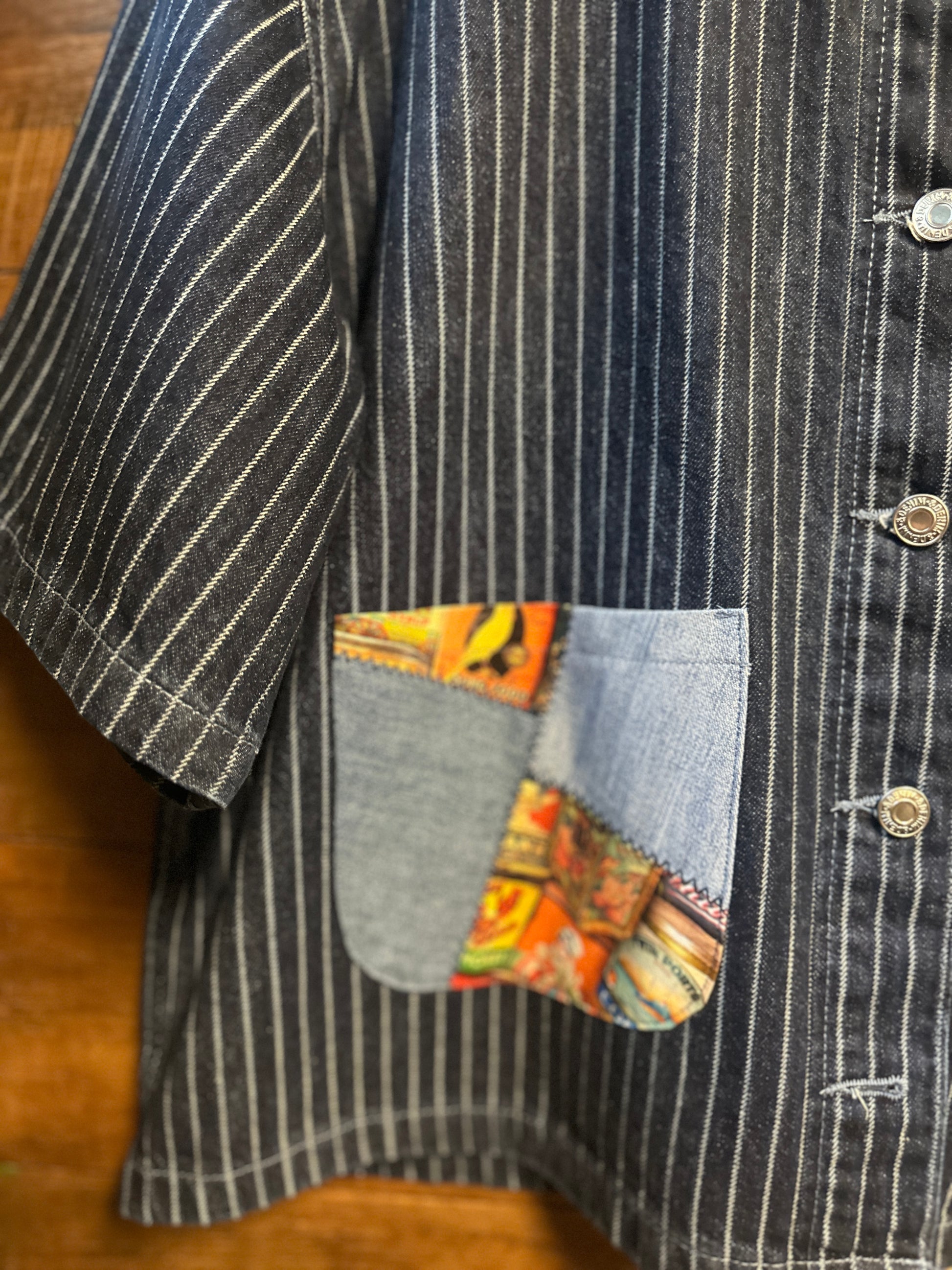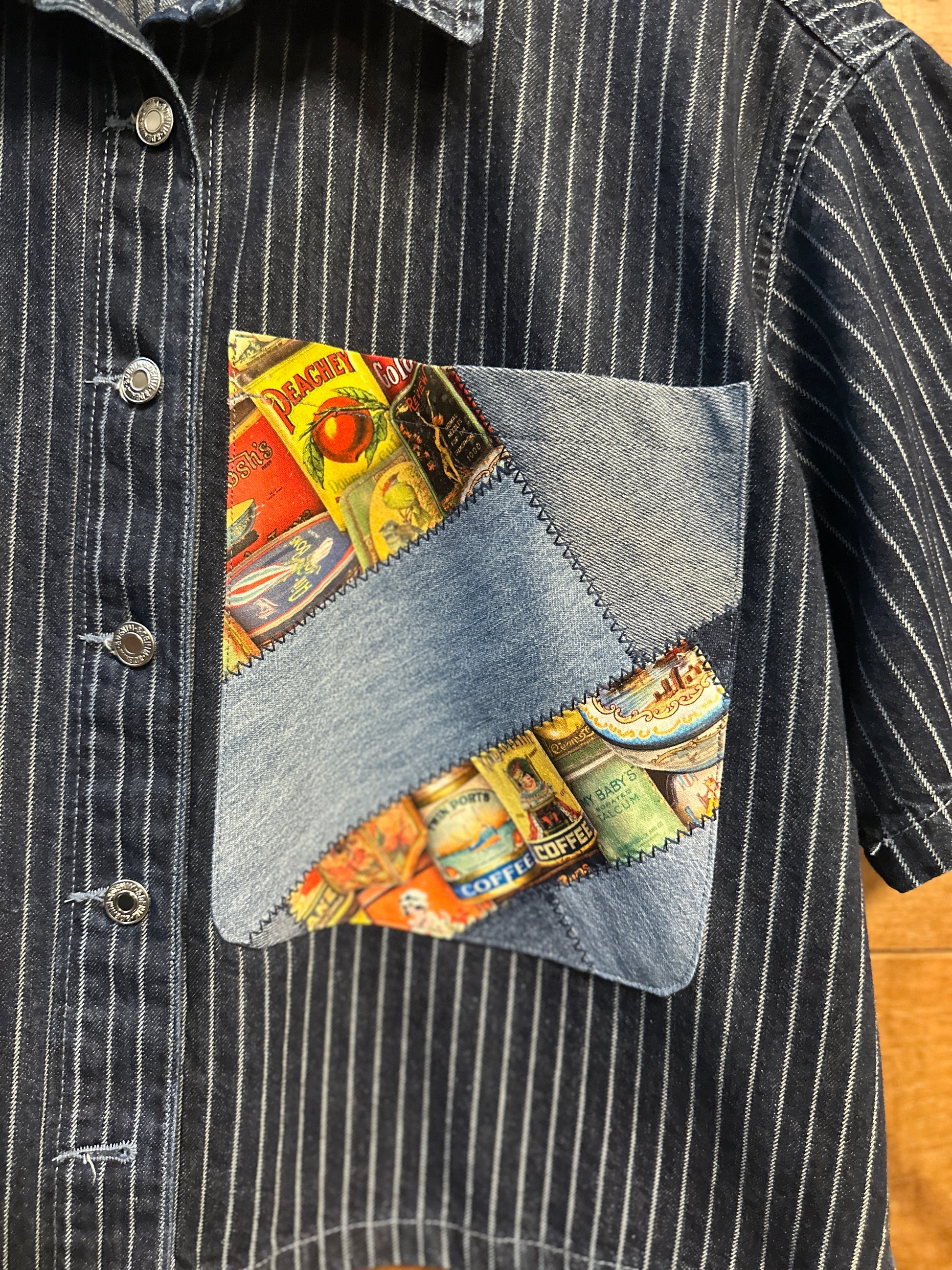 Meet The Teapot, an oversized denim shirt that brews up style with a playful twist. Crafted from an upcycled pinstripe denim shirt, it features a bold, exaggerated pocket made from patched fabrics that adds a splash of contrast and character. Perfect for those who love mixing comfort with a dash of quirky charm.