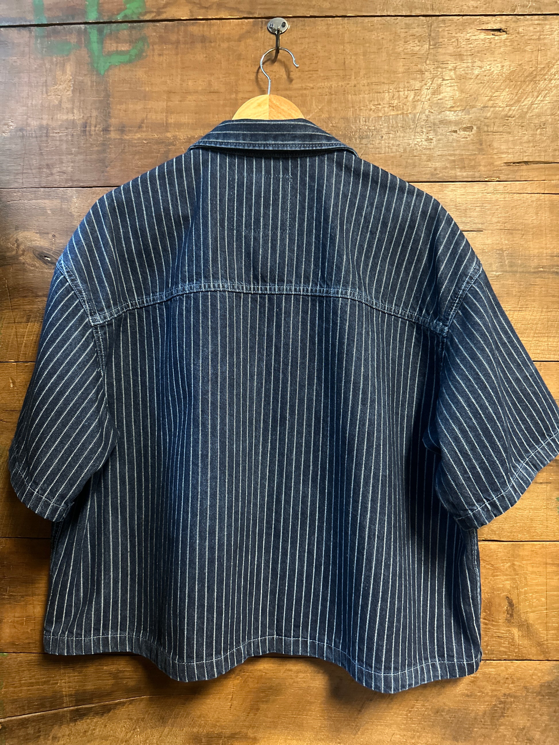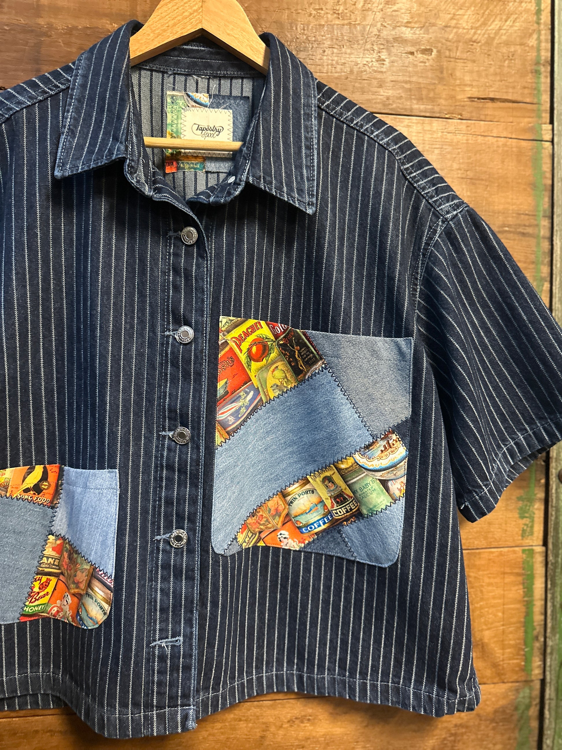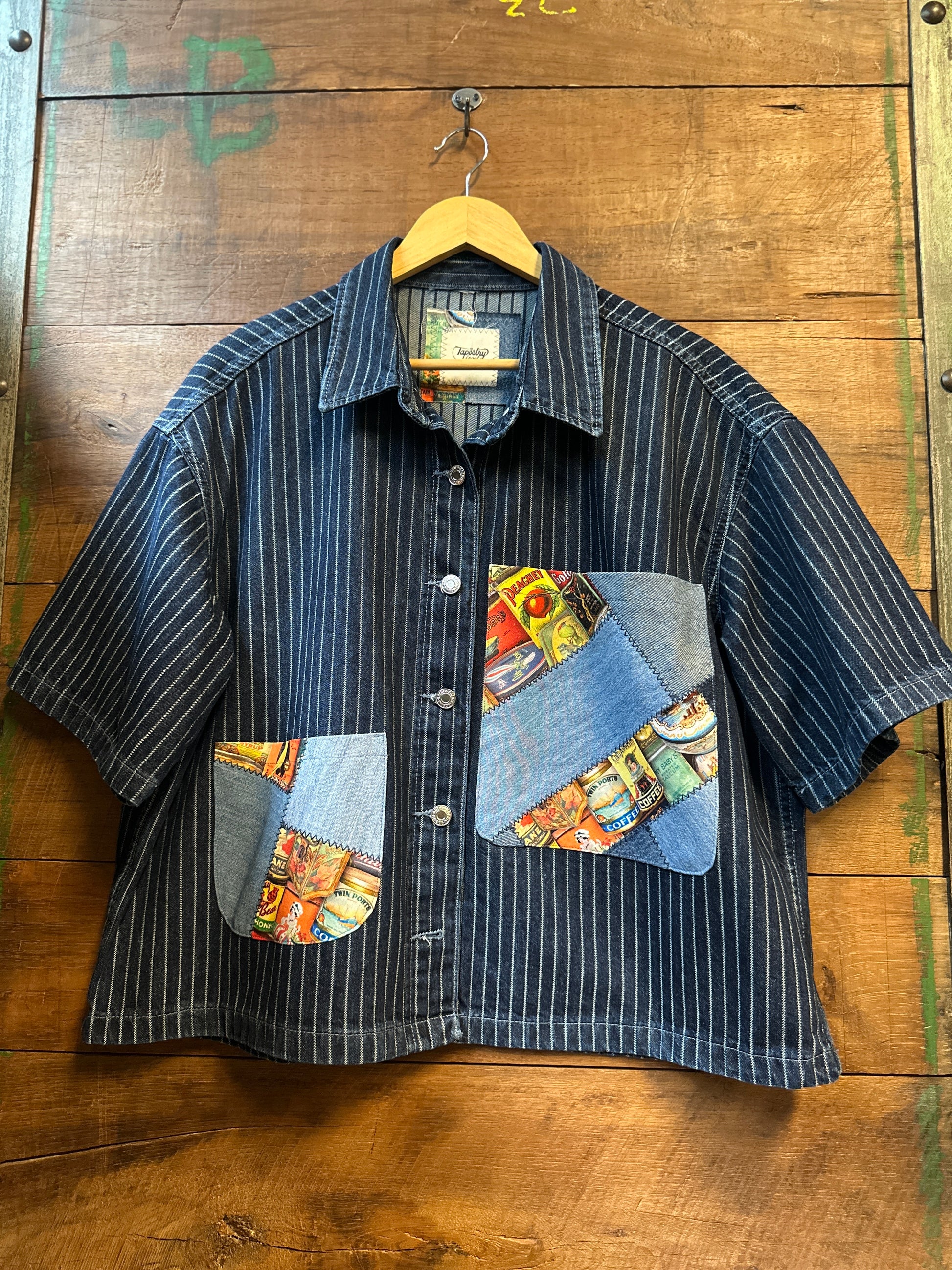 Meet The Teapot, an oversized denim shirt that brews up style with a playful twist. Crafted from an upcycled pinstripe denim shirt, it features a bold, exaggerated pocket made from patched fabrics that adds a splash of contrast and character. Perfect for those who love mixing comfort with a dash of quirky charm.