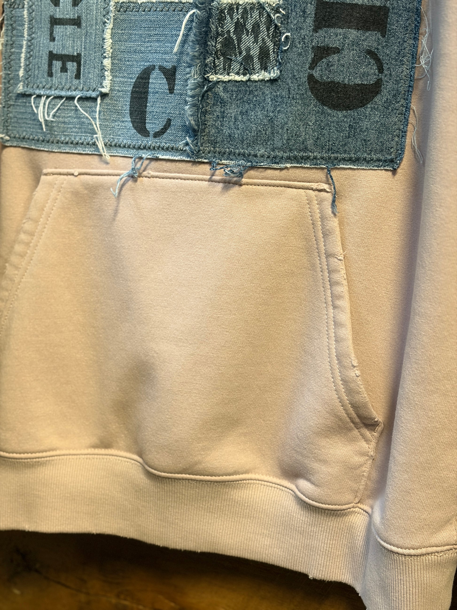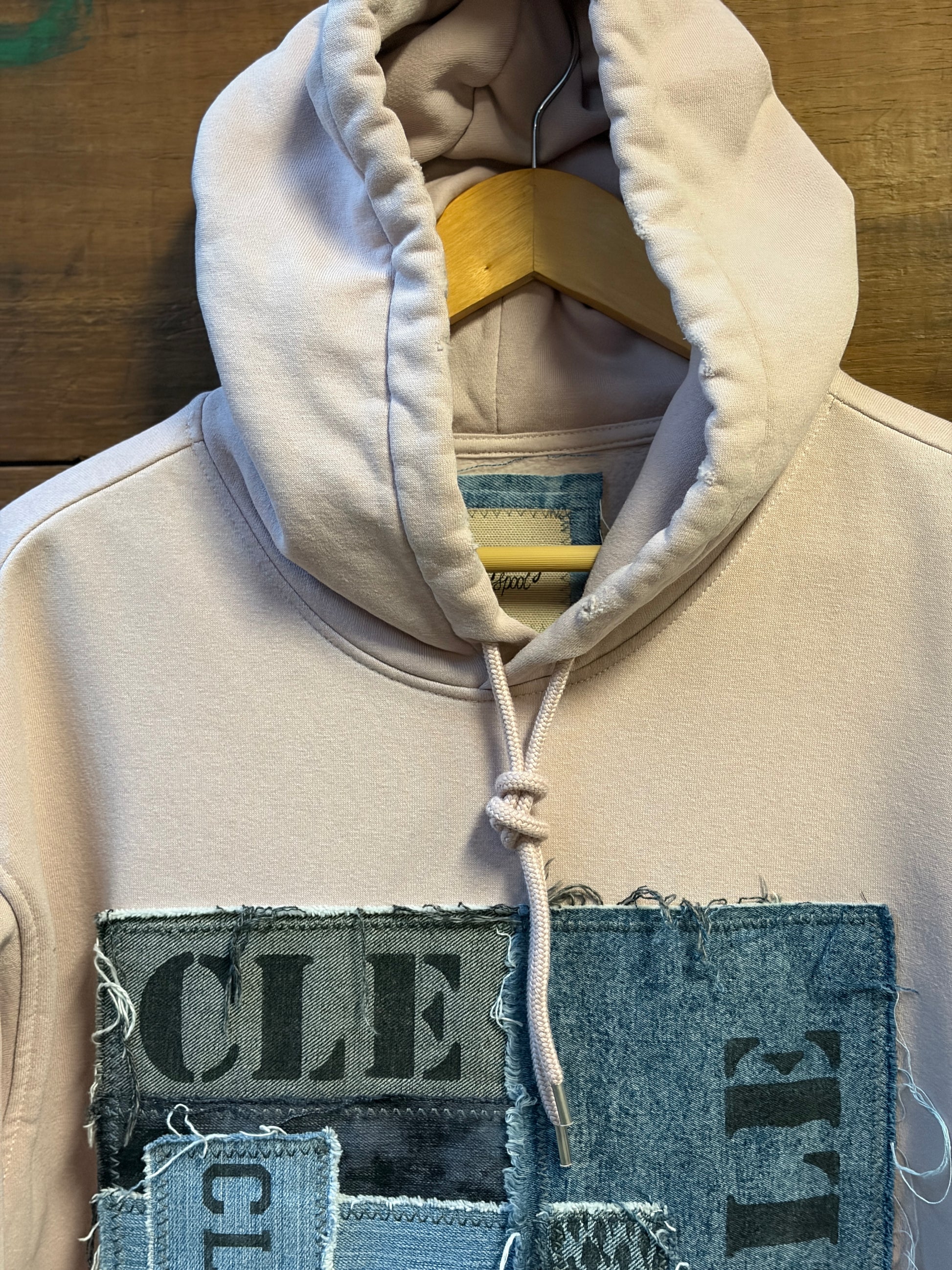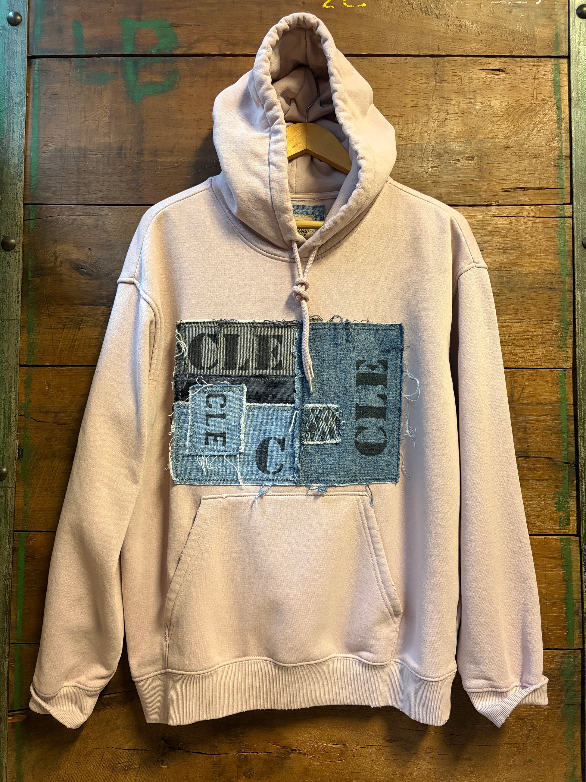 Rock a piece of Cleveland history with The Tremont; an oversized upcycled hoodie that's got serious character. A beautiful shade of muted pink tones, featuring distressed edges and a bold CLE denim patched graphic on the front, this one-of-a-kind piece blends vintage vibes with modern edge. Perfect for anyone who loves sustainable fashion with personality, this hoodie proves that the best style comes from giving old pieces new life.
