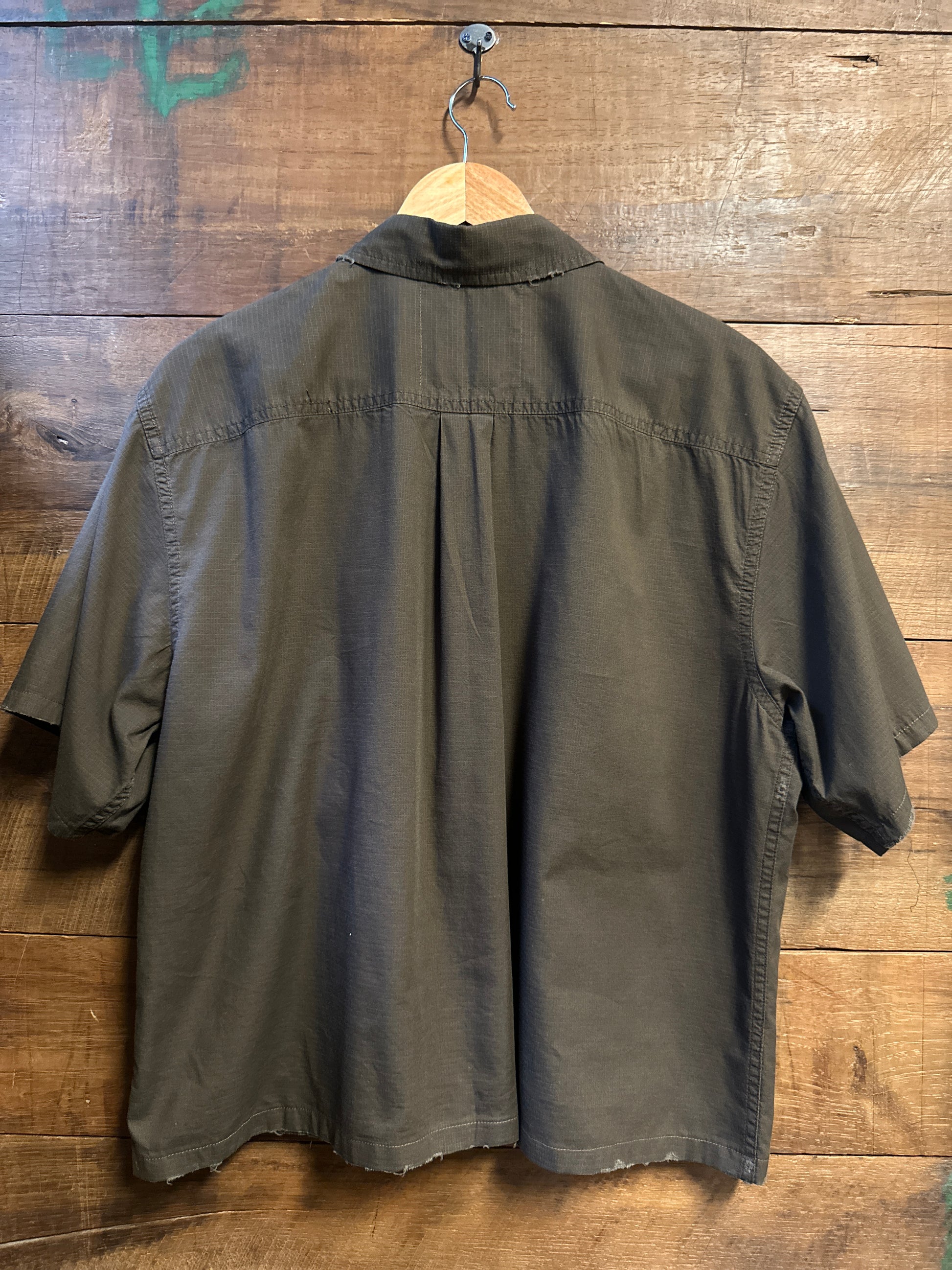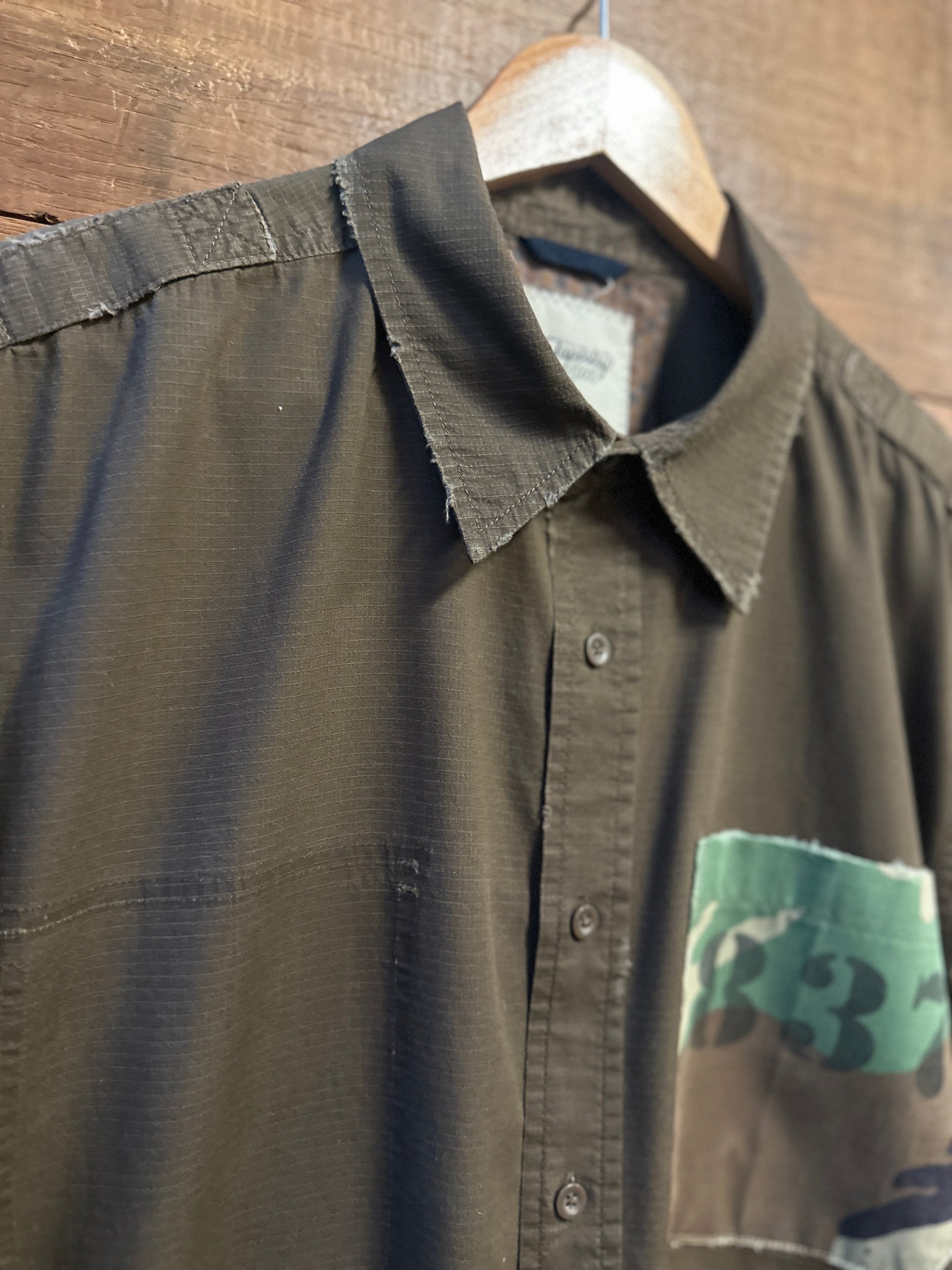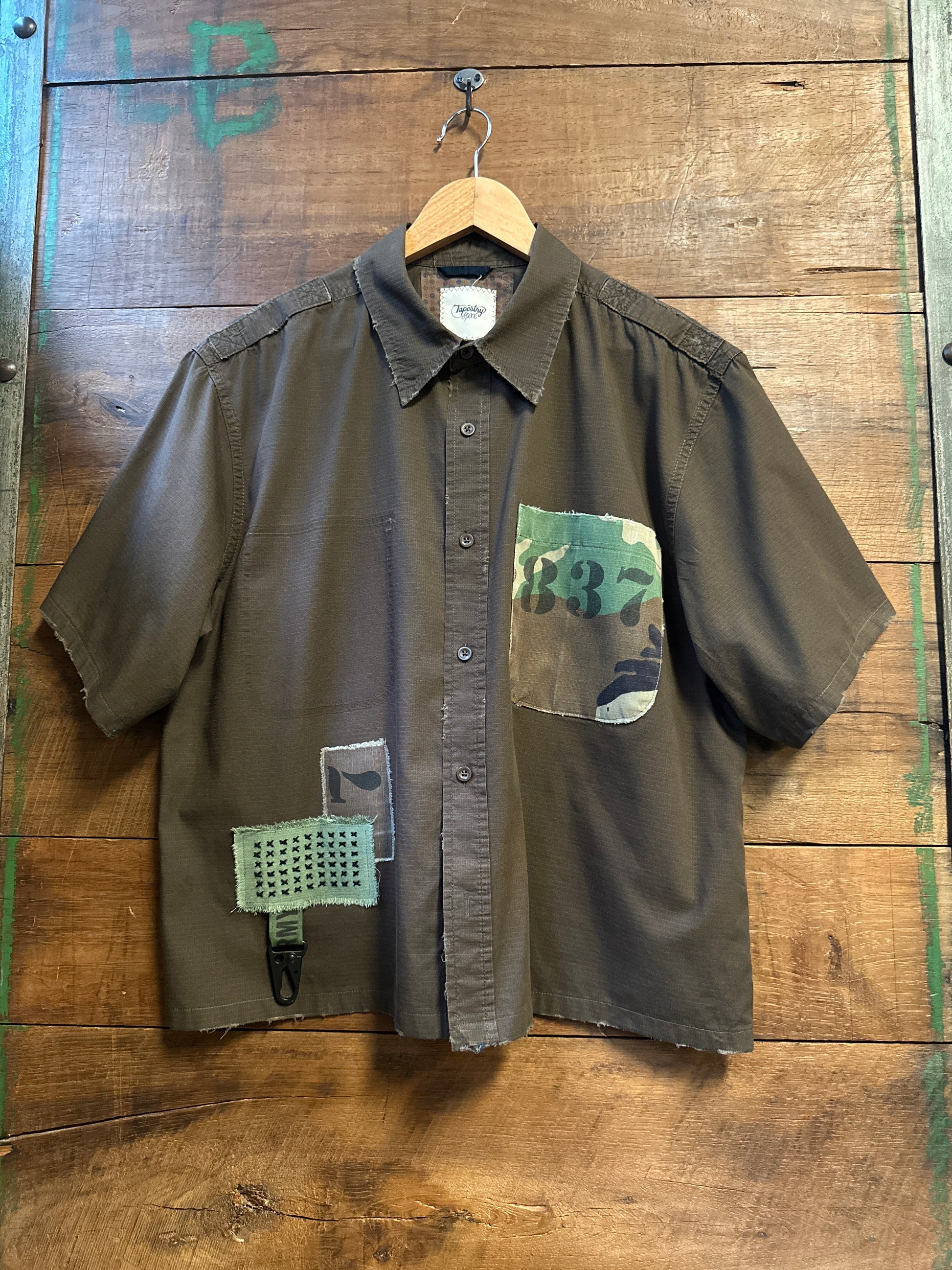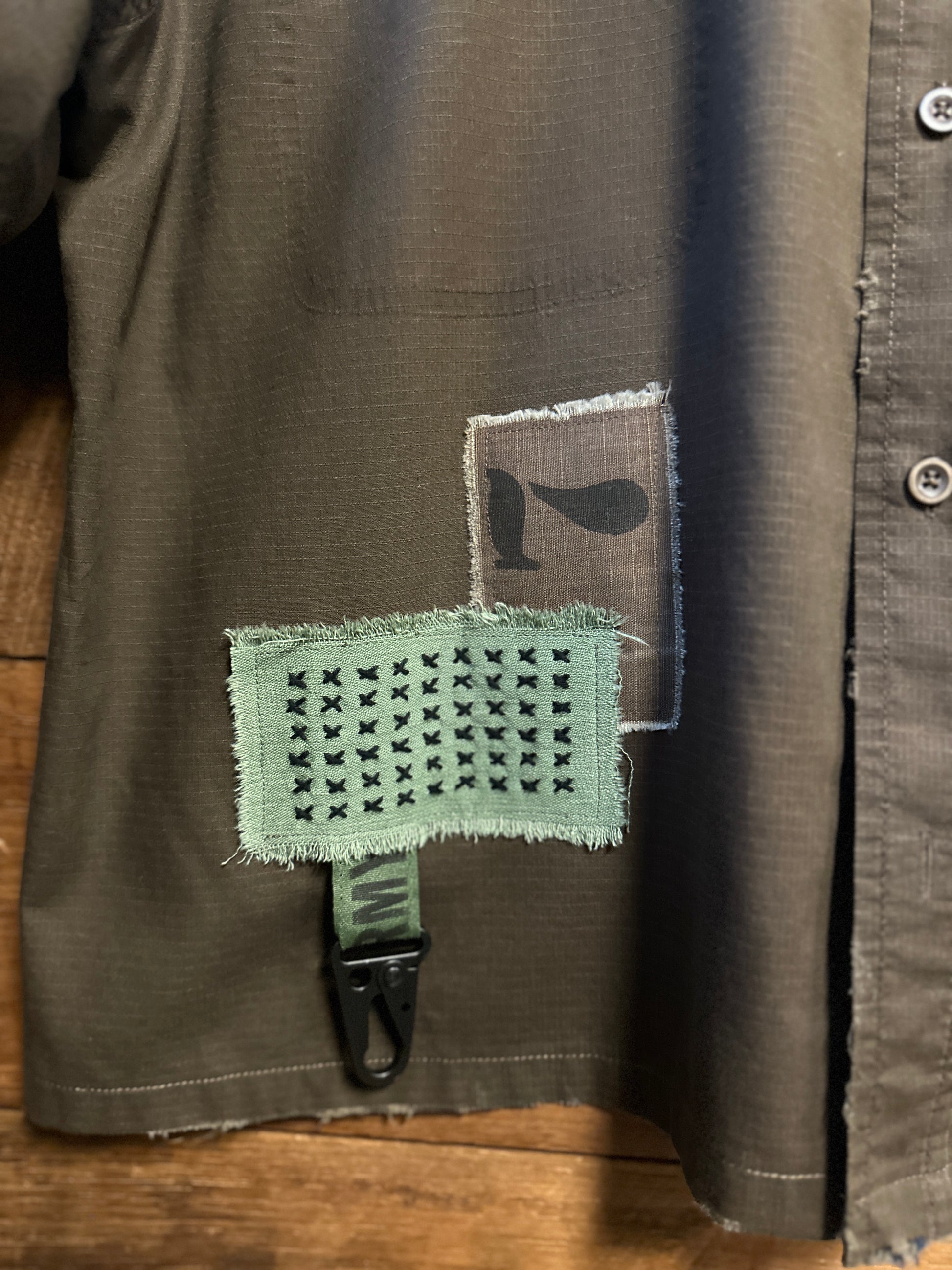 The Troop is an upcycled, lightweight woven shirt, featuring contrasting pockets and patches, painted with hand-stenciled numbers and detailed sashiko stitching. Perfect for those who love unique style with a touch of handcrafted charm.