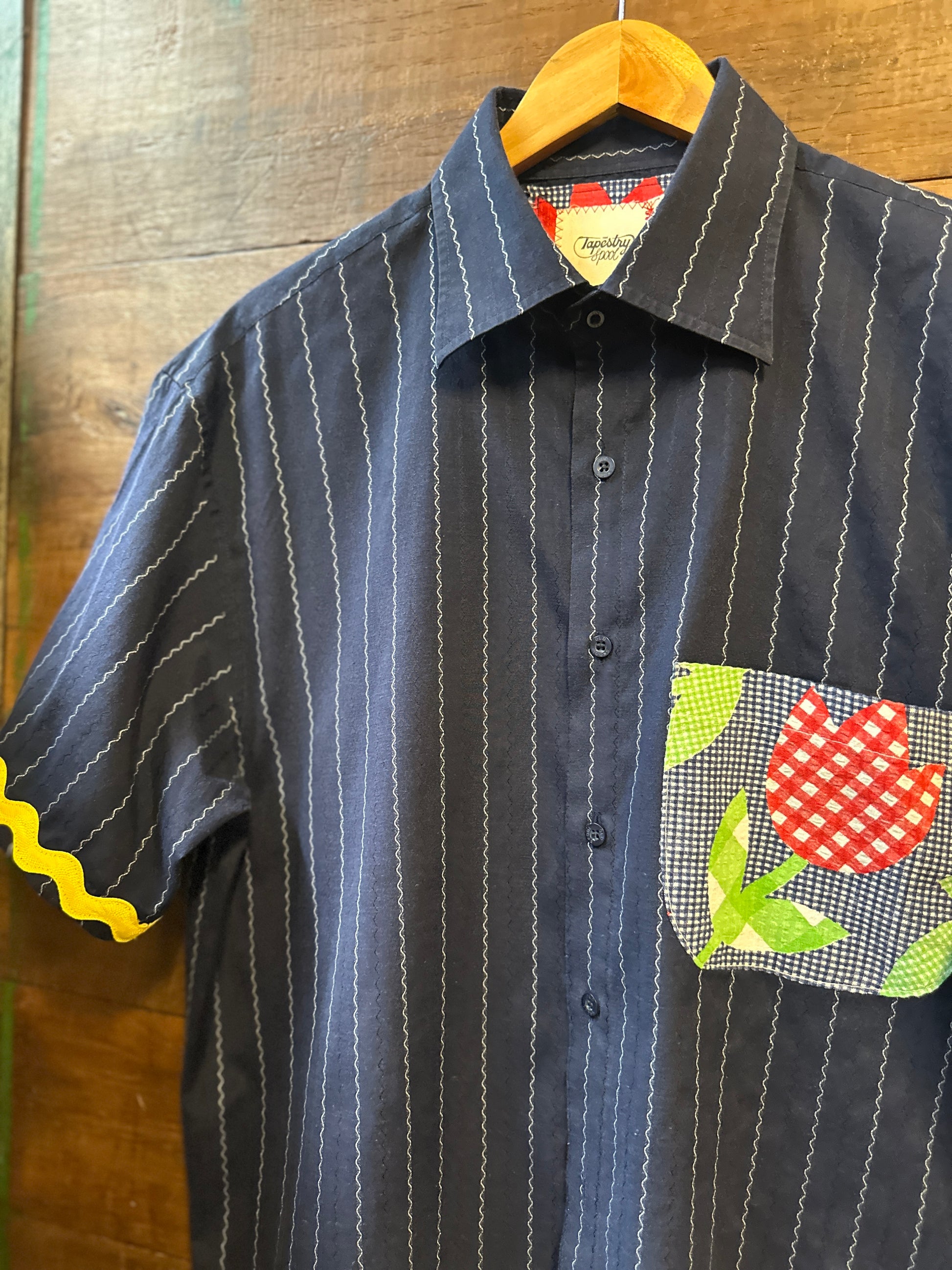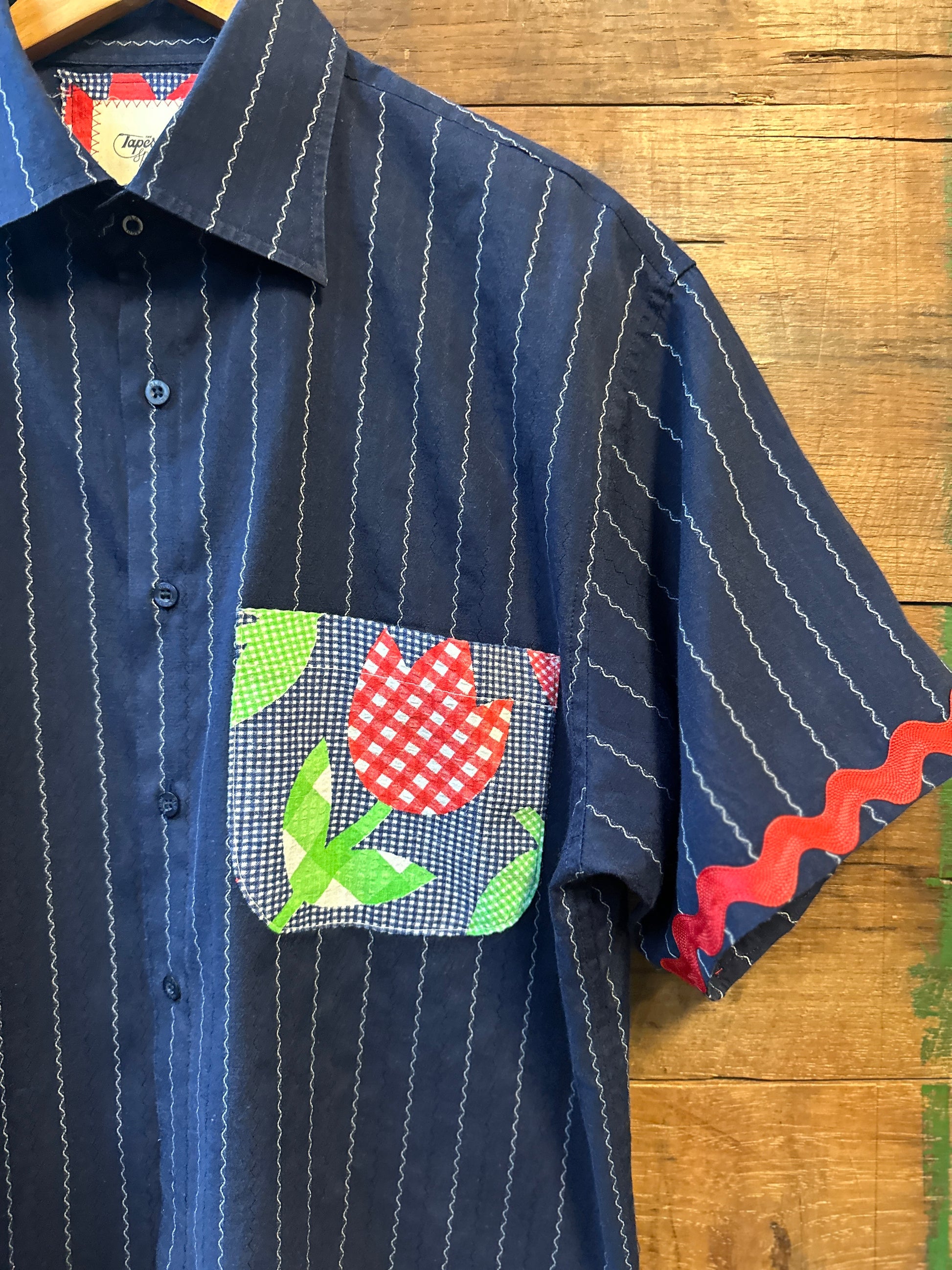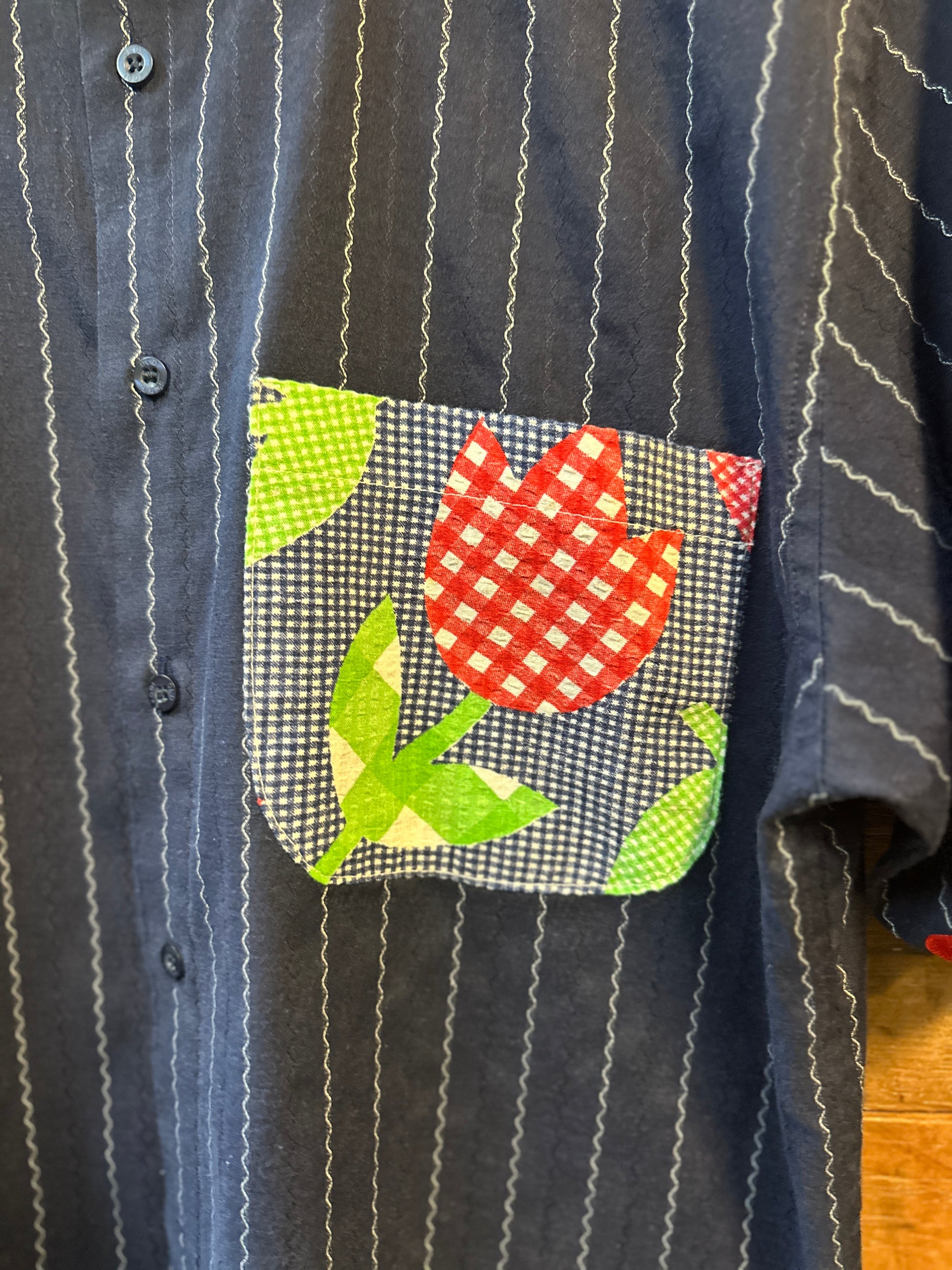 Embrace effortless style with The Tulip, an upcycled lightweight shirt that’s as unique as you are. Featuring a playful contrasting pocket with a charming tulip design, ric rac trim on the sleeves, and a fun back detail, this relaxed-fit shirt brings a fresh twist to your wardrobe. Perfect for those who love comfort with a splash of whimsy.