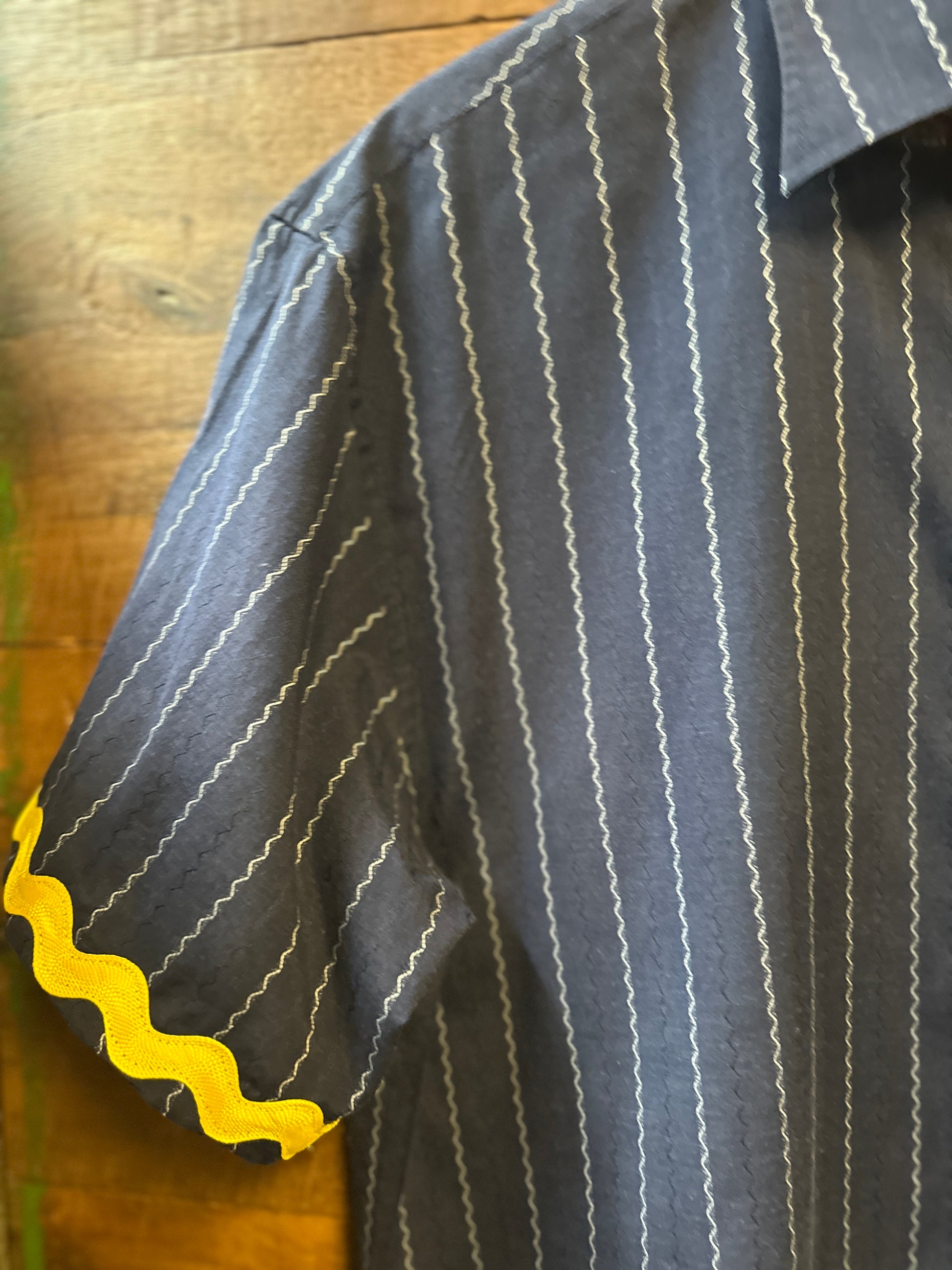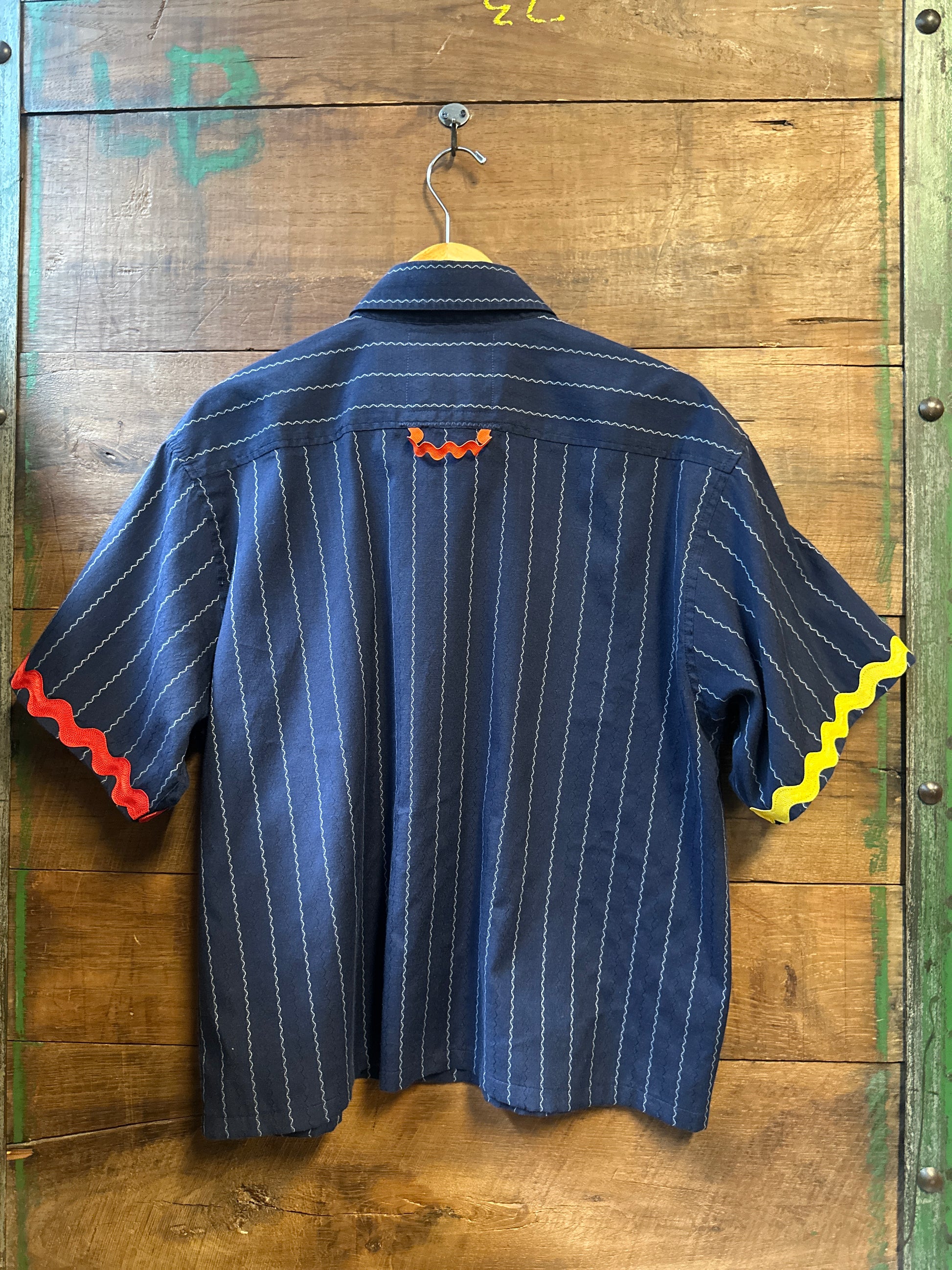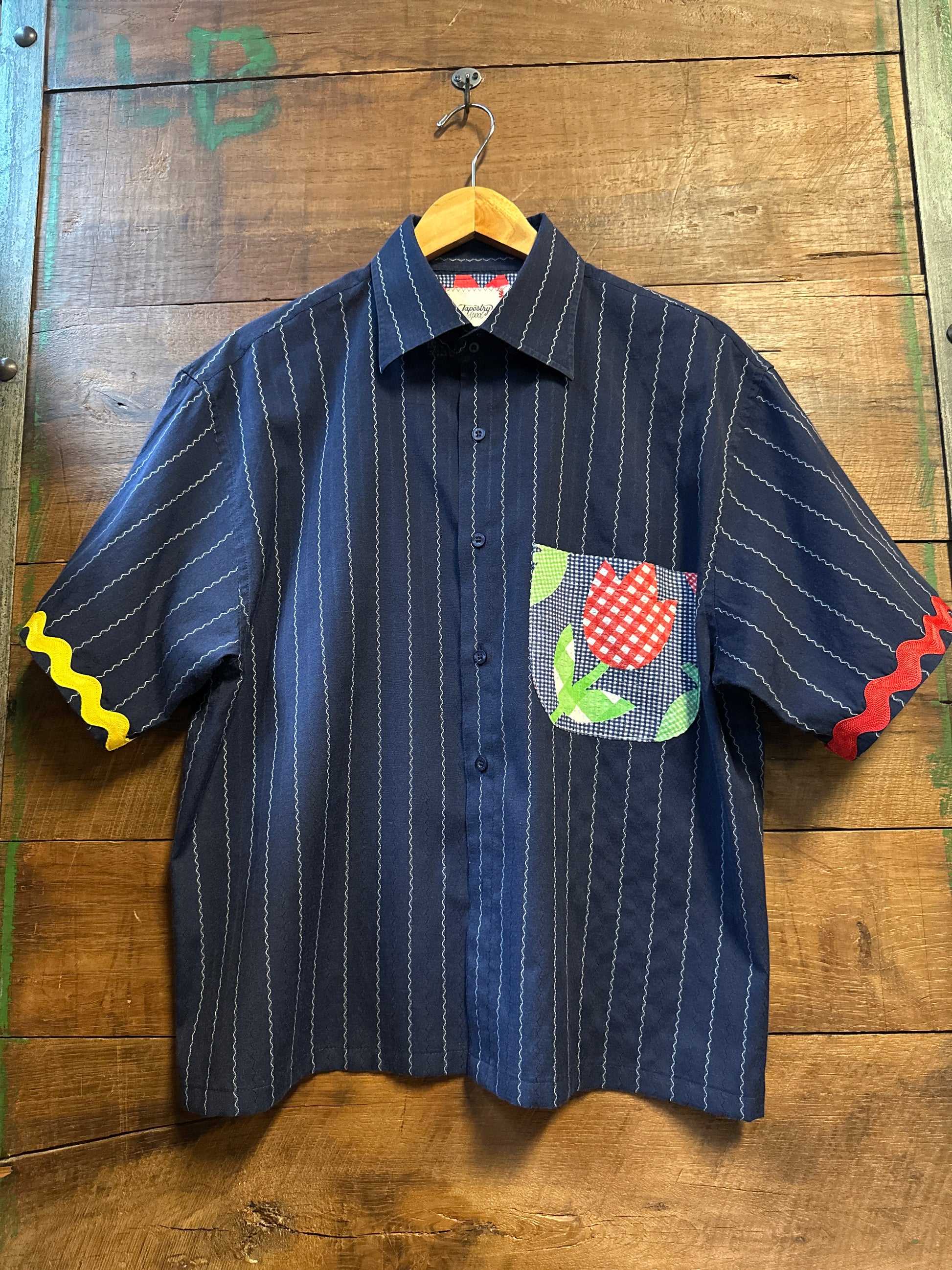 Embrace effortless style with The Tulip, an upcycled lightweight shirt that’s as unique as you are. Featuring a playful contrasting pocket with a charming tulip design, ric rac trim on the sleeves, and a fun back detail, this relaxed-fit shirt brings a fresh twist to your wardrobe. Perfect for those who love comfort with a splash of whimsy.