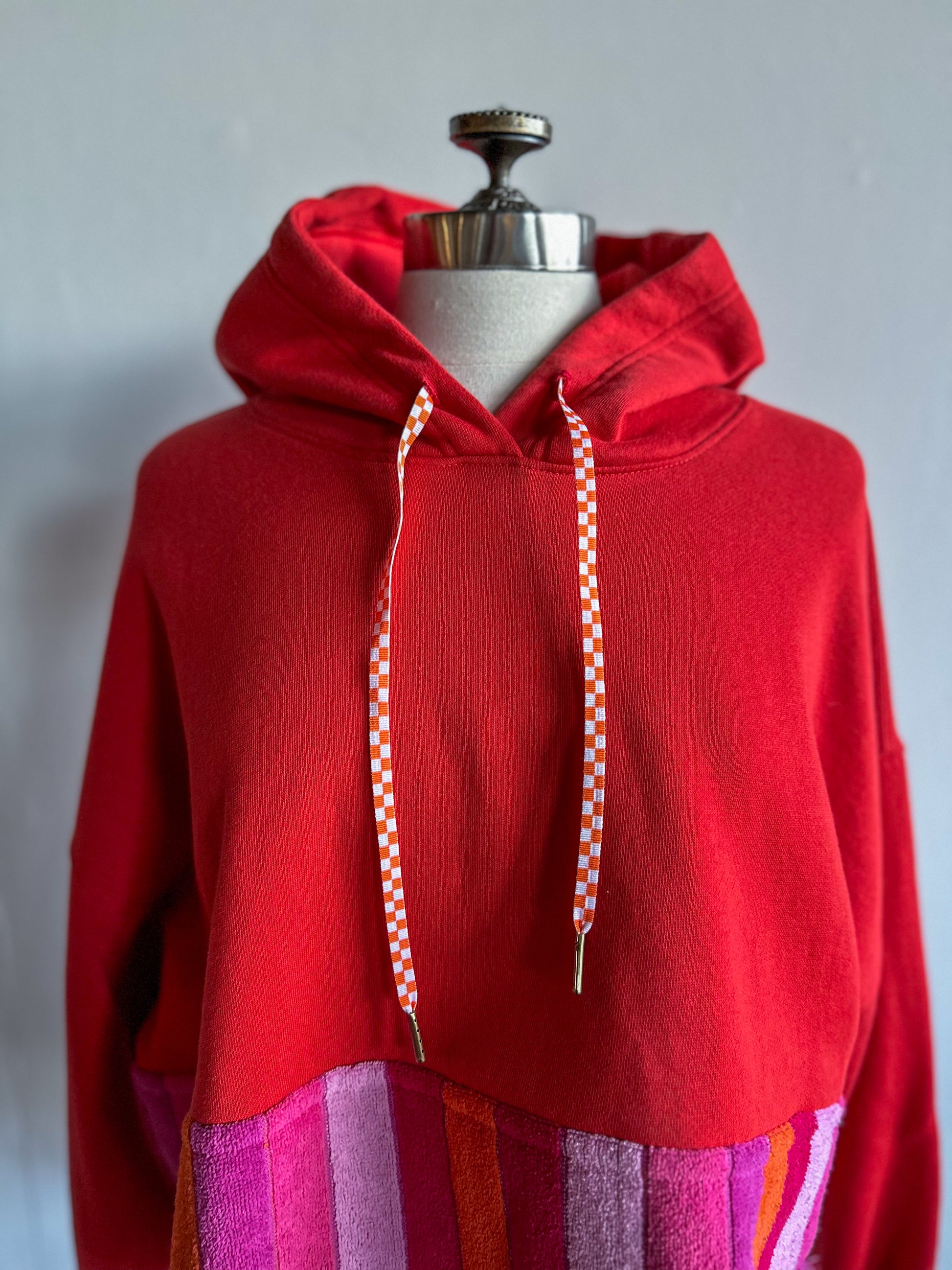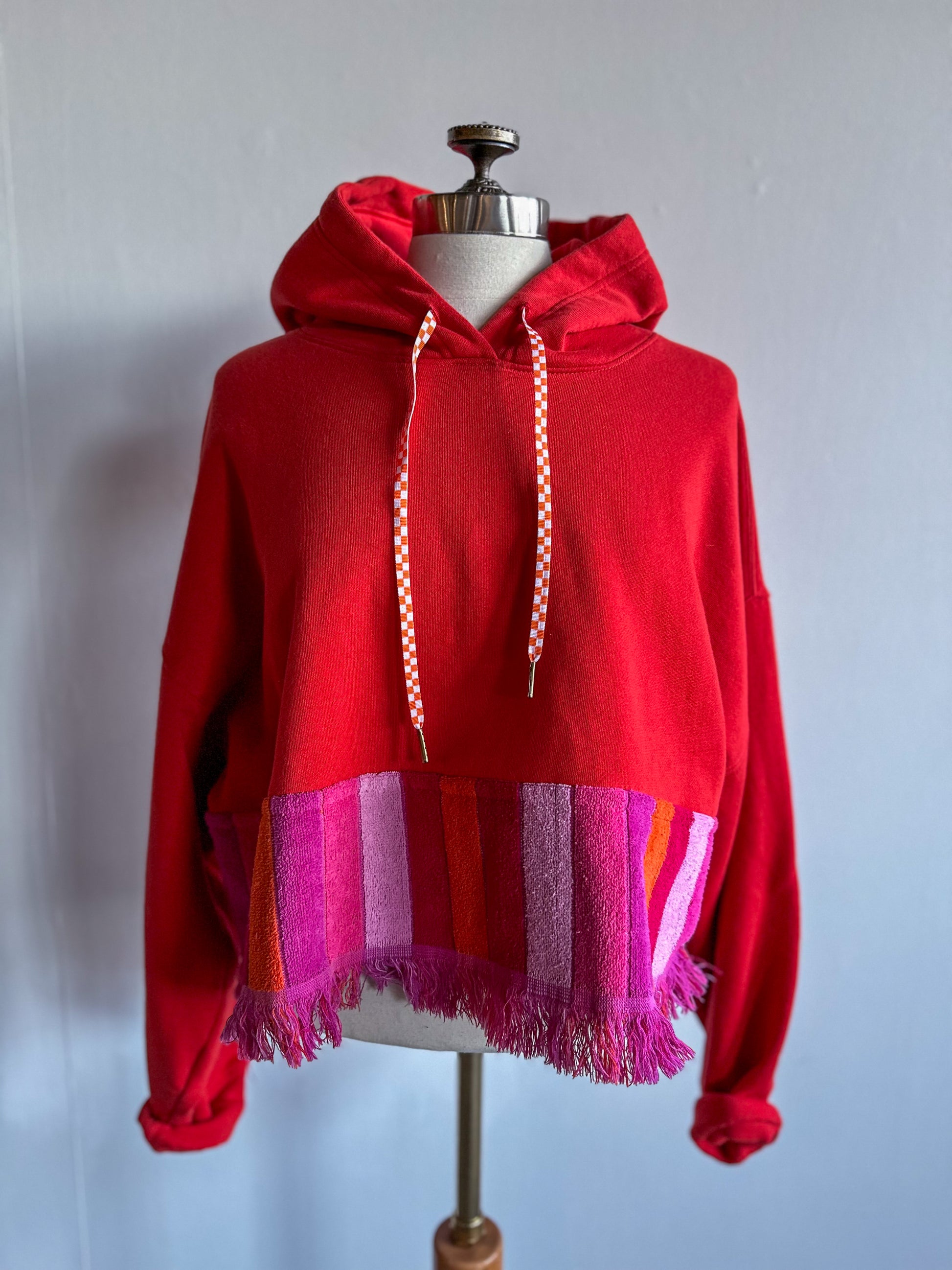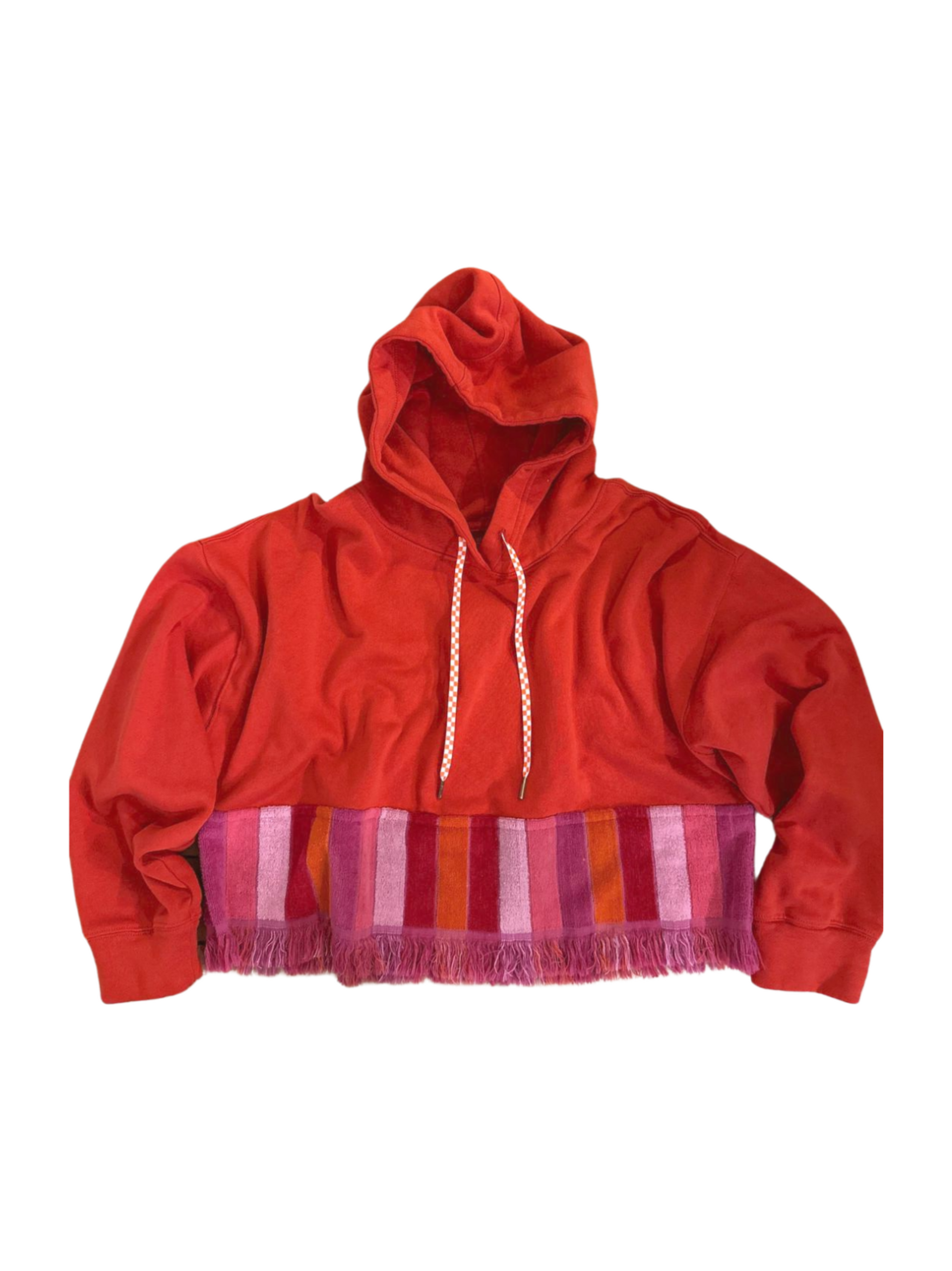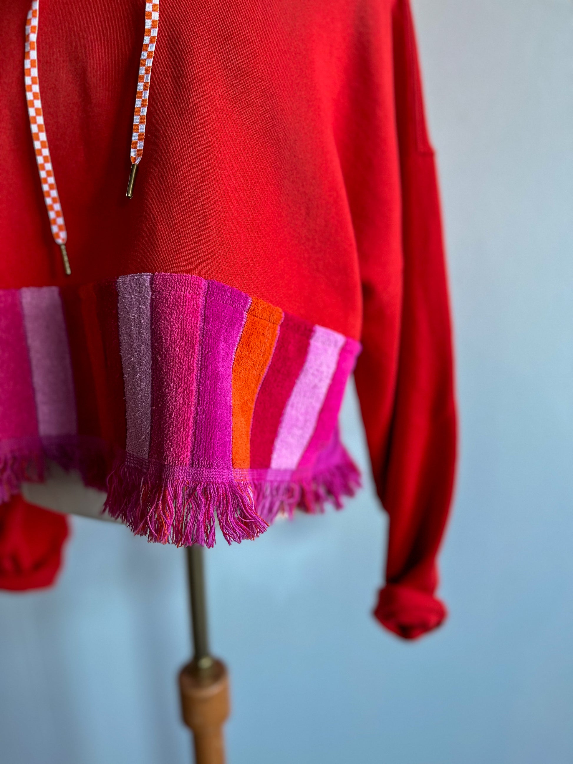 Meet The Vera, your new favorite hoodie made from upcycled materials, featuring a vintage towel in a bright color mix. Stay cozy and sustainable in style (and save your towels from landfill)!