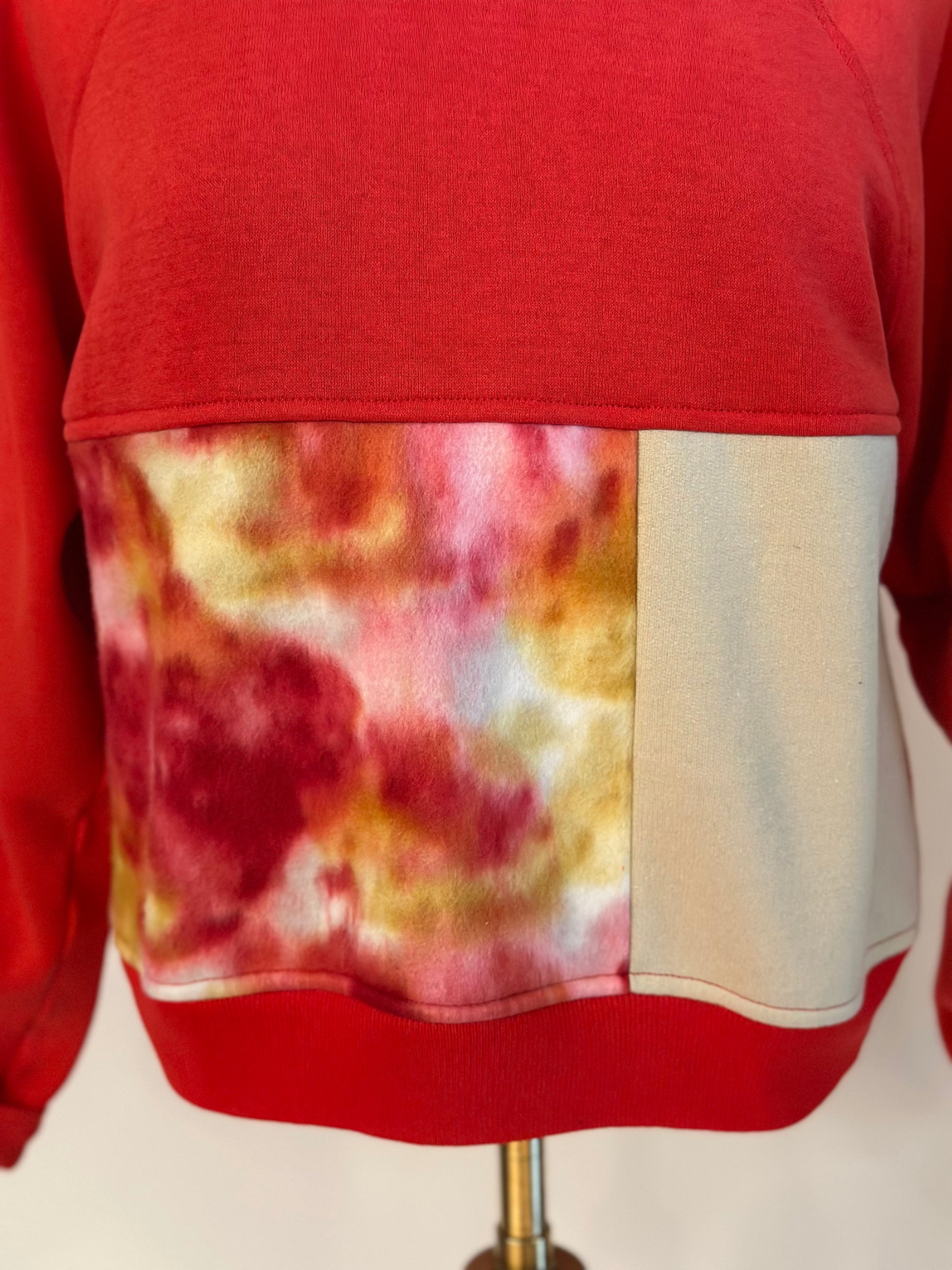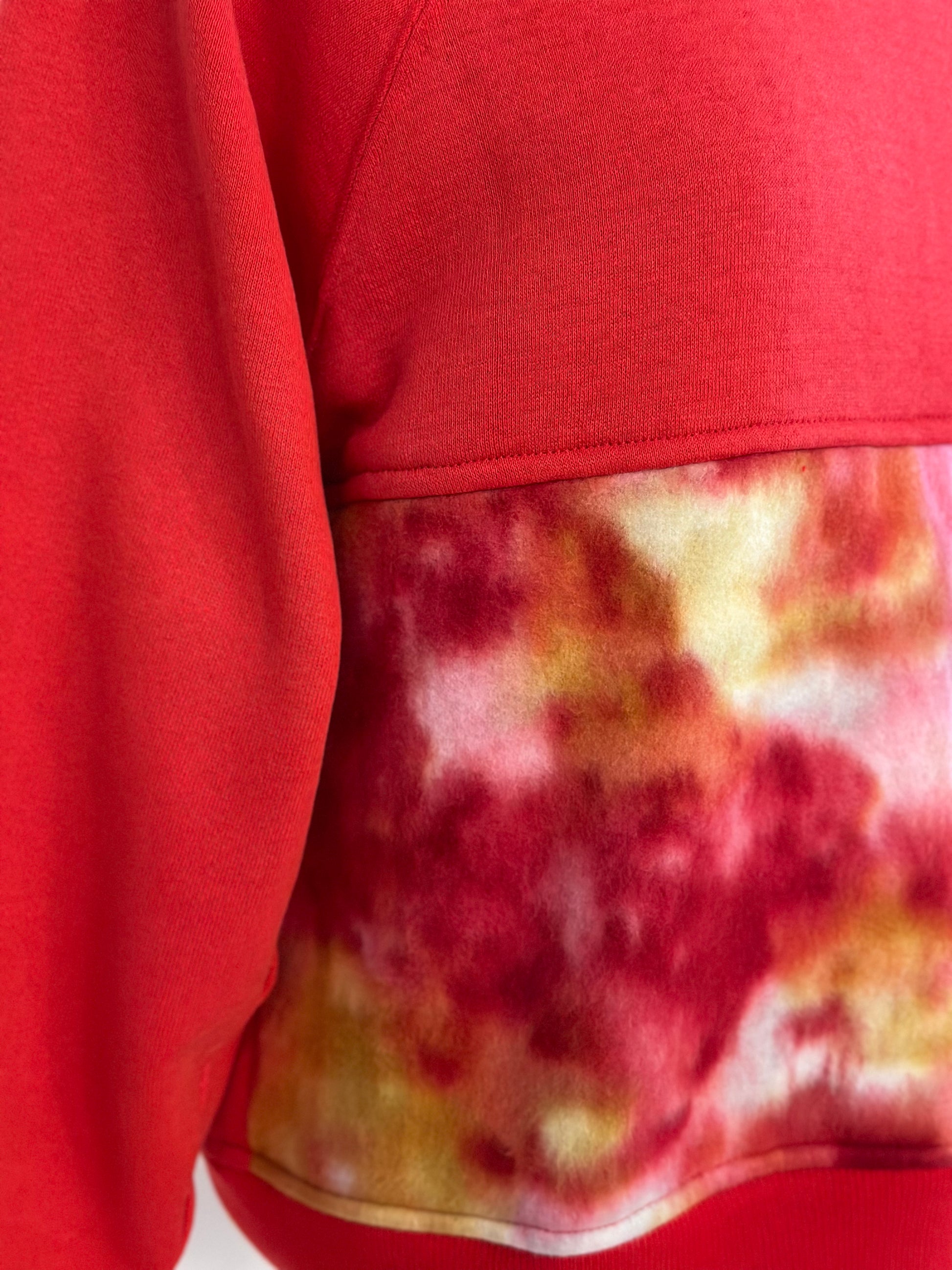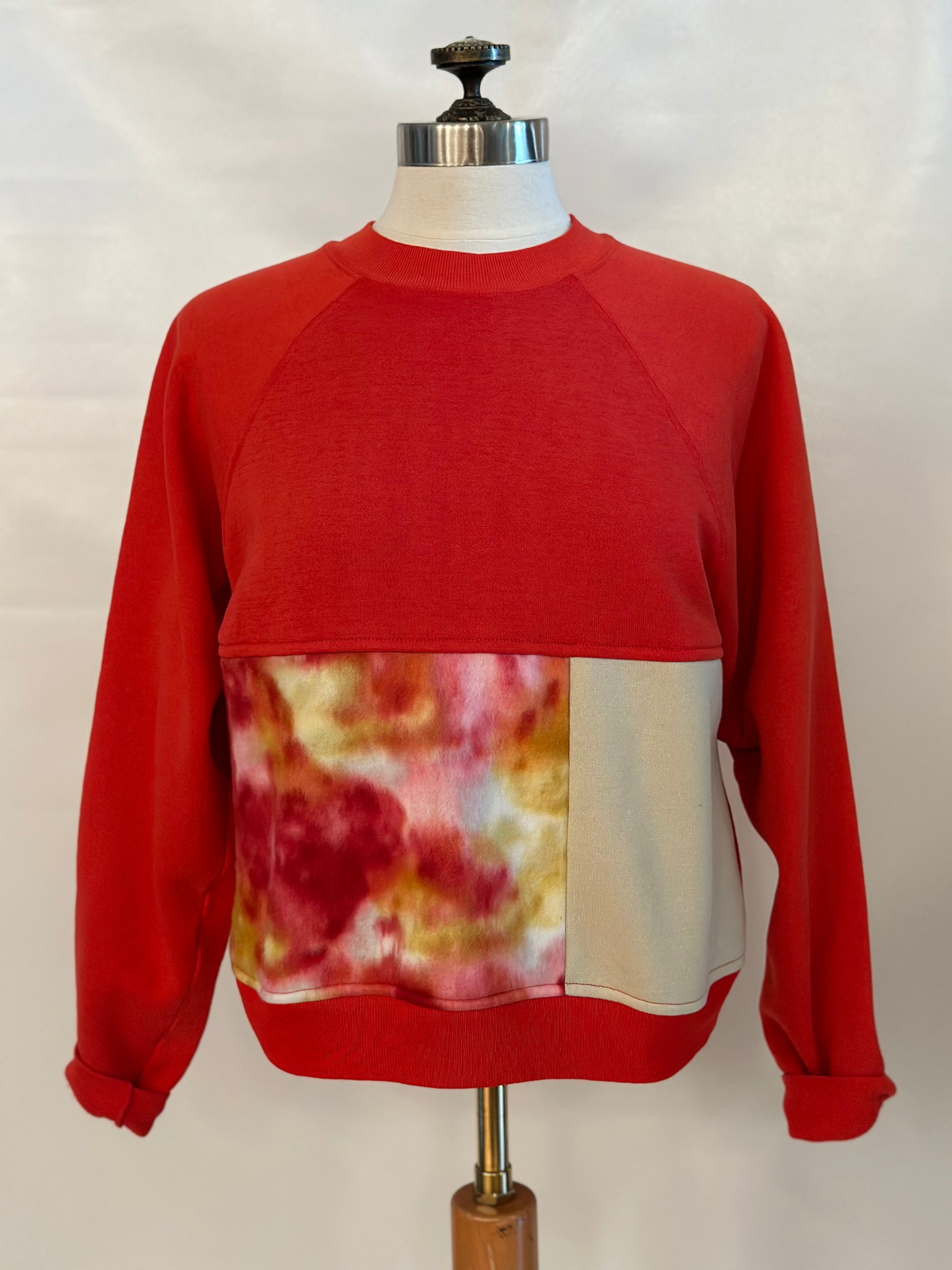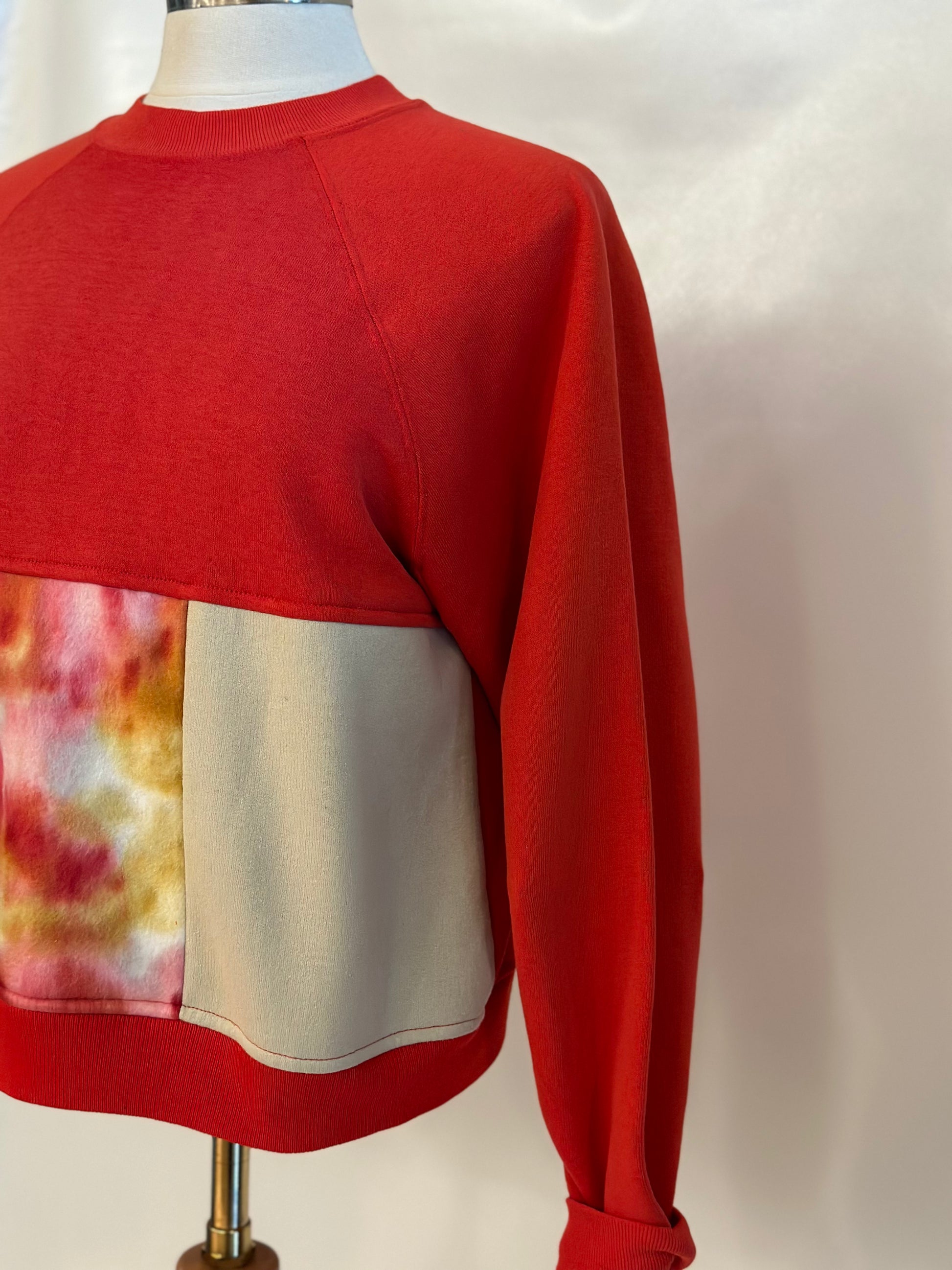 The Vermilion is the coolest crewneck sweatshirt on the block! Made from upcycled materials, this vintage sweatshirt is a super unique red/orange color featuring a cozy tie dye color block design. Express your individuality while being environmentally conscious.