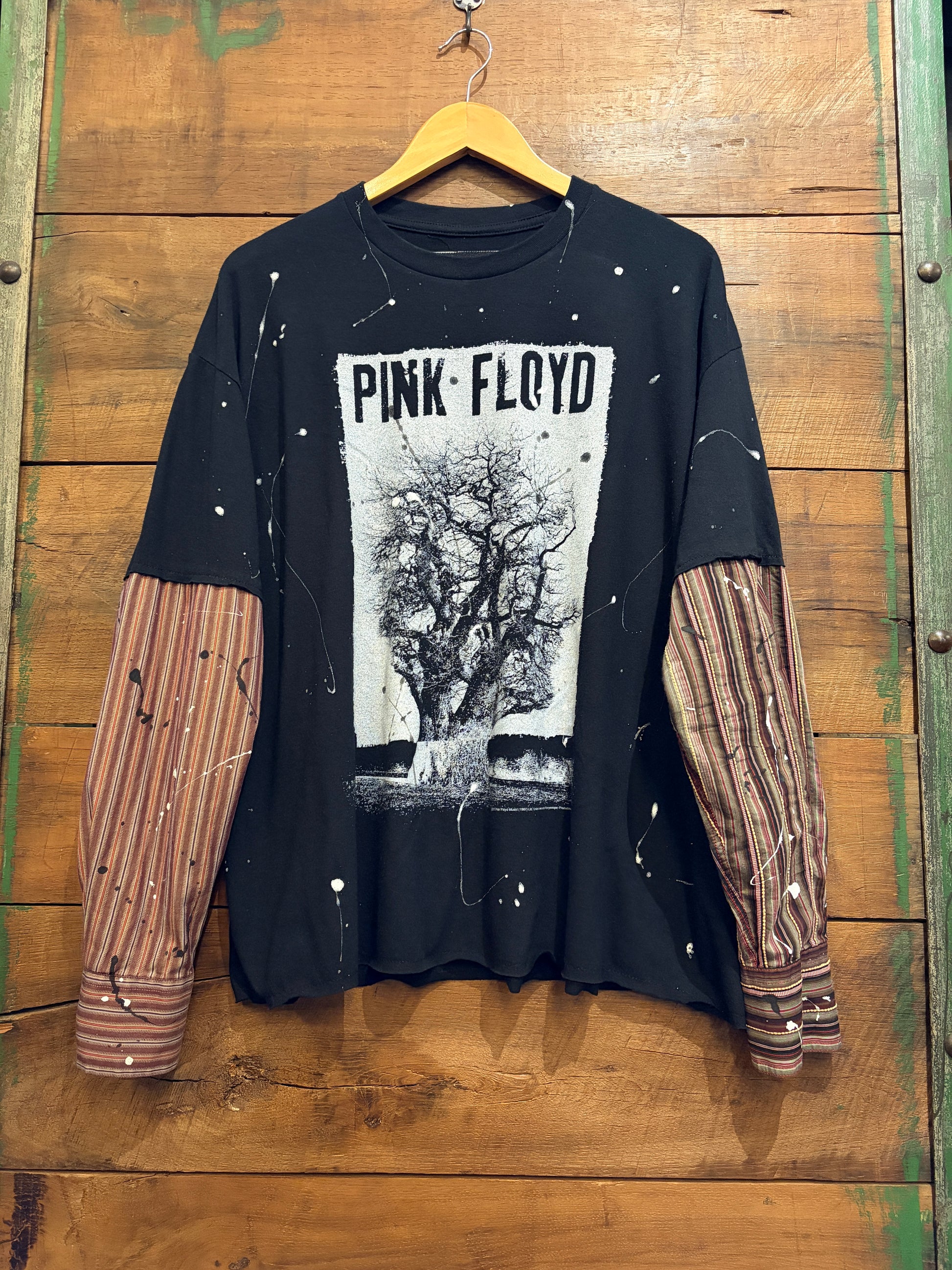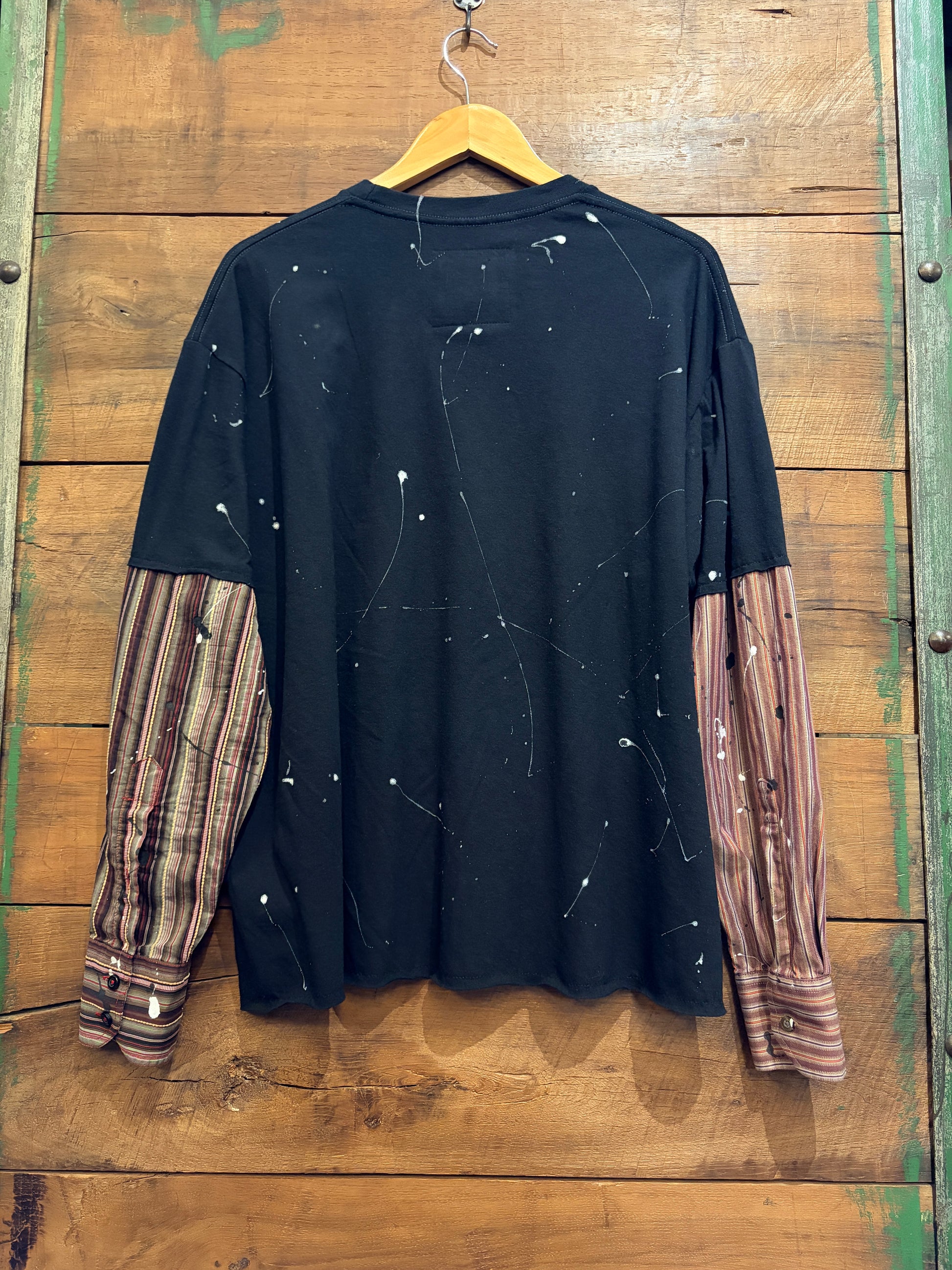 Your favorite band tee reimagined with artistic flair. This upcycled piece features bold splatter paint detailing, paired with contrasting woven sleeves that add texture and visual interest. One-of-a-kind, blending nostalgia with contemporary craftsmanship. Perfect for music lovers and sustainable fashion enthusiasts who appreciate statement pieces with character.