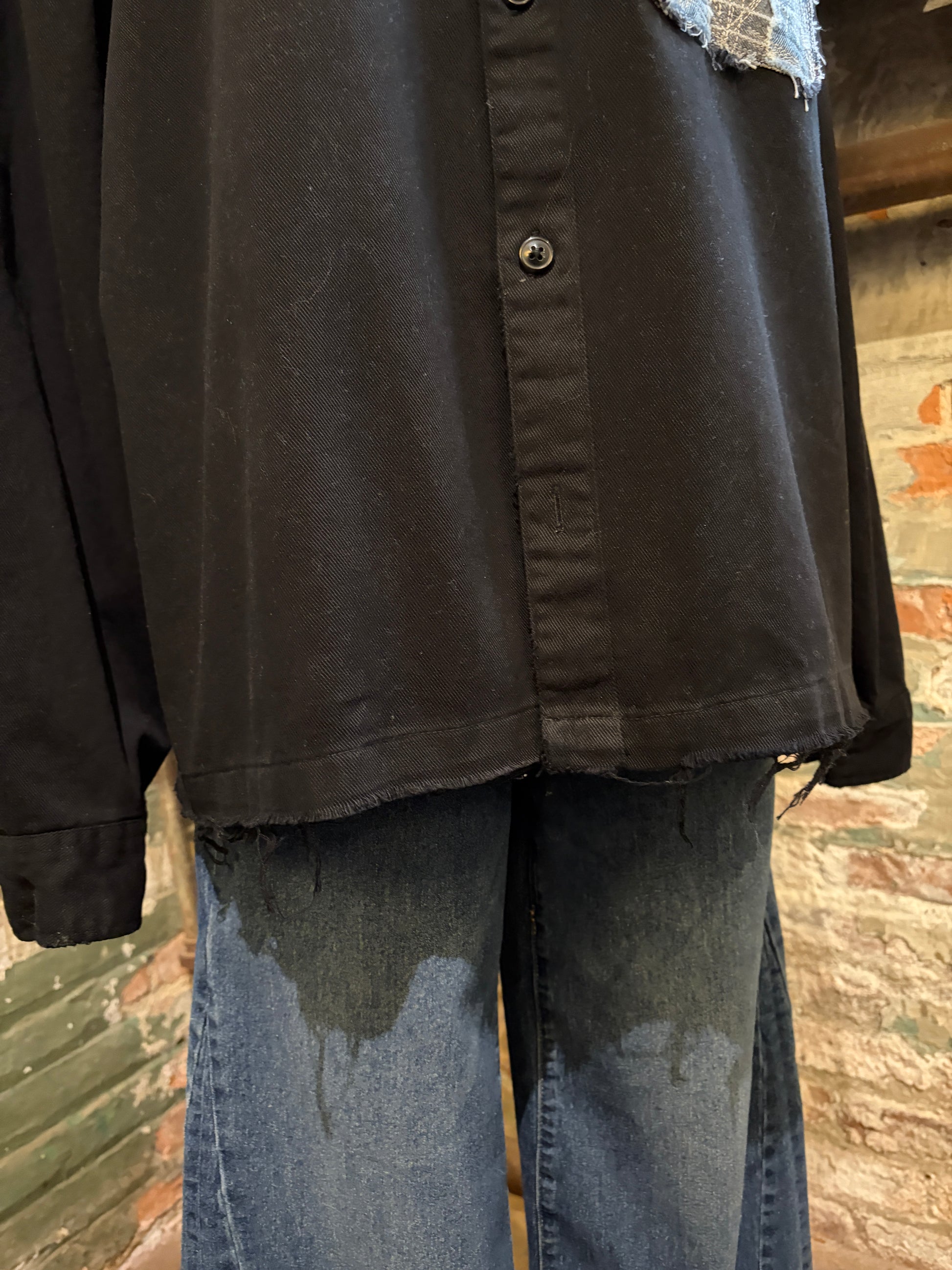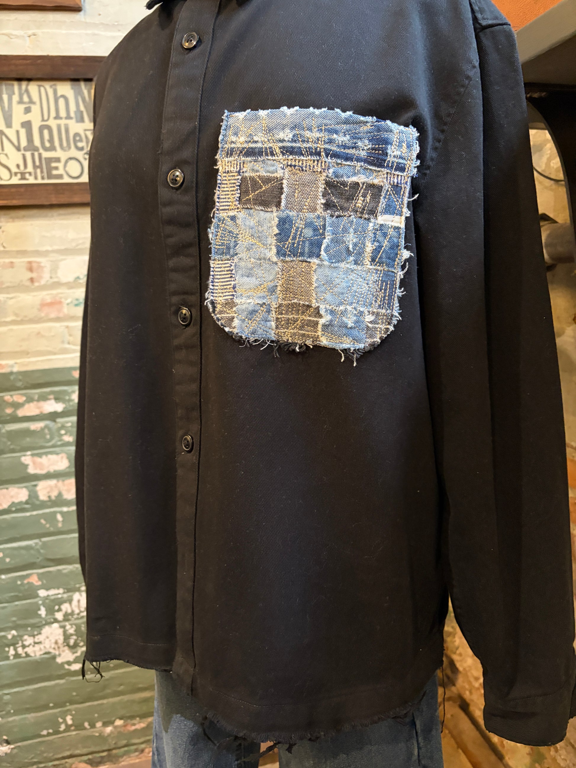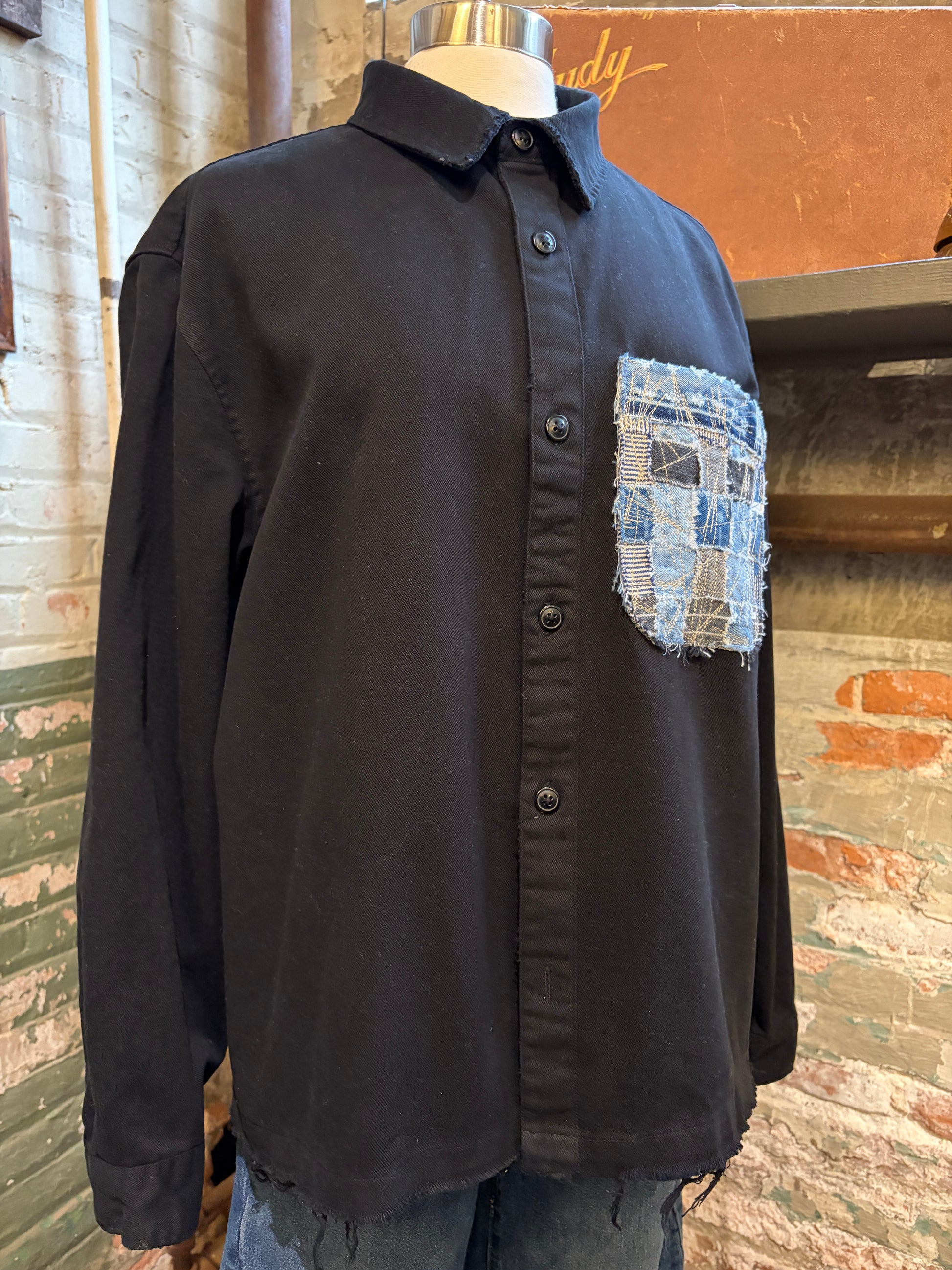 Meet The Weaver, a one-of-a-kind heavyweight woven shirt that celebrates imperfection. Crafted from upcycled materials with intentional distressing and raw hemlines, this oversized beauty features a standout front pocket pieced together from denim scraps in a patchwork weave. It's the kind of piece that tells a story with every thread, perfect for anyone who'd rather wear art than follow trends. Sustainably made, endlessly cool.