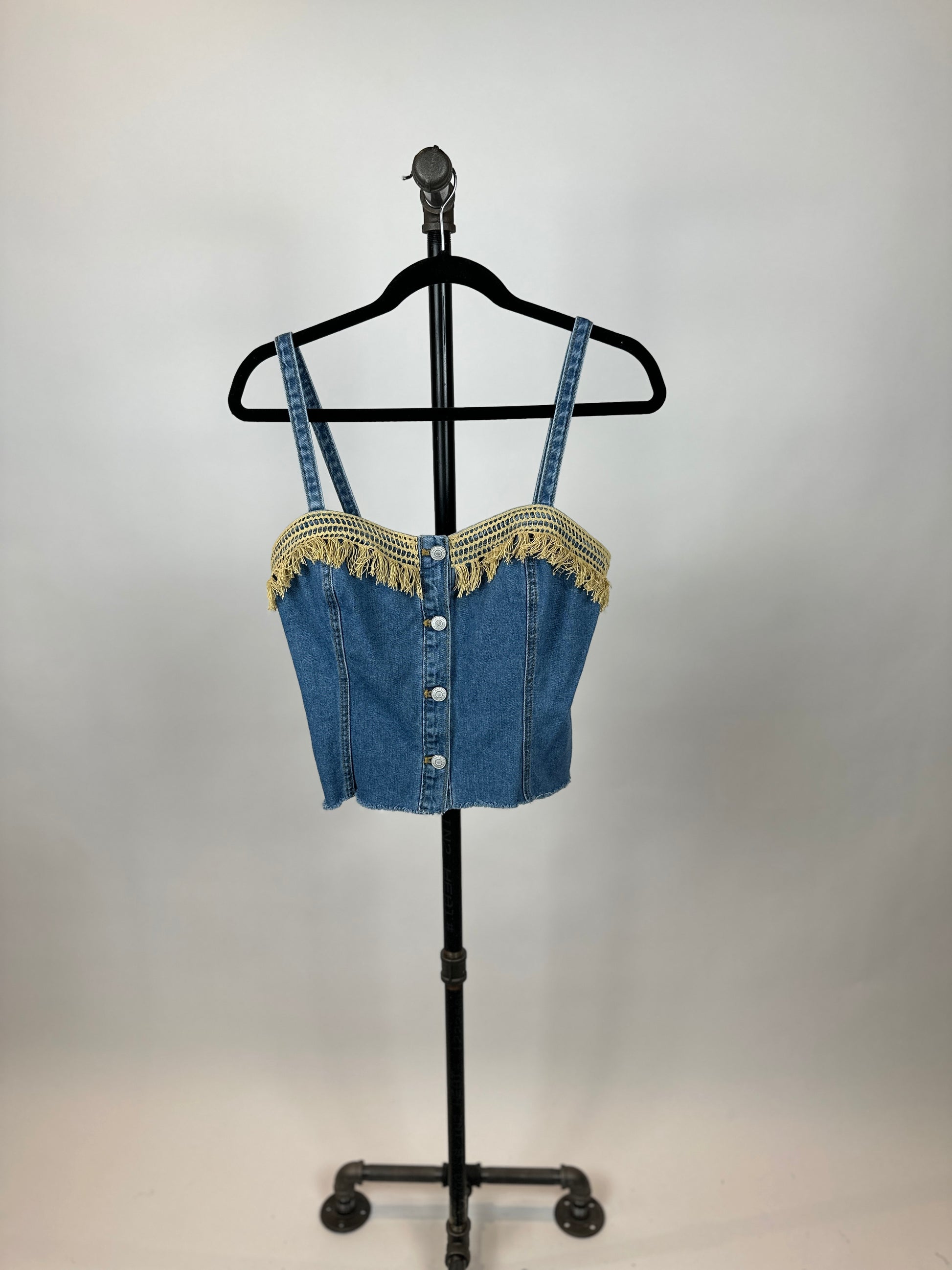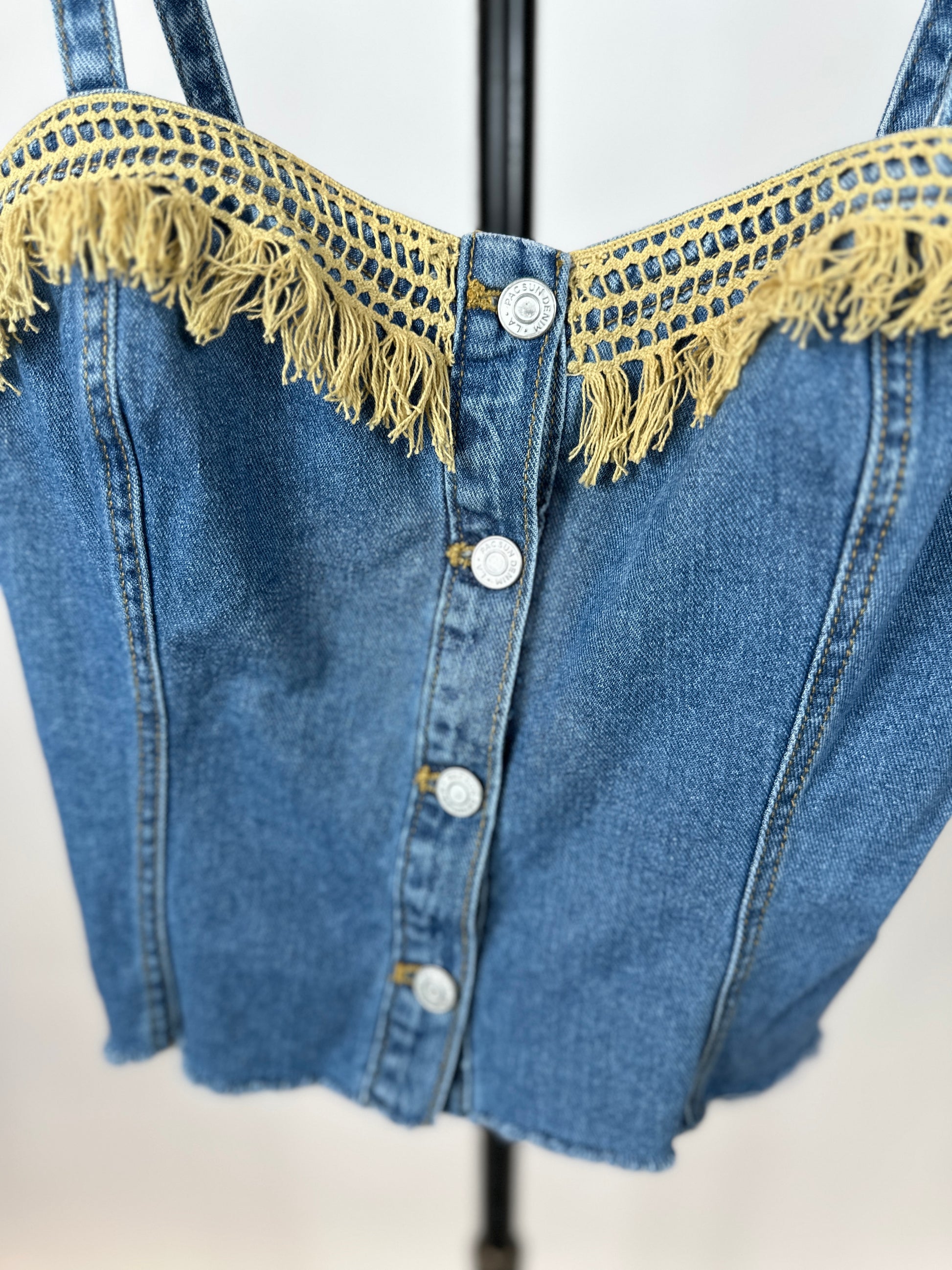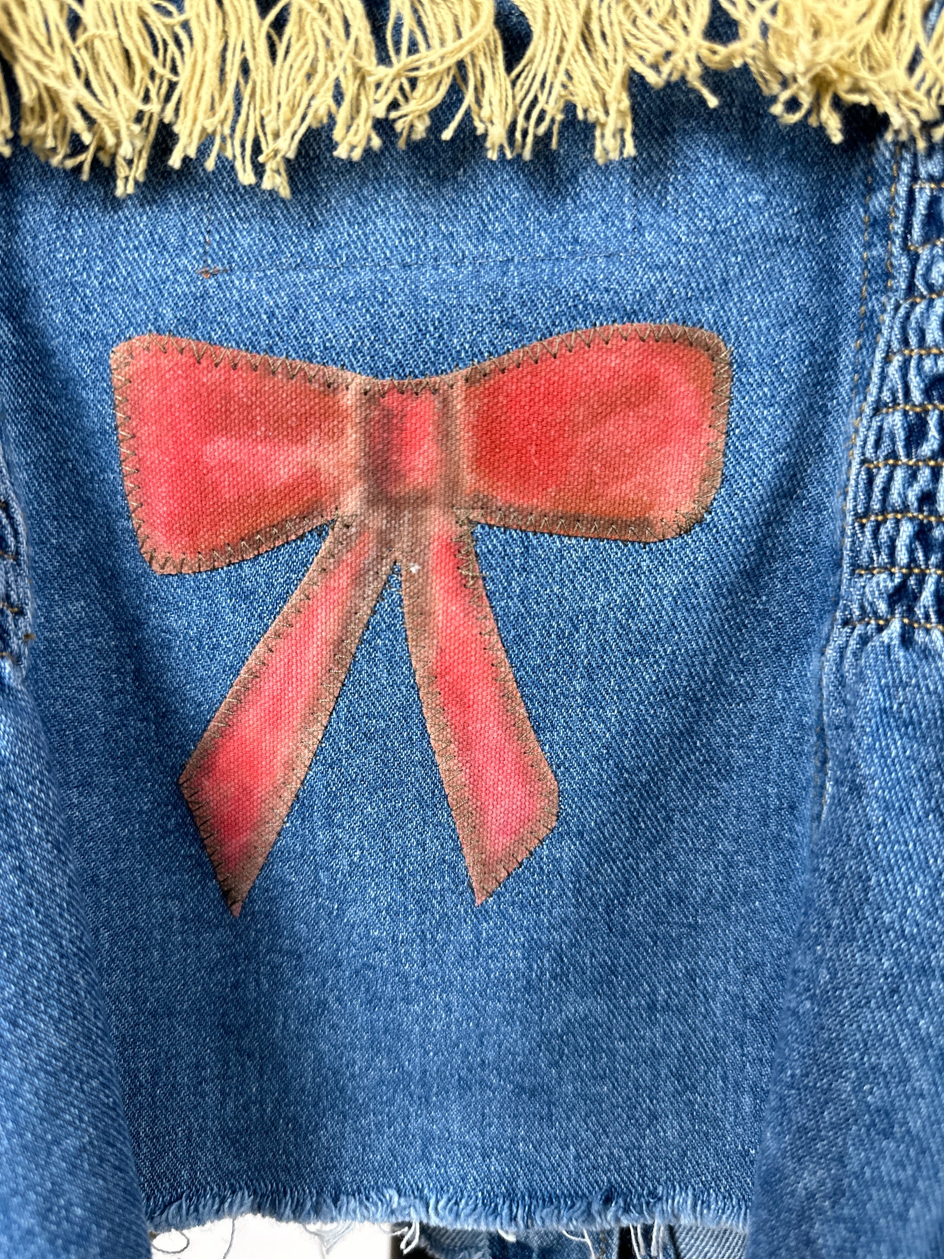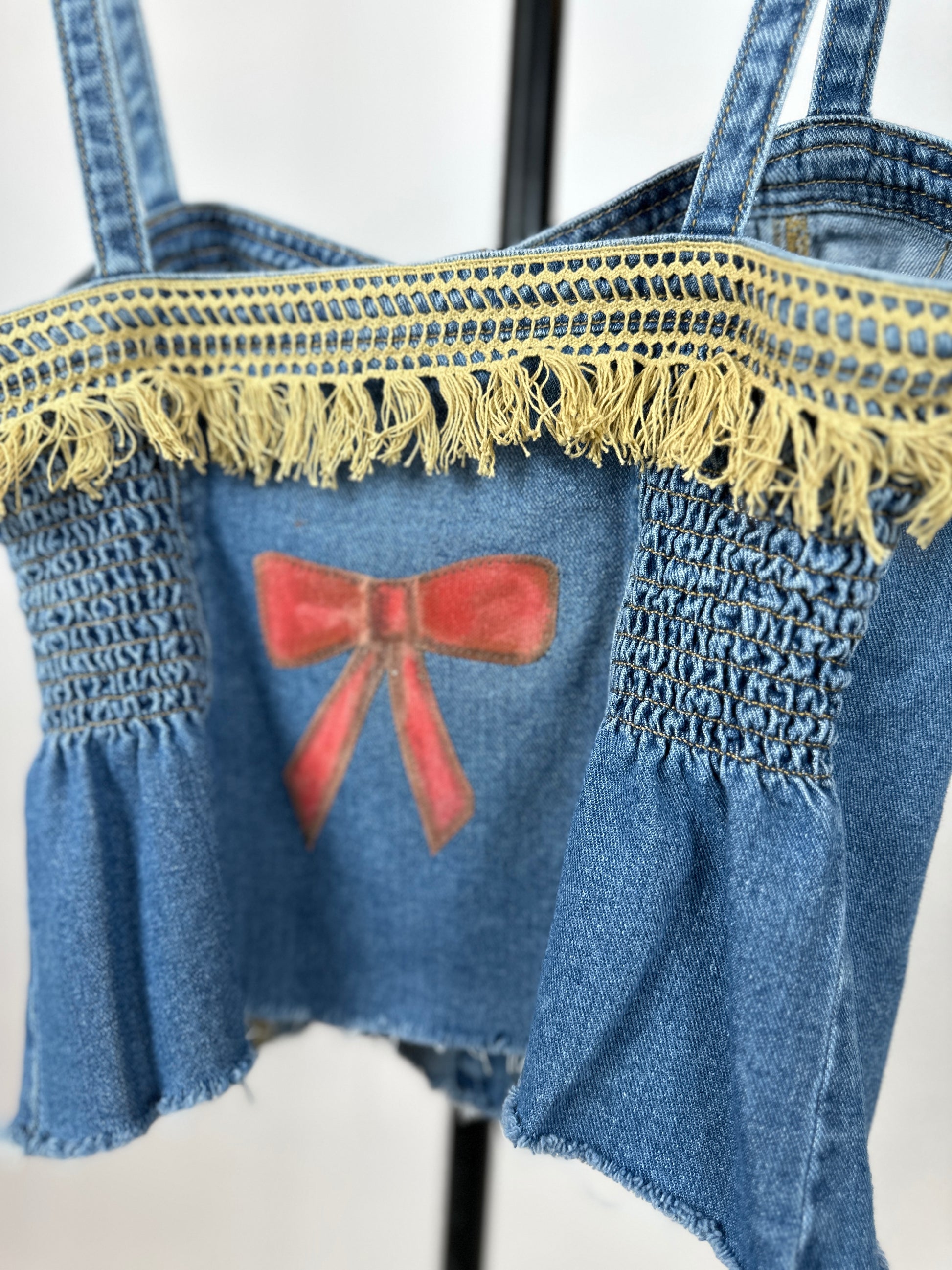 The Willa is more than just a halter top - it's a statement piece! Made from upcycled denim, it features a playful button front, elastic in the back for a perfect fit, and fringed trim. And don't forget the hand-painted bow applique on the back - a unique touch that's sure to turn heads. Upgrade your wardrobe with The Willa today!