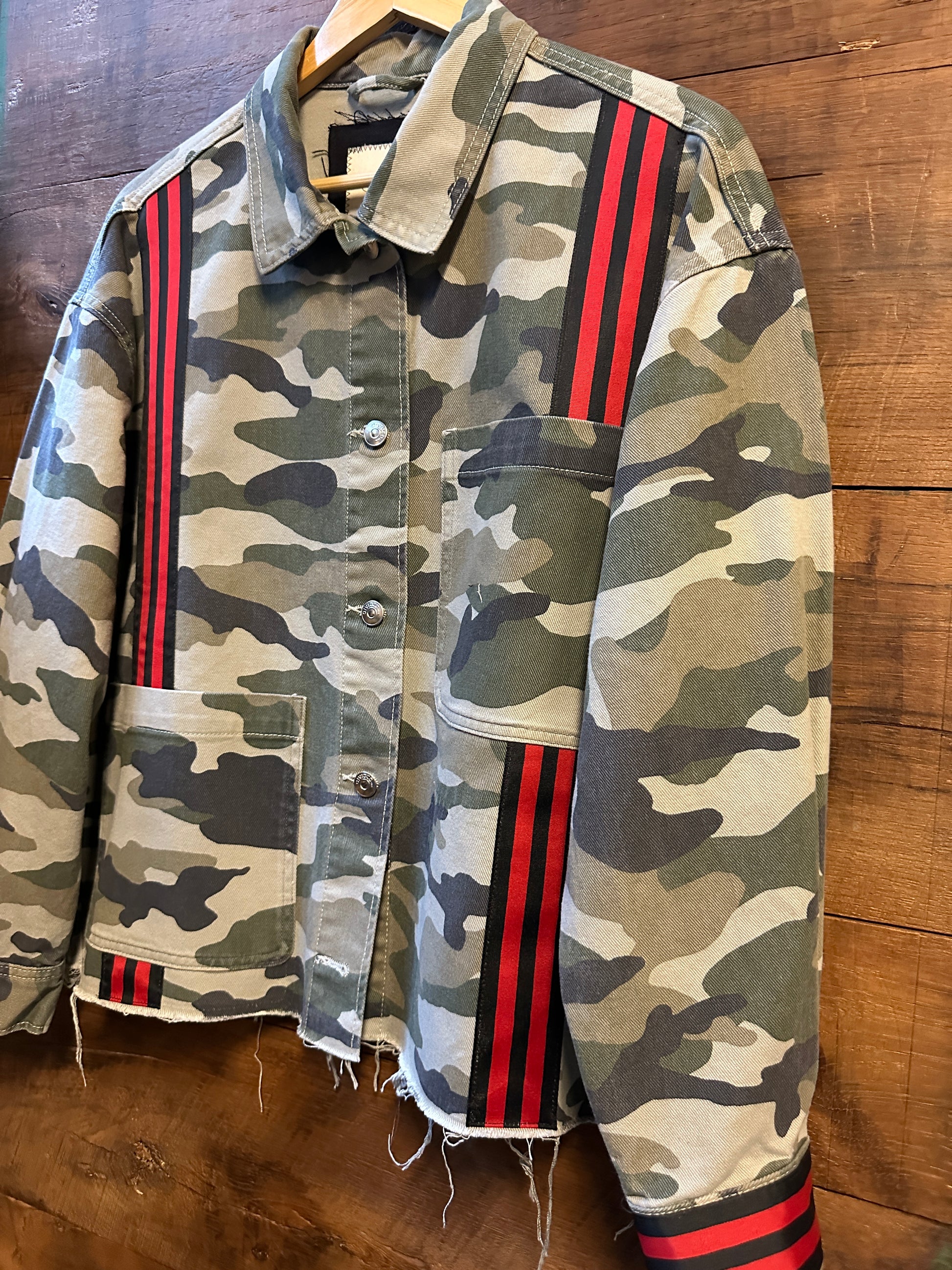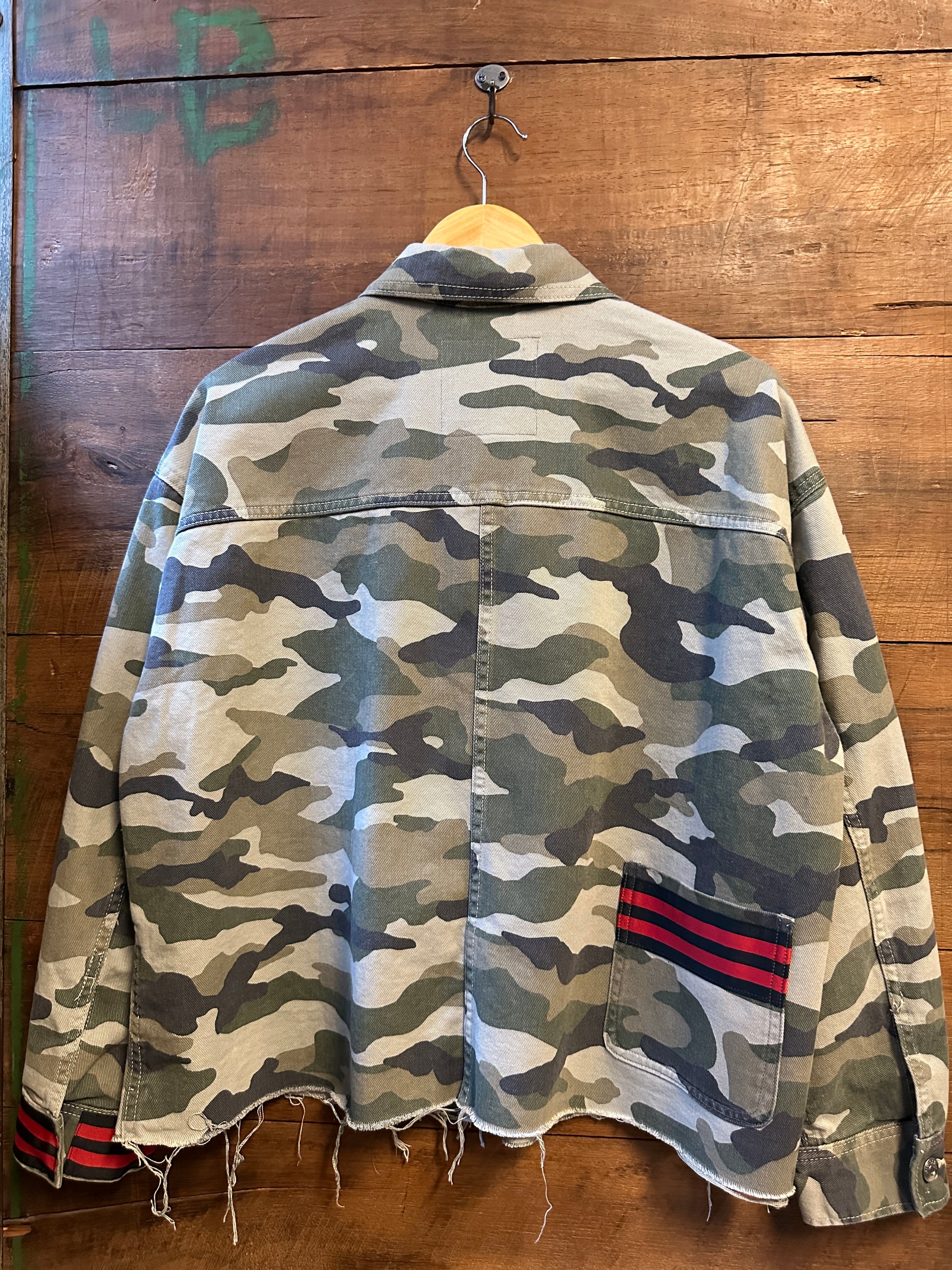 The Winslow jacket brings carefree style to your wardrobe with its relaxed fit and upcycled twill camo fabric. Playful contrasting wide stripes on the front and wrists add a bold twist, while a clever pocket detail on the back keeps things interesting. Perfect for those who love unique, eye-catching layers that don’t take themselves too seriously.