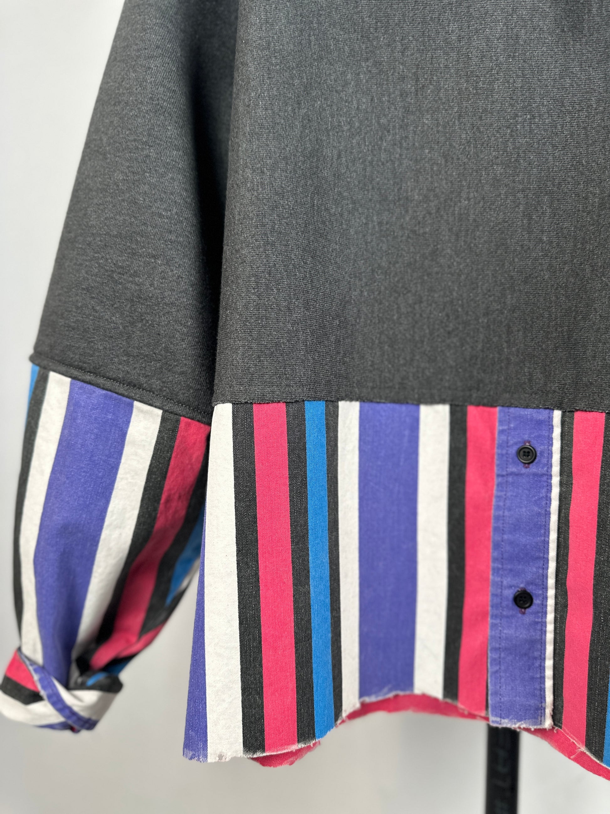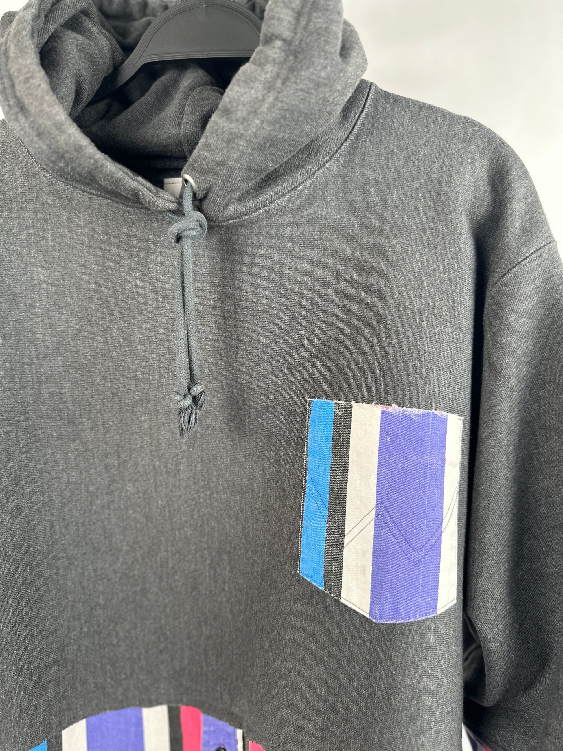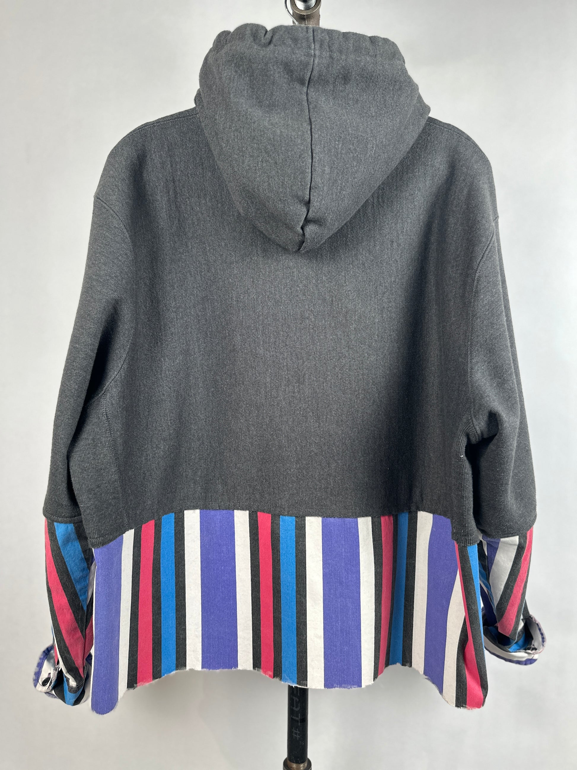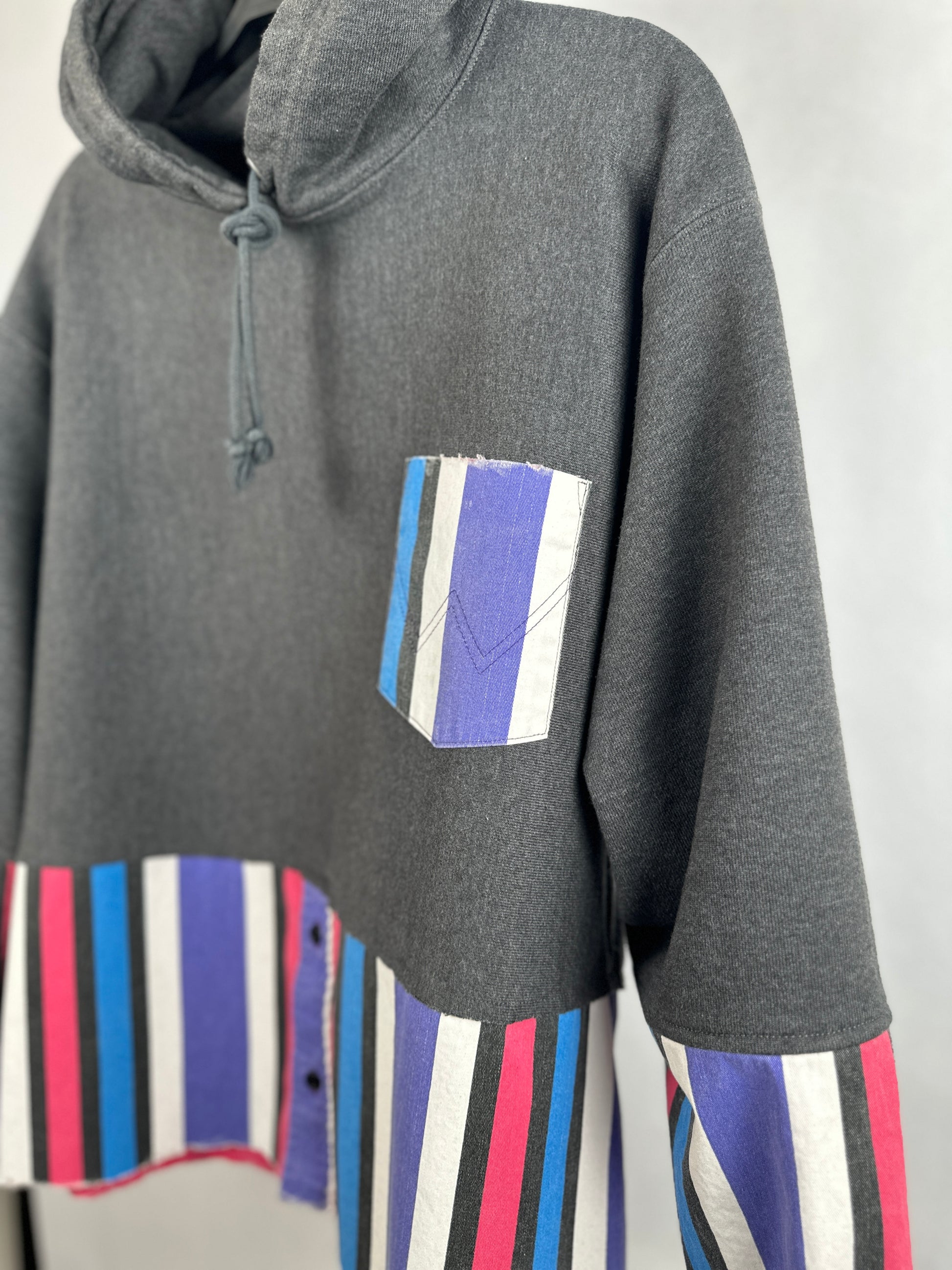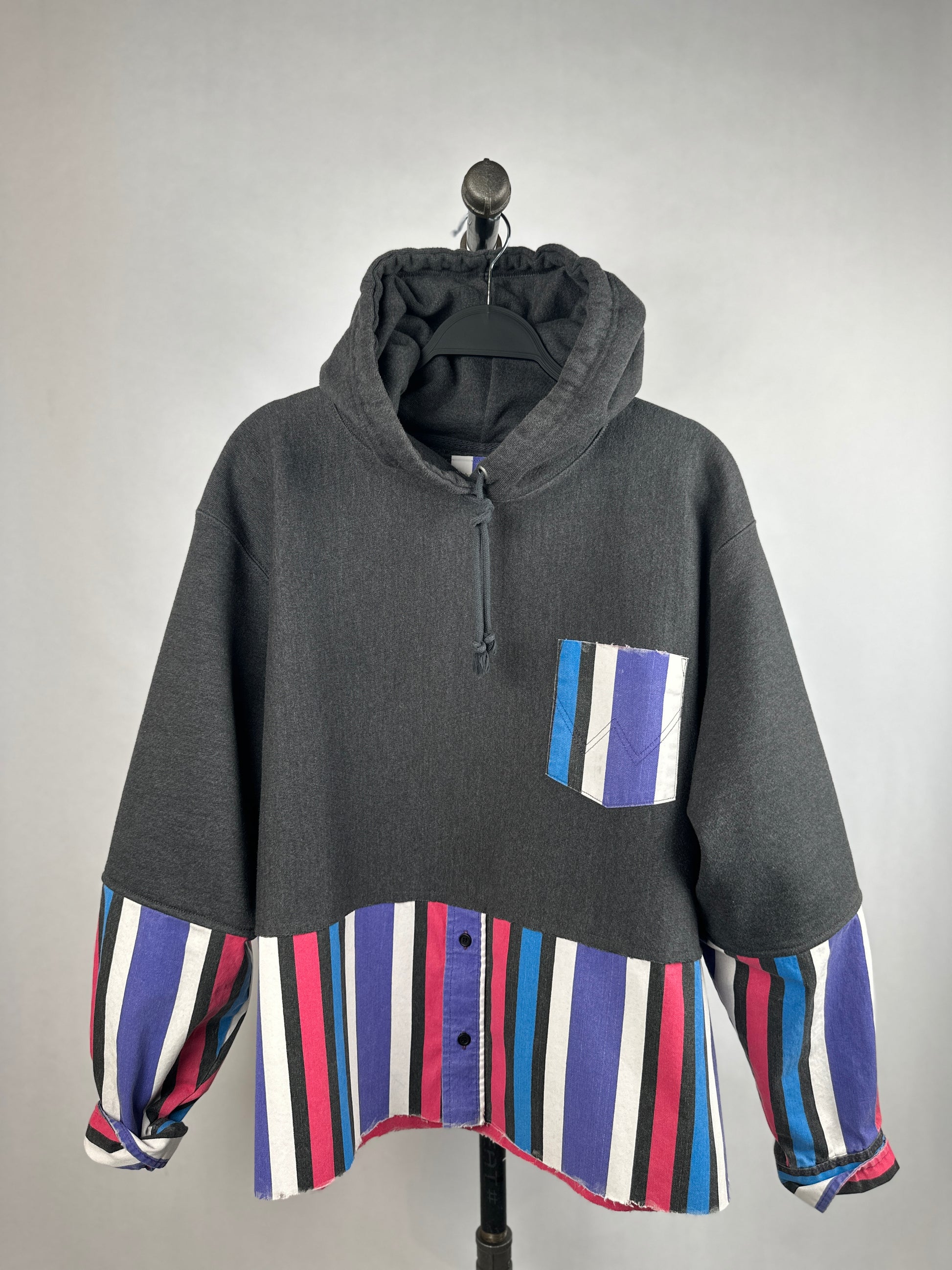Rock a unique and sustainable look with The Wrangler. This upcycled hoodie features vintage striped woven details on the sleeves, front, and pocket. With a loose fit, you'll stay comfortable and stylish while reducing your carbon footprint. Wrangle up some compliments with this one-of-a-kind hoodie!