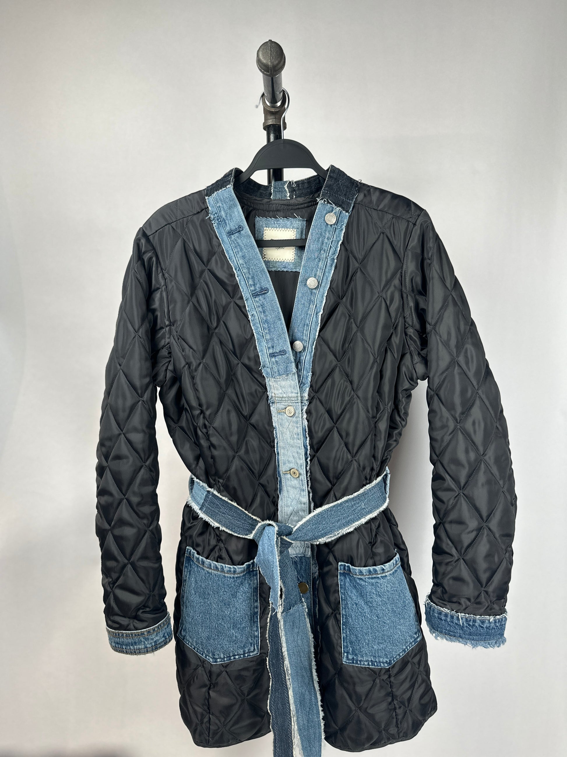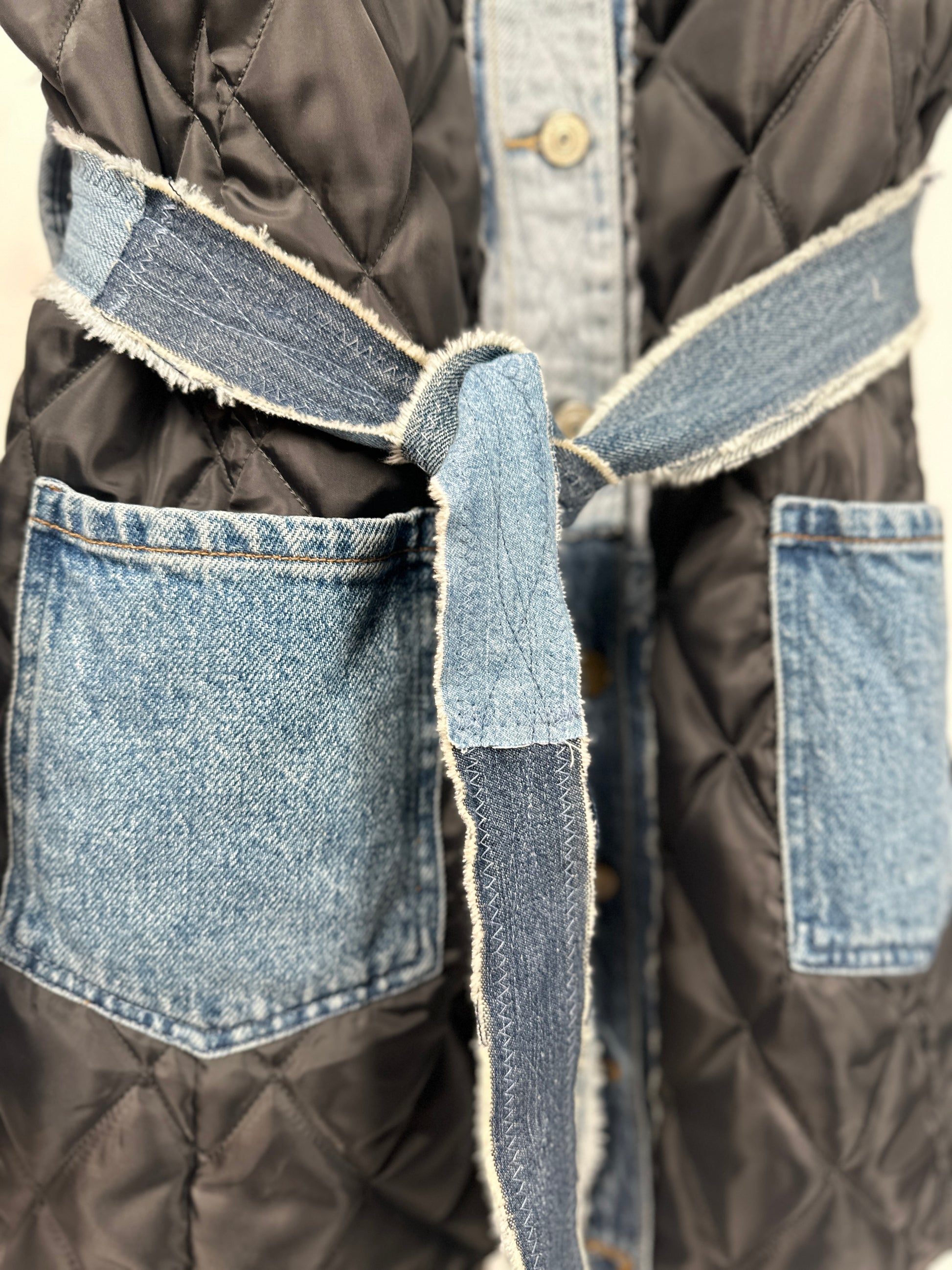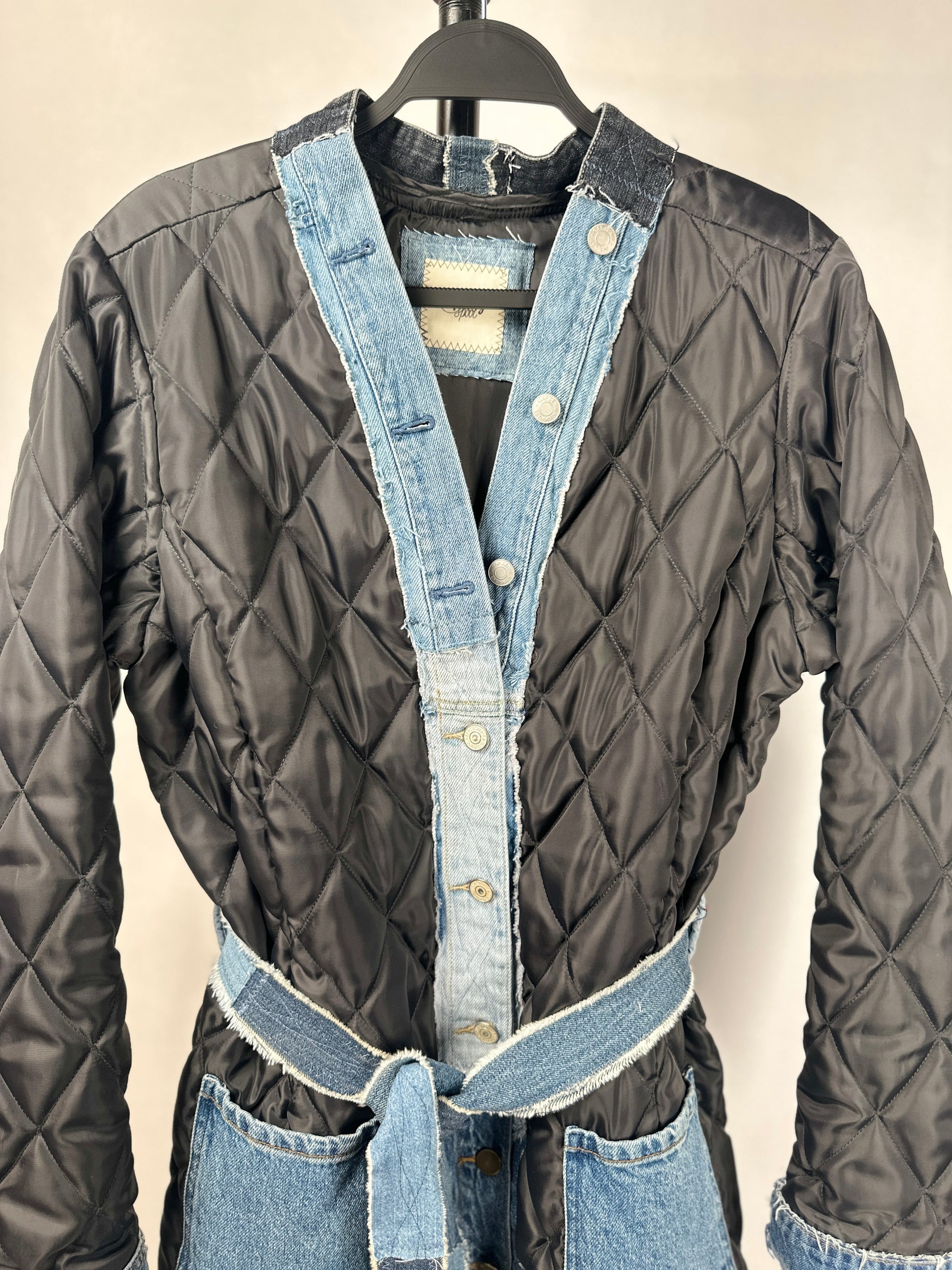 Get ready to turn heads with The Zandie! This unique jacket is not only stylish, but eco-friendly too. Made with an upcycled quilted liner and denim details from scraps, it's perfect for the fashion-forward and eco-conscious. Plus, stay organized with its large pockets and cinch your waist with the denim belt. Make a statement with The Zandie!