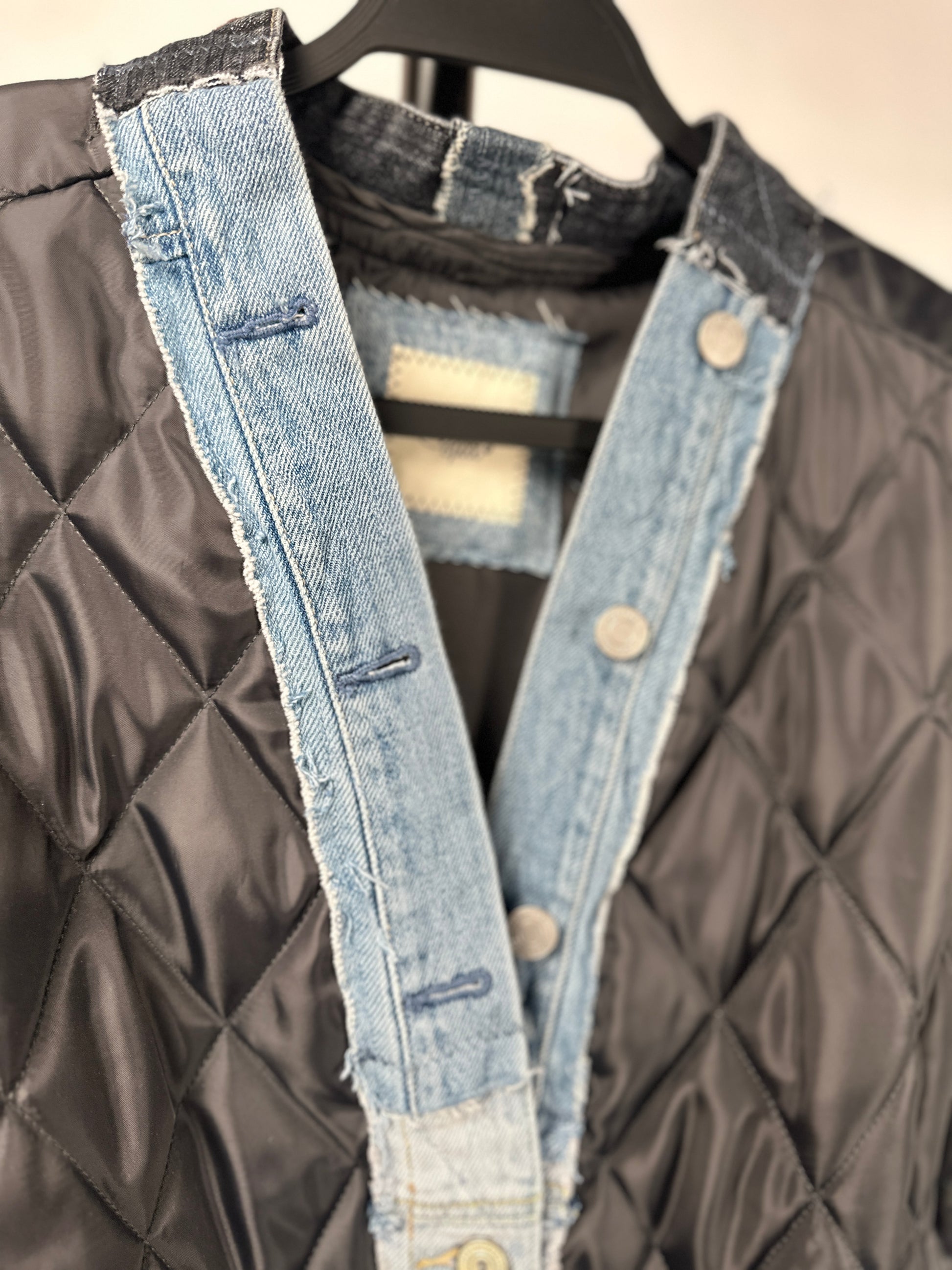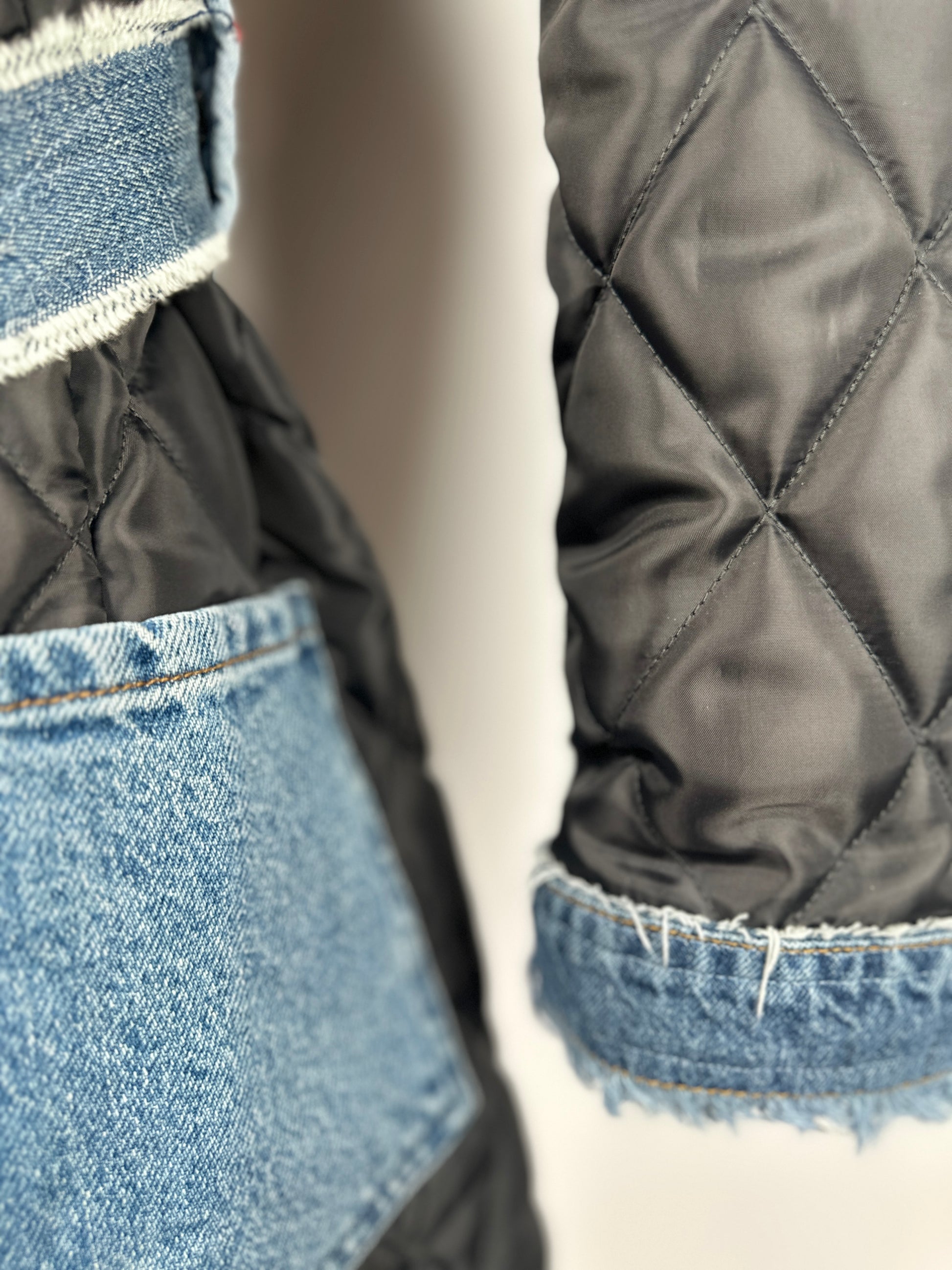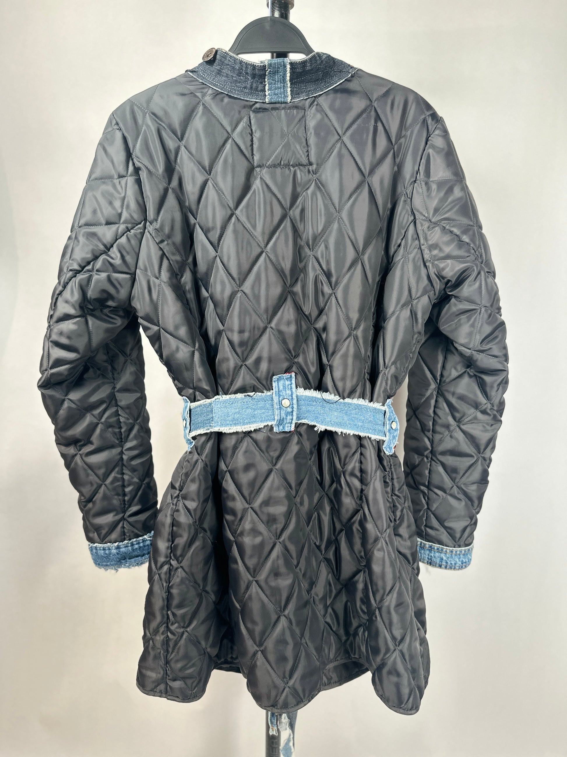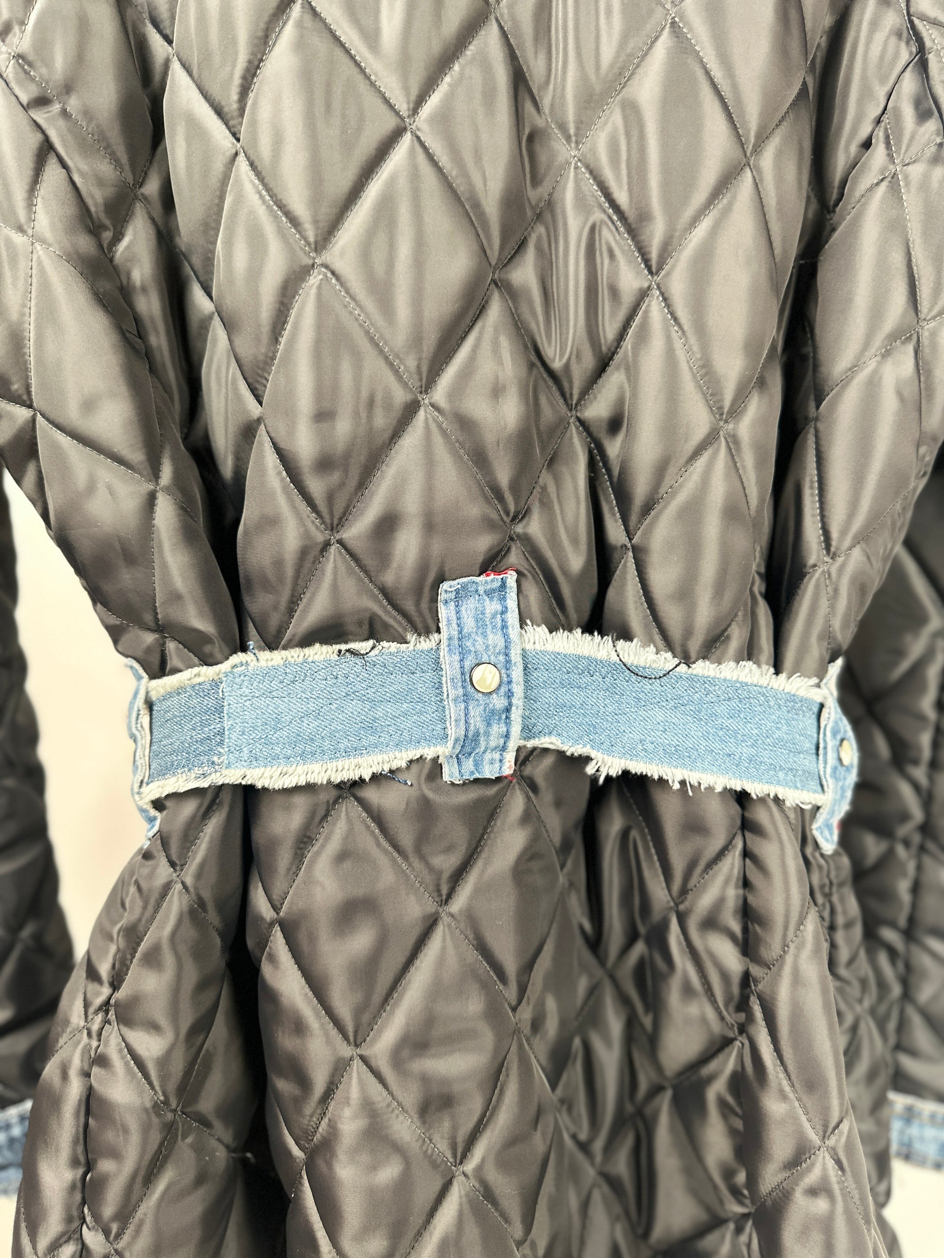 Get ready to turn heads with The Zandie! This unique jacket is not only stylish, but eco-friendly too. Made with an upcycled quilted liner and denim details from scraps, it's perfect for the fashion-forward and eco-conscious. Plus, stay organized with its large pockets and cinch your waist with the denim belt. Make a statement with The Zandie!