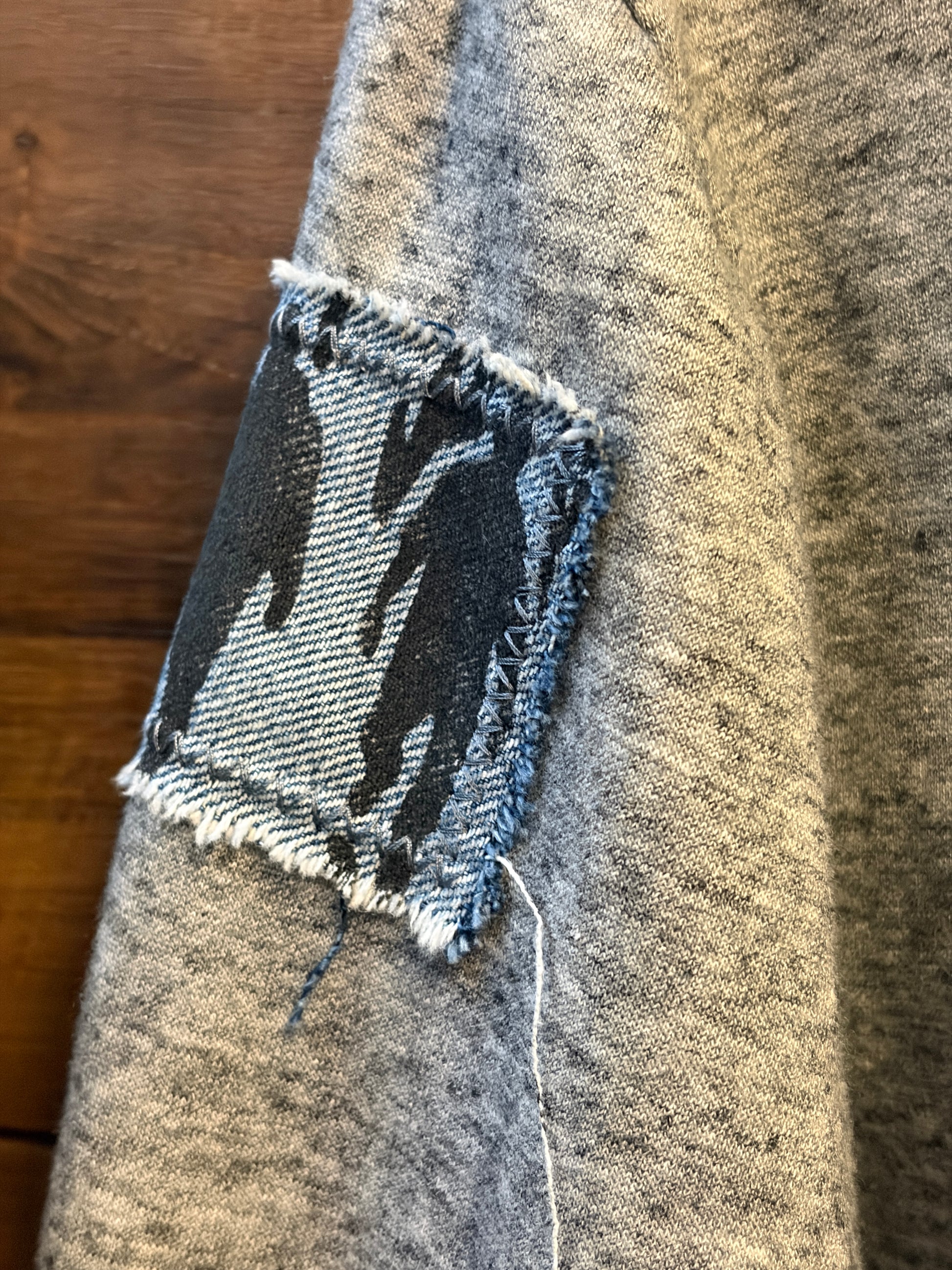 Layer up with The Zip, a playful upcycled full-zip hoodie that's as unique as you are. Featuring bold denim patches on the front with hand-stenciled details, this piece celebrates sustainable style with serious character. The relaxed fit keeps things comfy and cool, perfect for throwing on whenever you need that effortless vibe. Wear it, love it, feel good about it.
