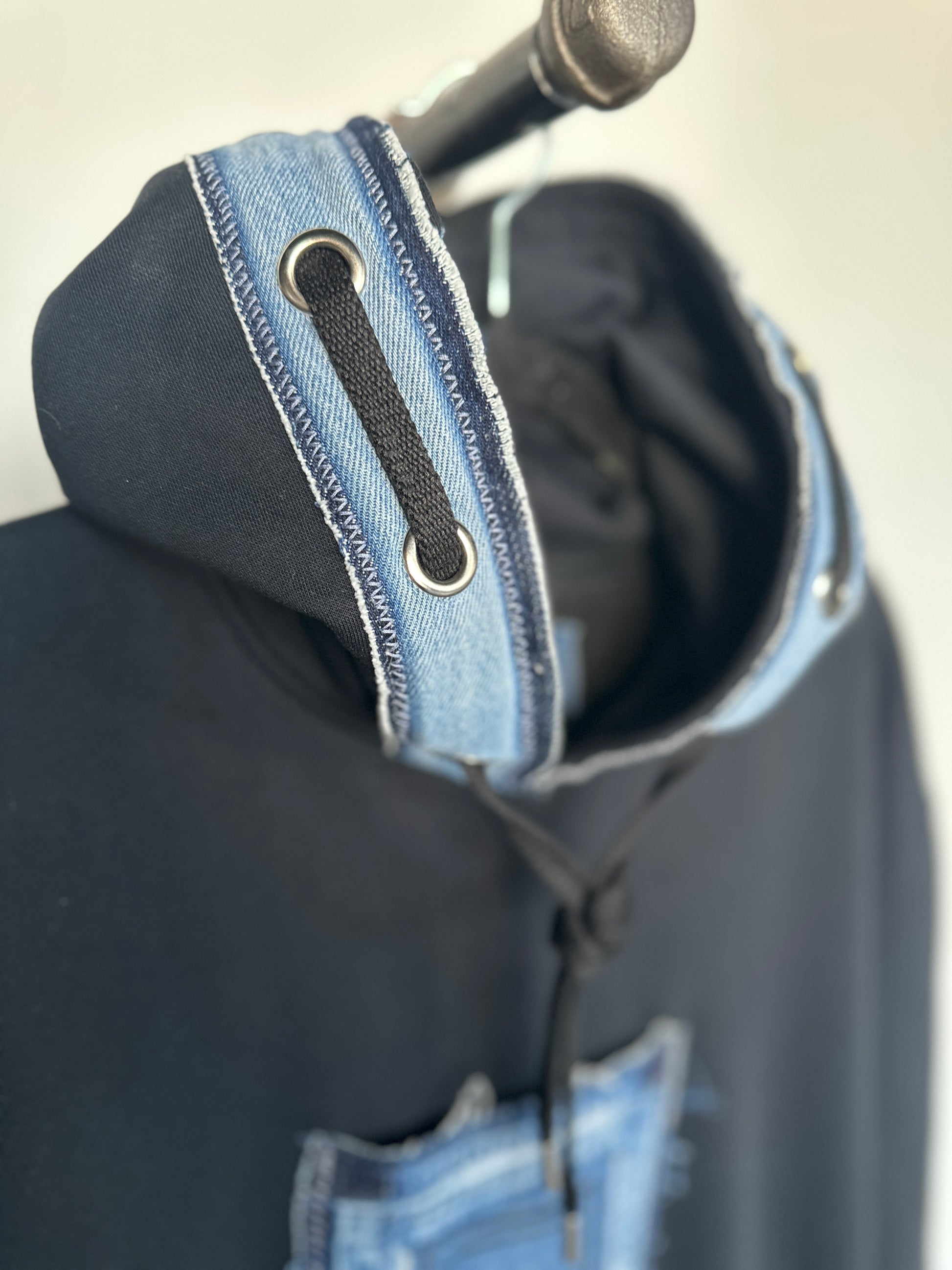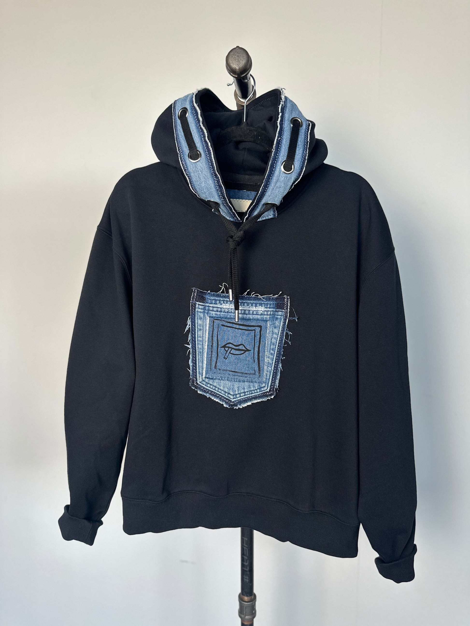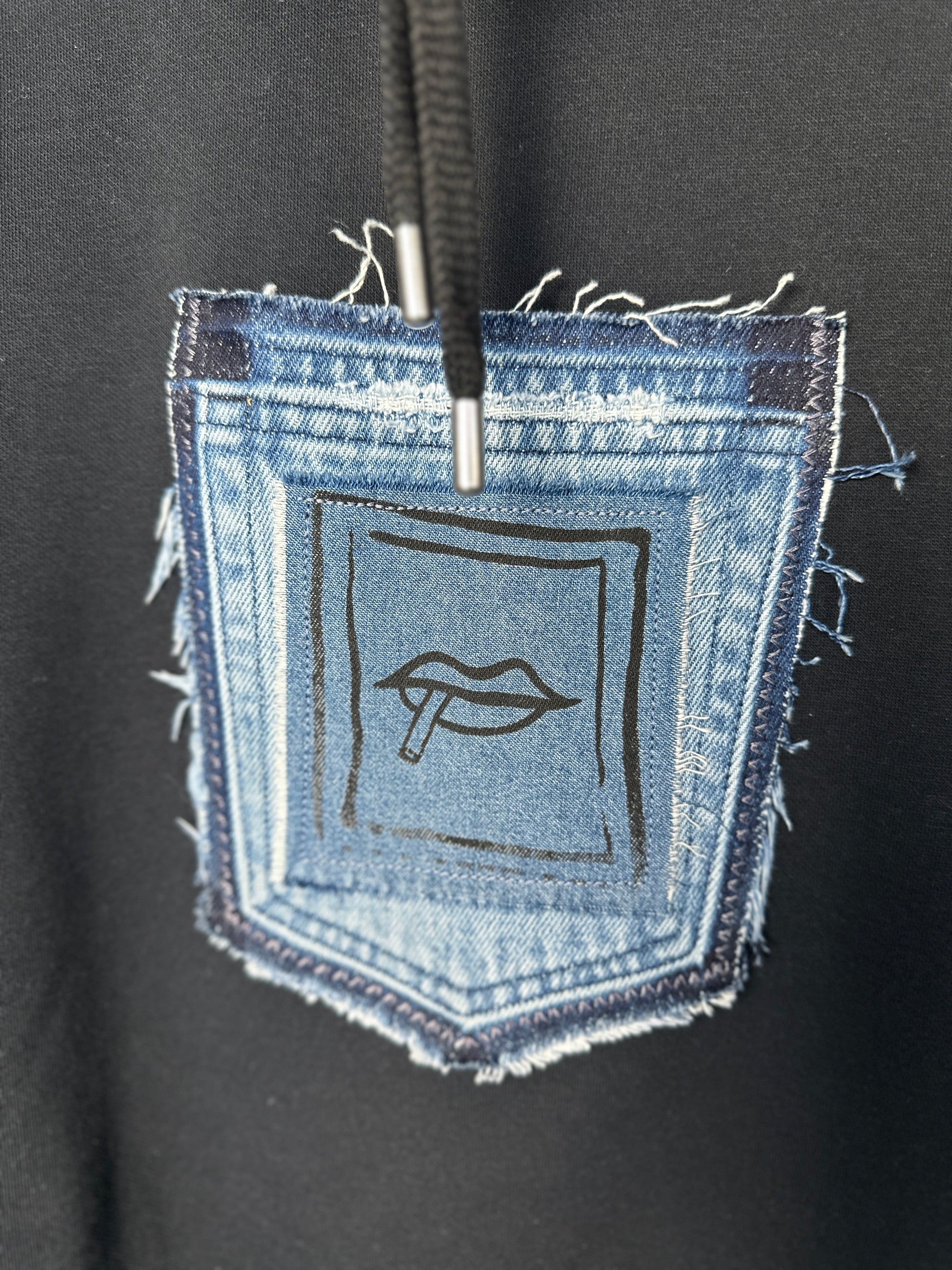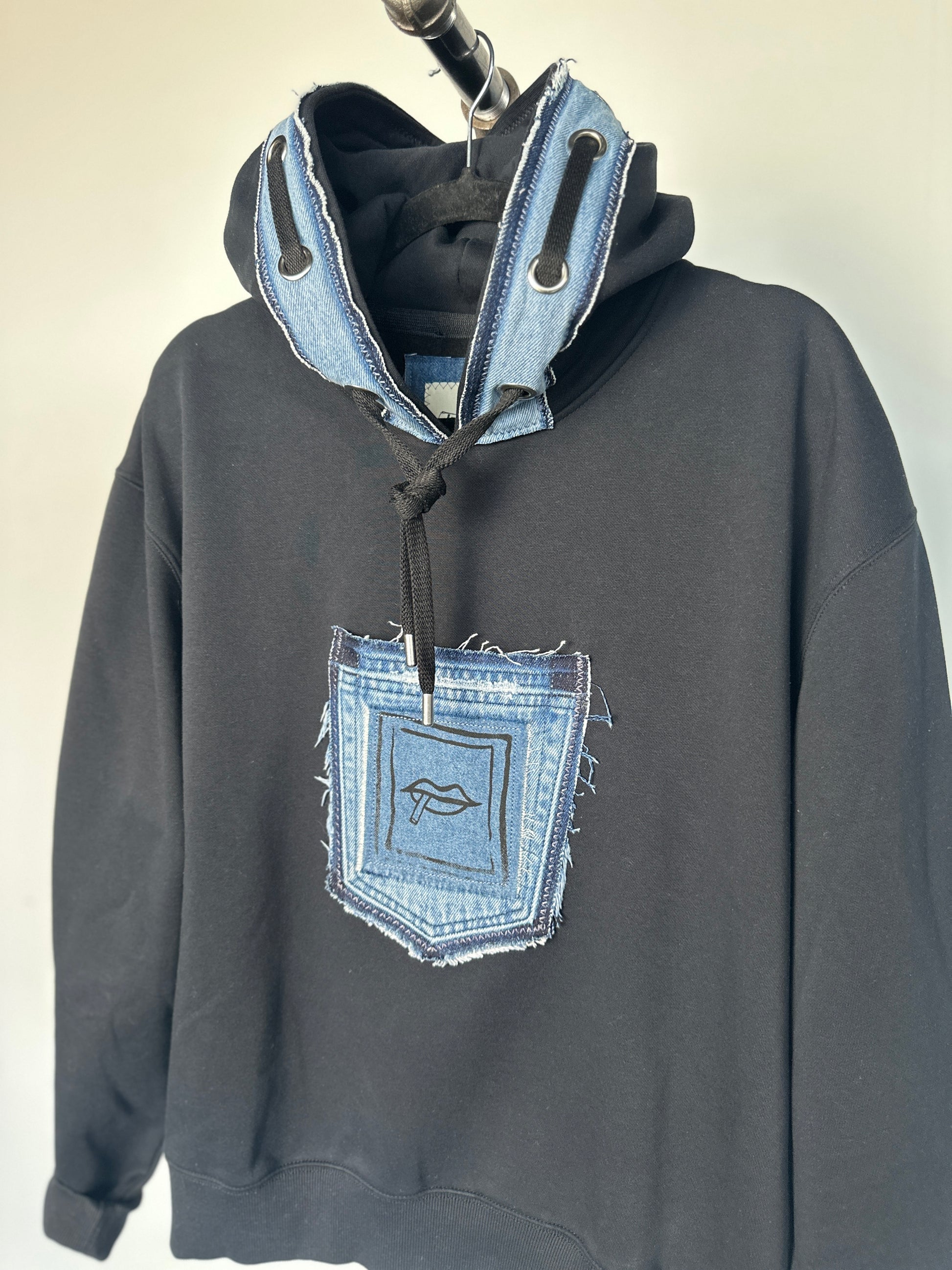 Introducing the Zuzu, the ultimate hoodie for the fashion-forward (and environmentally conscious) individual. Made with upcycled materials, featuring a relaxed fit along with an edgy grommet trim around the hoodie. Don't forget the front pocket adorned with a one-of a kind lippy icon, this hoodie is sure to make a statement!