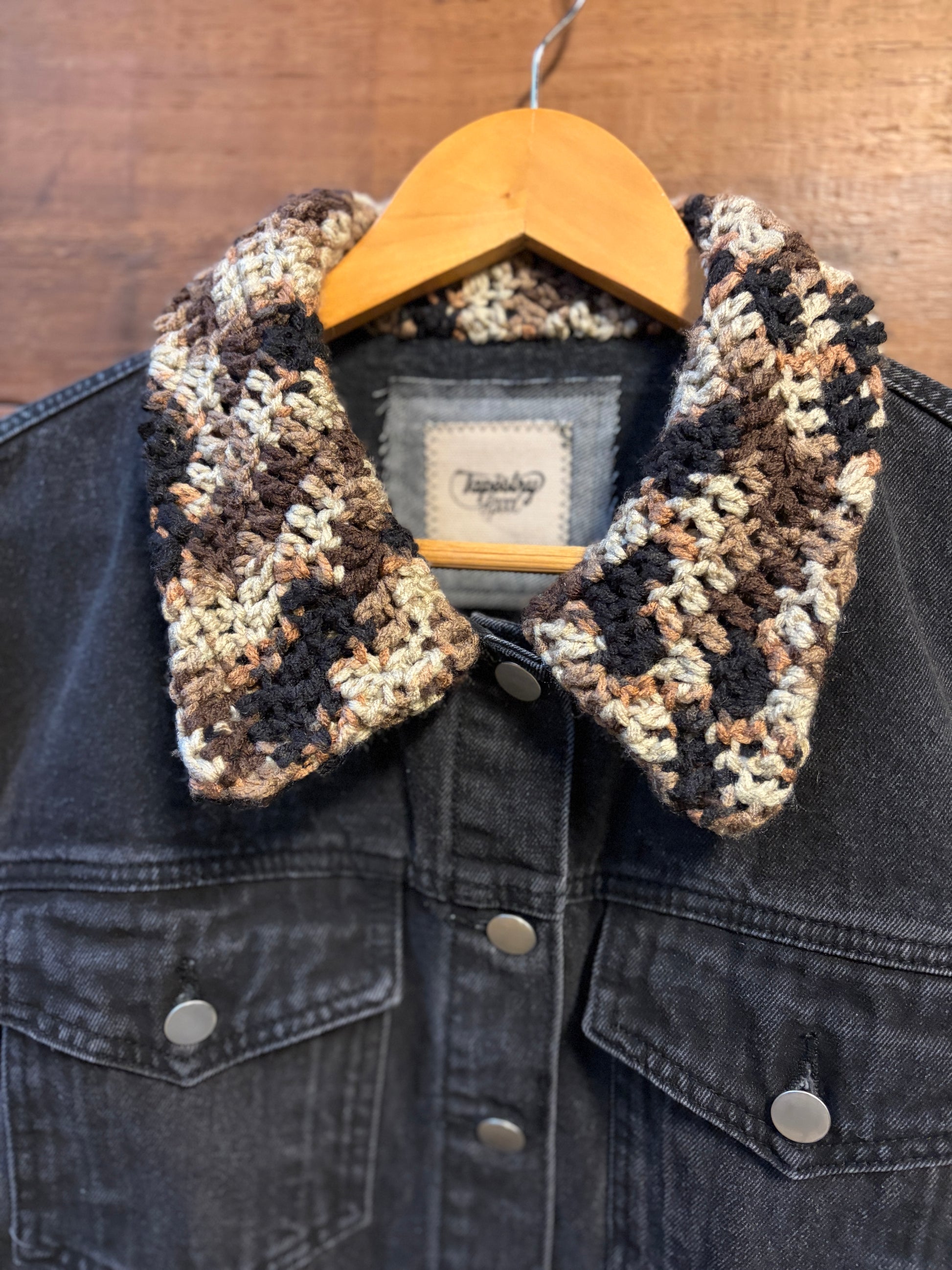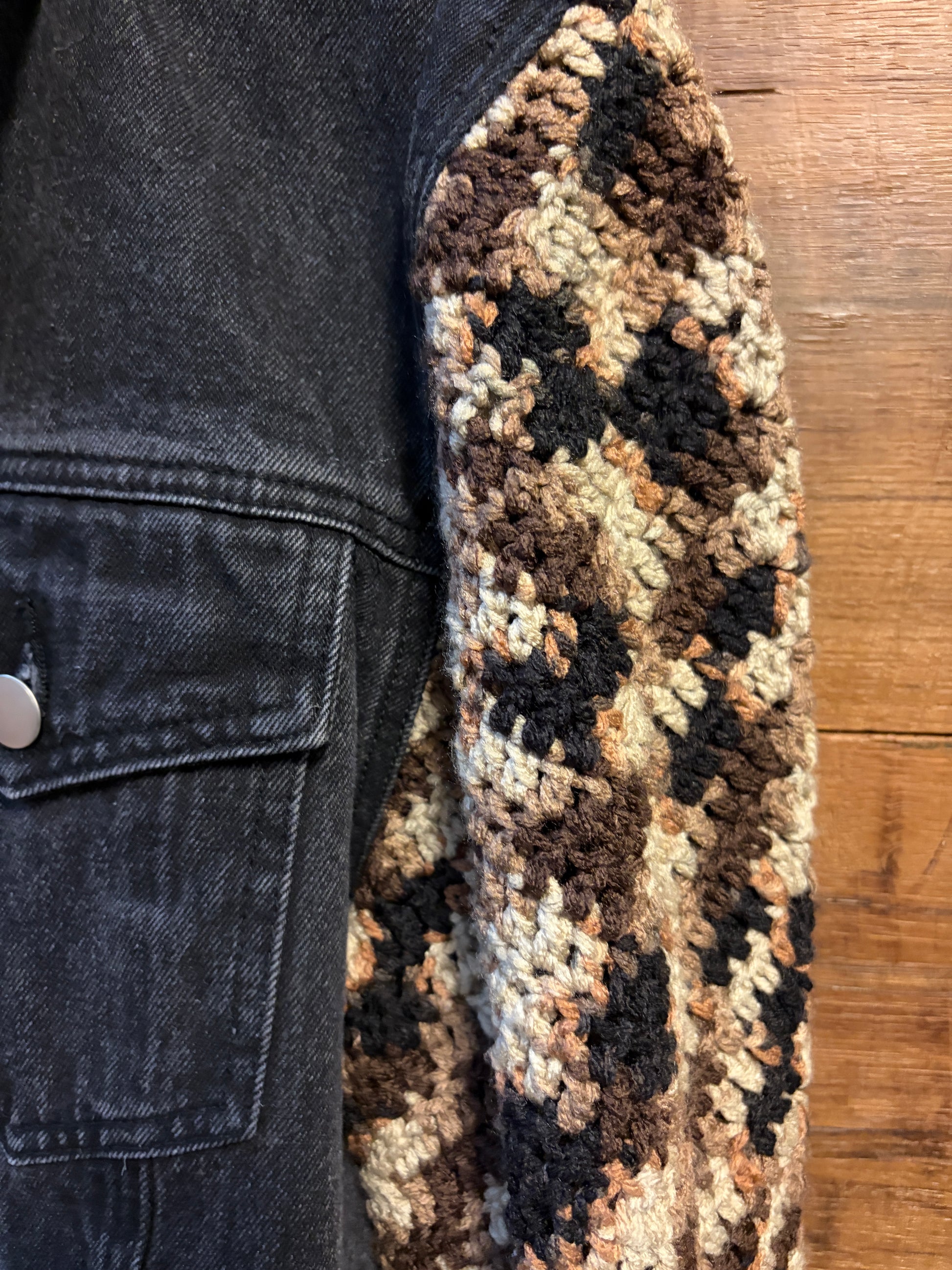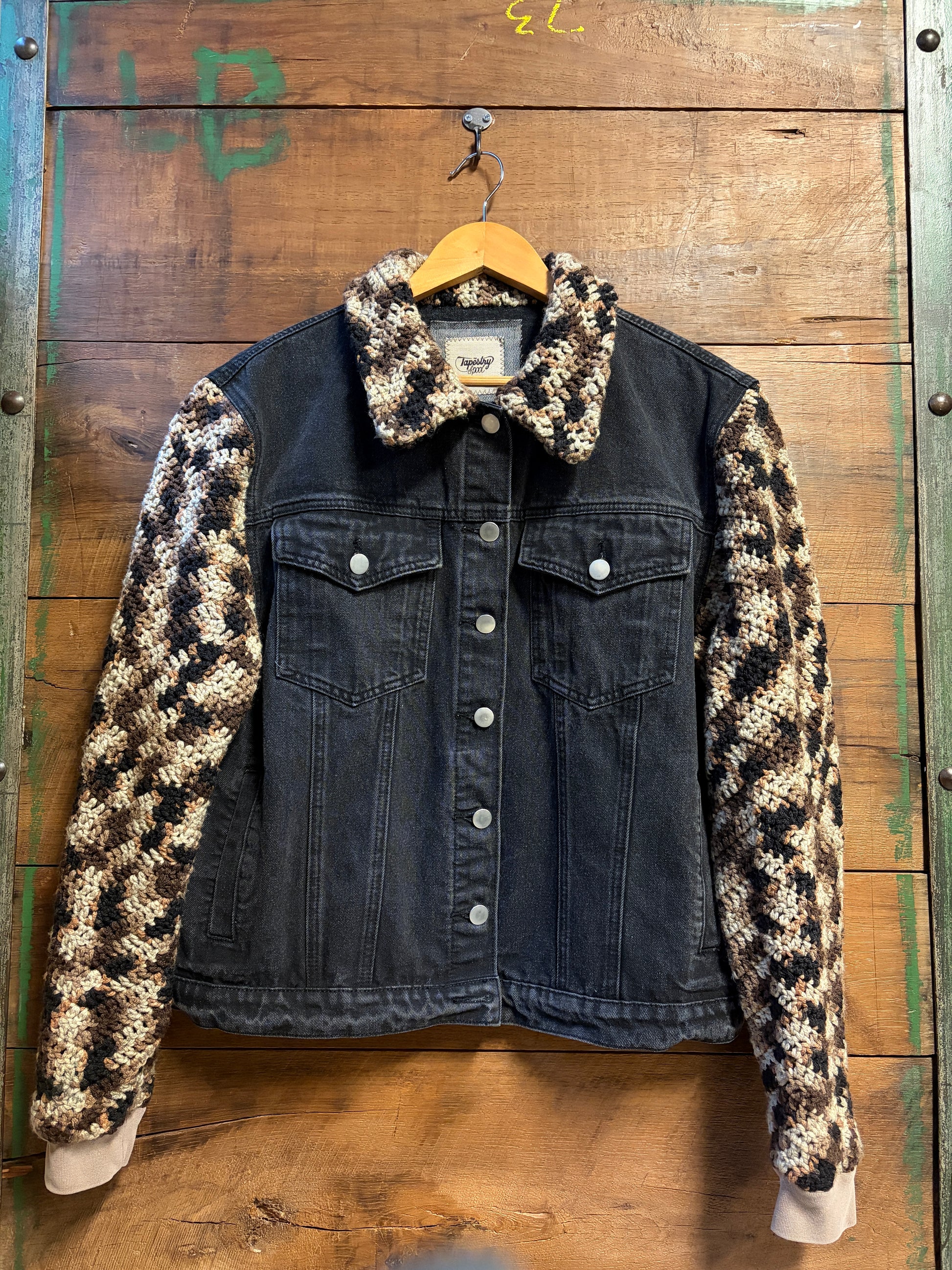 The Willow is a one-of-a-kind denim jacket that celebrates creative reuse. Featuring a classic denim body paired with a show-stopping contrasting collar and sleeves crafted from an upcycled crocheted blanket, this piece blends vintage charm with artisan flair. Perfect for anyone who loves sustainable fashion with personality, The Willow proves that the best style comes from giving materials a second life. Wear it as a statement that fashion doesn't have to be predictable—or wasteful.