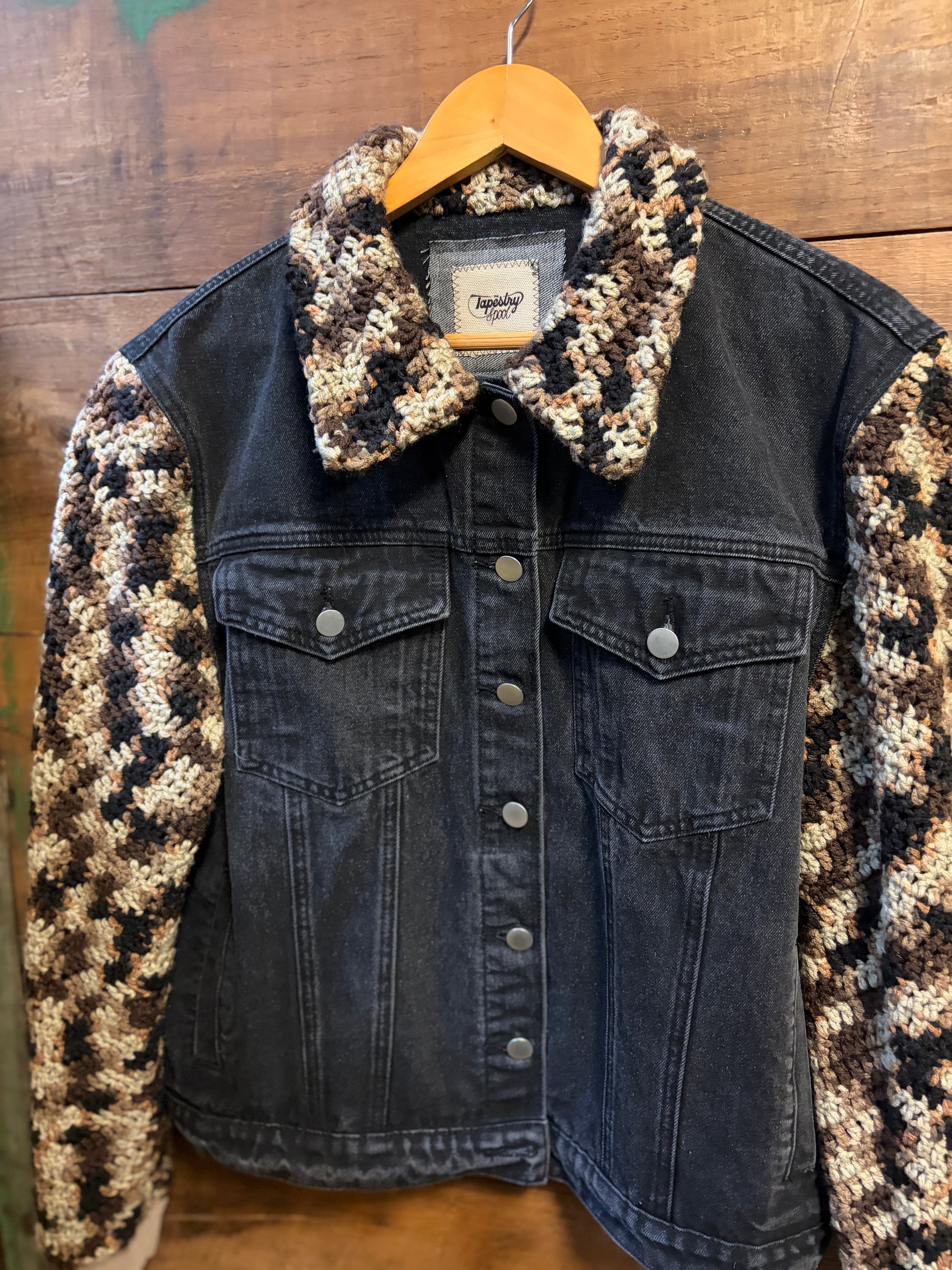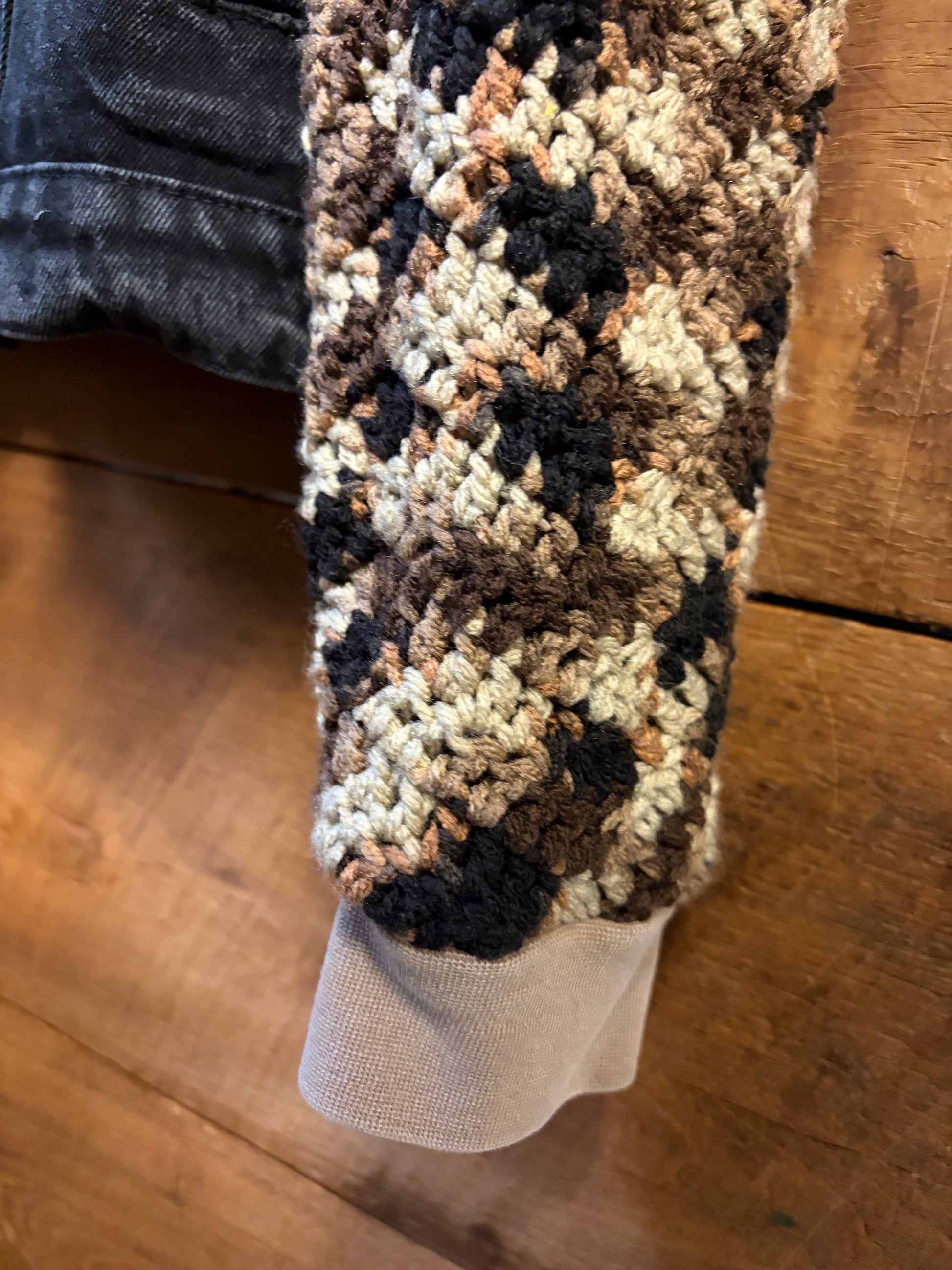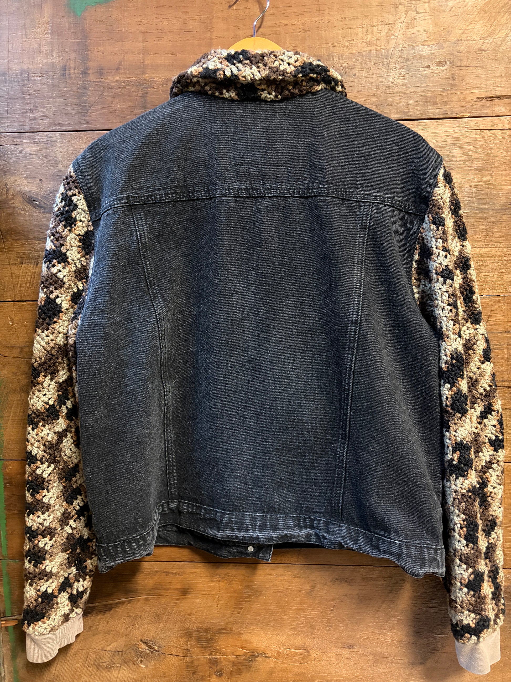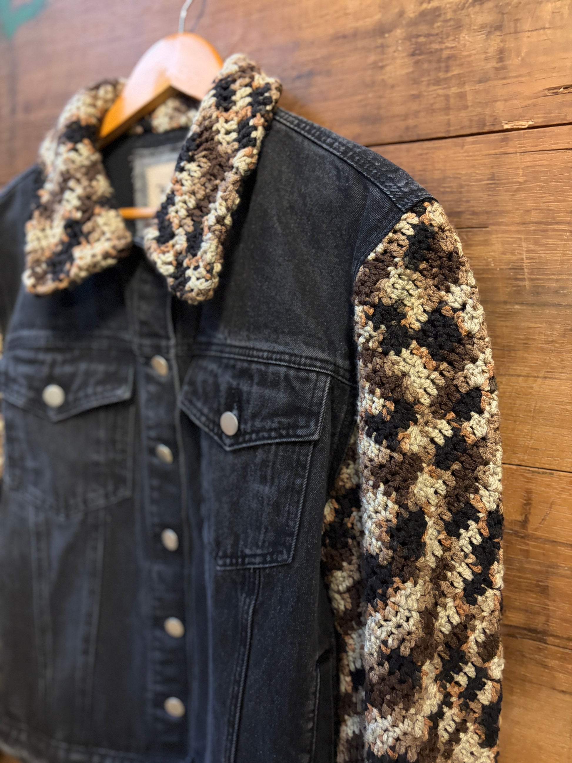 The Willow is a one-of-a-kind denim jacket that celebrates creative reuse. Featuring a classic denim body paired with a show-stopping contrasting collar and sleeves crafted from an upcycled crocheted blanket, this piece blends vintage charm with artisan flair. Perfect for anyone who loves sustainable fashion with personality, The Willow proves that the best style comes from giving materials a second life. Wear it as a statement that fashion doesn't have to be predictable—or wasteful.