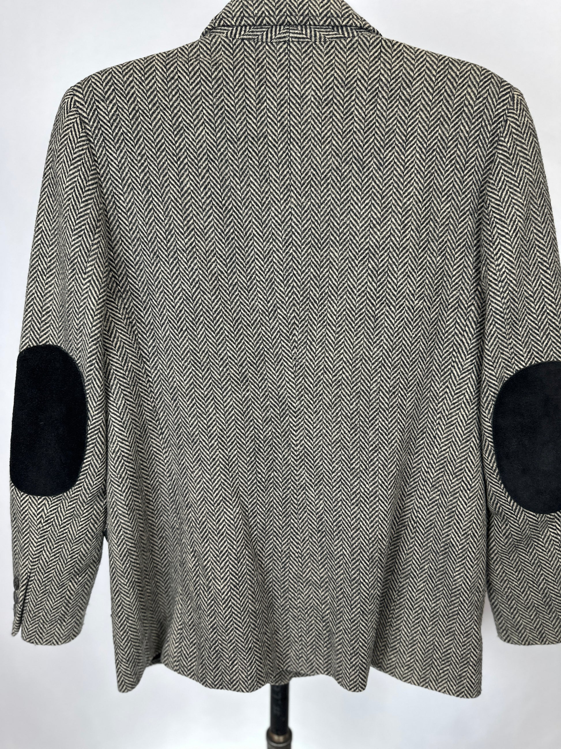 Vintage Clifford & Wills wool blazer in an extended length with 3 button closure and front flap pockets. Suede elbow patches in a dark brown. Excellent condition, made in the USA. 80% wool, 20% nylon
