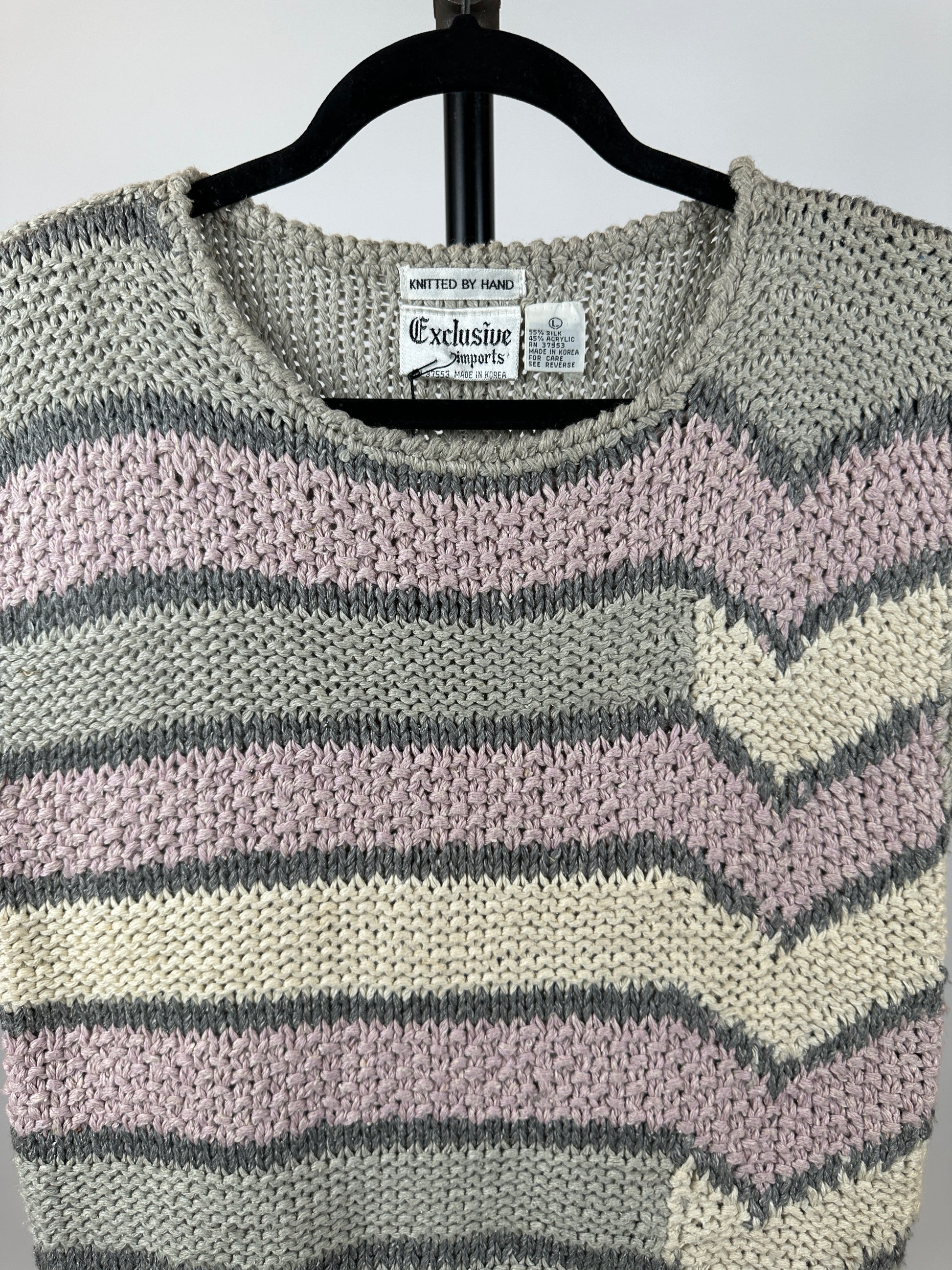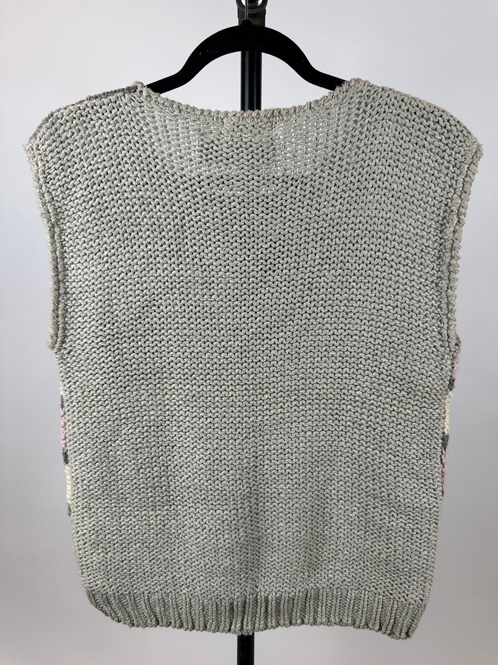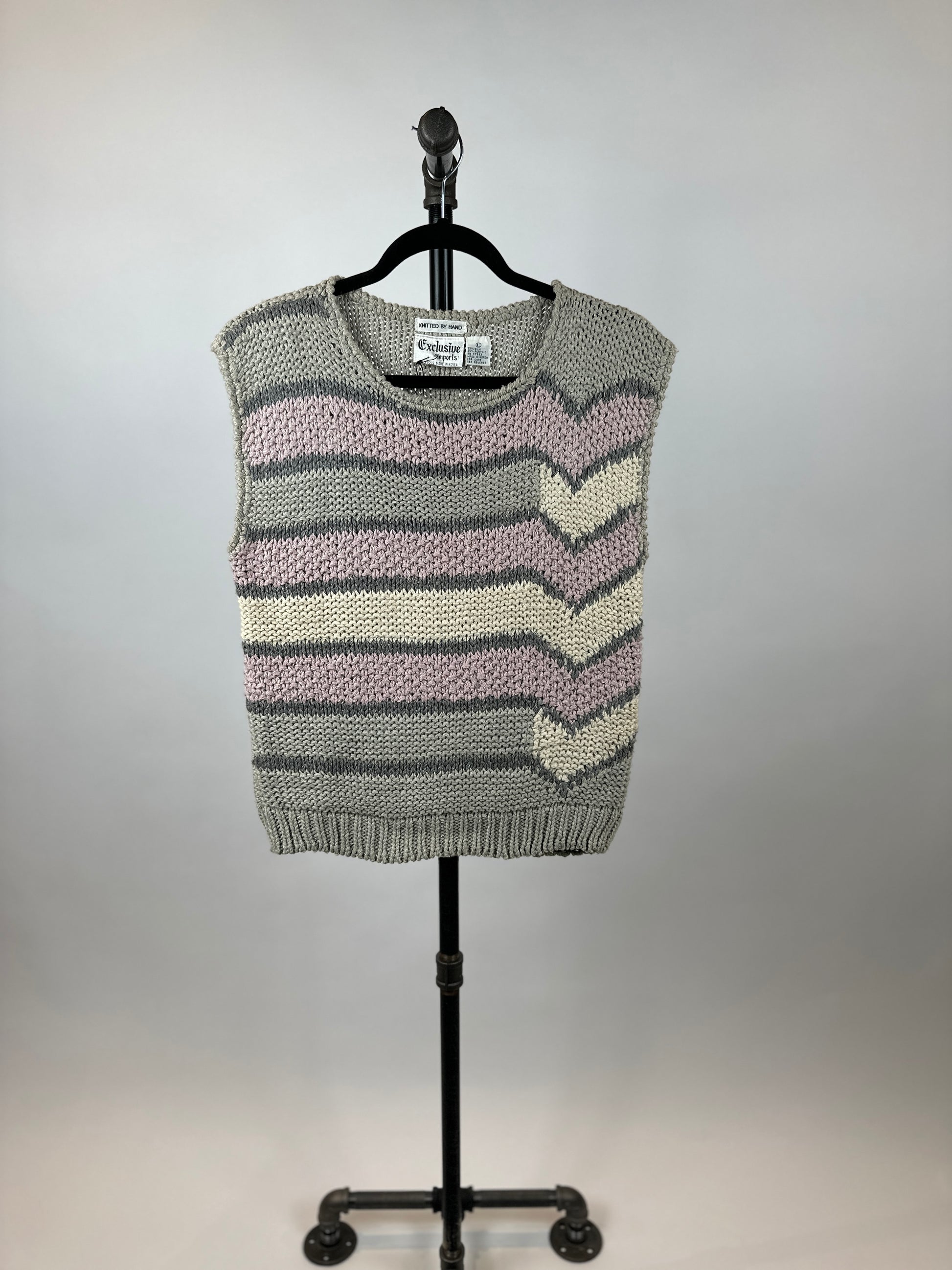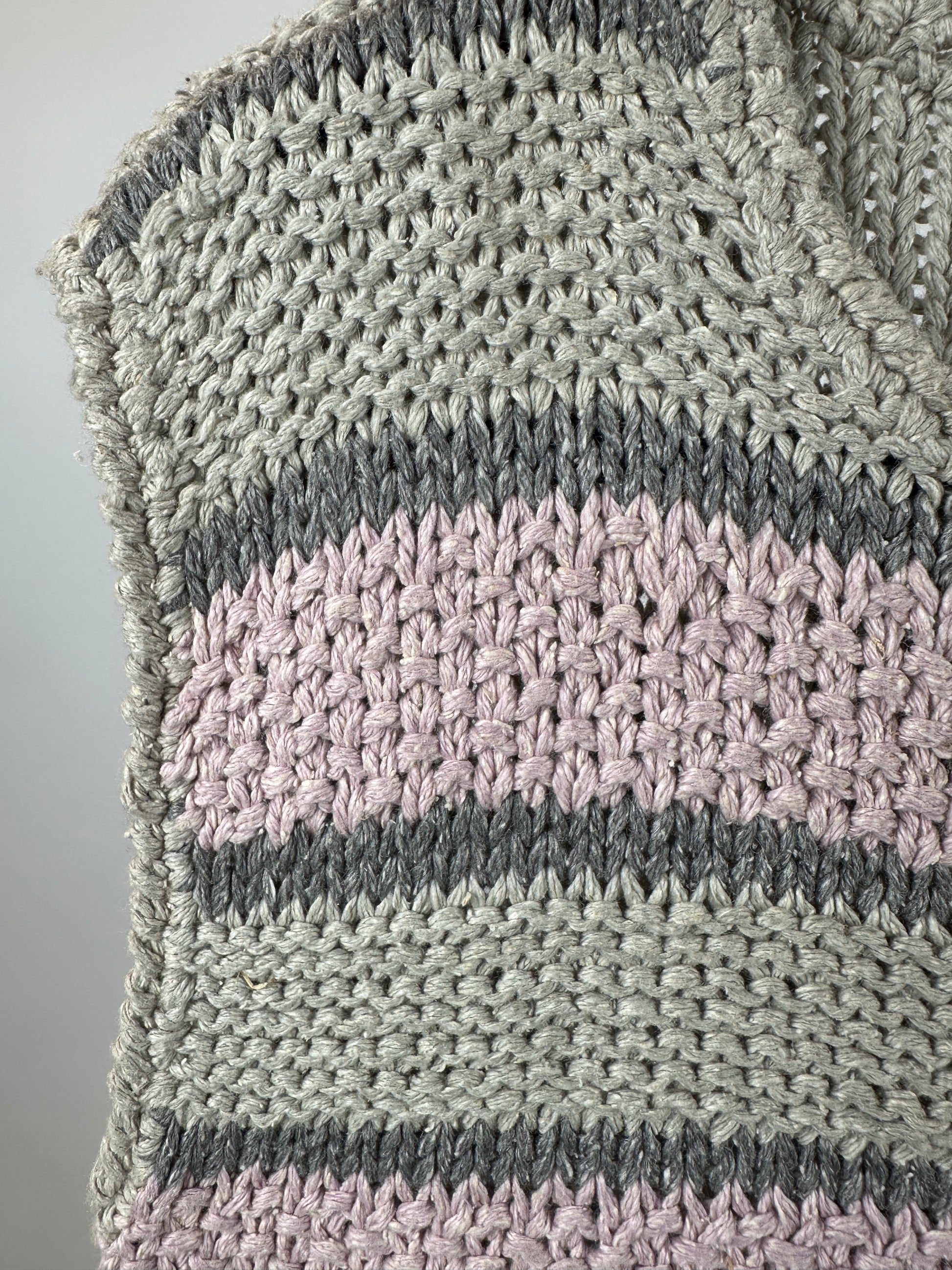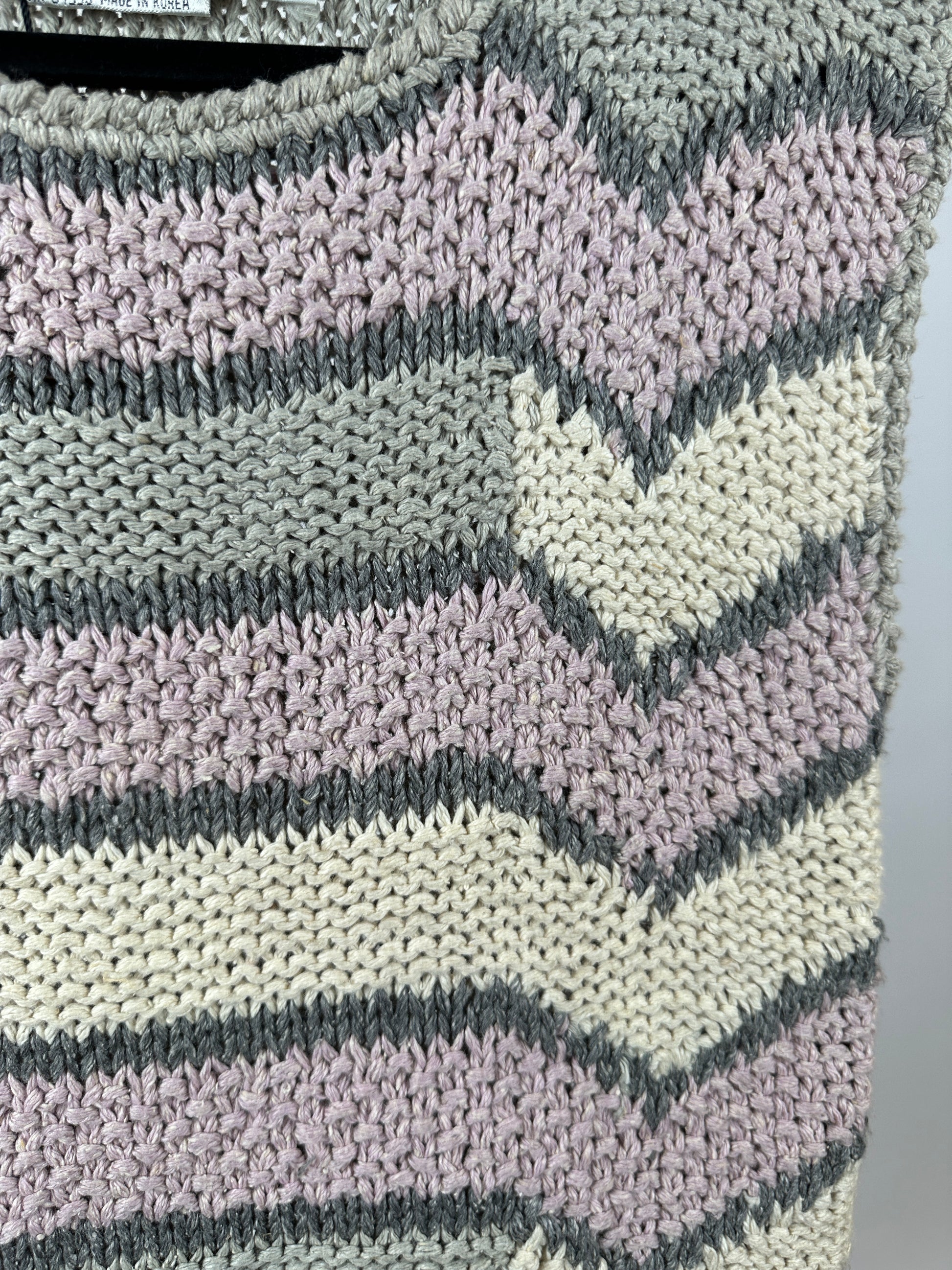 Taupe/pink/cream vest in a silk and acrylic blend, slightly chunky knit but not heavy. Very unique pattern with a solid back.