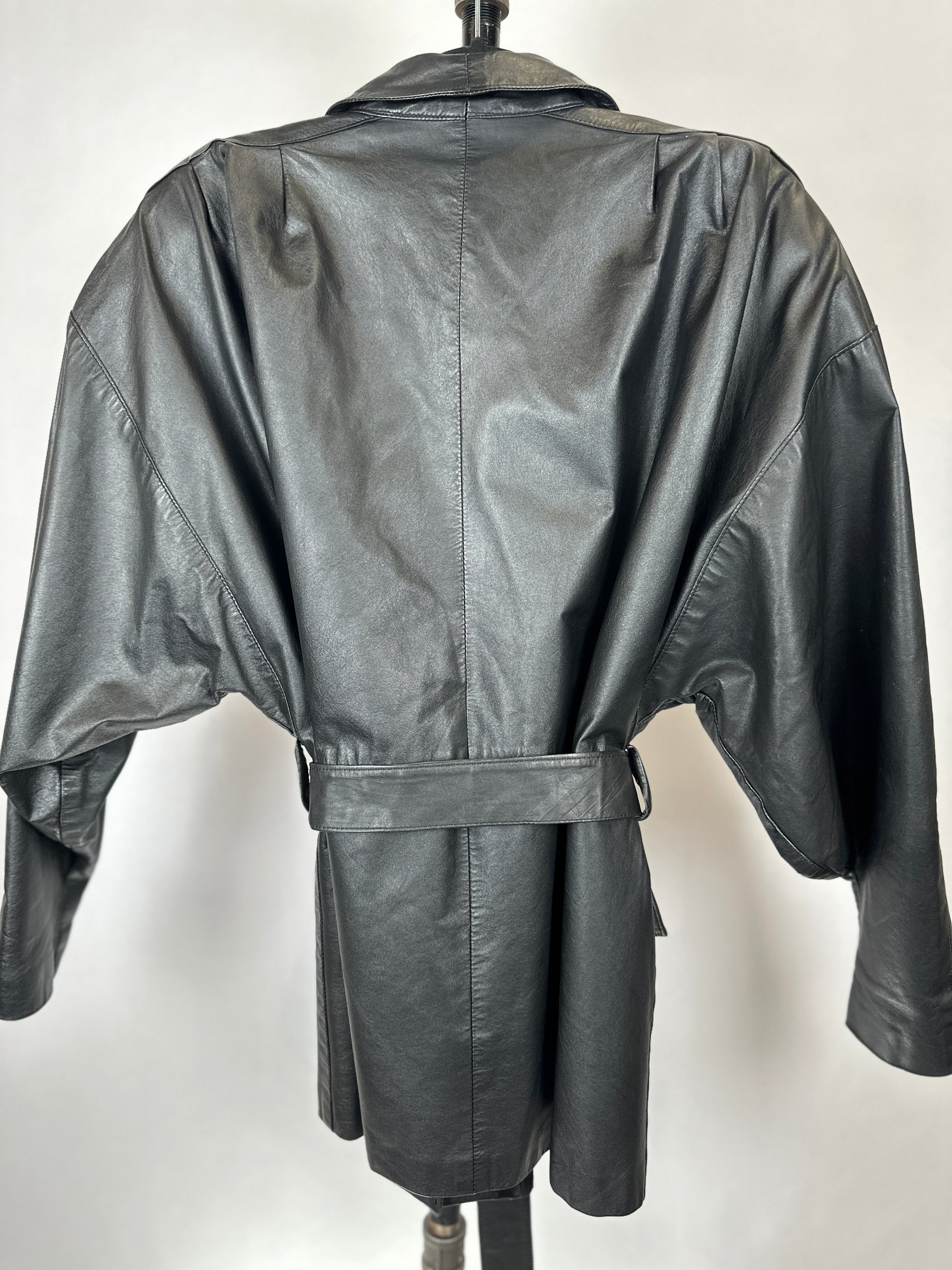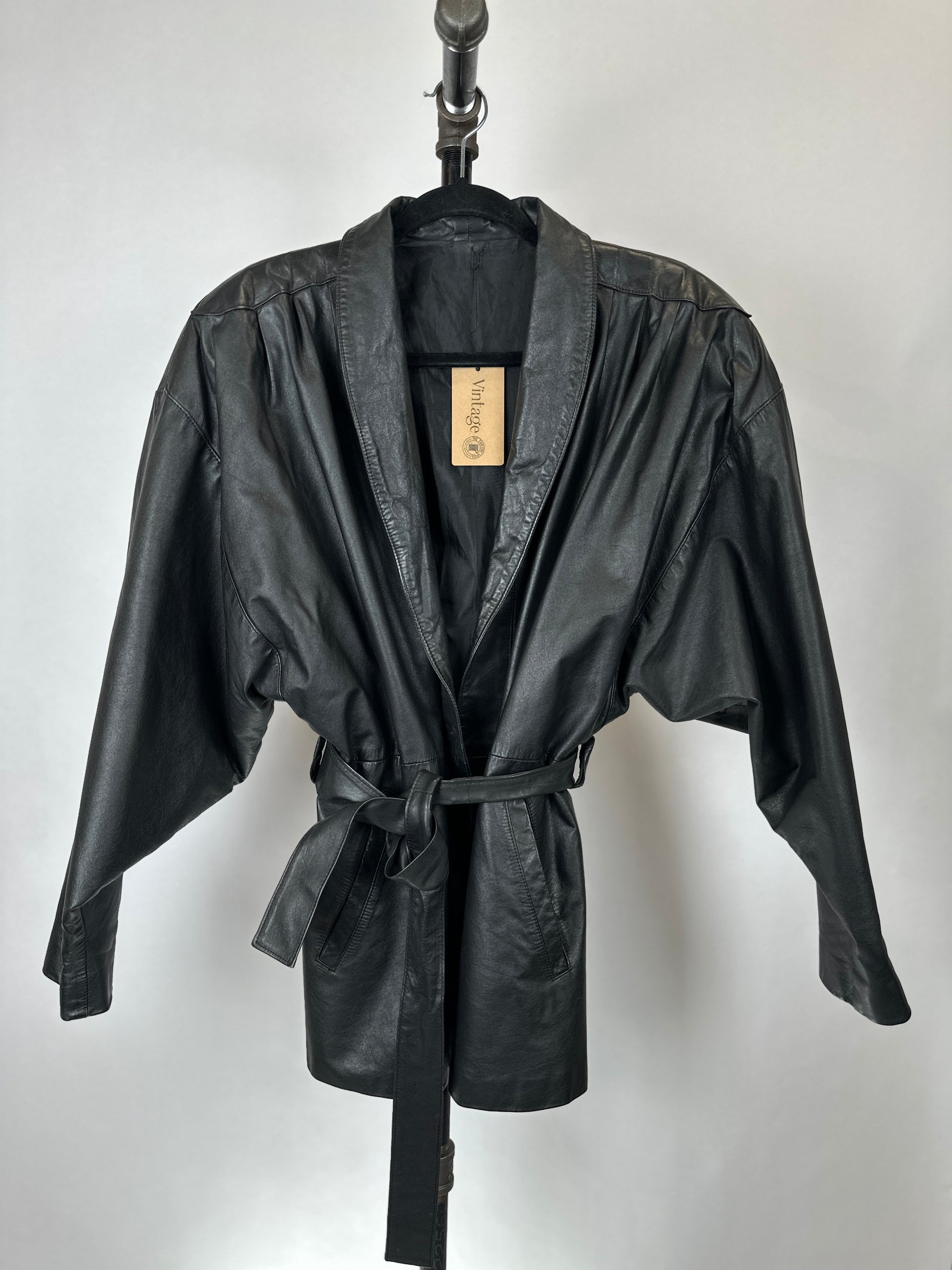 Vintage leather jacket in the most unique silhouette. Photos don't do this one justice! Belted closure, no buttons. Dolman sleeve with pleats and shoulder pads and a butterfly sleeve (very wide under arms and tapers at wrist). Fully lined. Great condition, only wear I see is slight at the belt loop, but not noticeable. This one is really cool!